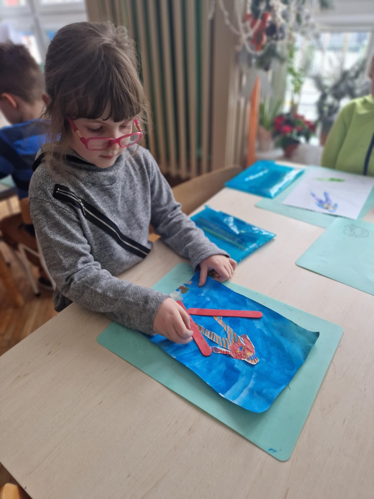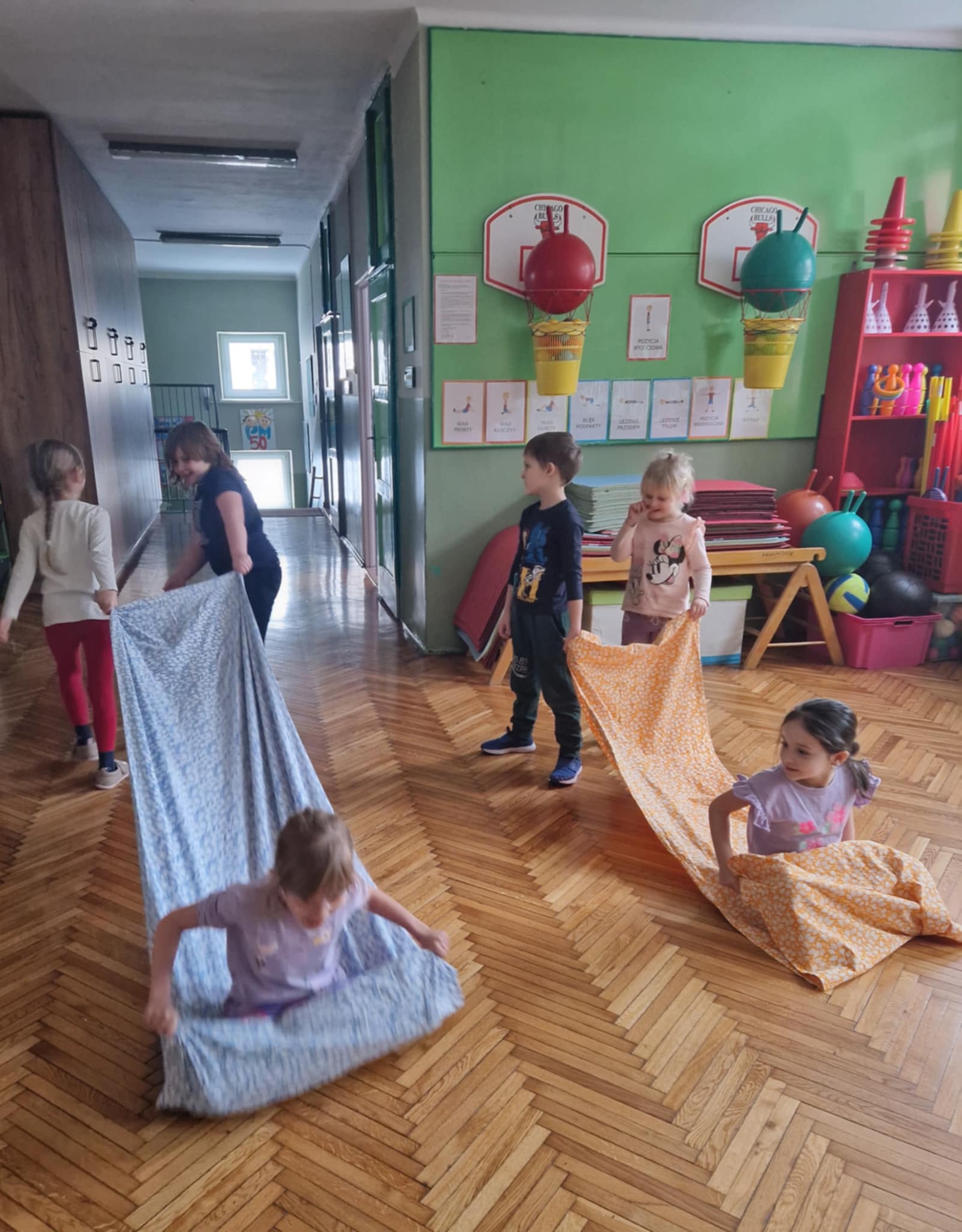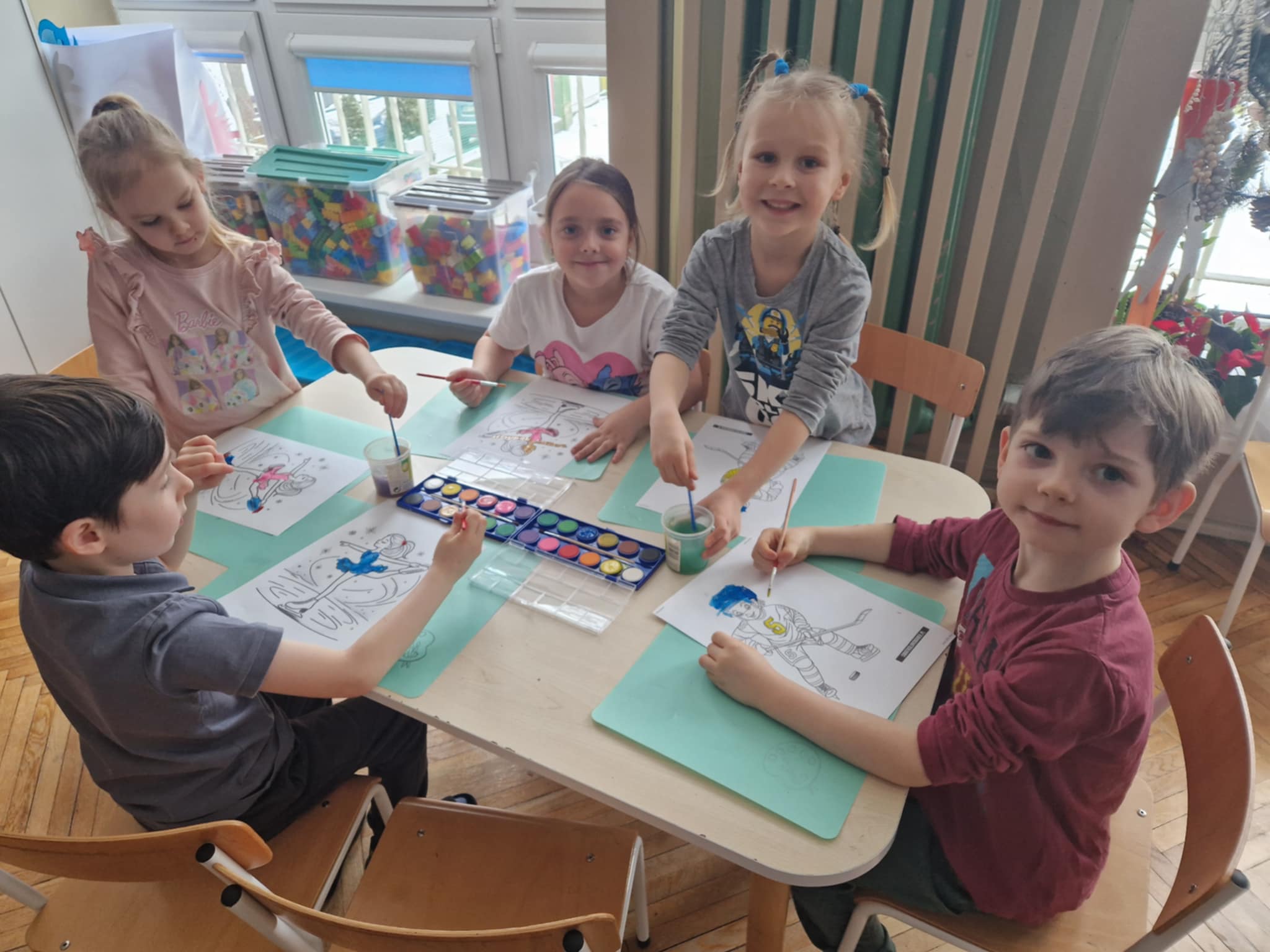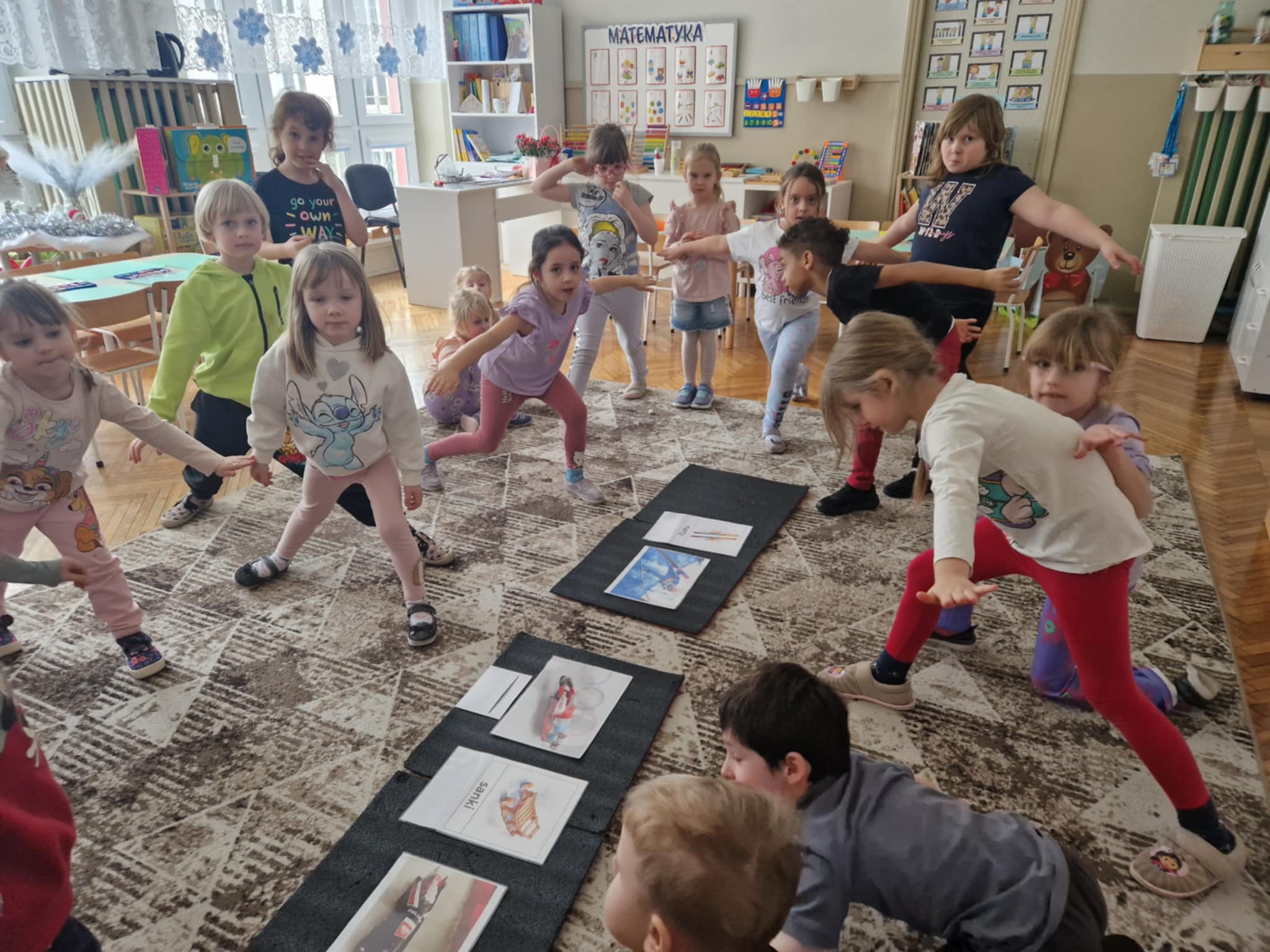 Dzieci z grupy 3 i 4 poznawały sporty zimowe, w których wykorzystywane są sanki, łyżwy i narty. Mówiliśmy o dyscyplinach sportowych takich jak saneczkarstwo, skoki narciarskie czy jazda figurowa na lodzie. Była zabawa w saneczki i skoczków narciarskich. Następnie dzieci wykonały pracę plastyczne utrwalając poznane sporty zimowe.