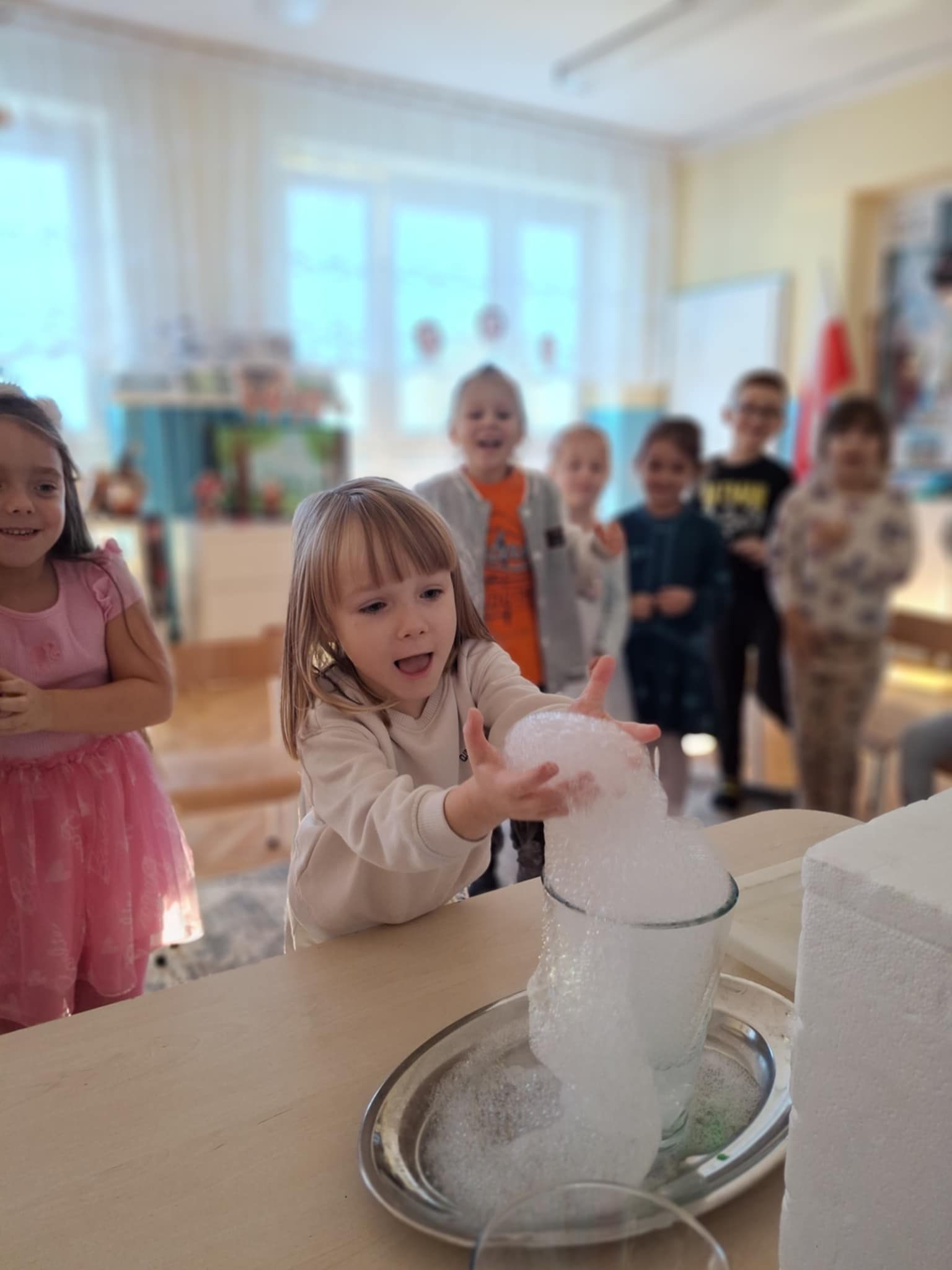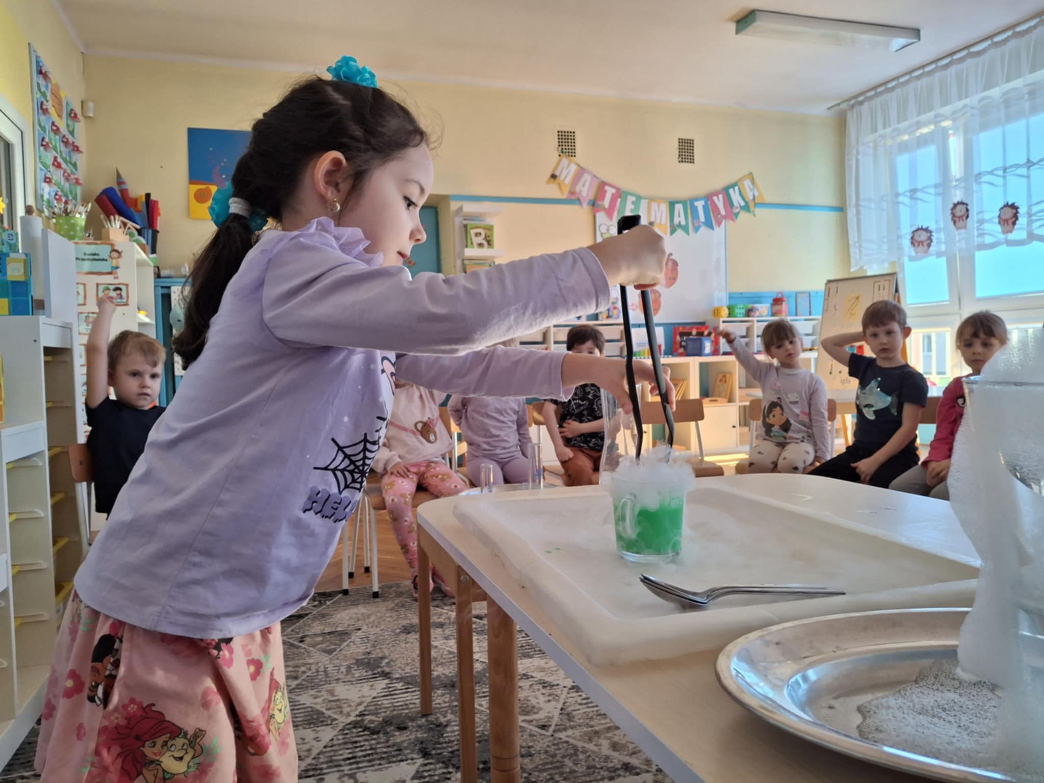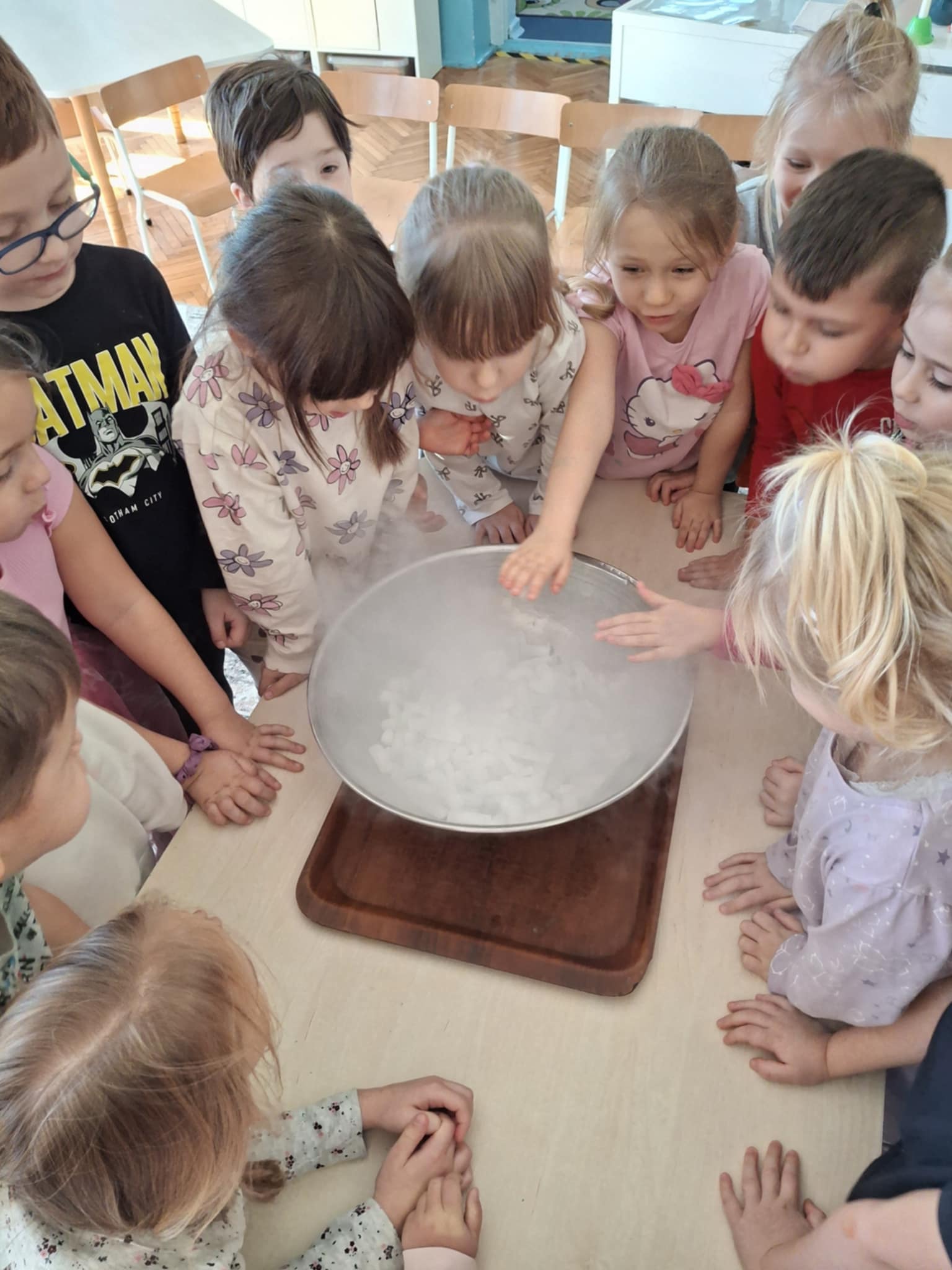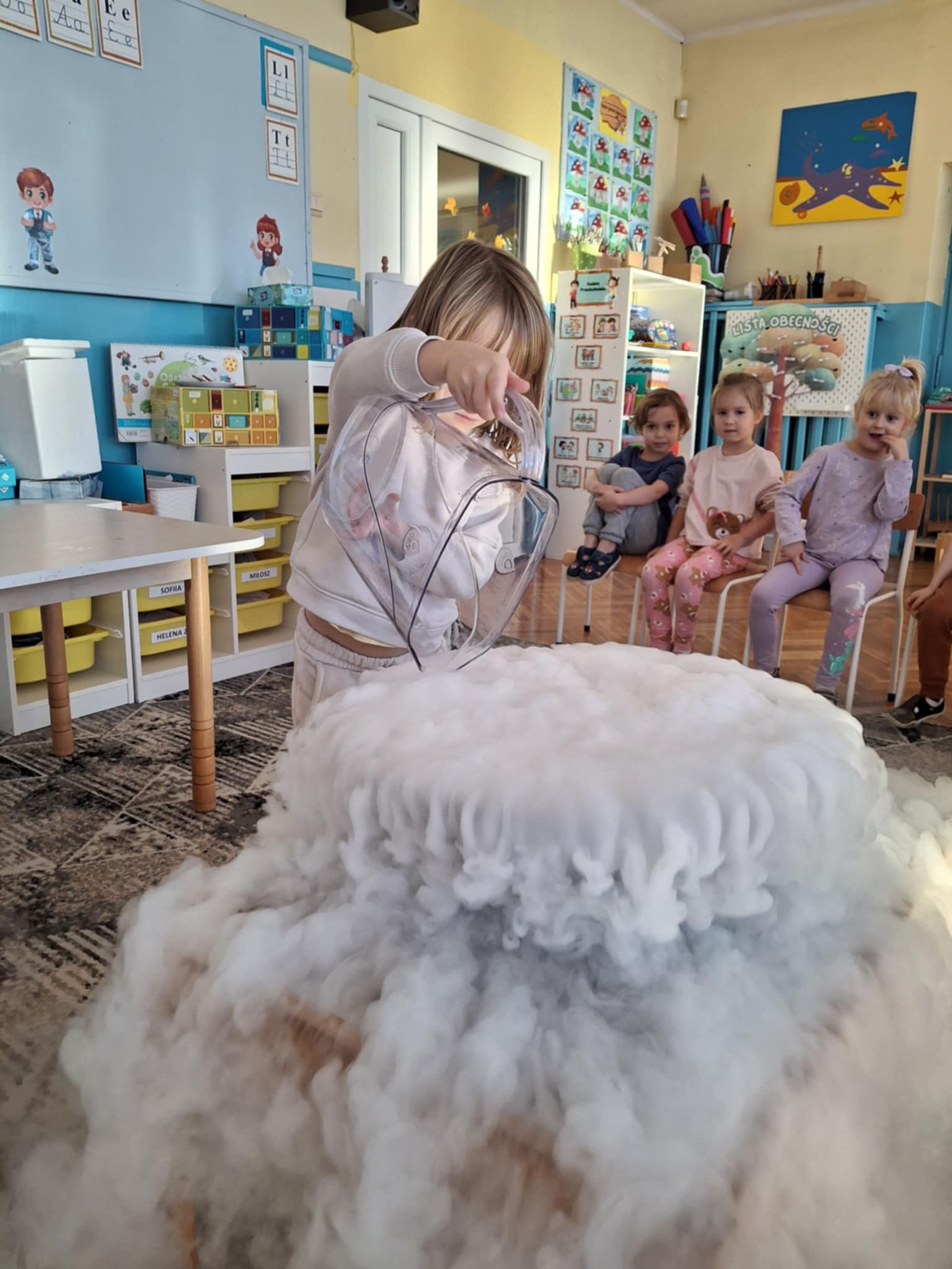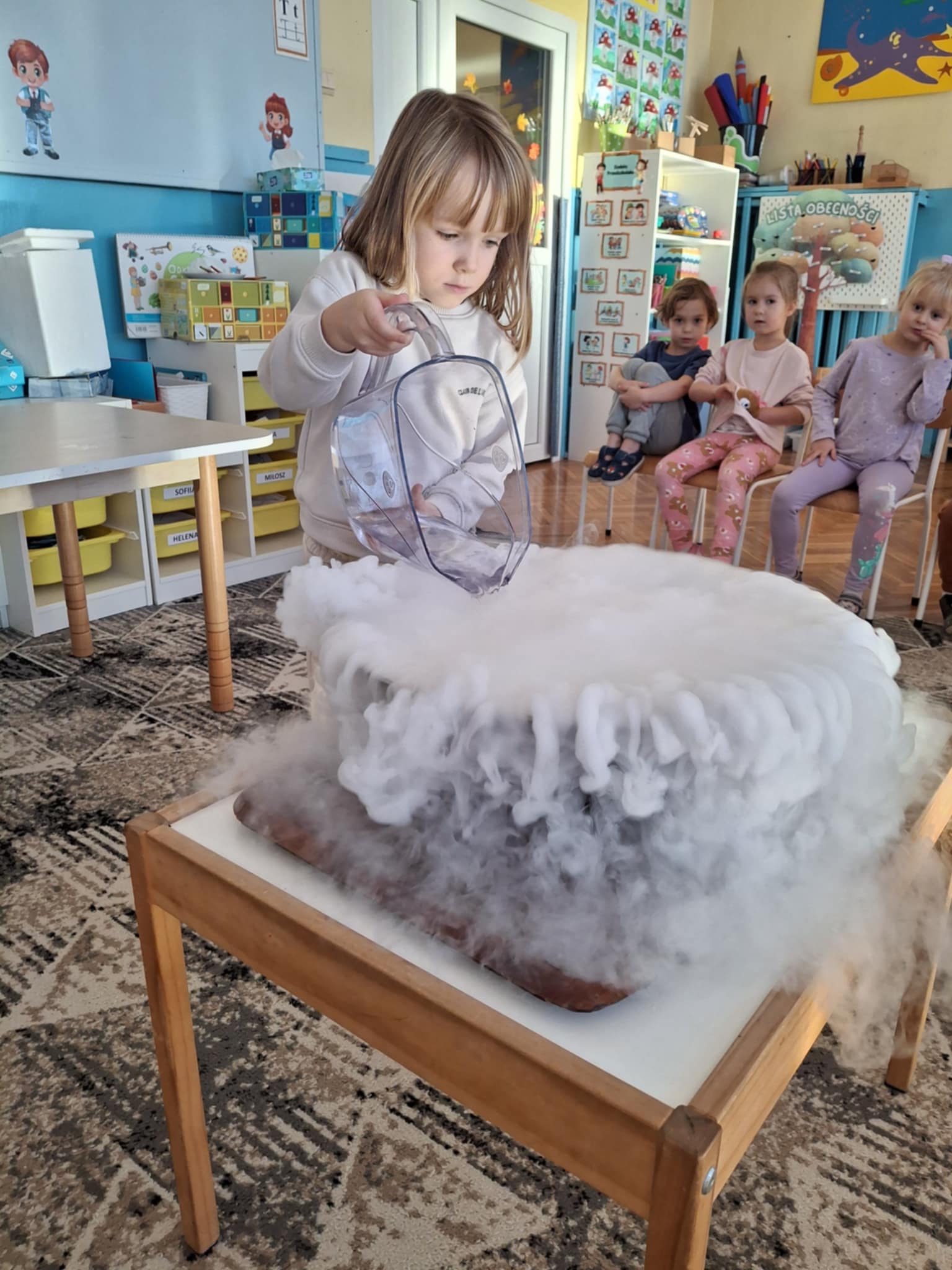 "Spotkanie z nauką" to metafora odnosząca się do interakcji z wiedzą, która może przybrać wiele form: od nauki, aż po rozwijanie pasji czy zdobywanie nowych umiejętności. Dzieci eksperymentowały z suchym lodem. Może przywołamy śnieżną zimę?
