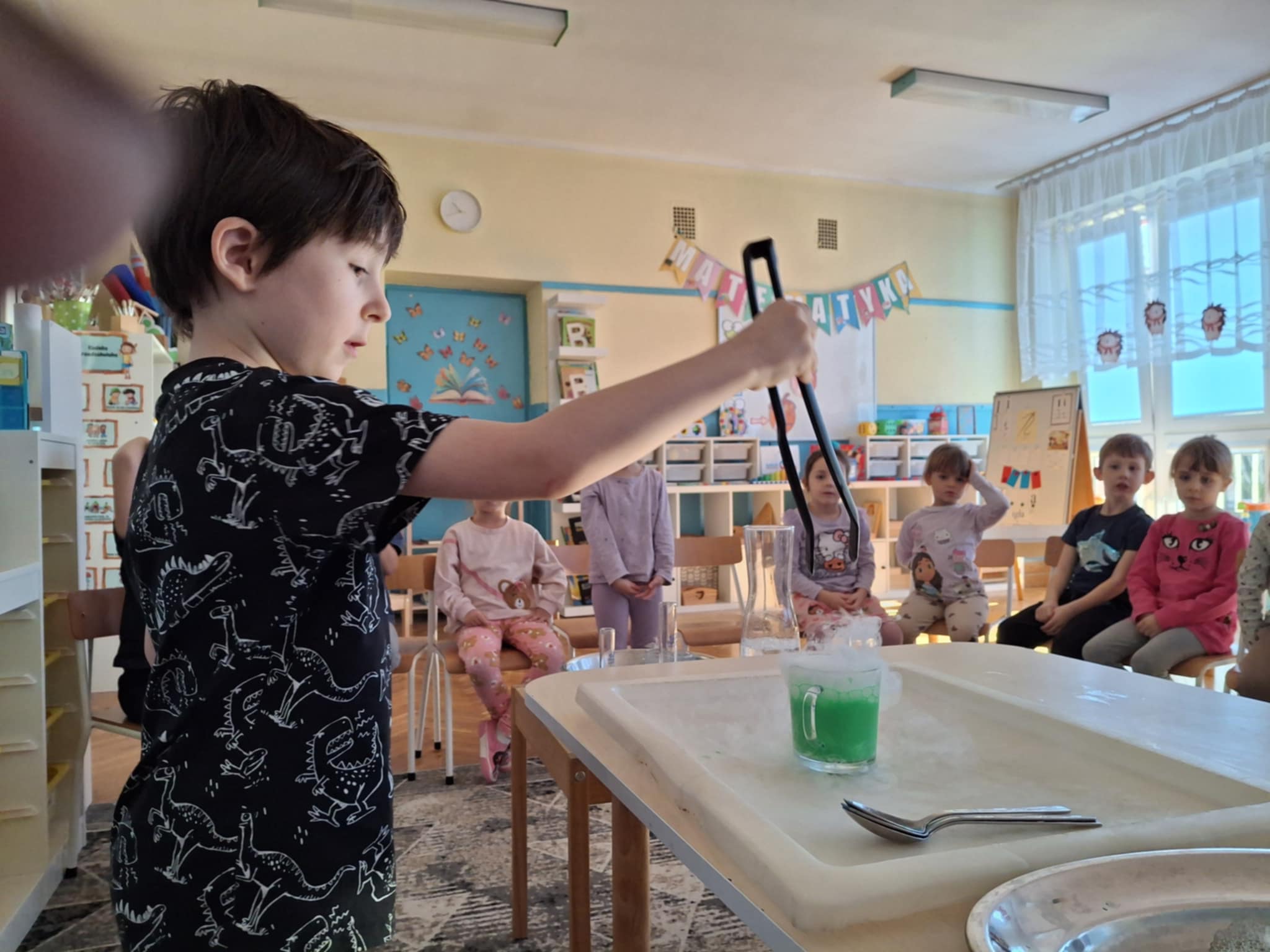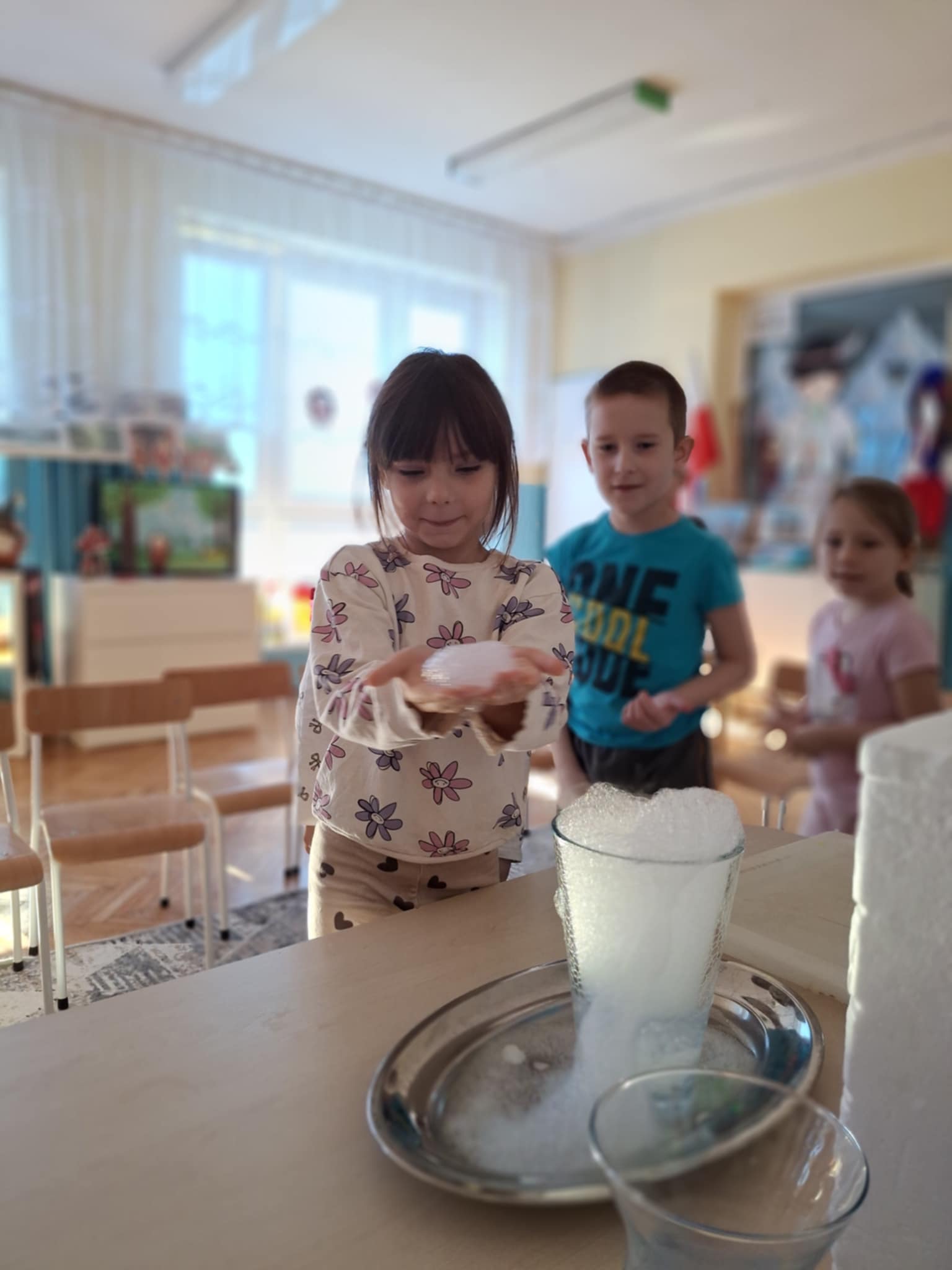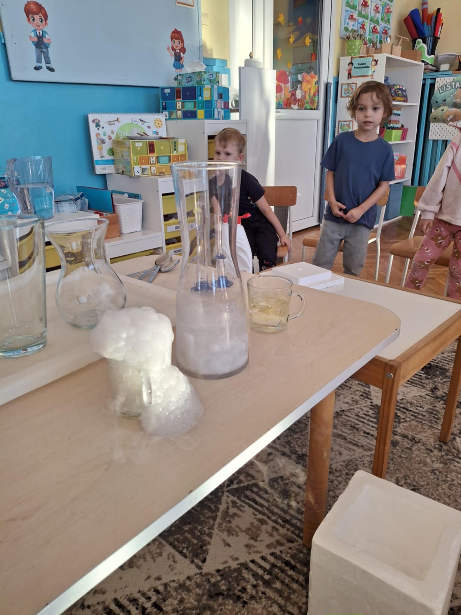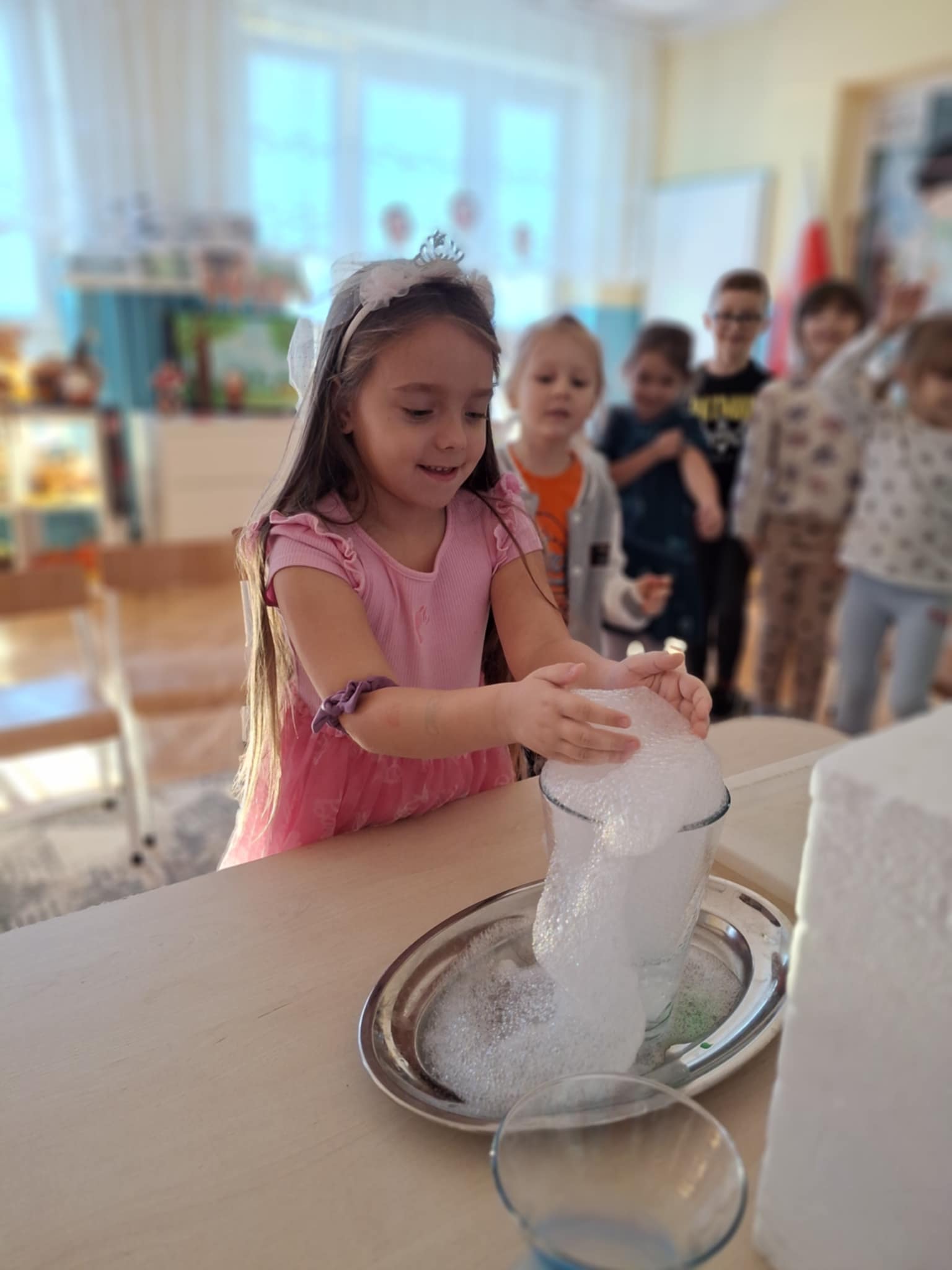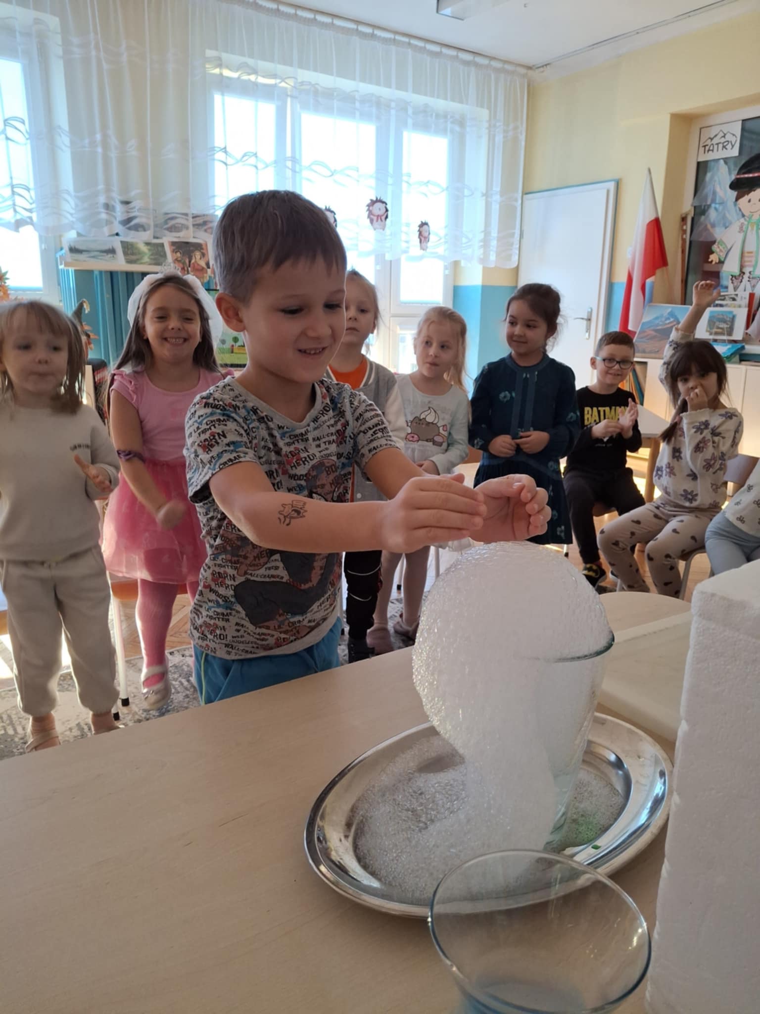 "Spotkanie z nauką" to metafora odnosząca się do interakcji z wiedzą, która może przybrać wiele form: od nauki, aż po rozwijanie pasji czy zdobywanie nowych umiejętności. Dzieci eksperymentowały z suchym lodem. Może przywołamy śnieżną zimę?