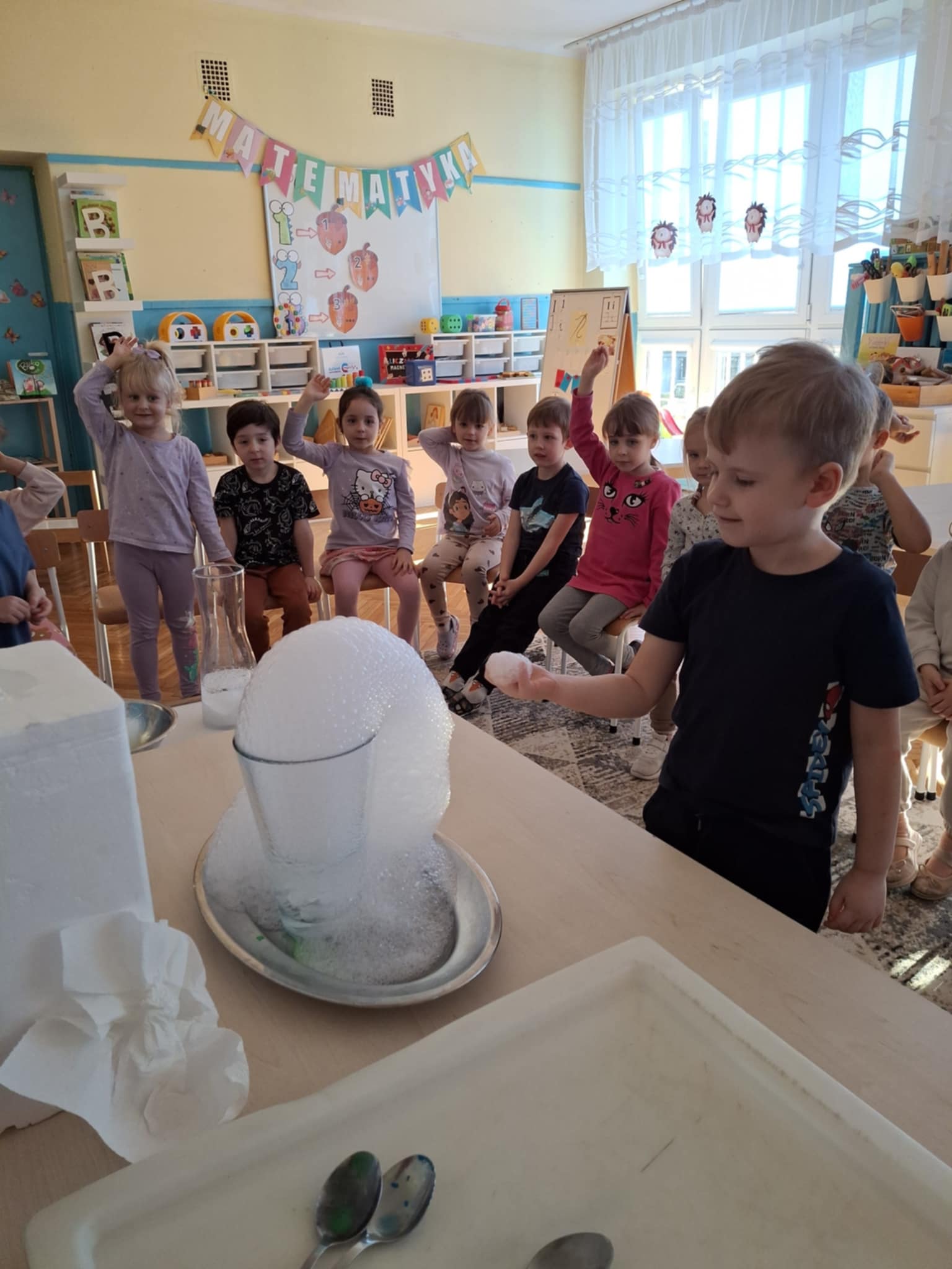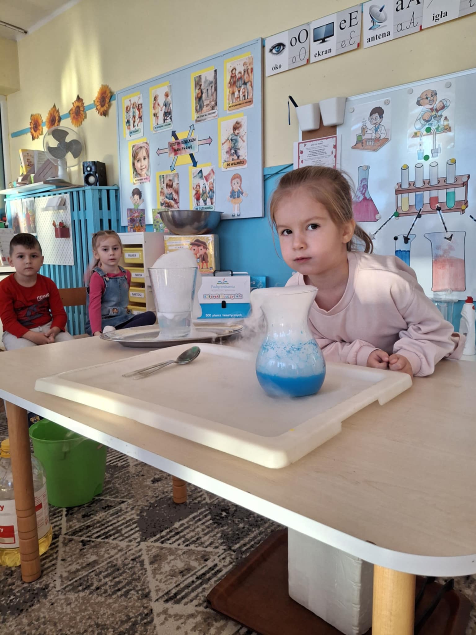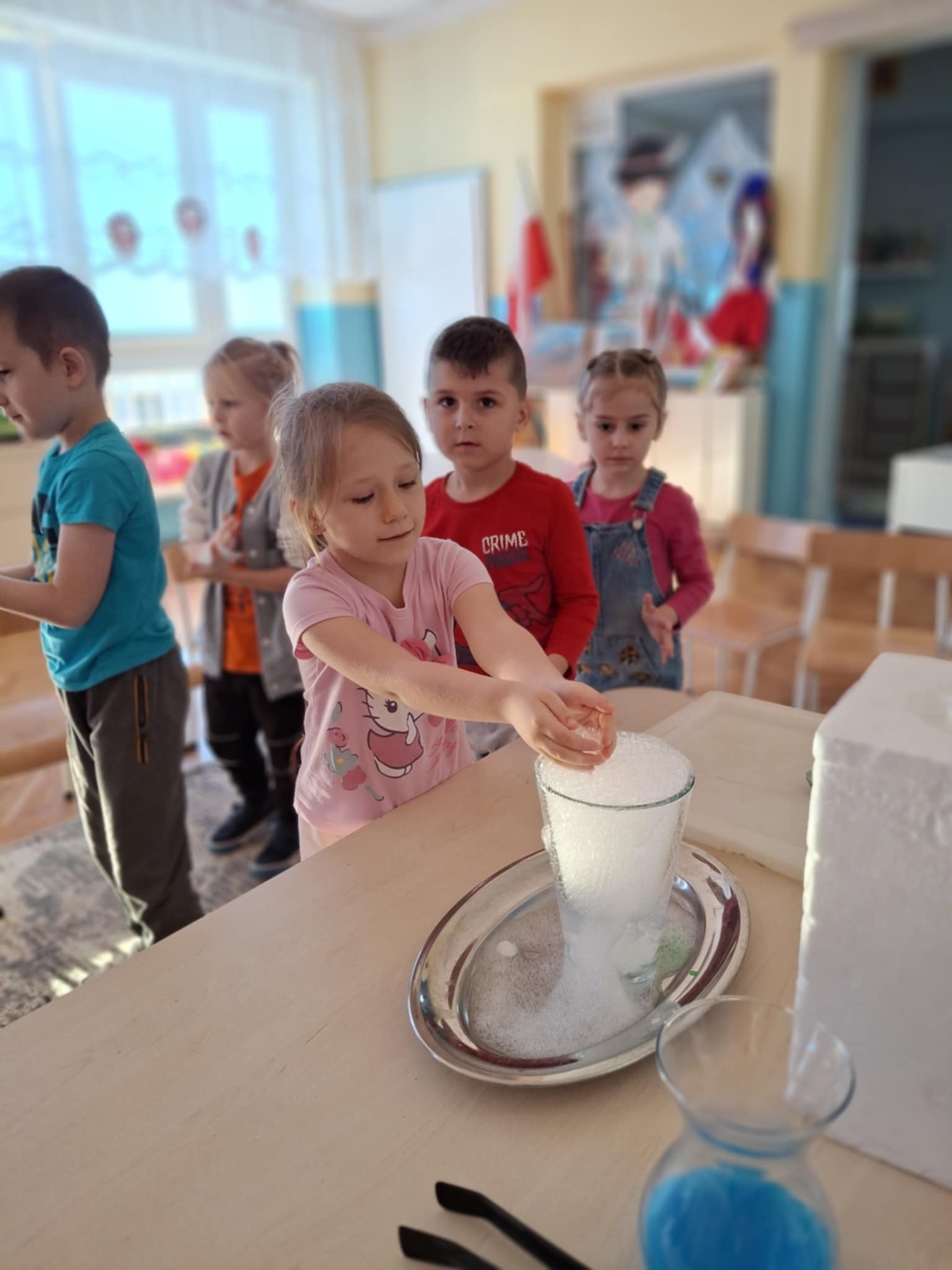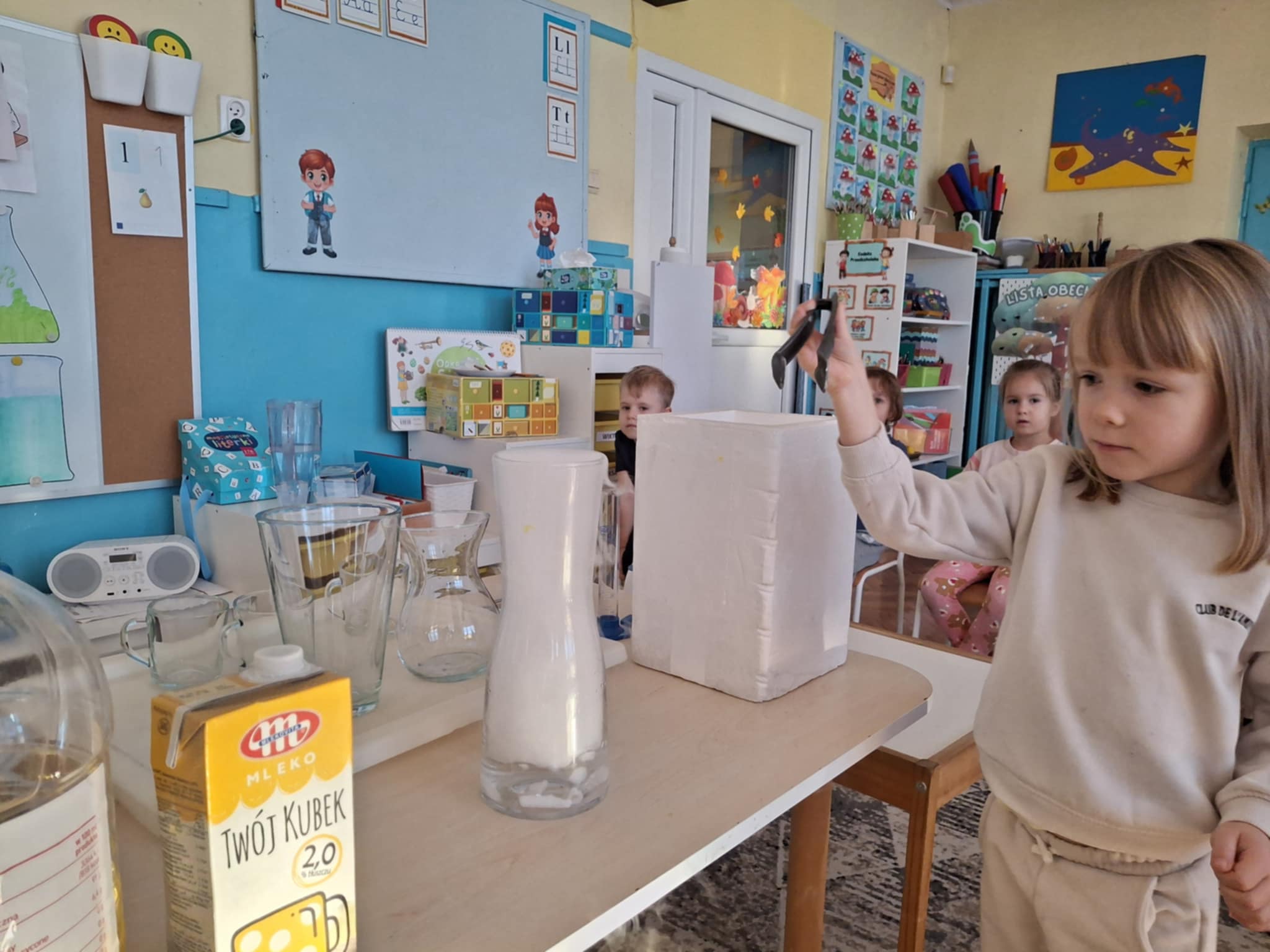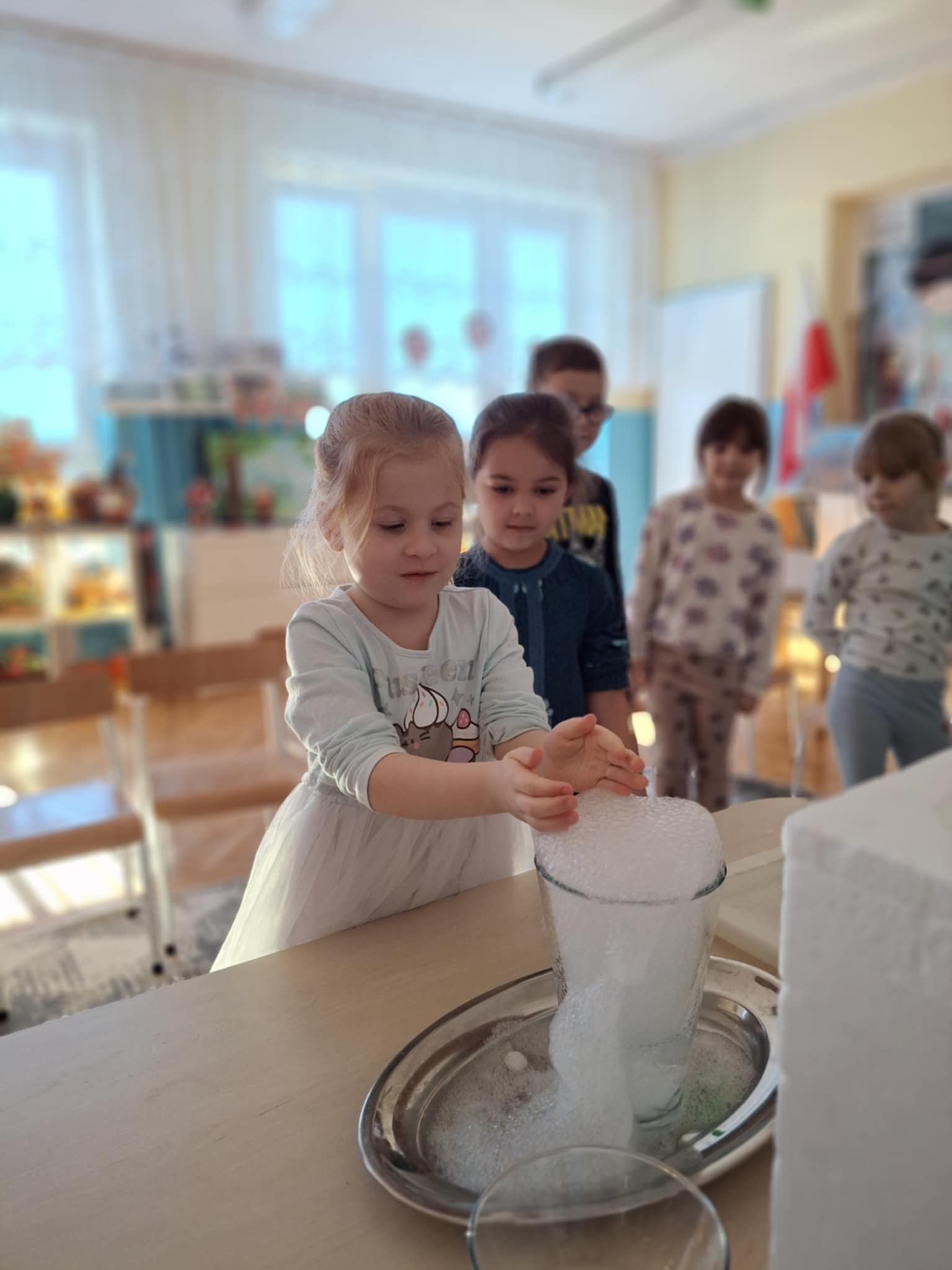 "Spotkanie z nauką" to metafora odnosząca się do interakcji z wiedzą, która może przybrać wiele form: od nauki, aż po rozwijanie pasji czy zdobywanie nowych umiejętności. Dzieci eksperymentowały z suchym lodem. Może przywołamy śnieżną zimę?