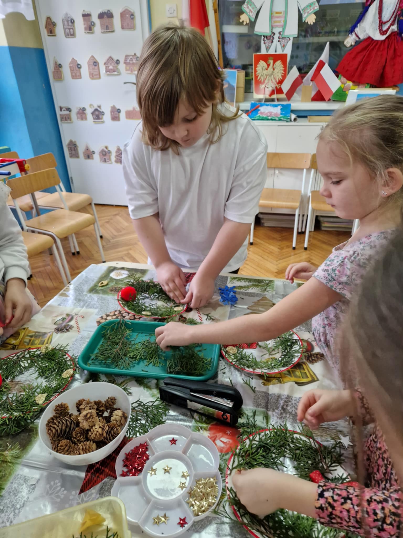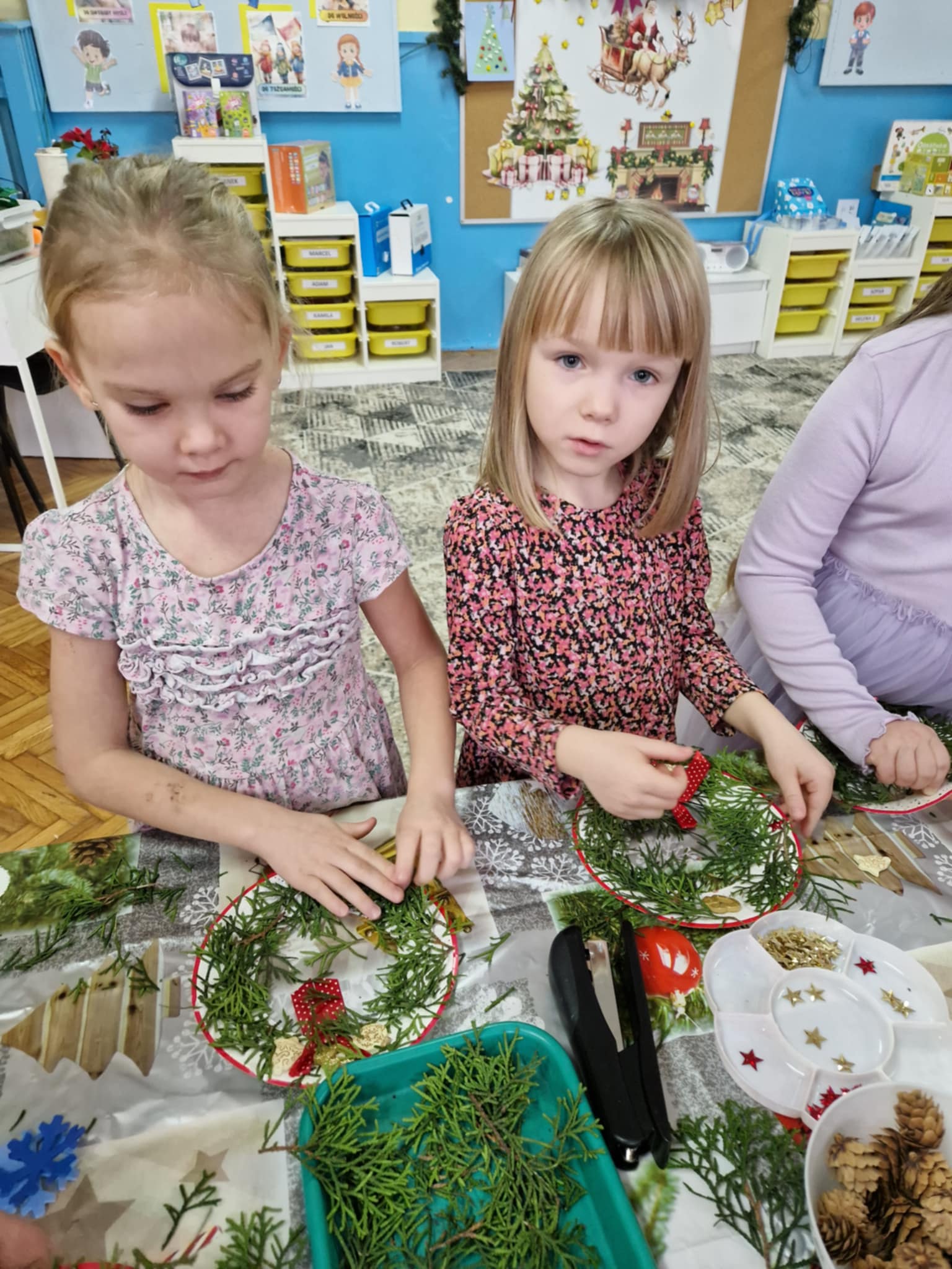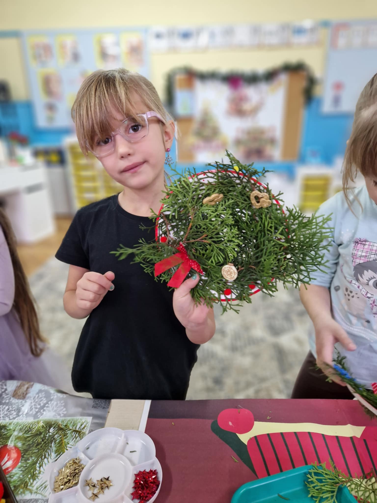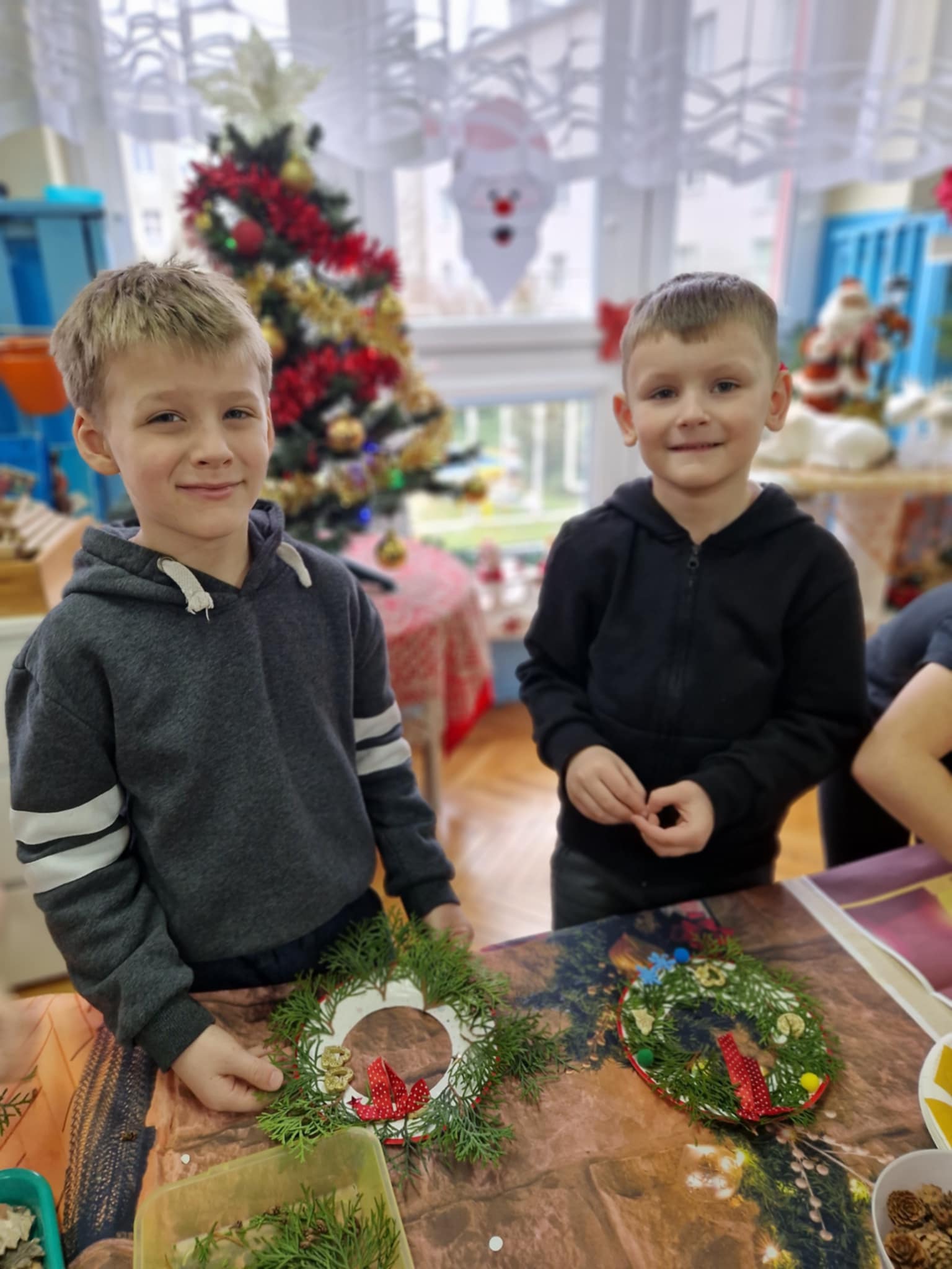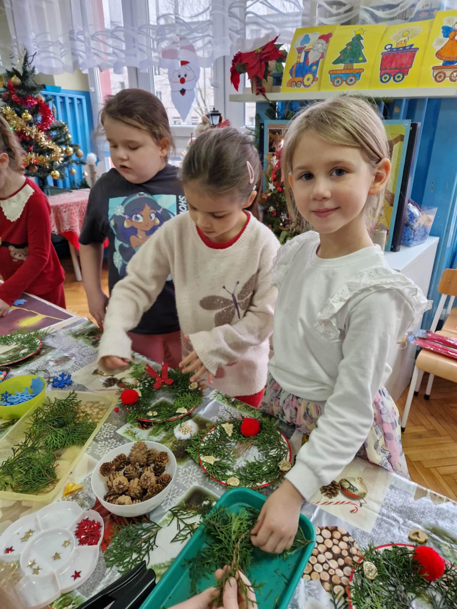 Dzieci z grupy 3 i 4 wziely udział w warsztatach artystycznych, podczqs ktorych wykonały stroiki bożonarodzeniowe, z wykorzystaniem różnorodnych materiałów. Wszystkie dzieci wzięły swoje stroiki do domów, które z pewnością będą piękną ozdobą podczas świąt Bożego Narodzenia.