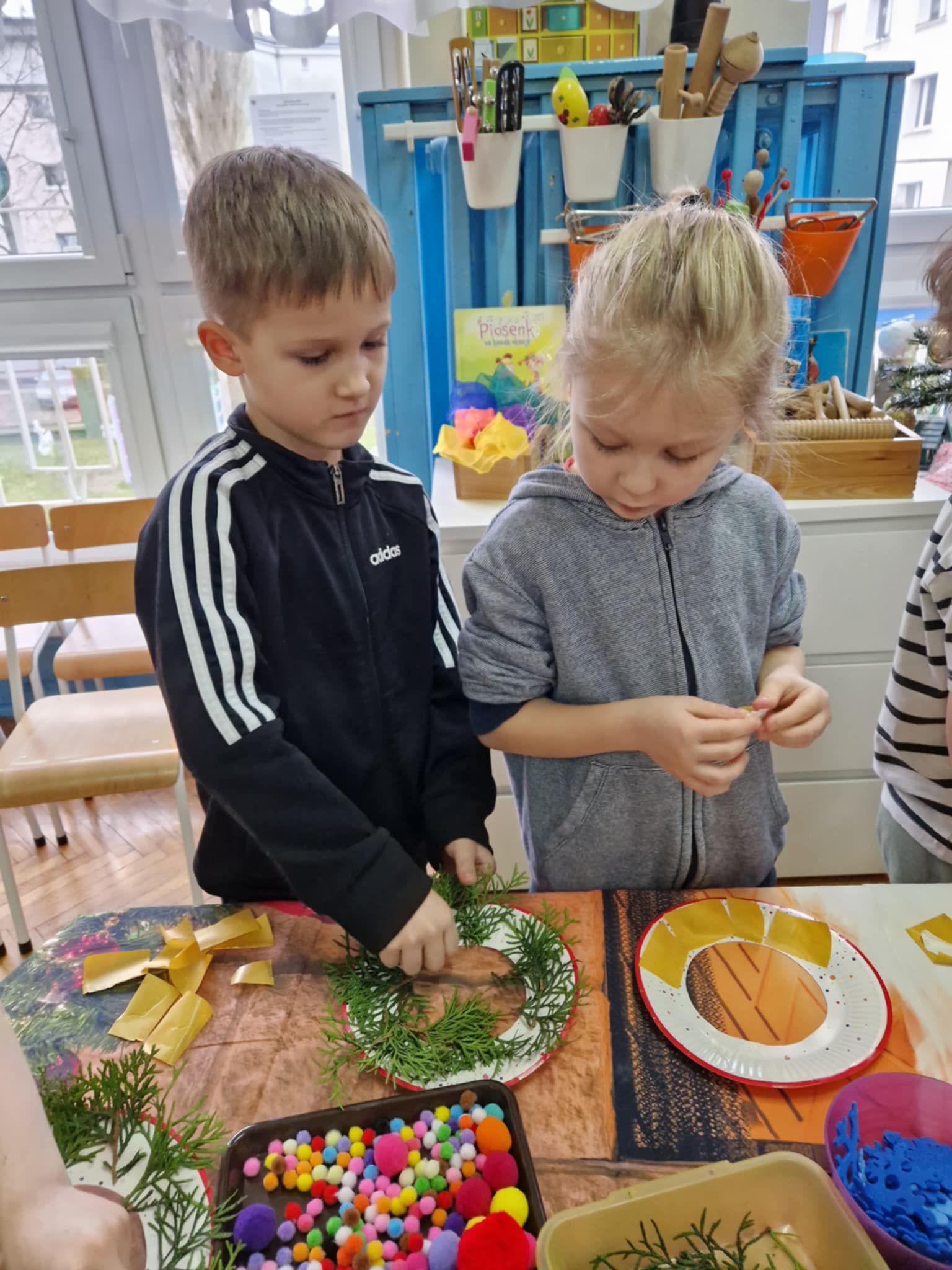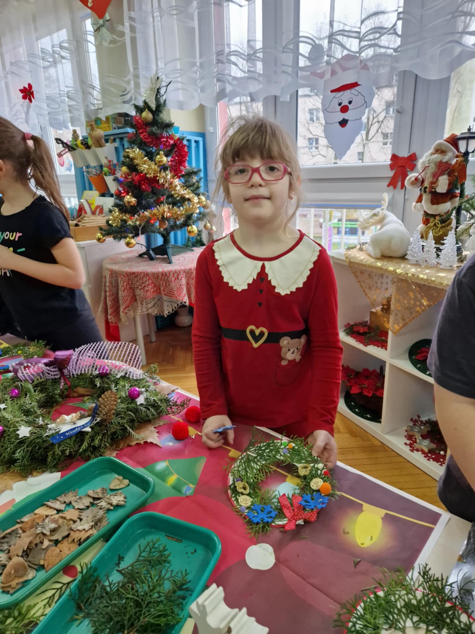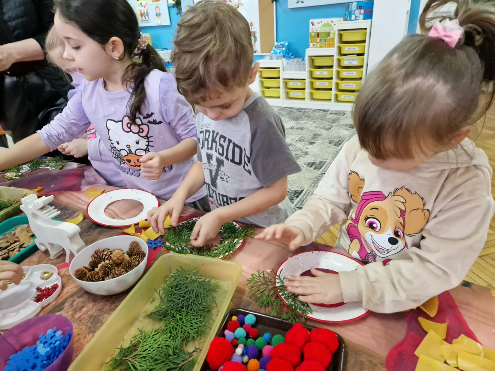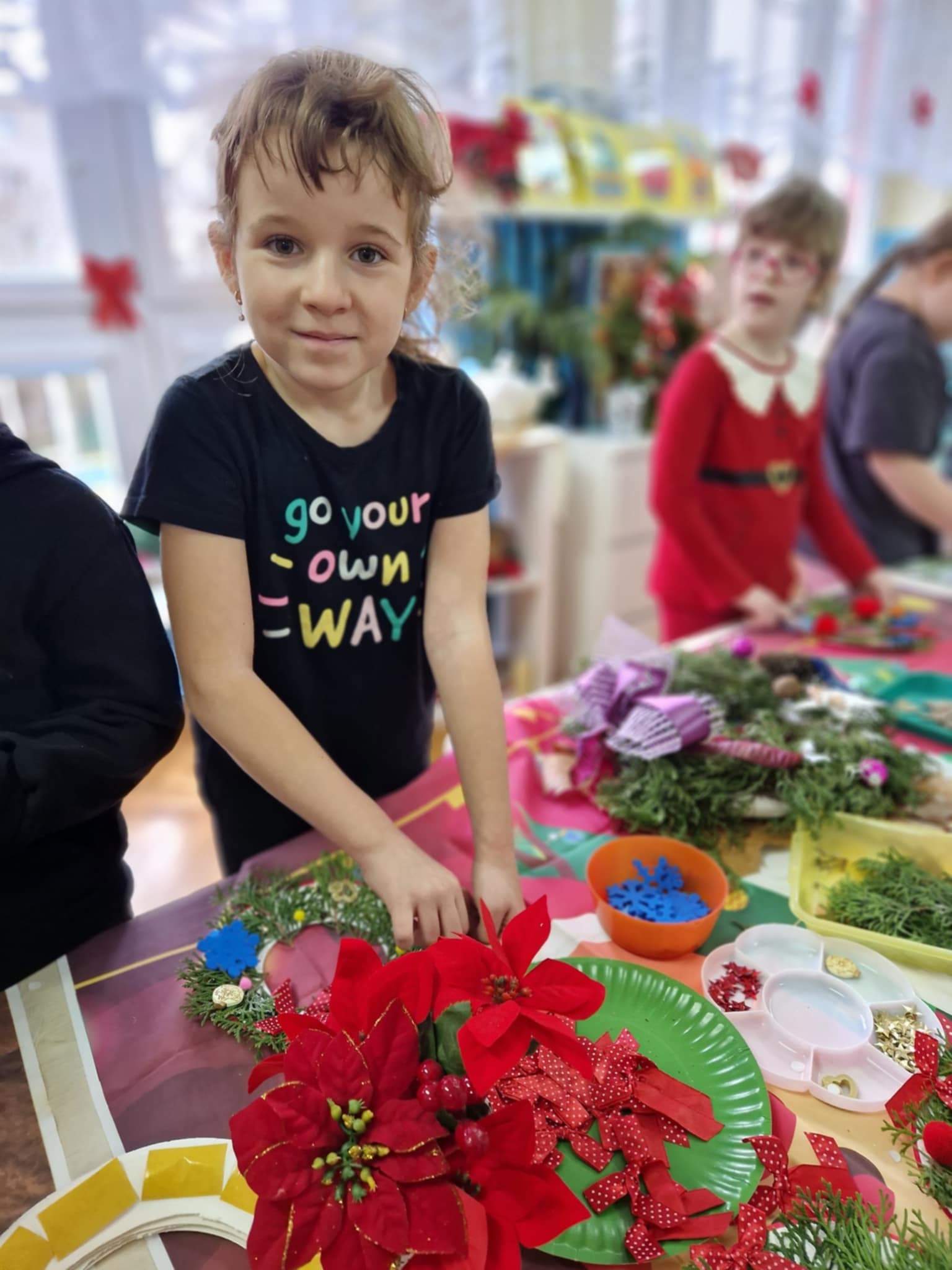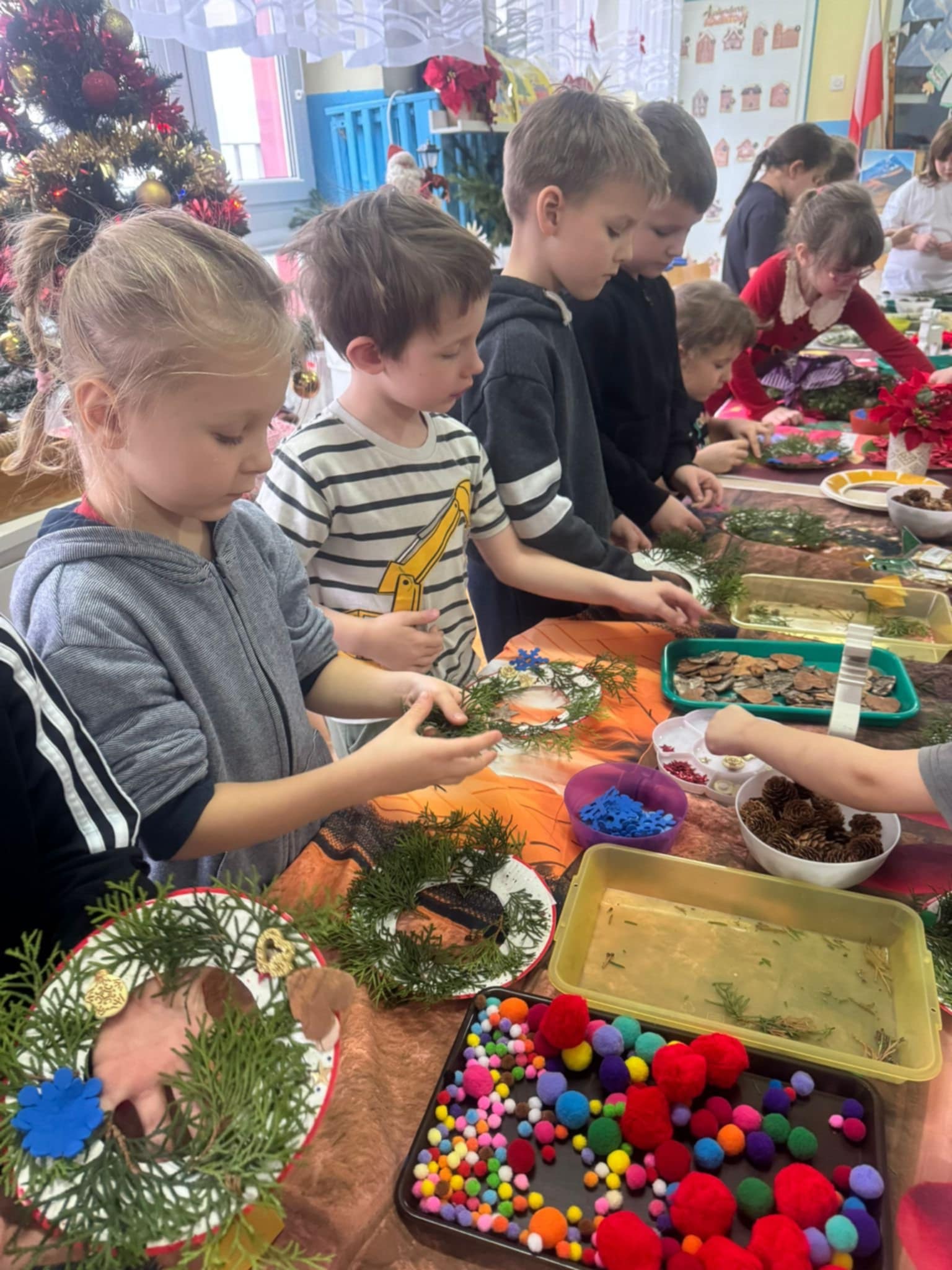 Dzieci z grupy 3 i 4 wziely udział w warsztatach artystycznych, podczqs ktorych wykonały stroiki bożonarodzeniowe, z wykorzystaniem różnorodnych materiałów. Wszystkie dzieci wzięły swoje stroiki do domów, które z pewnością będą piękną ozdobą podczas świąt Bożego Narodzenia.