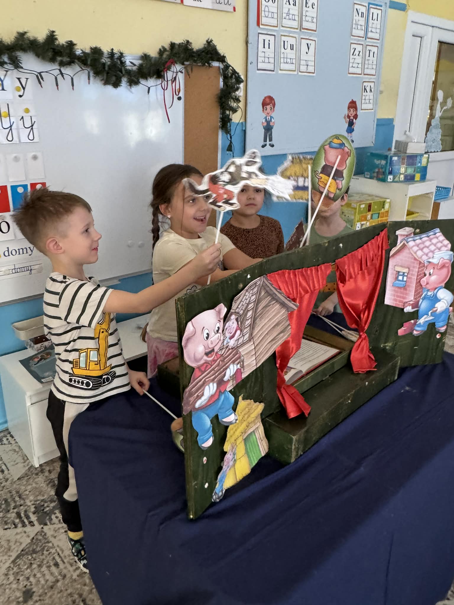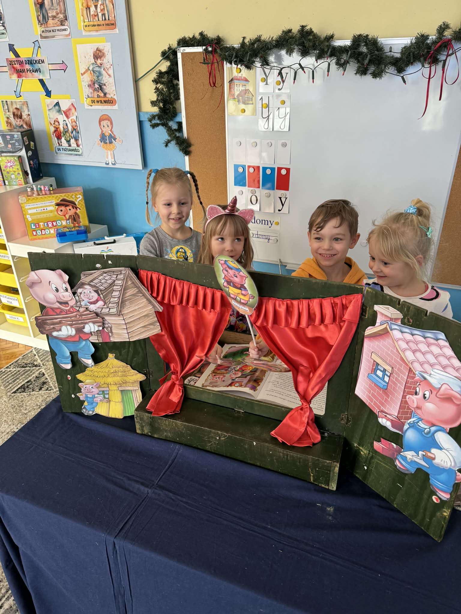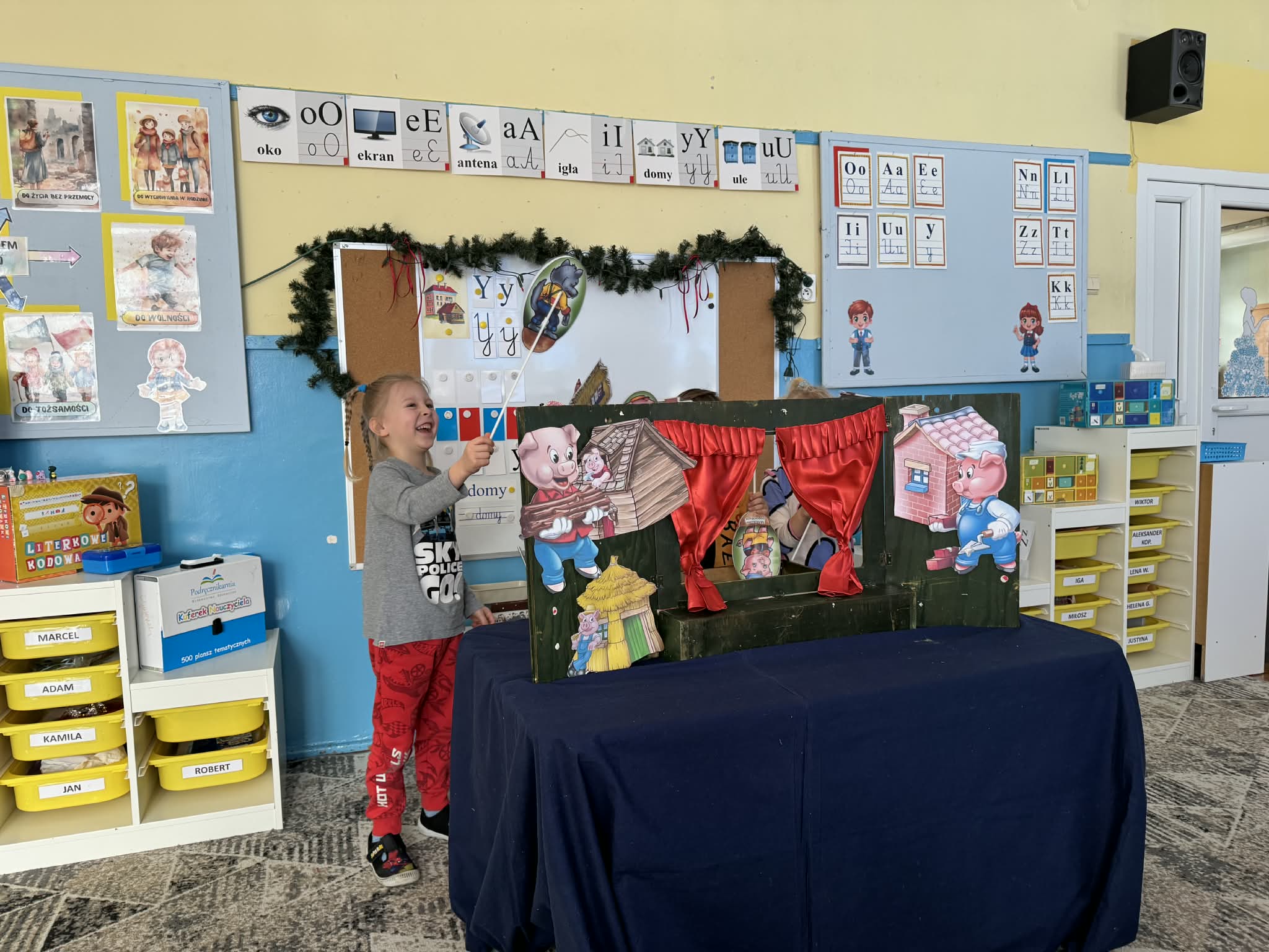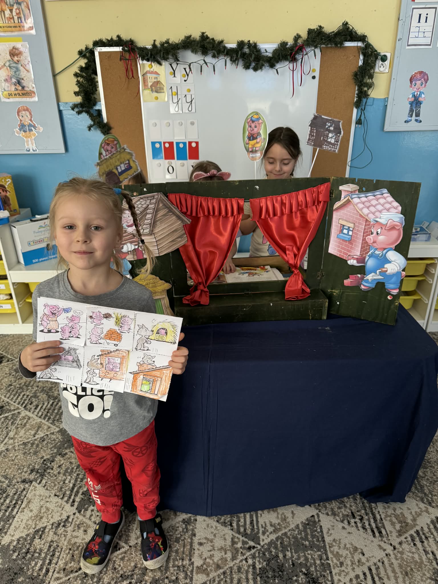 W naszym przedszkolu dzieci miały okazję przenieść się do świata bajek, uczestnicząc w wyjątkowych zajęciach inspirowanych opowieścią ,,Trzy świnki”. Podczas teatrzyku mali aktorzy z ogromnym zaangażowaniem wcielali się w role trzech świnek oraz groźnego wilka. Występ był pełen emocji, śmiechu i wspólnej zabawy, a mali artyści wykazali się odwagą, kreatywnością i piękną współpracą. Następnie dzieci układały historyjkę obrazkowej do bajki ,,Trzy świnki”. Zadaniem przedszkolaków było ułożenie obrazków w odpowiedniej kolejności, tak aby przedstawiały prawidłowy przebieg wydarzeń.