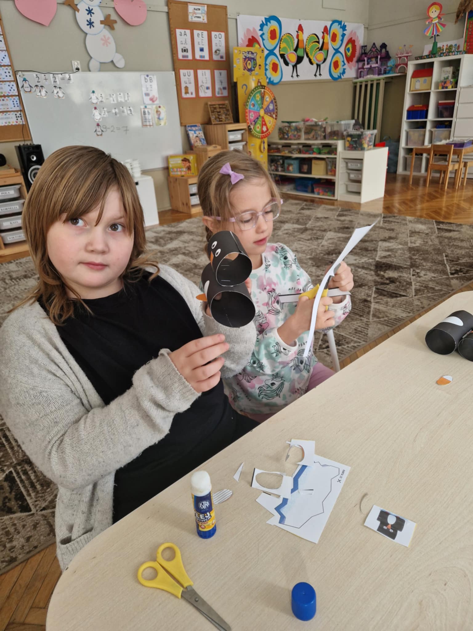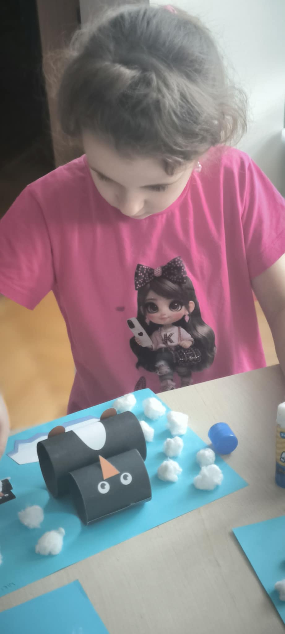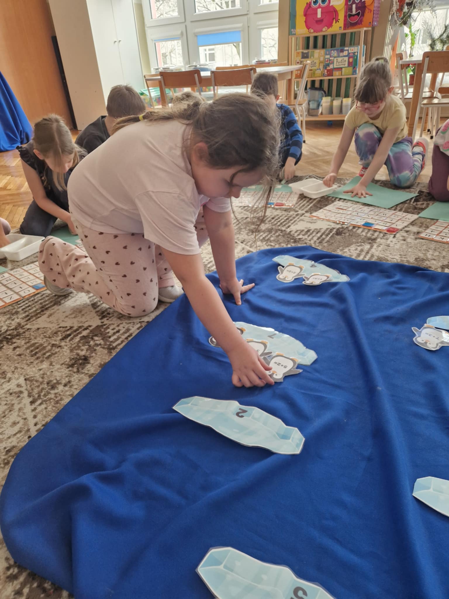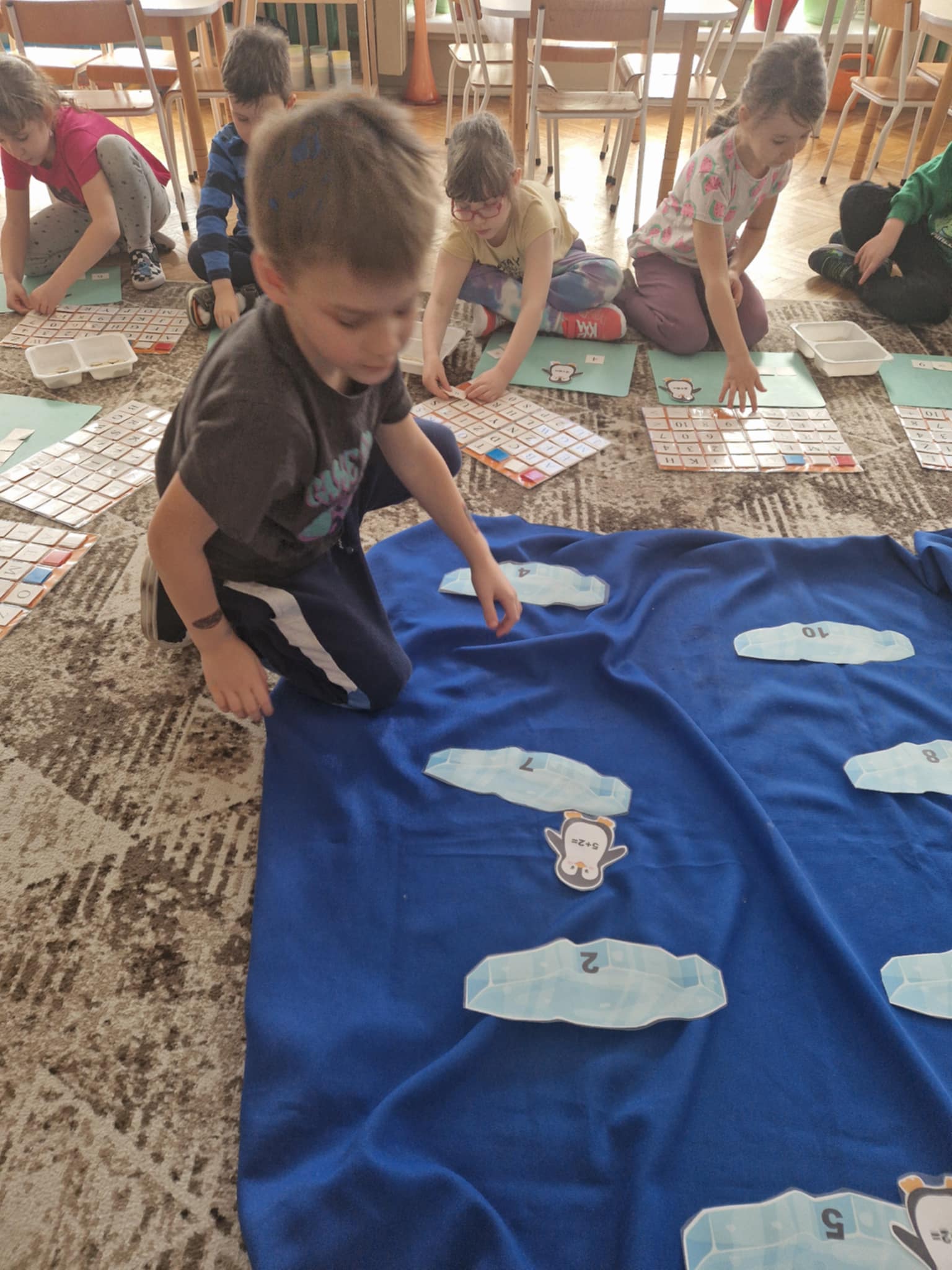 Wykorzystując tematykę zwierząt polarnych ćwiczyliśmy umiejętność liczenia i logicznego myślenia poprzez rozwiązywanie prostych zadań tekstowych. Następnie dzieci wykonały pracę plastyczno-techniczną "Pingwiny na lodzie".