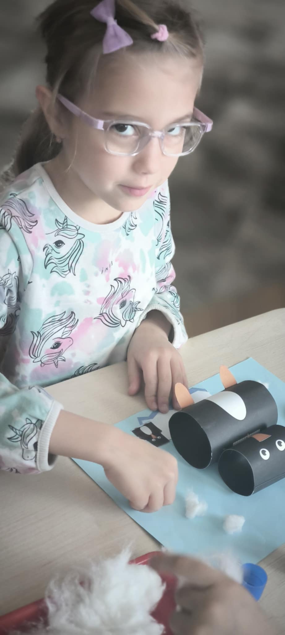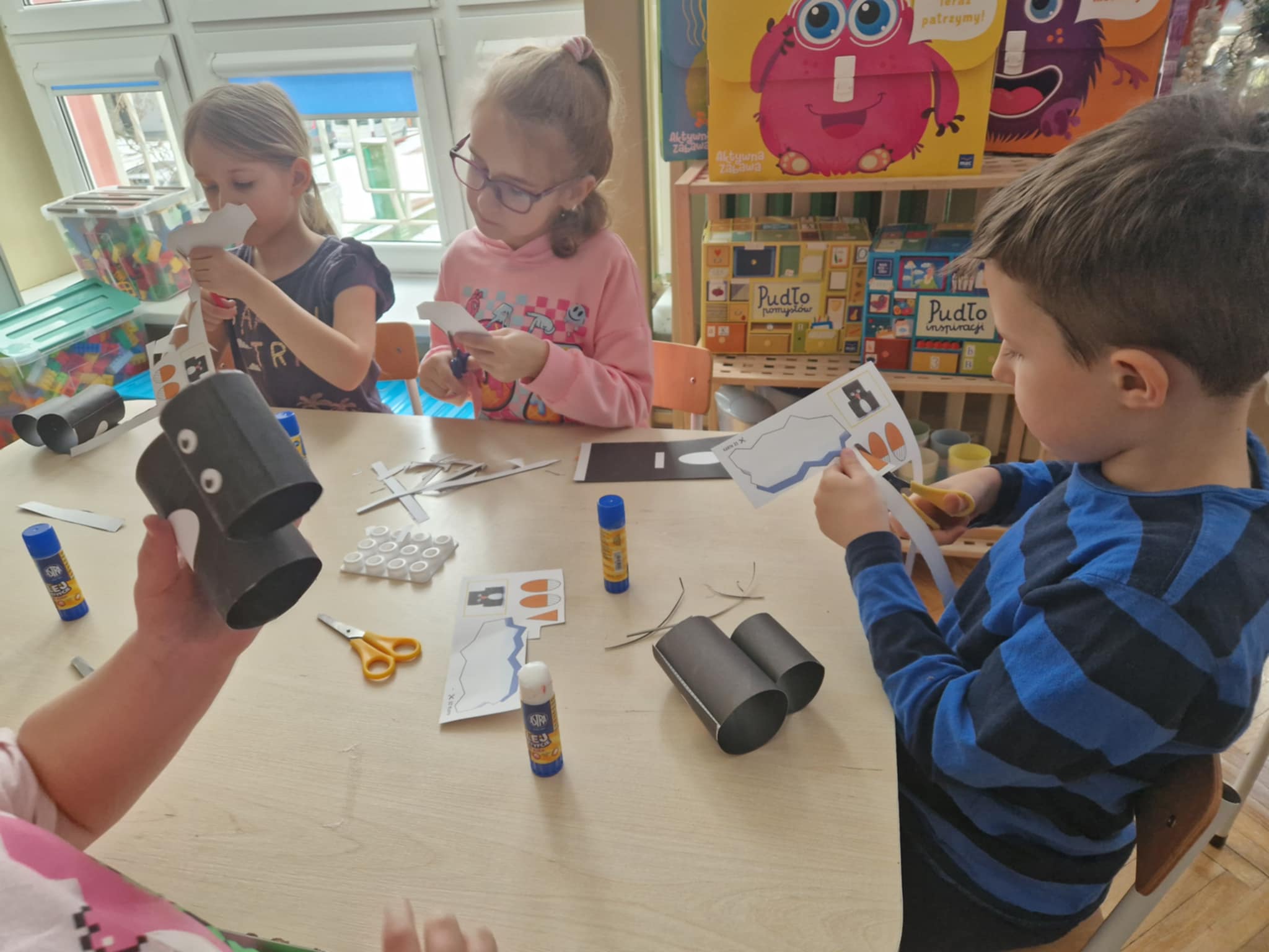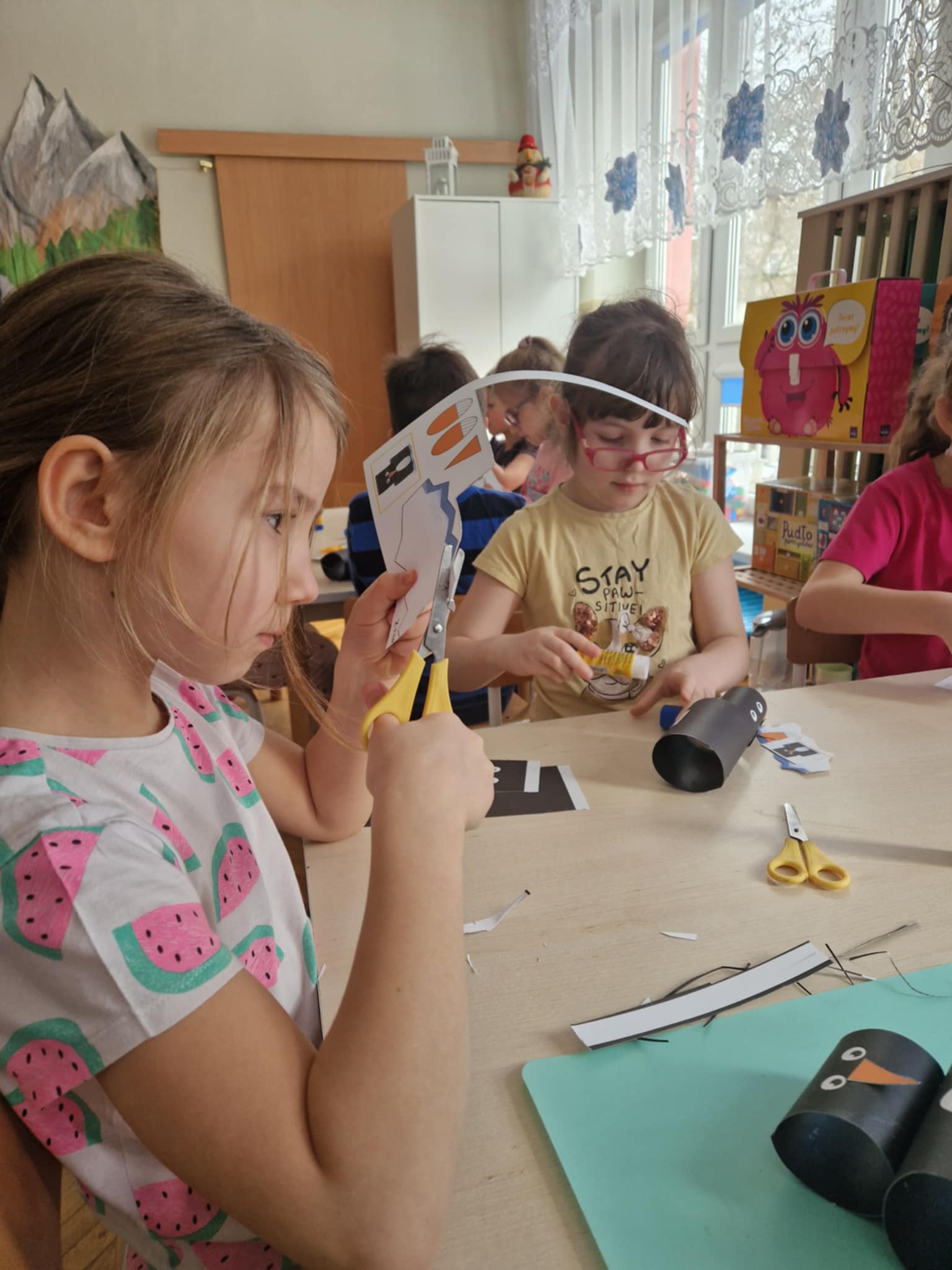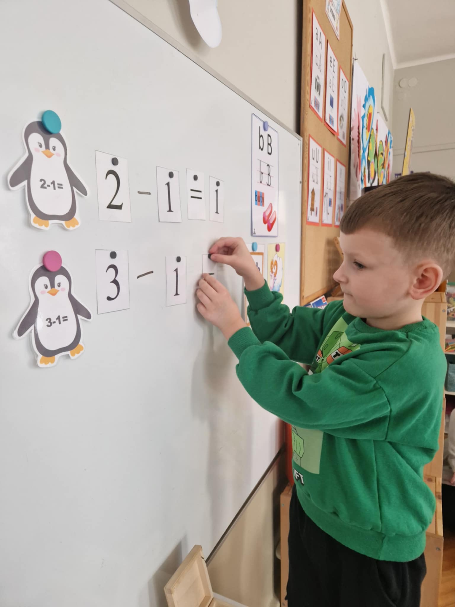 Wykorzystując tematykę zwierząt polarnych ćwiczyliśmy umiejętność liczenia i logicznego myślenia poprzez rozwiązywanie prostych zadań tekstowych. Następnie dzieci wykonały pracę plastyczno-techniczną "Pingwiny na lodzie".