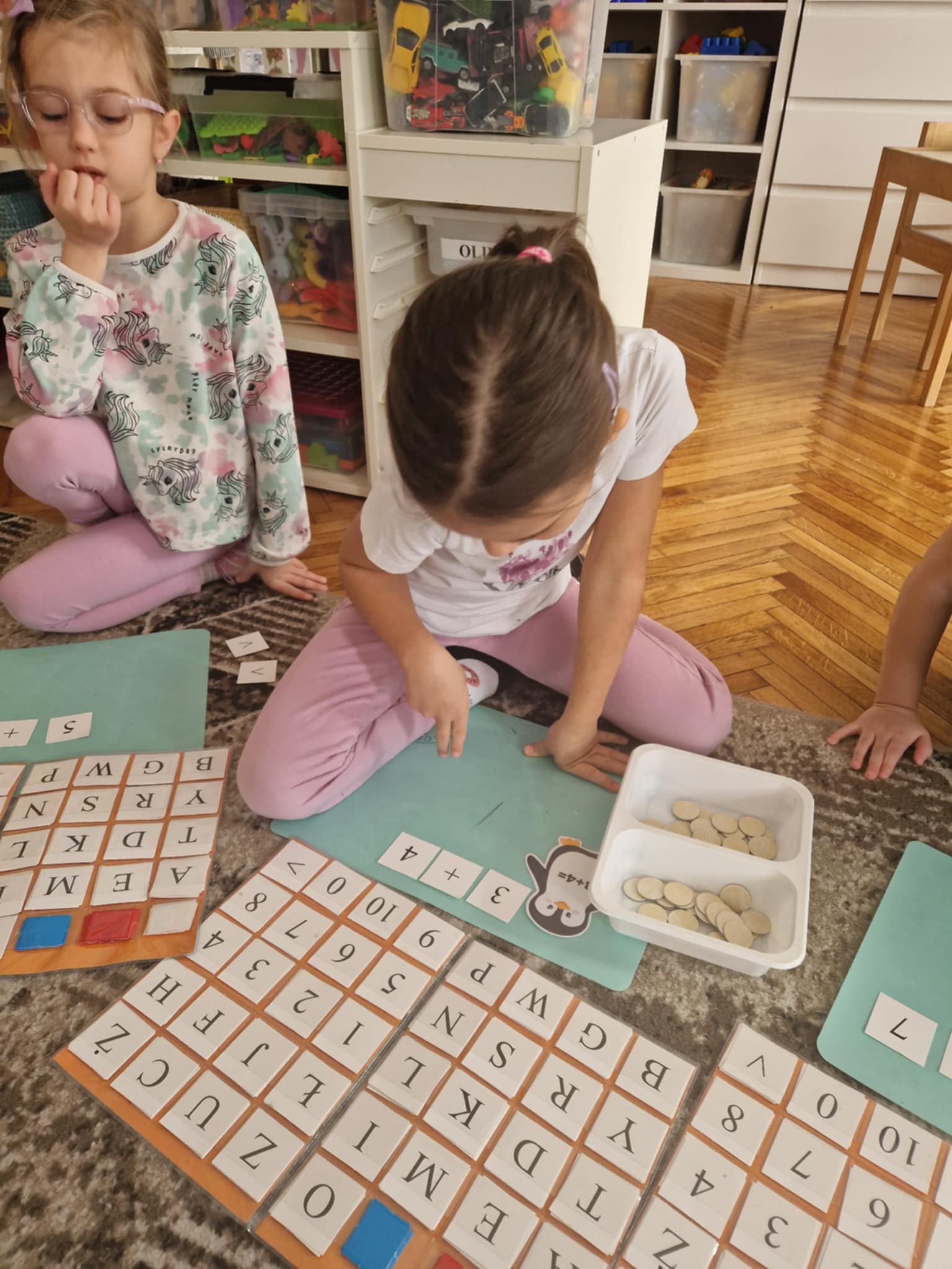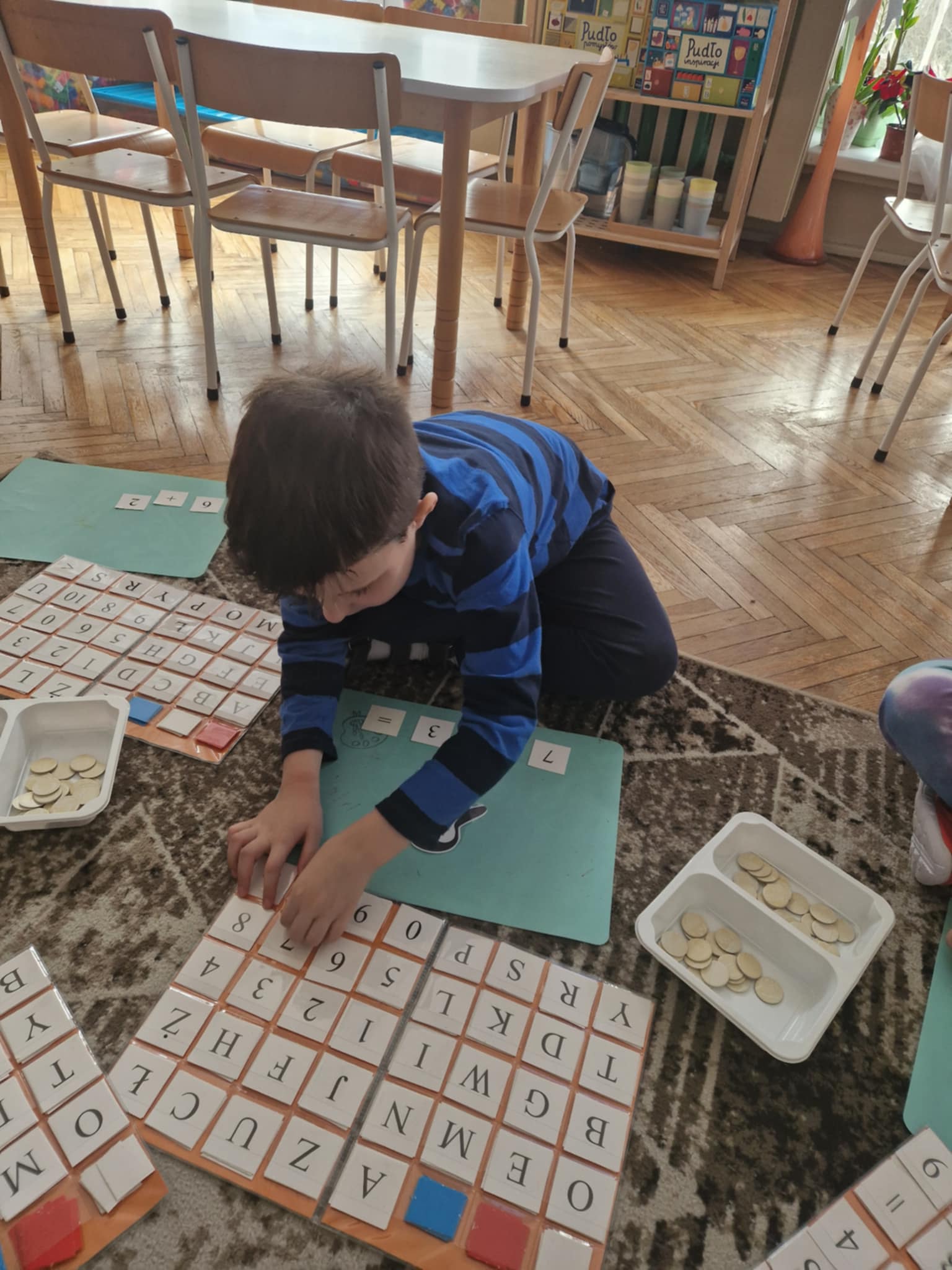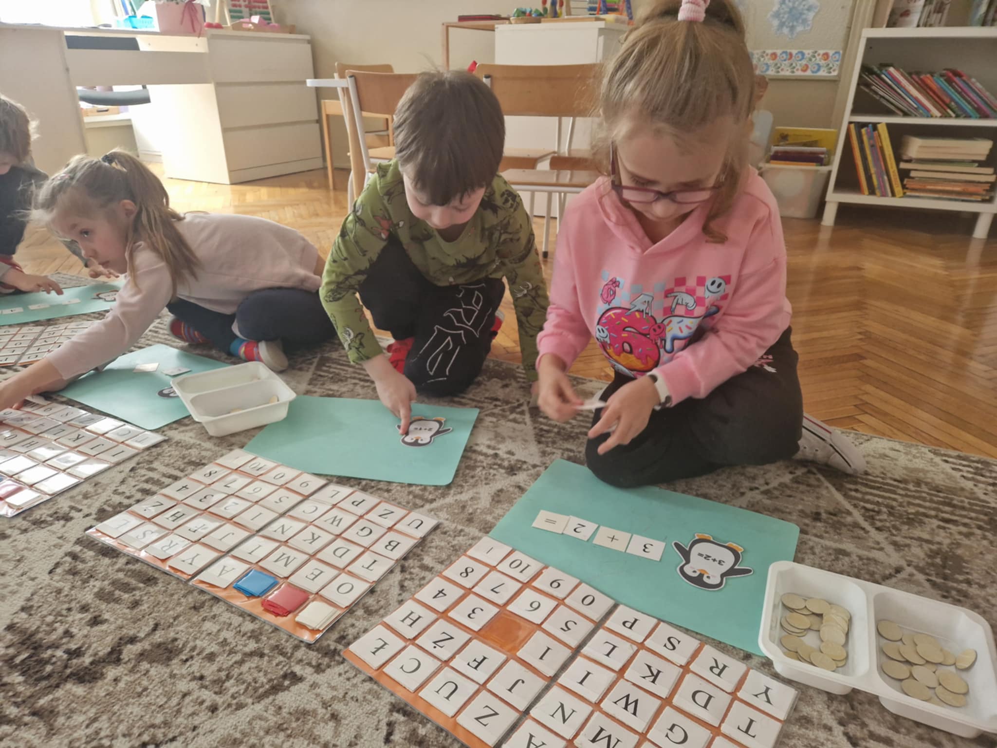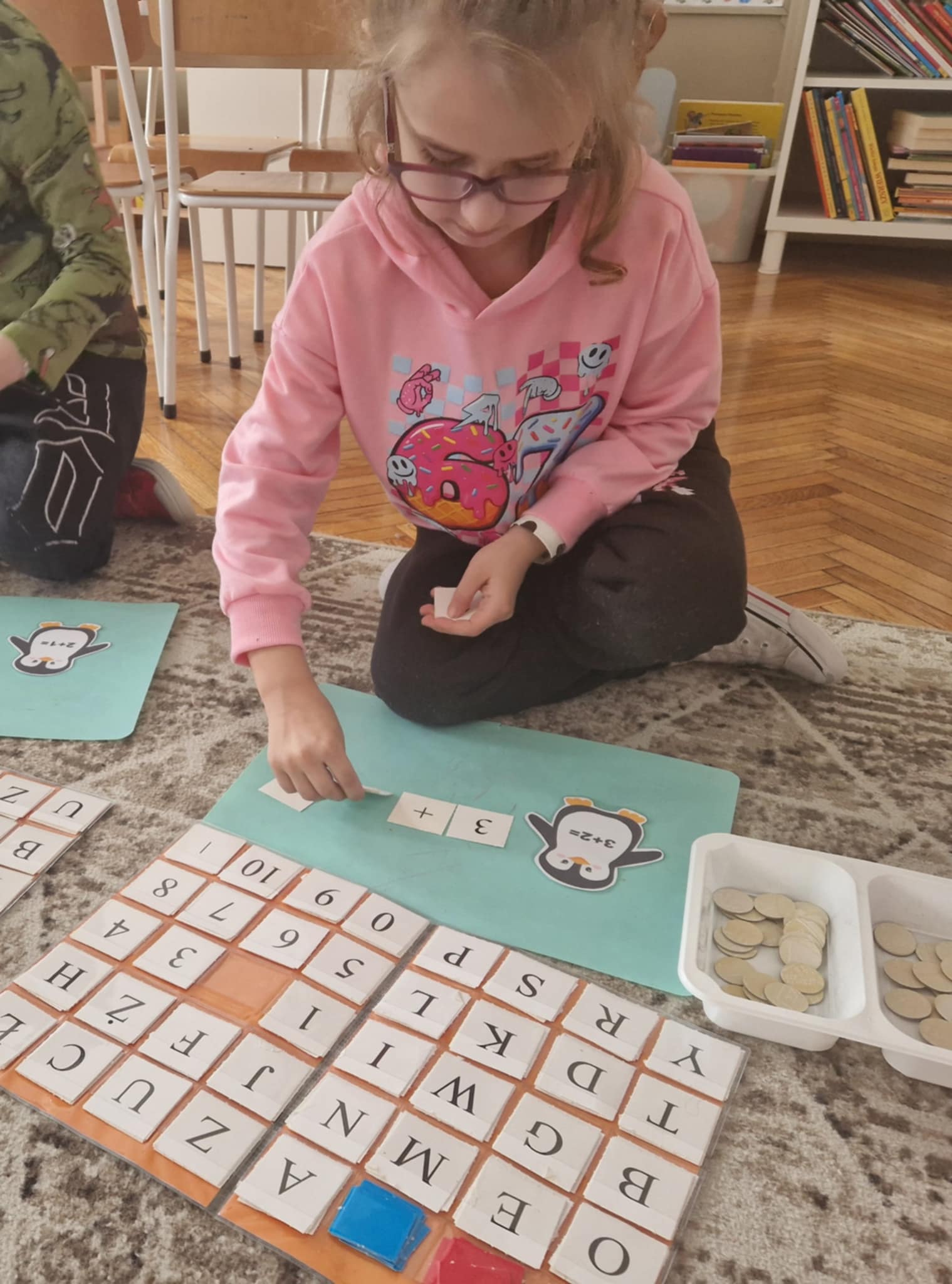 Wykorzystując tematykę zwierząt polarnych ćwiczyliśmy umiejętność liczenia i logicznego myślenia poprzez rozwiązywanie prostych zadań tekstowych. Następnie dzieci wykonały pracę plastyczno-techniczną "Pingwiny na lodzie".