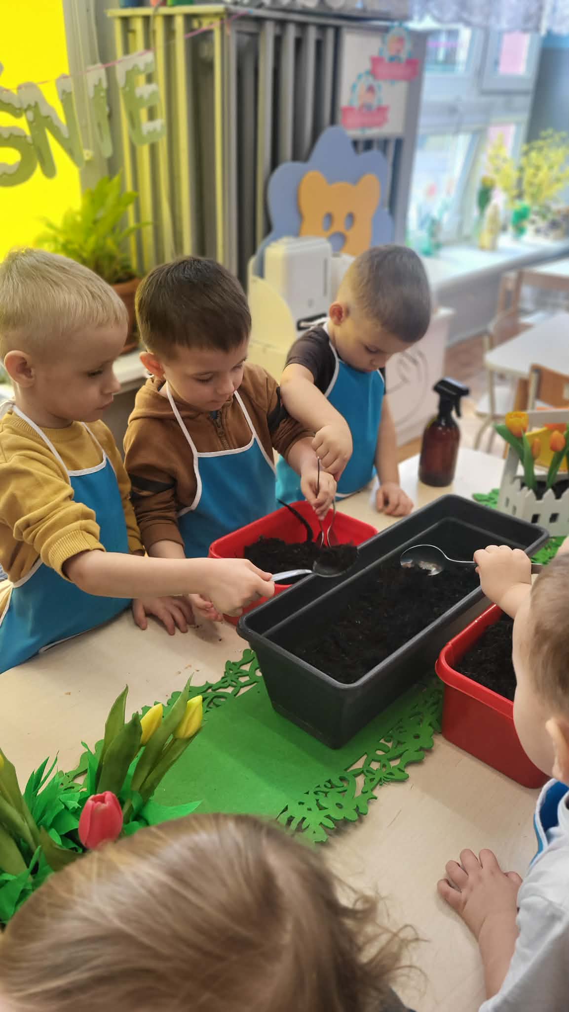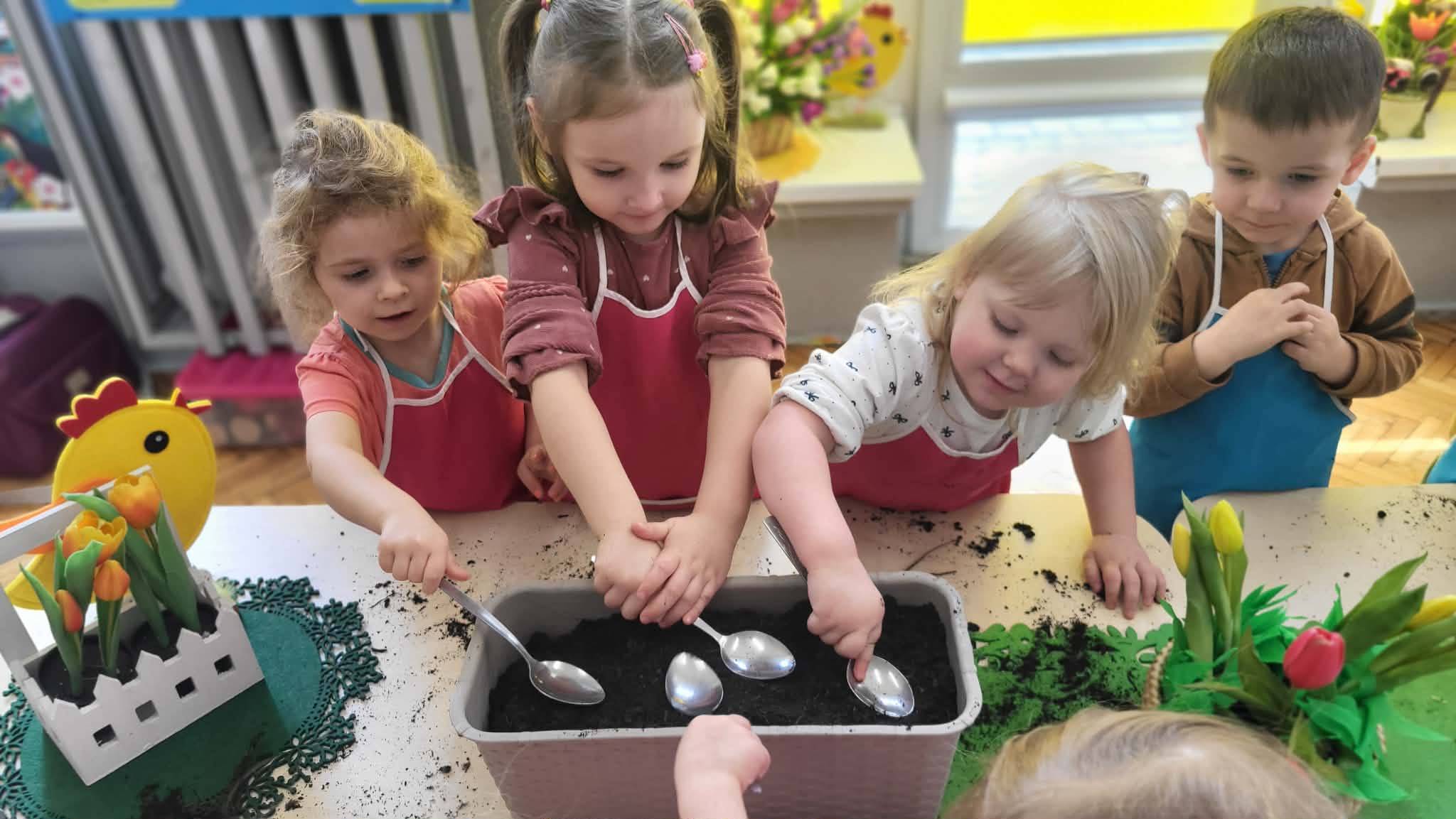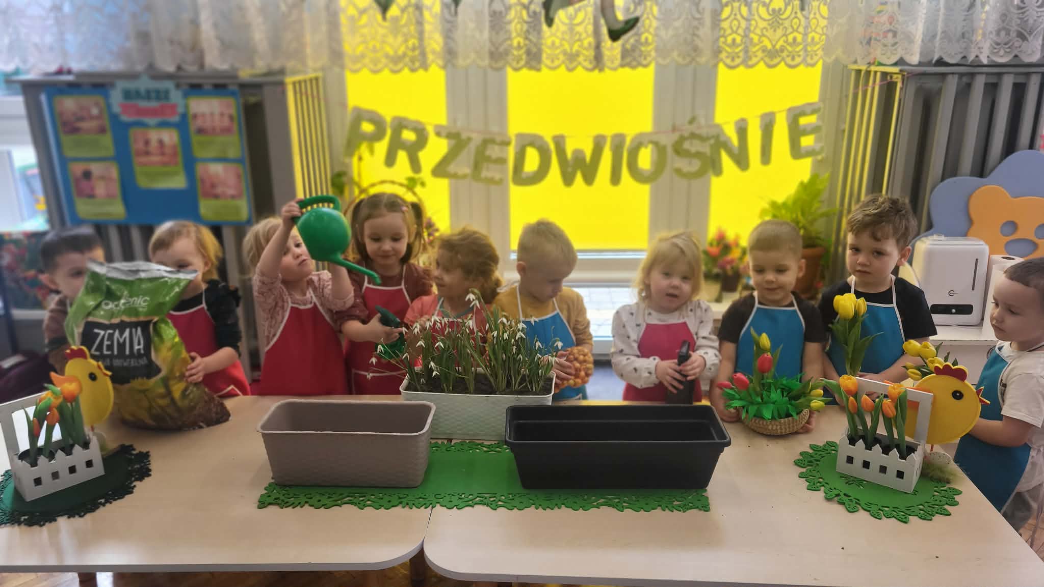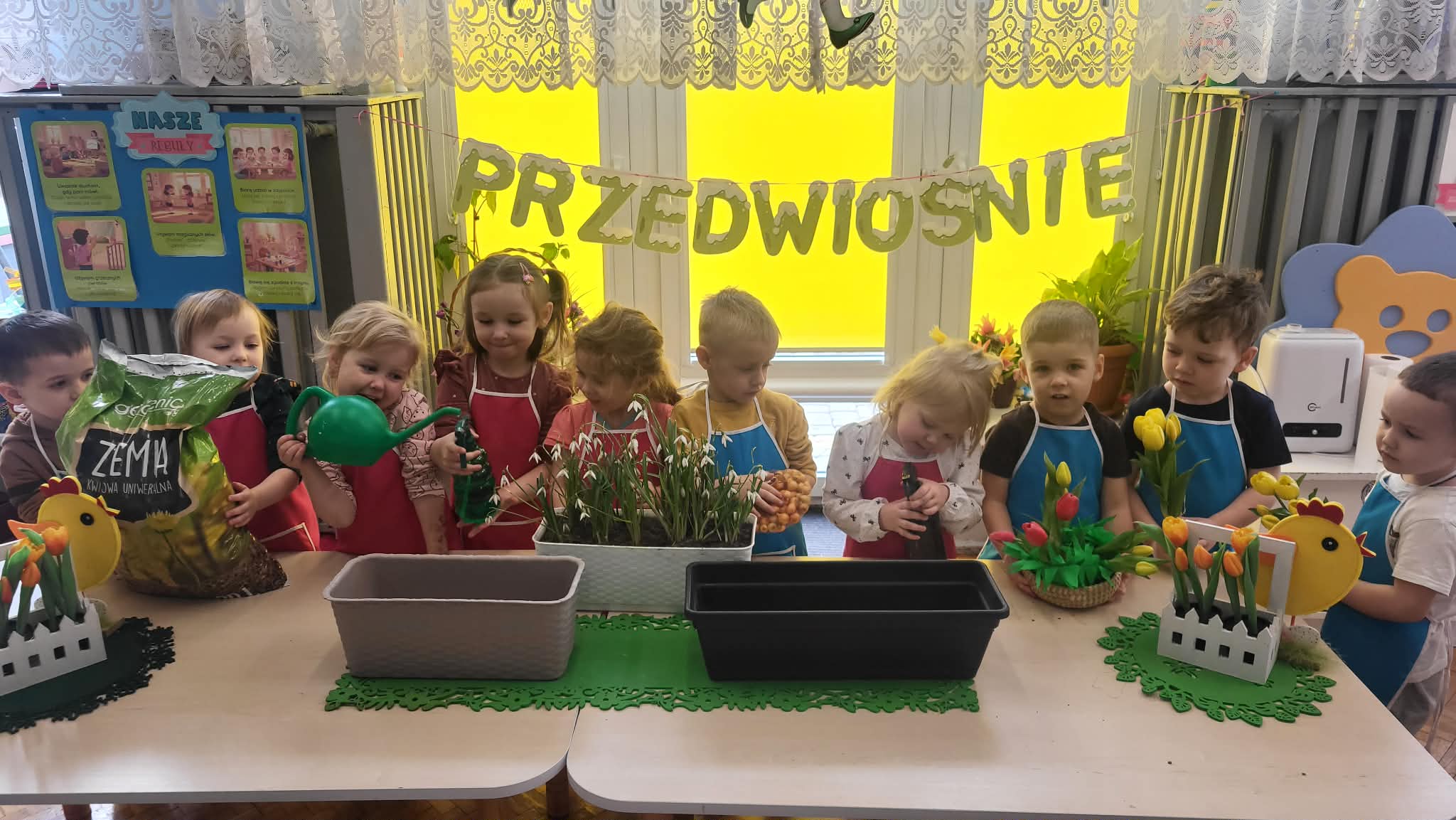 Podczas pracy przedszkolaki dowiedziały się, czego rośliny potrzebują do wzrostu- światła, wody i ciepła. Po posadzeniu cebulek dzieci podlewały je i doglądały.