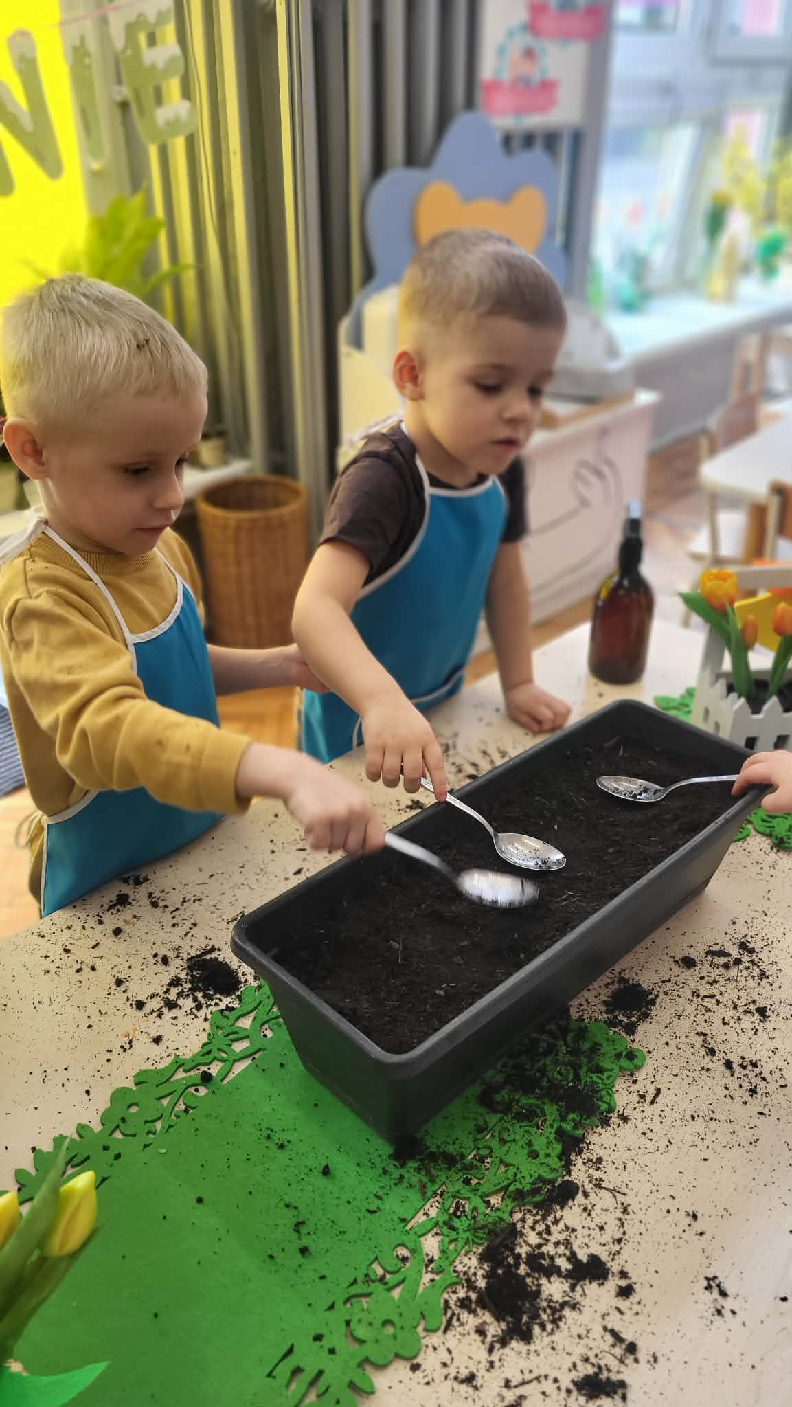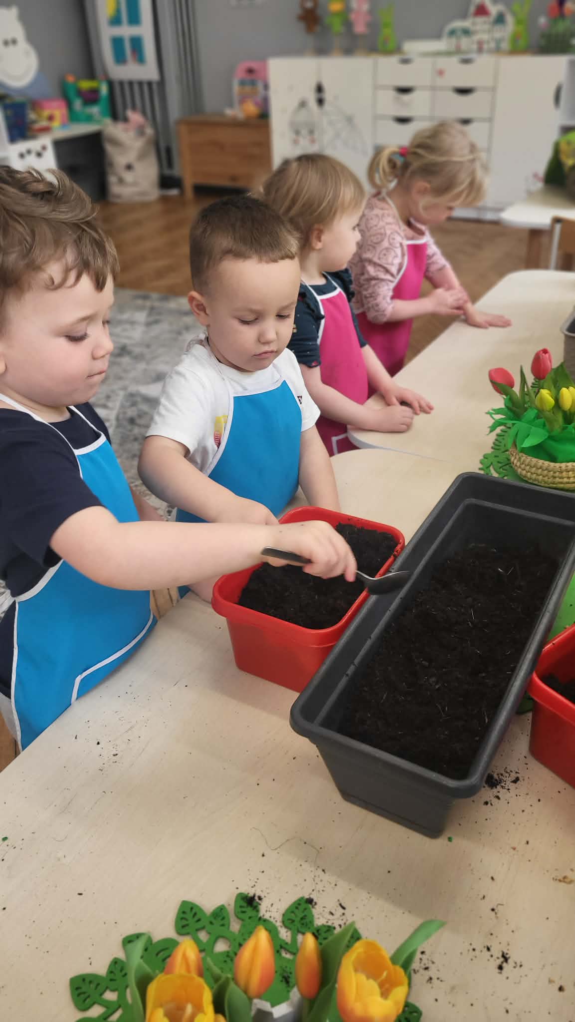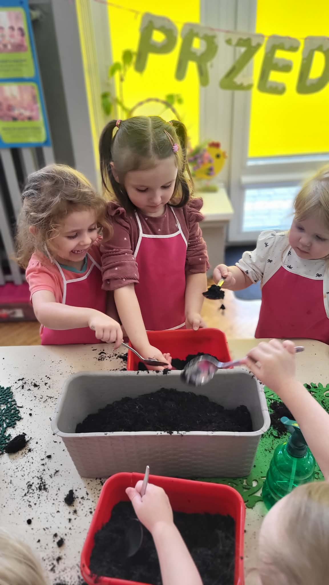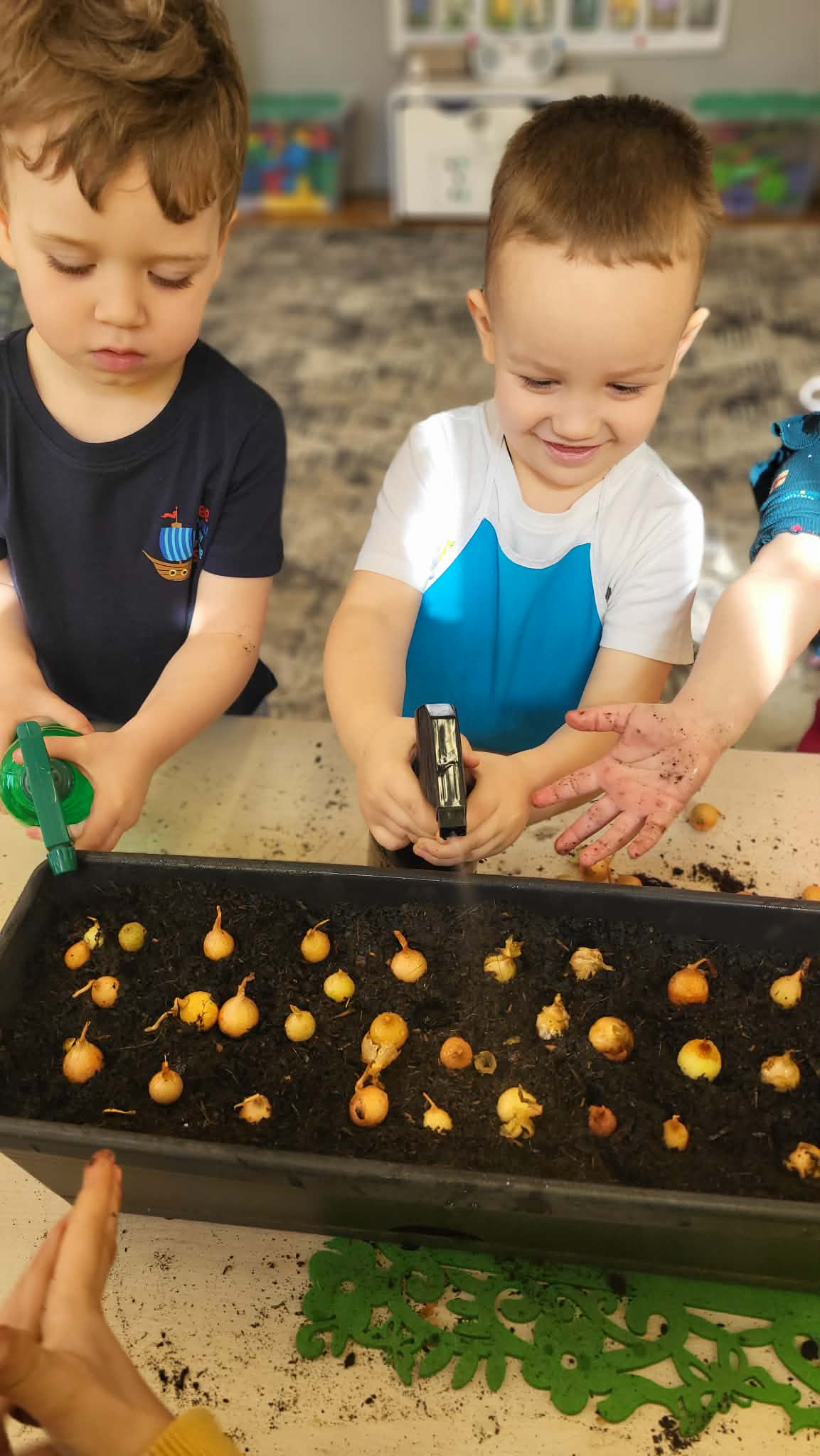 Podczas pracy przedszkolaki dowiedziały się, czego rośliny potrzebują do wzrostu- światła, wody i ciepła. Po posadzeniu cebulek dzieci podlewały je i doglądały.