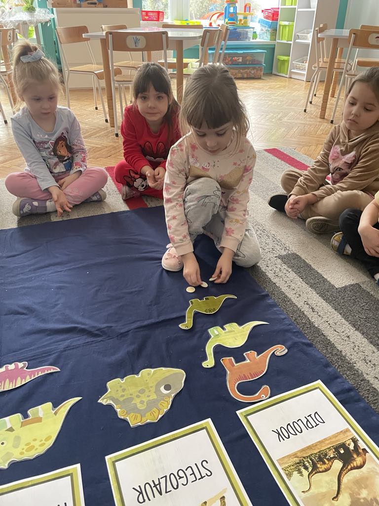 Dinozaury to stworzenia, które od dawna niezwykle fascynują szczególnie najmłodszych. Nie tylko zaskakują swoim wyglądem i wielkością, ale też kryją wiele tajemnic. Zorganizowano zajęcia, które wprowadziły dzieci w prehistoryczny świat i przybliżyły im życie tych wyjątkowych gadów. Dzieci brały udział w wielu ciekawych aktywnościach, m.in.: dopasowywały sylwety dinozaurów, przeliczały dinozaury oraz stosowały określenia dużo, mało.
