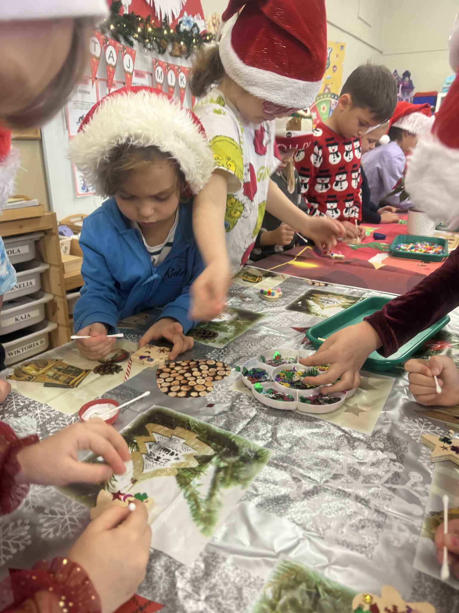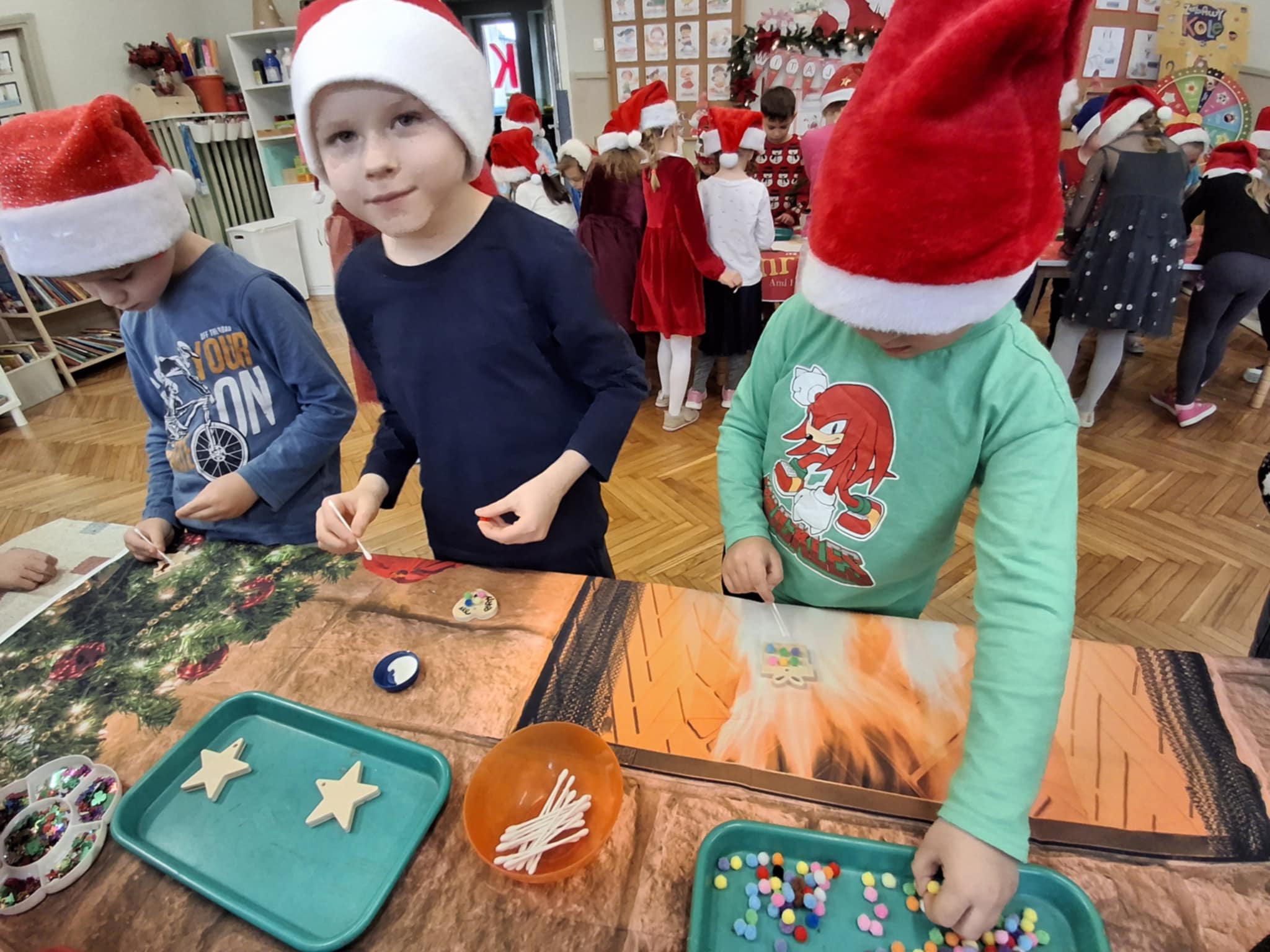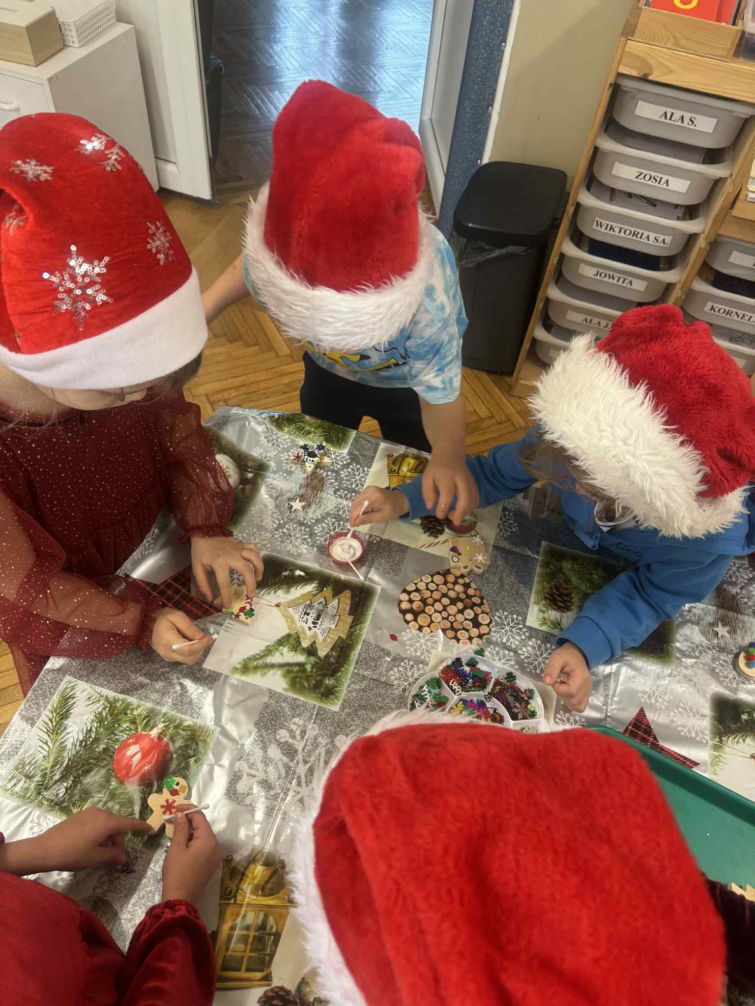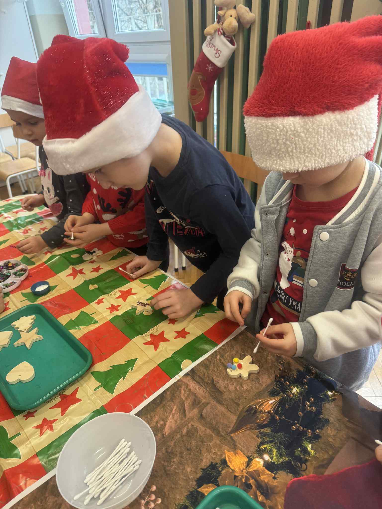 Magiczny czas Świąt Bożego Narodzenia zagościł w naszym przedszkolu. W miłej atmosferze odbyły się wspólne warsztaty grupy 3 i 4 pt.: WARSZTATY BOŻONARODZENIOWE. W atmosferze, radosci i oczekiwania powstały pełne uroku drewniane ozdoby na choinkę. Dzieci zamieniły się w prawdziwych artystów. Sądzimy, że Mikołaj będzie bardzo zadowolony z przygotowanych przez dzieci bombeczek.
