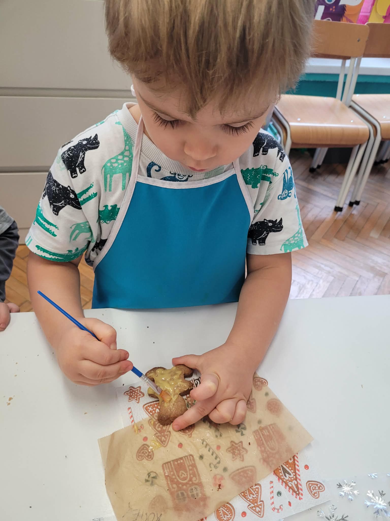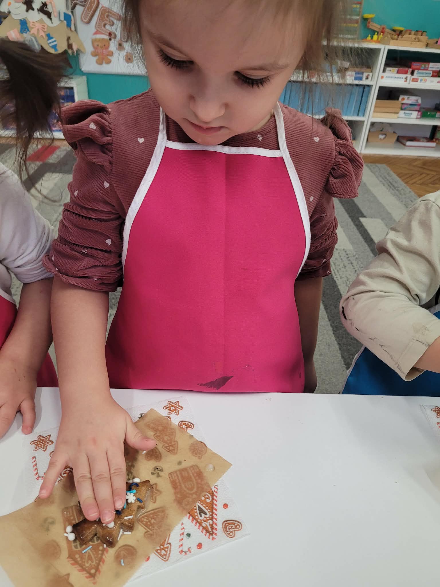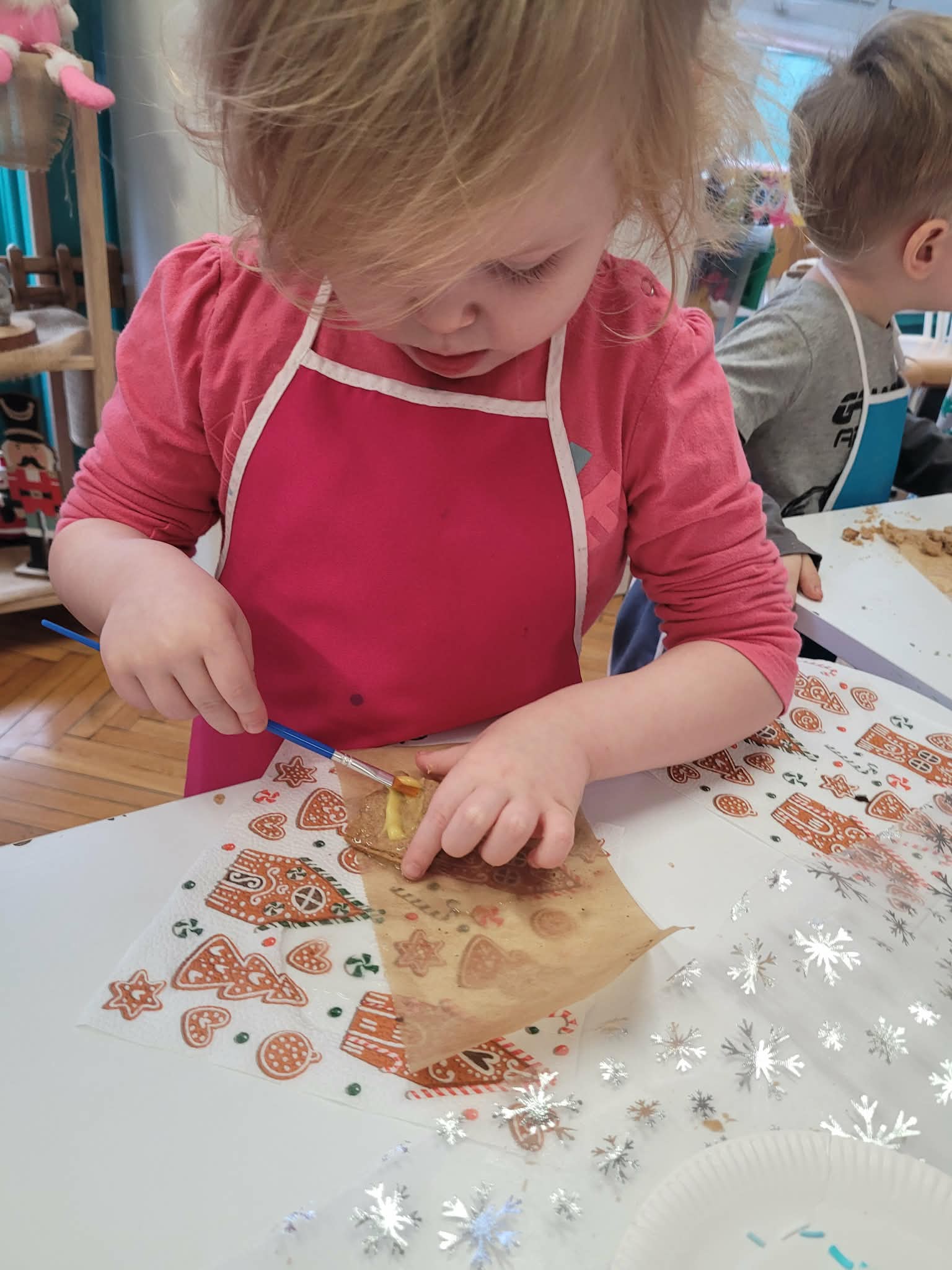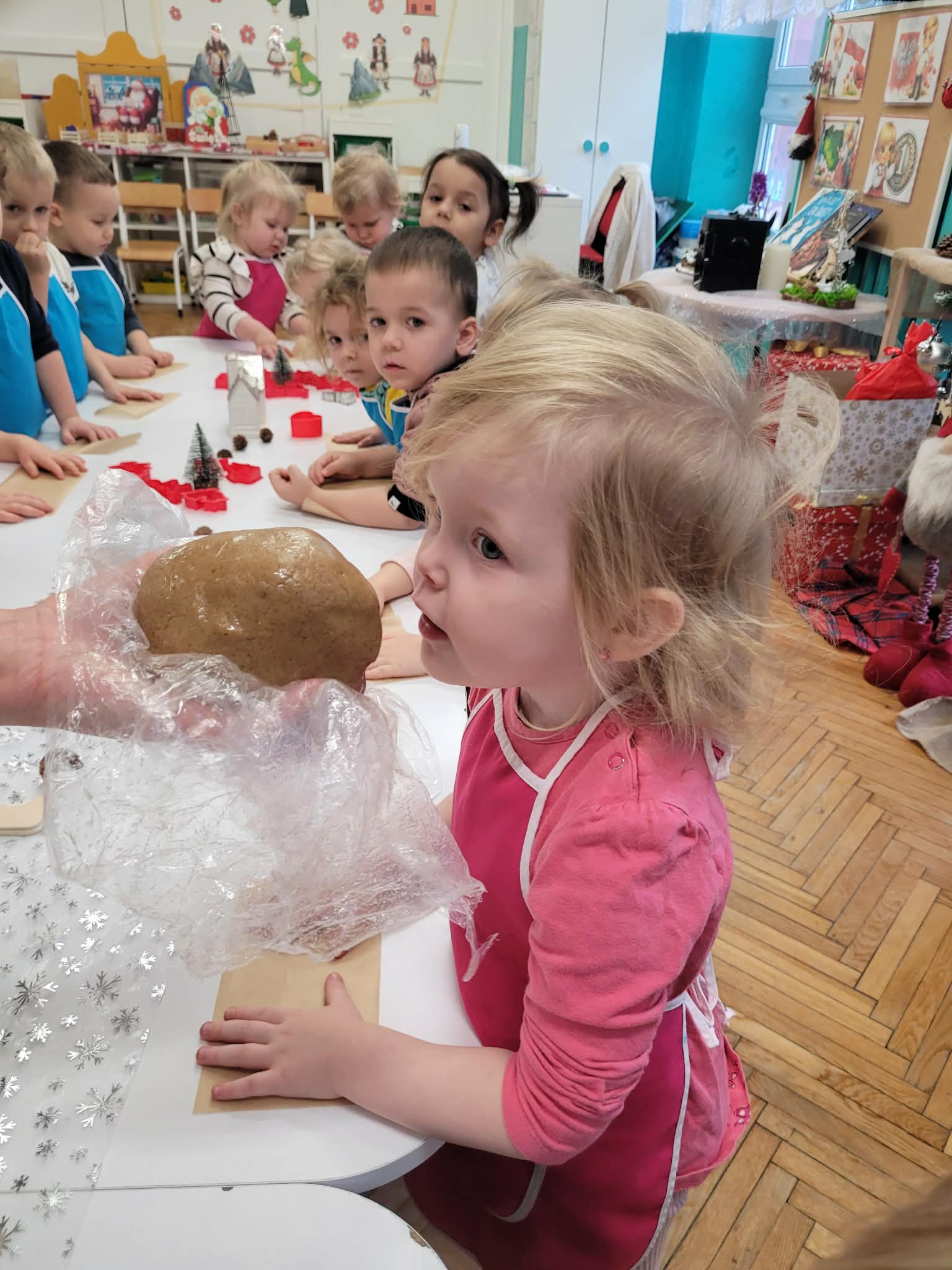 Święta Bożego Narodzenia zbliżają się wielkimi krokami. Nieodzownym elementem tych świat jest osoba Świętego Mikołaja. Nikt go jednak nie widział jak podklada prezenty pod choinke, ale... Każde dziecko wie, że to prawdziwy łasuch i nie potrafi odmówić sobie czegoś słodkiego i szklaneczki mleczka. Dzieci podczas warsztatów z grupa II miały okazję poznac rezepturę na pyszne pierniczki. Same ugniatały ciasto, szablonami wycinaly kształ,ty oraz własnoręcznie lukrowały i ozdabiały. Święty Mikołaj na pewno będzie zadowowlony z prezentu dla niego pod choinką.