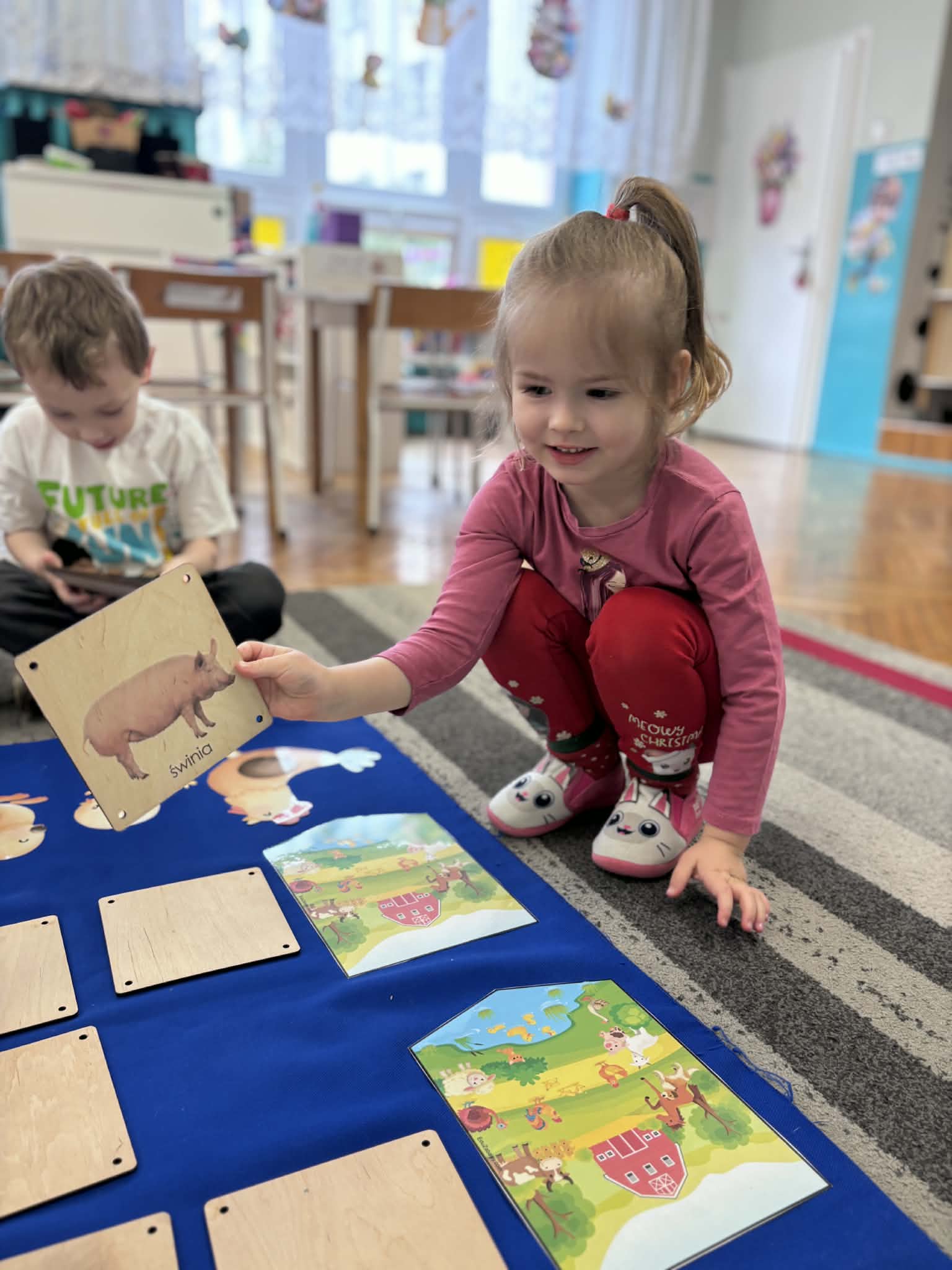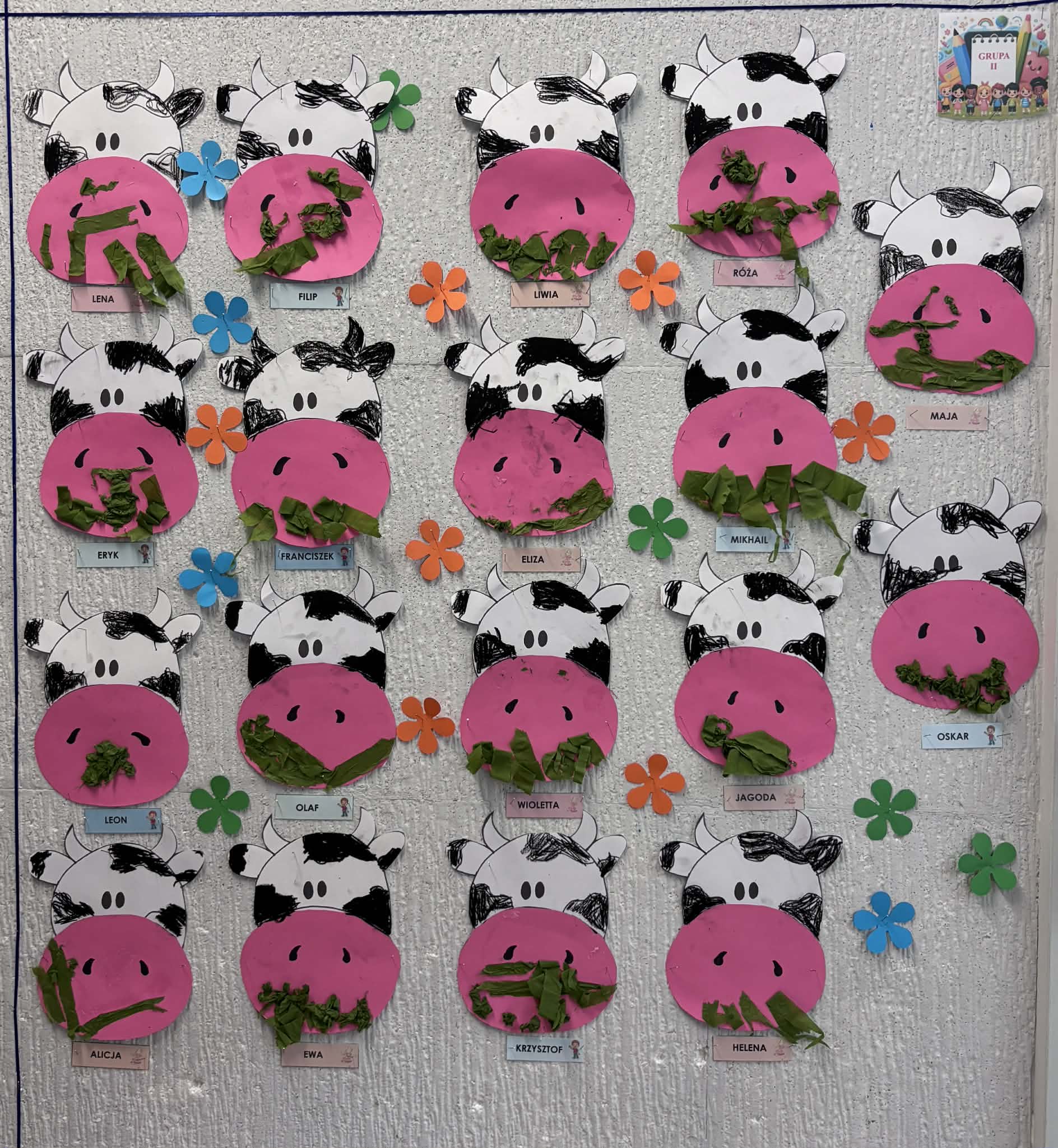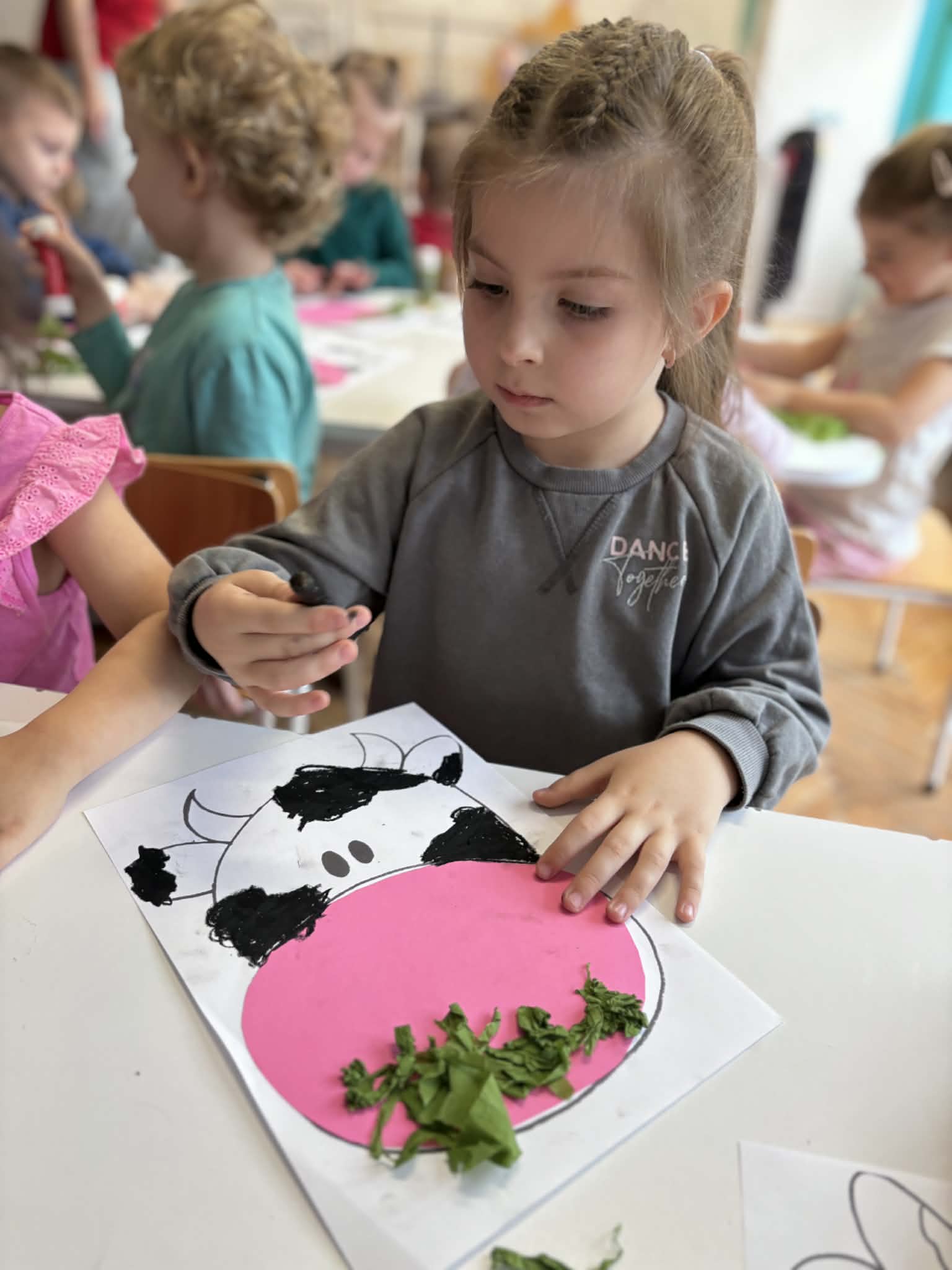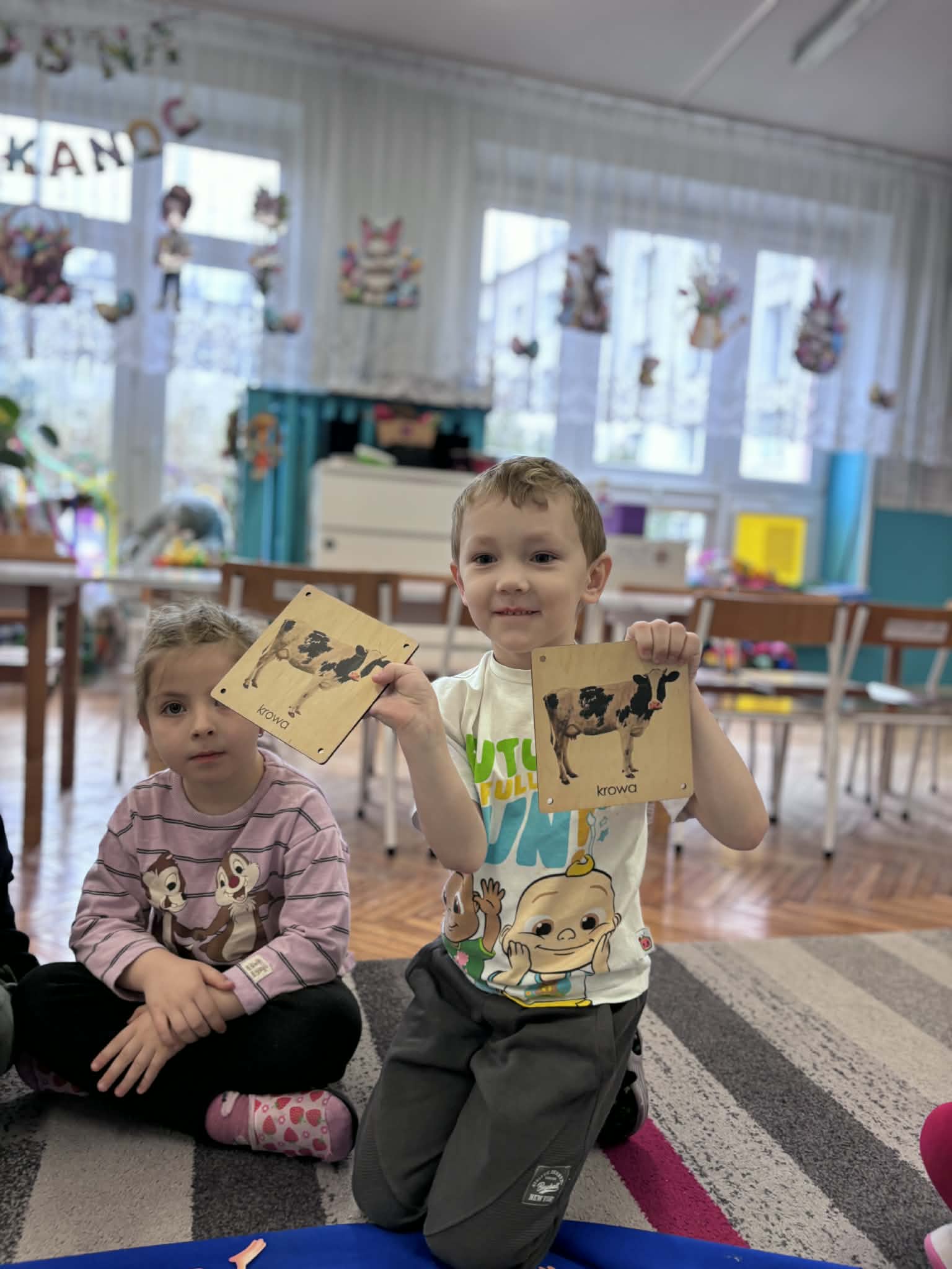 „Odwiedziliśmy” zagrodę i poznawaliśmy zwierzęta wiejskie i ich odgłosy– było dużo śmiechu przy naśladowaniu. Zagraliśmy w montessoriańskie memo, ćwicząc pamięć i spostrzegawczość. Na zajęciach plastycznych powstały urocze krówki, które dzieci „nakarmiły” trawą z bibuły. Było kreatywnie, radośnie i bardzo aktywnie.