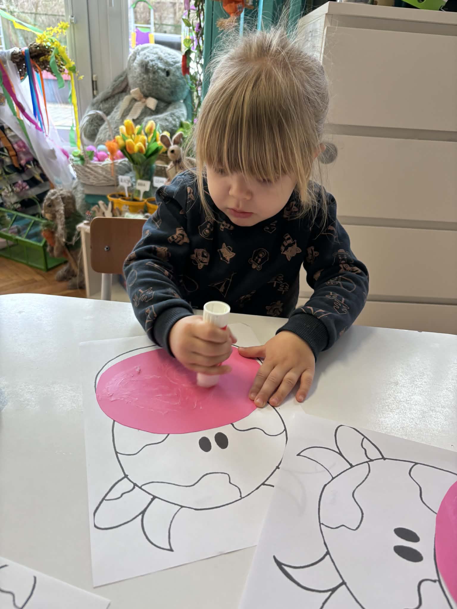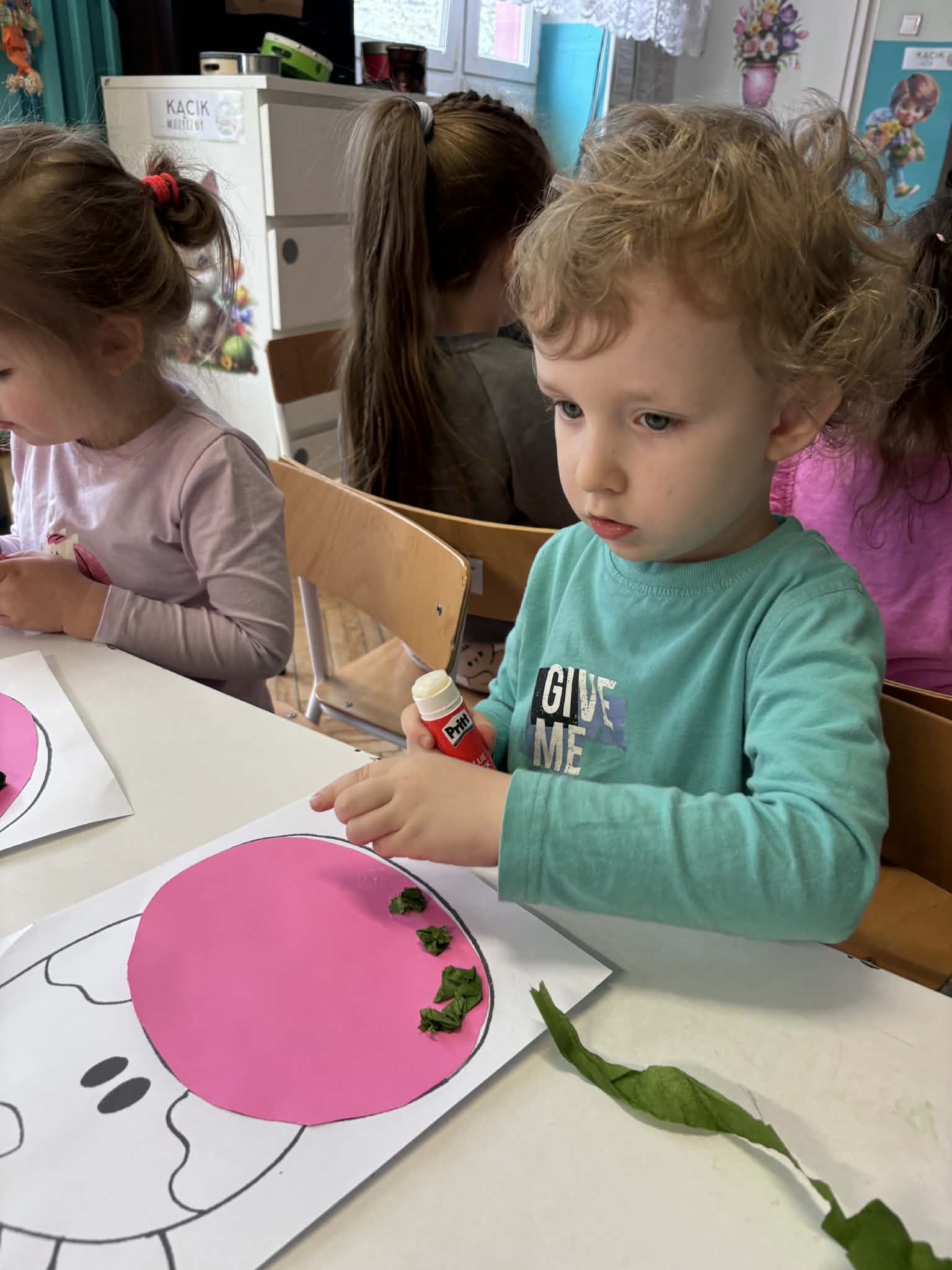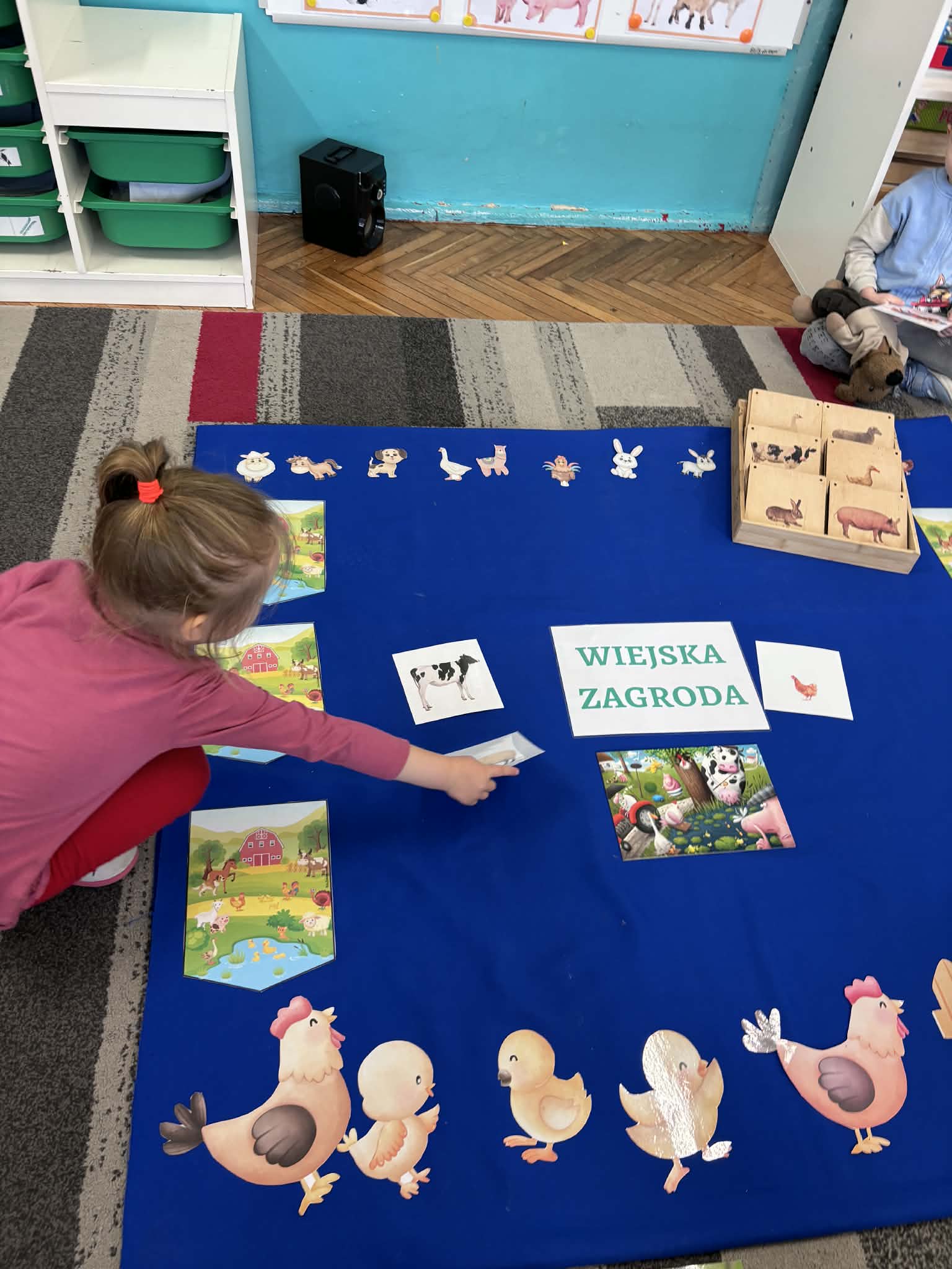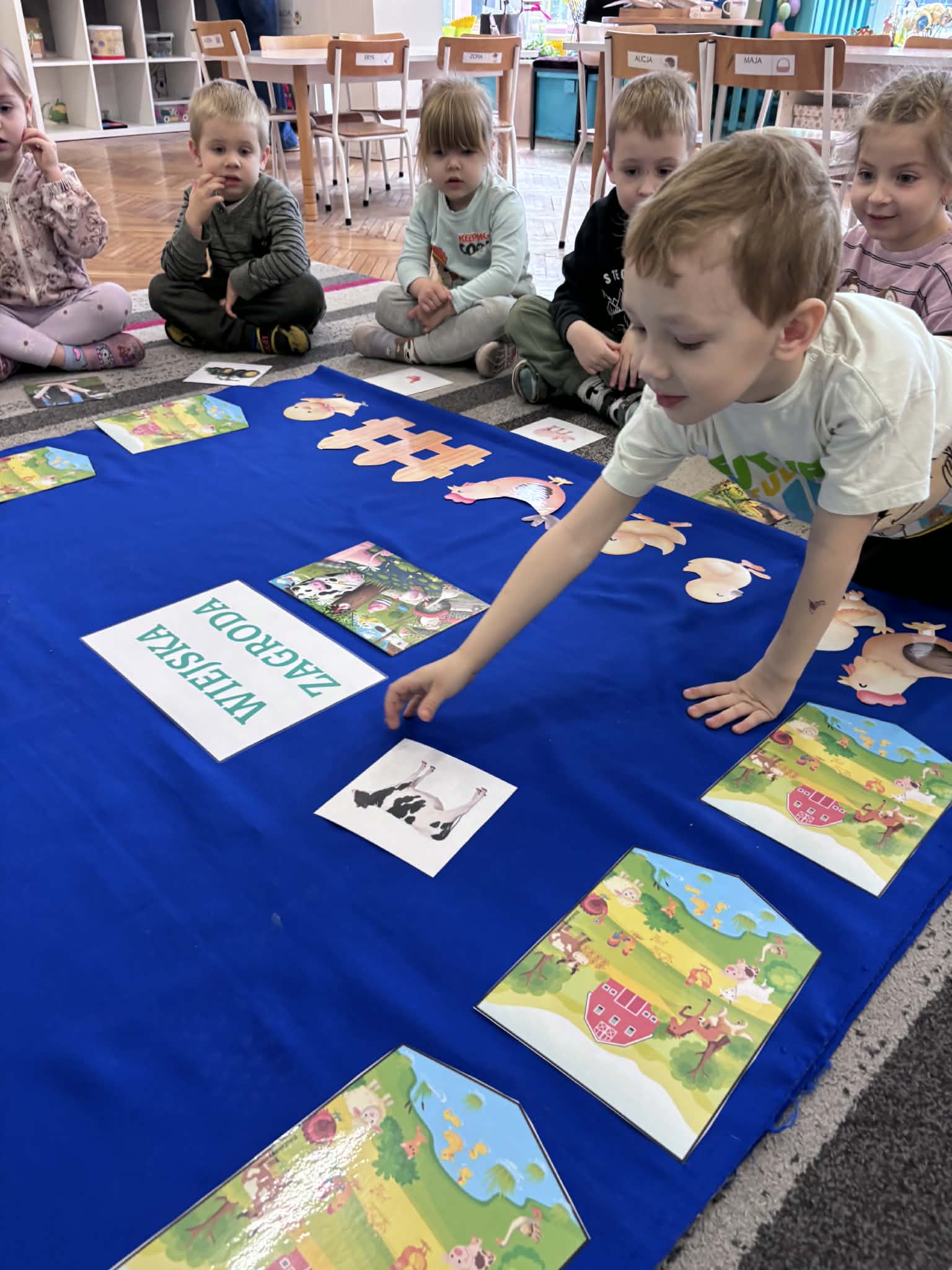 „Odwiedziliśmy” zagrodę i poznawaliśmy zwierzęta wiejskie i ich odgłosy– było dużo śmiechu przy naśladowaniu. Zagraliśmy w montessoriańskie memo, ćwicząc pamięć i spostrzegawczość. Na zajęciach plastycznych powstały urocze krówki, które dzieci „nakarmiły” trawą z bibuły. Było kreatywnie, radośnie i bardzo aktywnie.