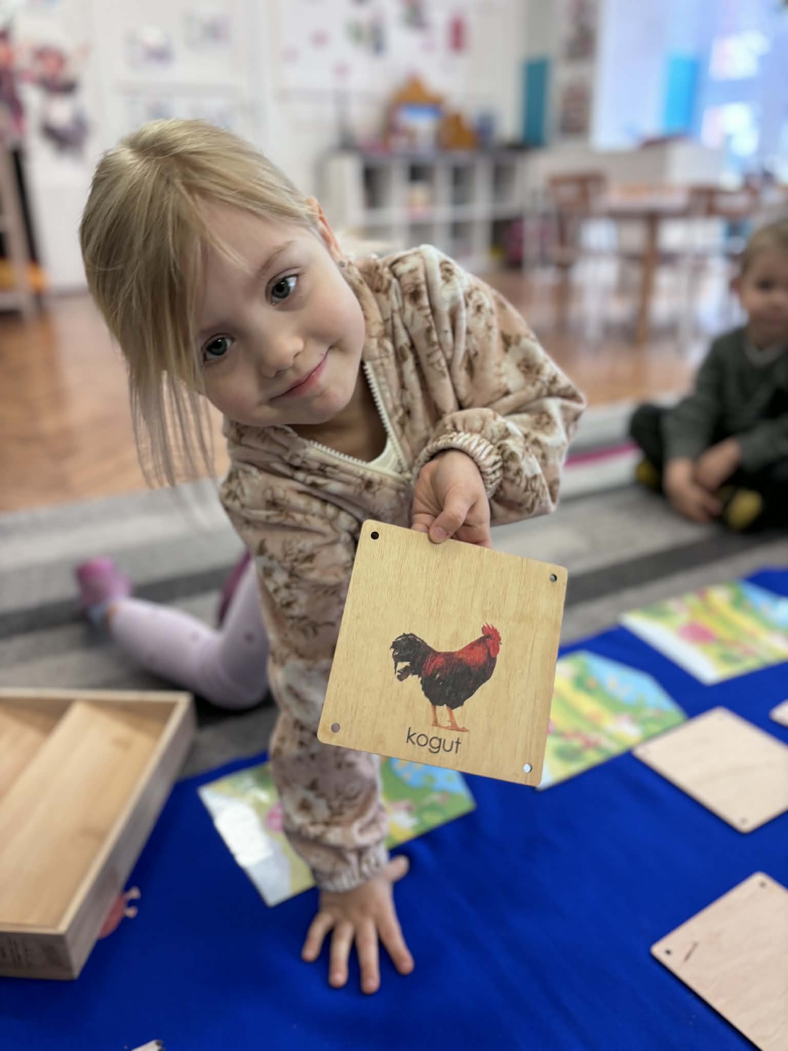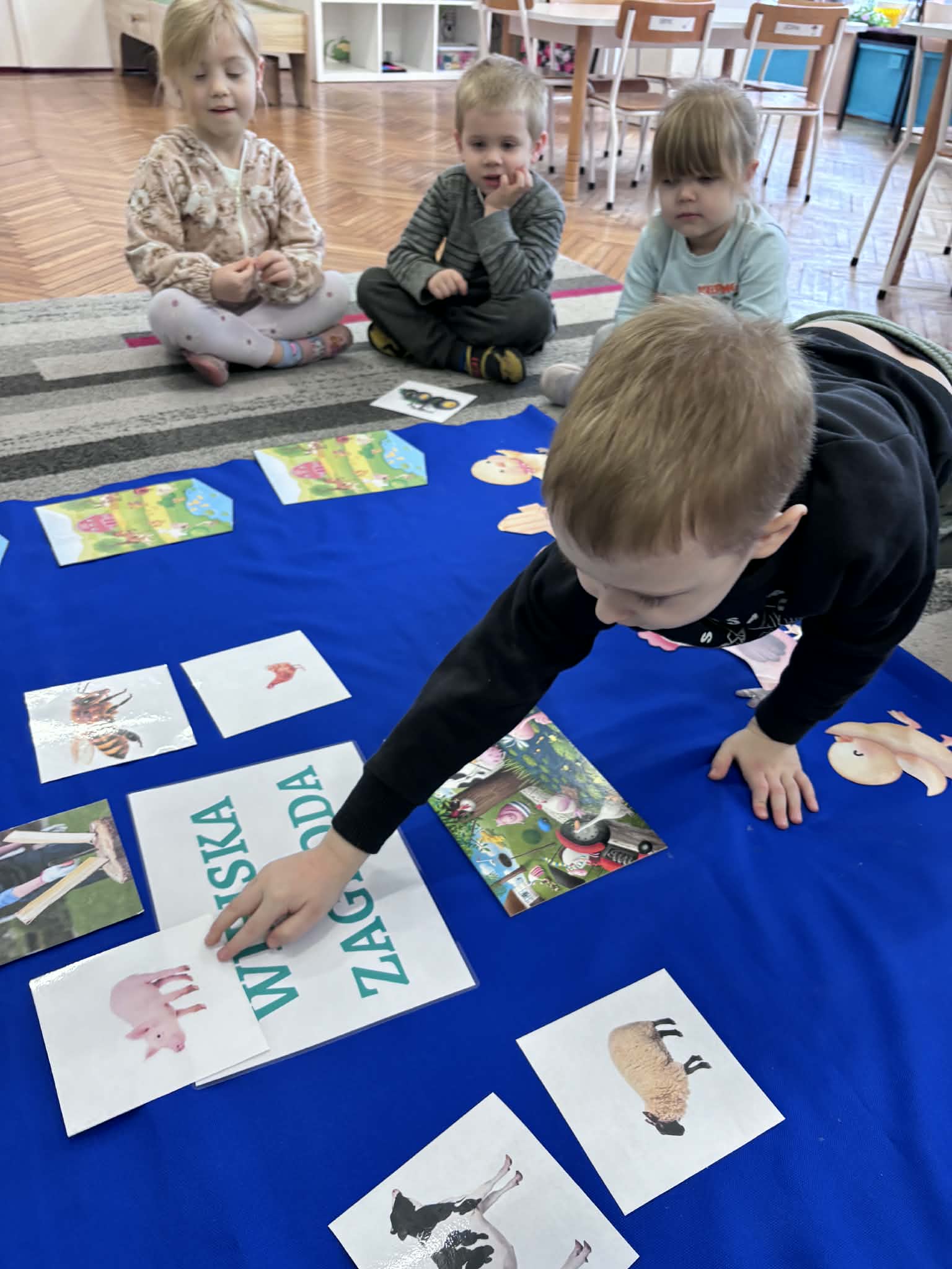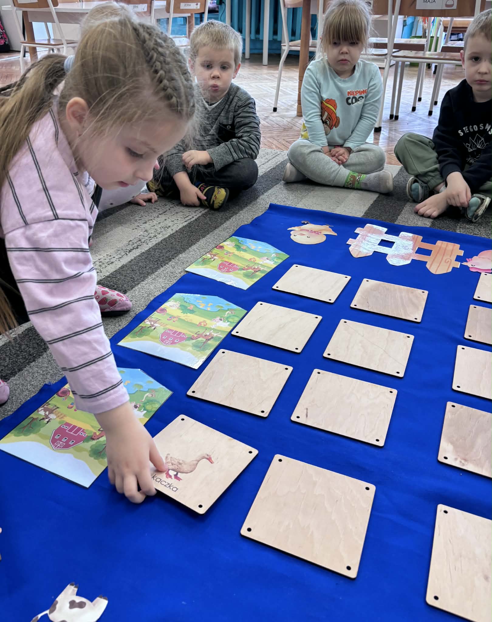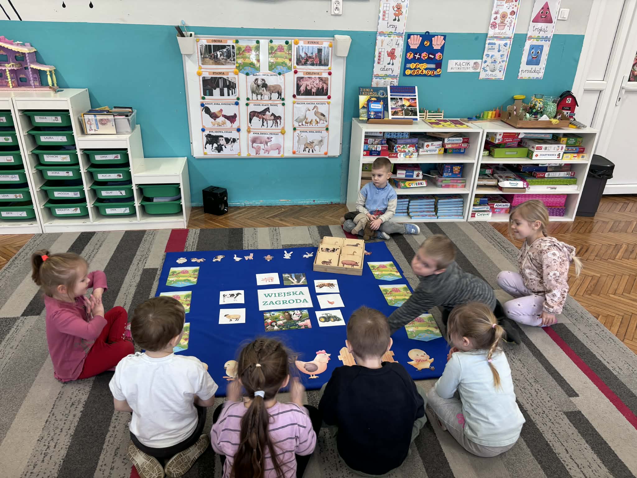„Odwiedziliśmy” zagrodę i poznawaliśmy zwierzęta wiejskie i ich odgłosy– było dużo śmiechu przy naśladowaniu. Zagraliśmy w montessoriańskie memo, ćwicząc pamięć i spostrzegawczość. Na zajęciach plastycznych powstały urocze krówki, które dzieci „nakarmiły” trawą z bibuły. Było kreatywnie, radośnie i bardzo aktywnie.