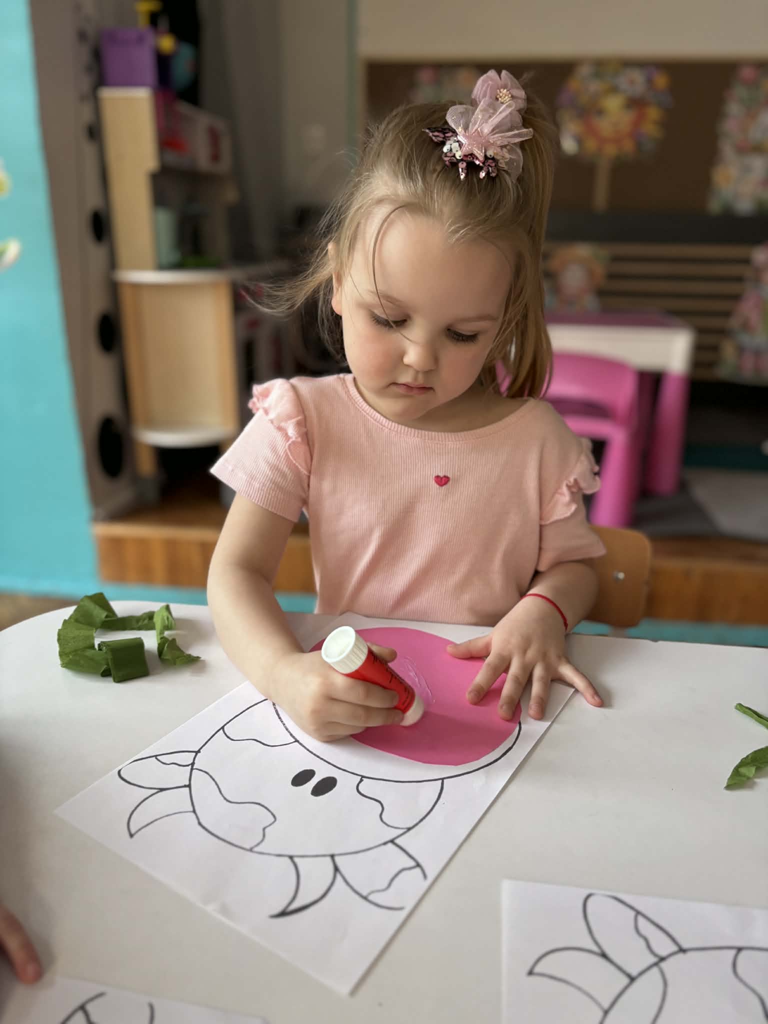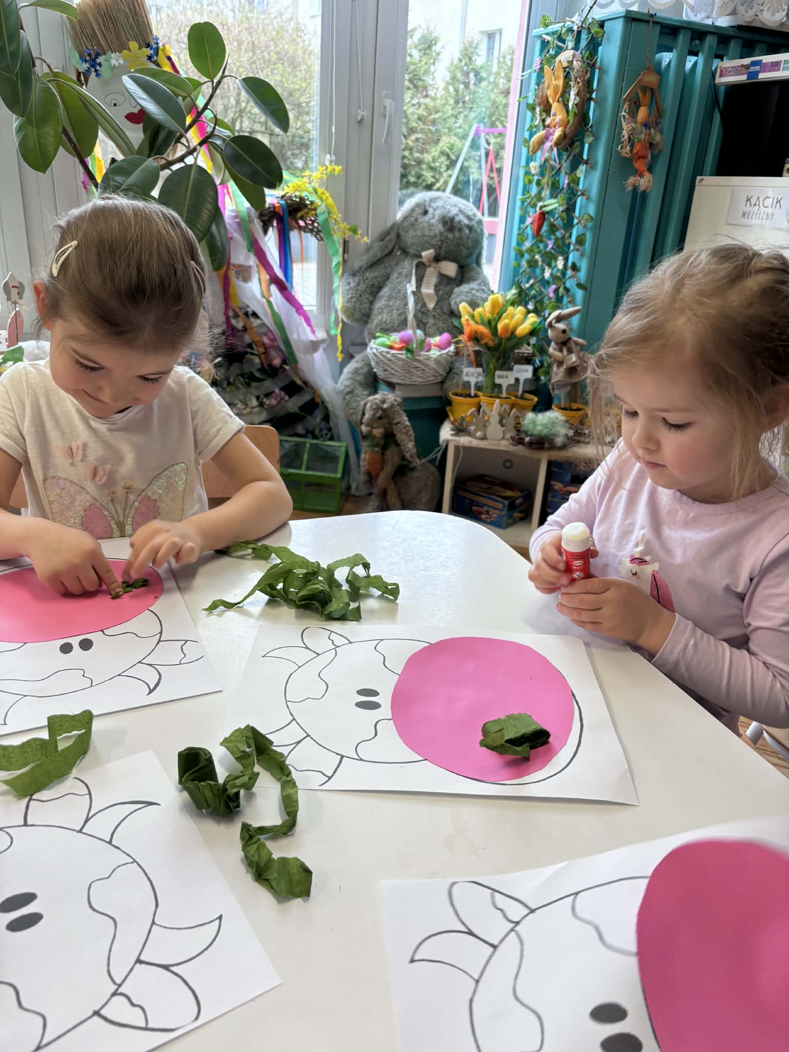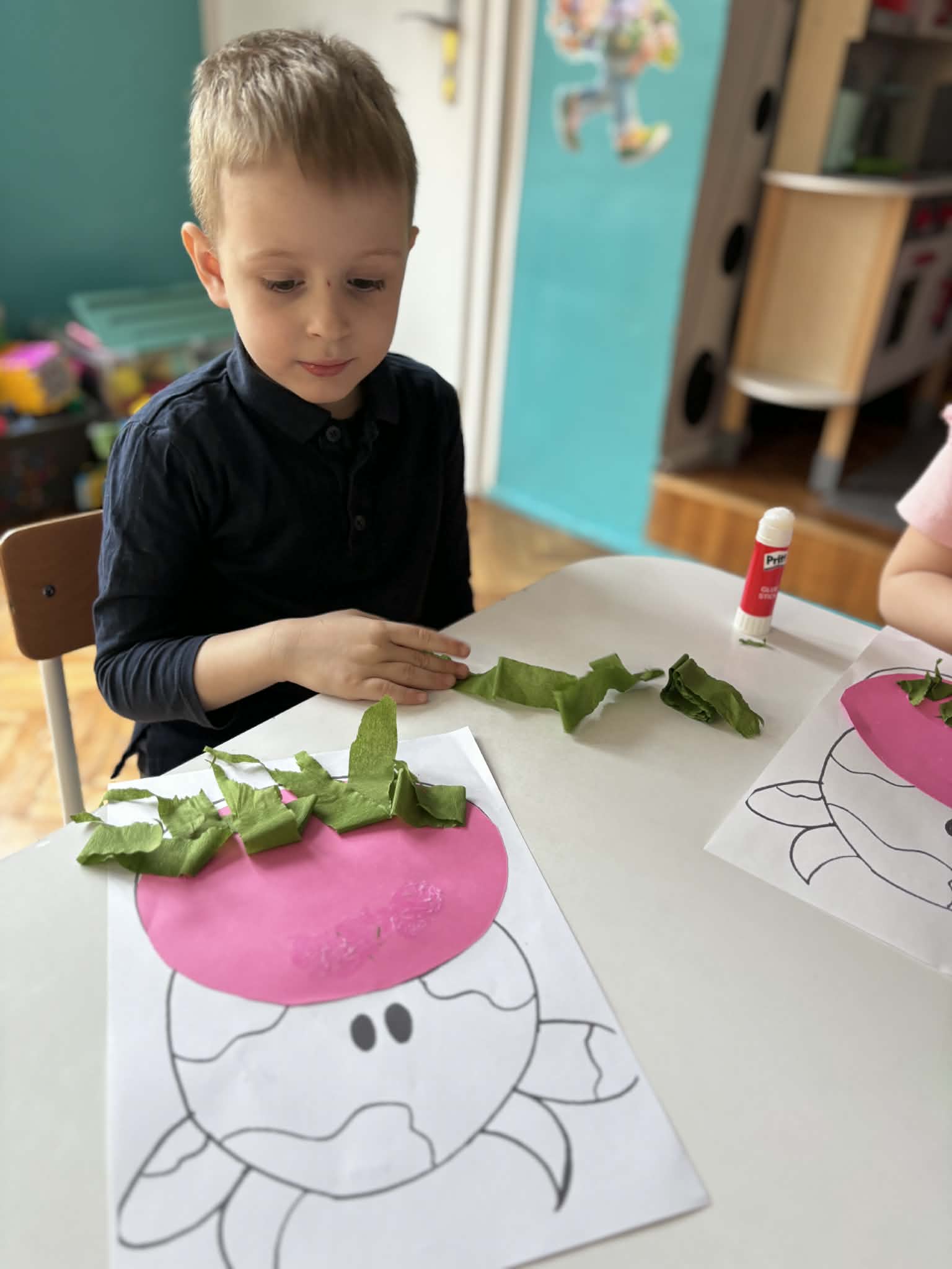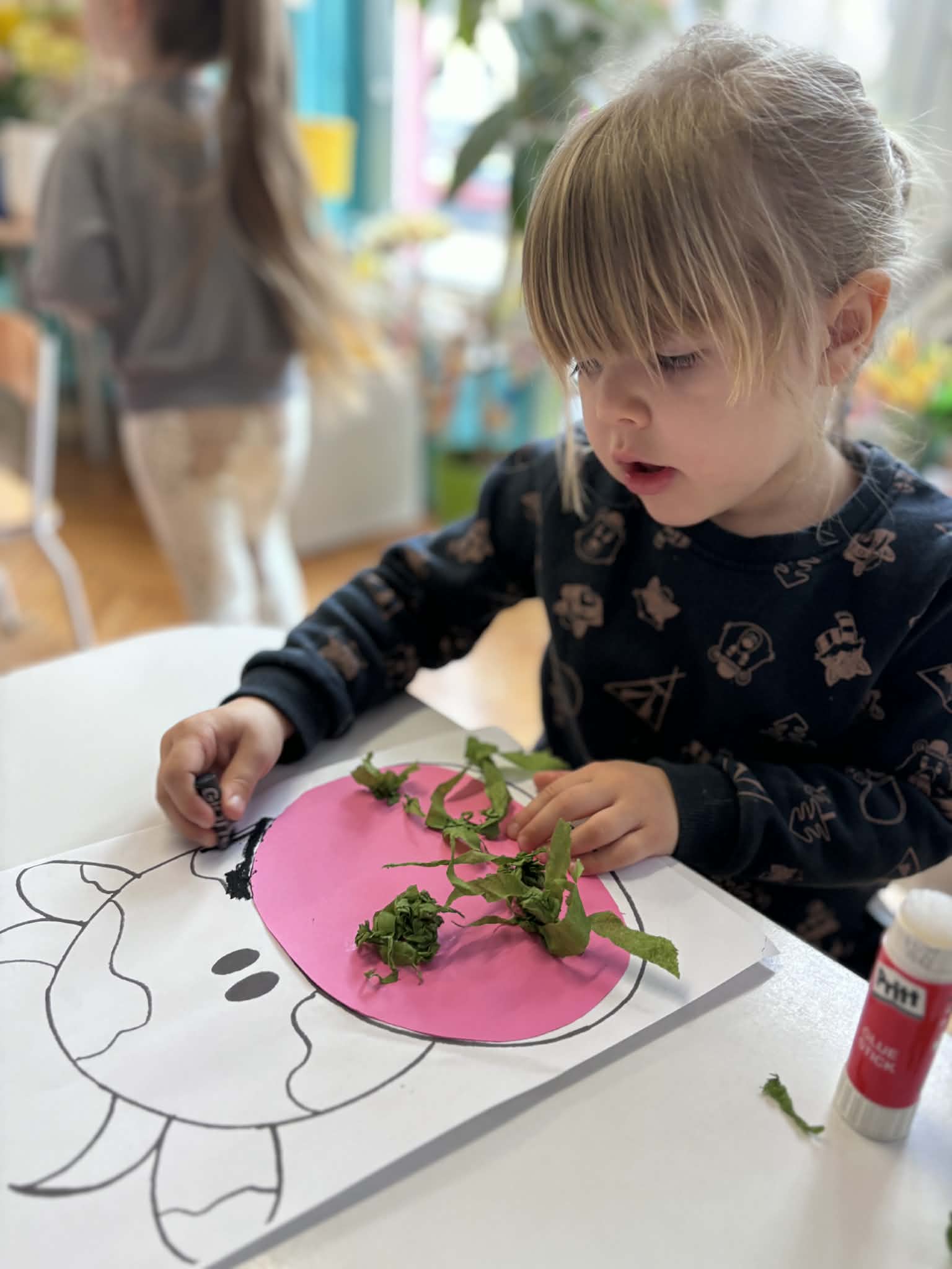 „Odwiedziliśmy” zagrodę i poznawaliśmy zwierzęta wiejskie i ich odgłosy– było dużo śmiechu przy naśladowaniu. Zagraliśmy w montessoriańskie memo, ćwicząc pamięć i spostrzegawczość. Na zajęciach plastycznych powstały urocze krówki, które dzieci „nakarmiły” trawą z bibuły. Było kreatywnie, radośnie i bardzo aktywnie.