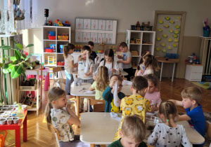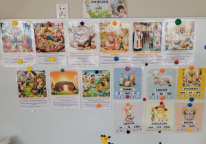 Zbliża się Wielkanoc. Dzieci poznały tradycje związane z tym świętem. Wiedzą jakie produkty powinny wsadzić do koszyczka wielkanocnego oraz czego są one symbolem. Dzieci wzięły udział w warsztatach kulinarnych "Baranki wielkanocne" oraz wykonały zajączki ze skarpety jako ozdobę wielkanocnego stołu. Ozdobiły również szatnię przedszkolną pracą plastyczną wielkanocną - ozdoba w formie wianka.