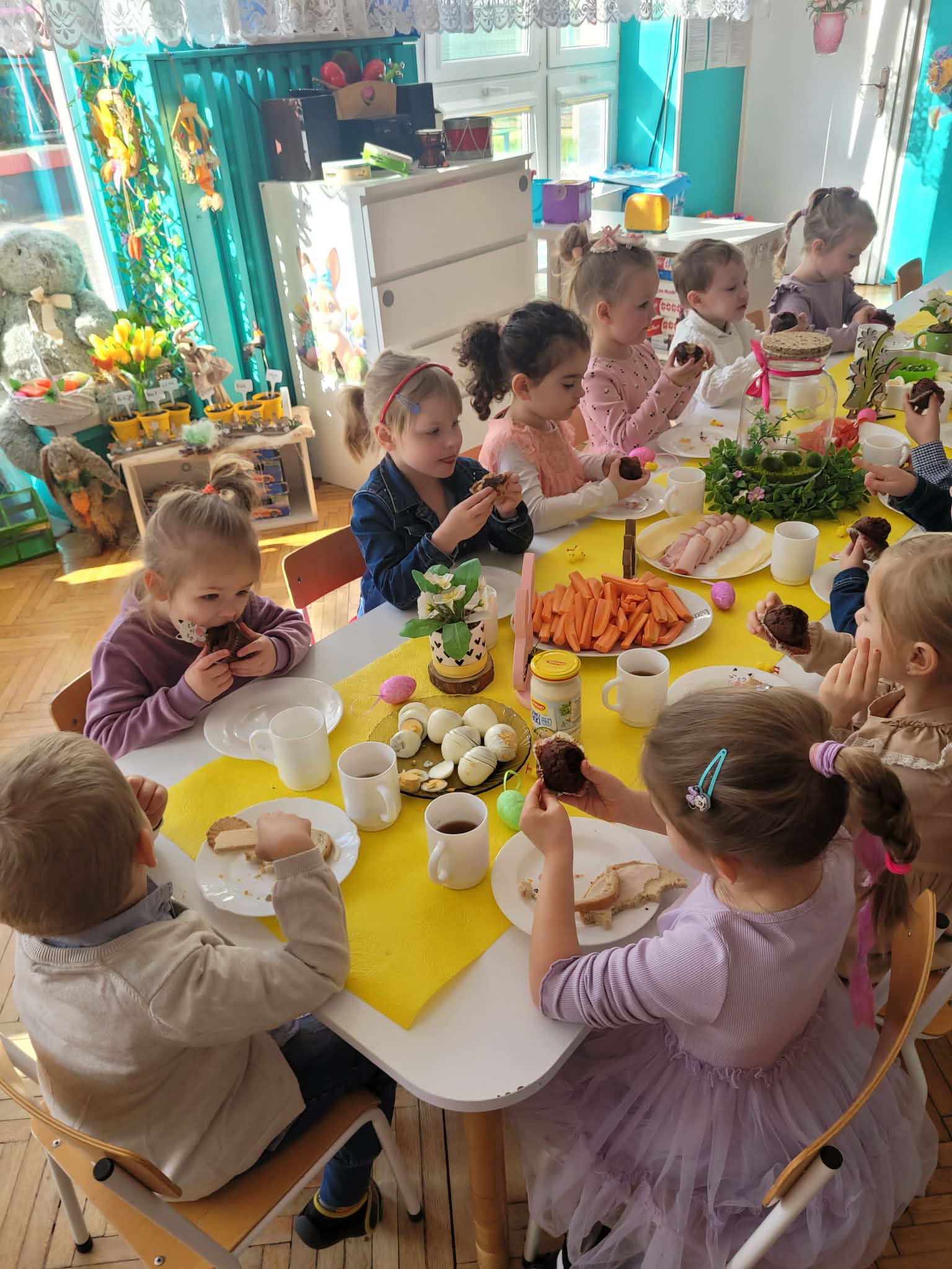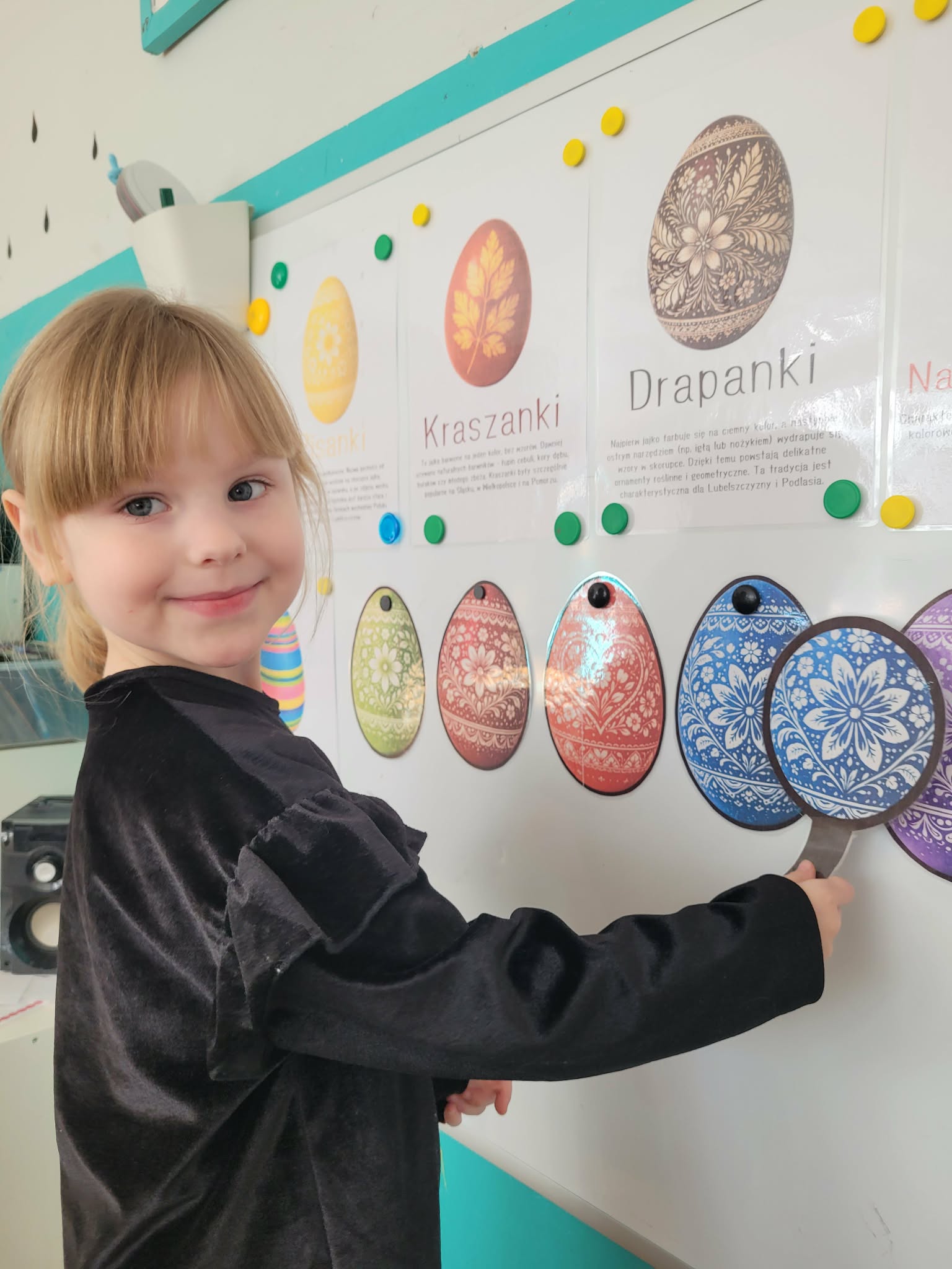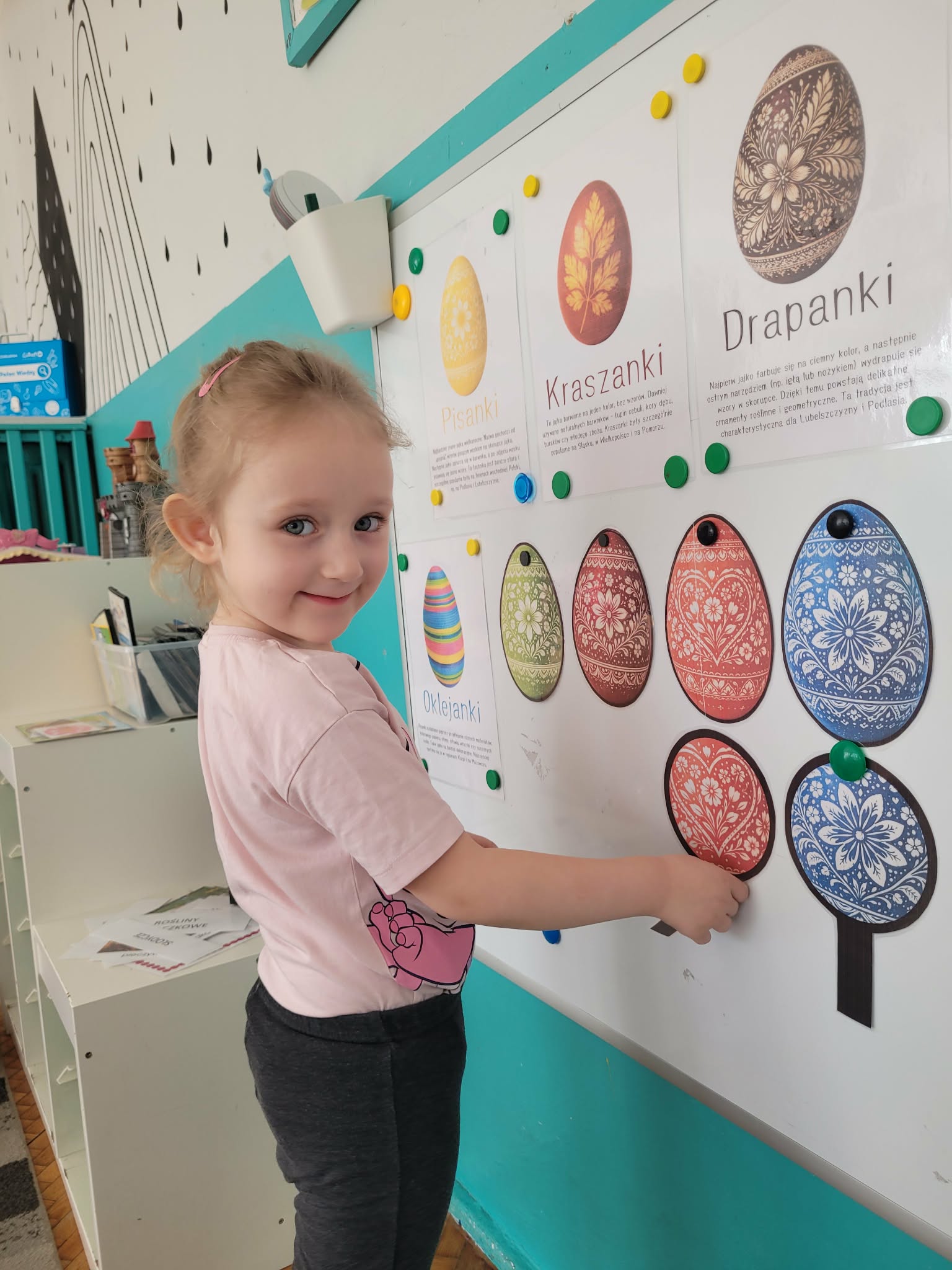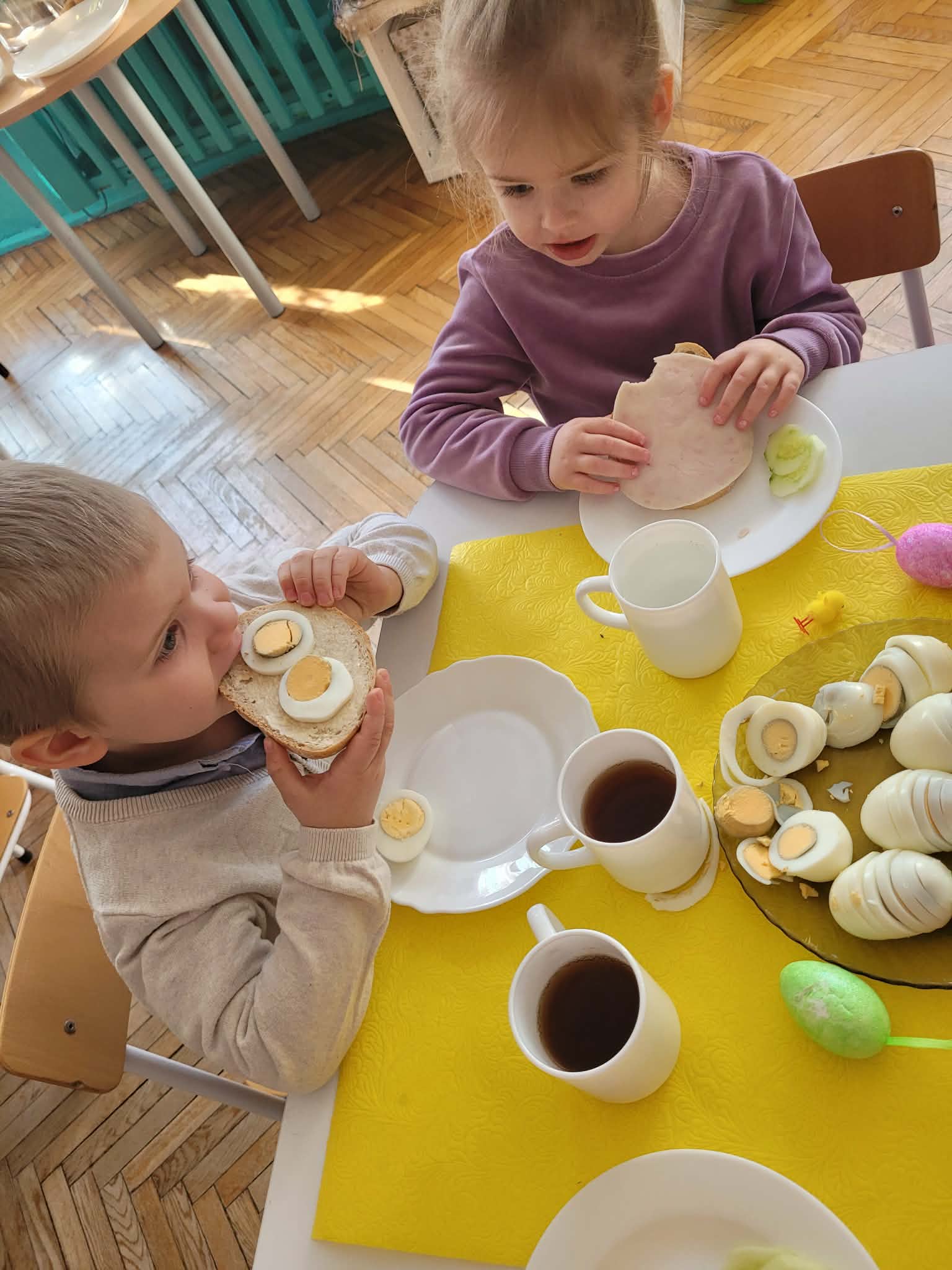 Dzieci dowiedziały się jakie mamy ludowe rodzaje barwienia jaj. Są pisanki, kraszanki, drapanki itp.;, które w wybranych rejonach Polski są do dziś wykonywane. Dzieci rozwiązywały zagadki związane z pisankami, układały puzzle. Na podsumowanie tematu zjadły pyszne śniadanie wielkanocne. Dziękujemy rodzicom za przyniesienie dań wielkanocnych.