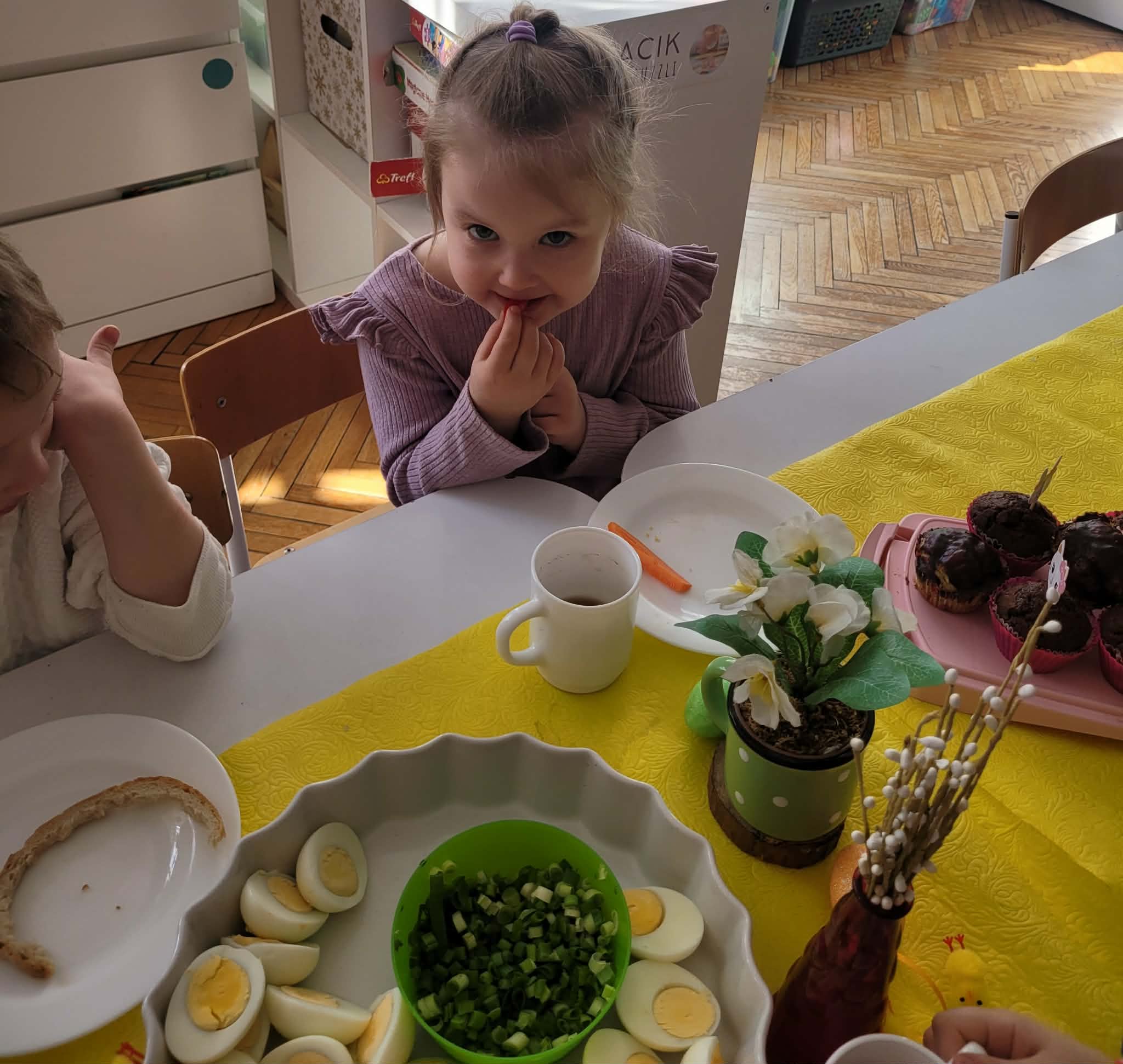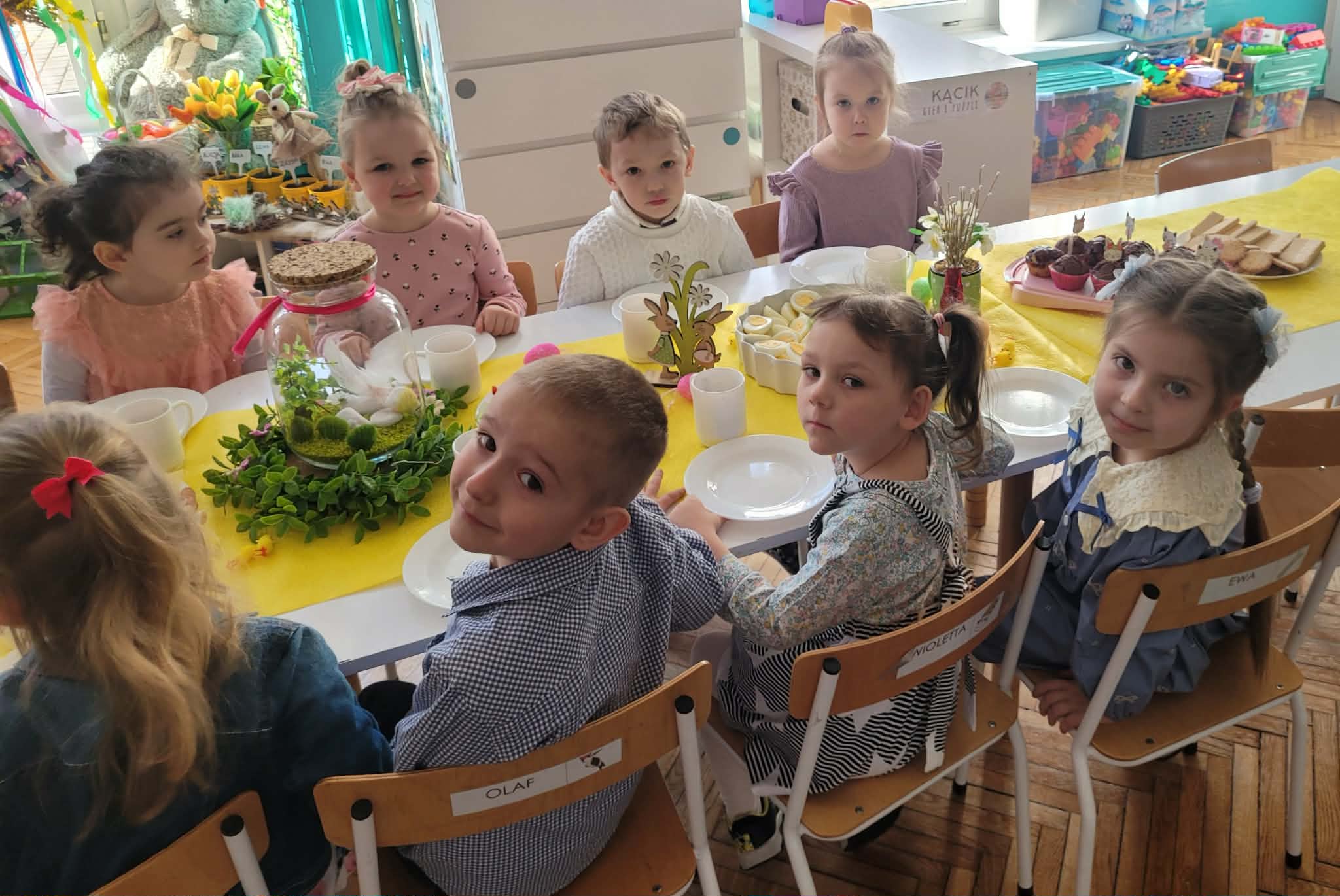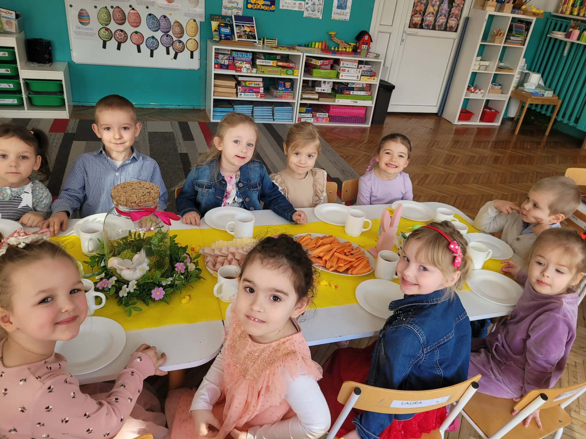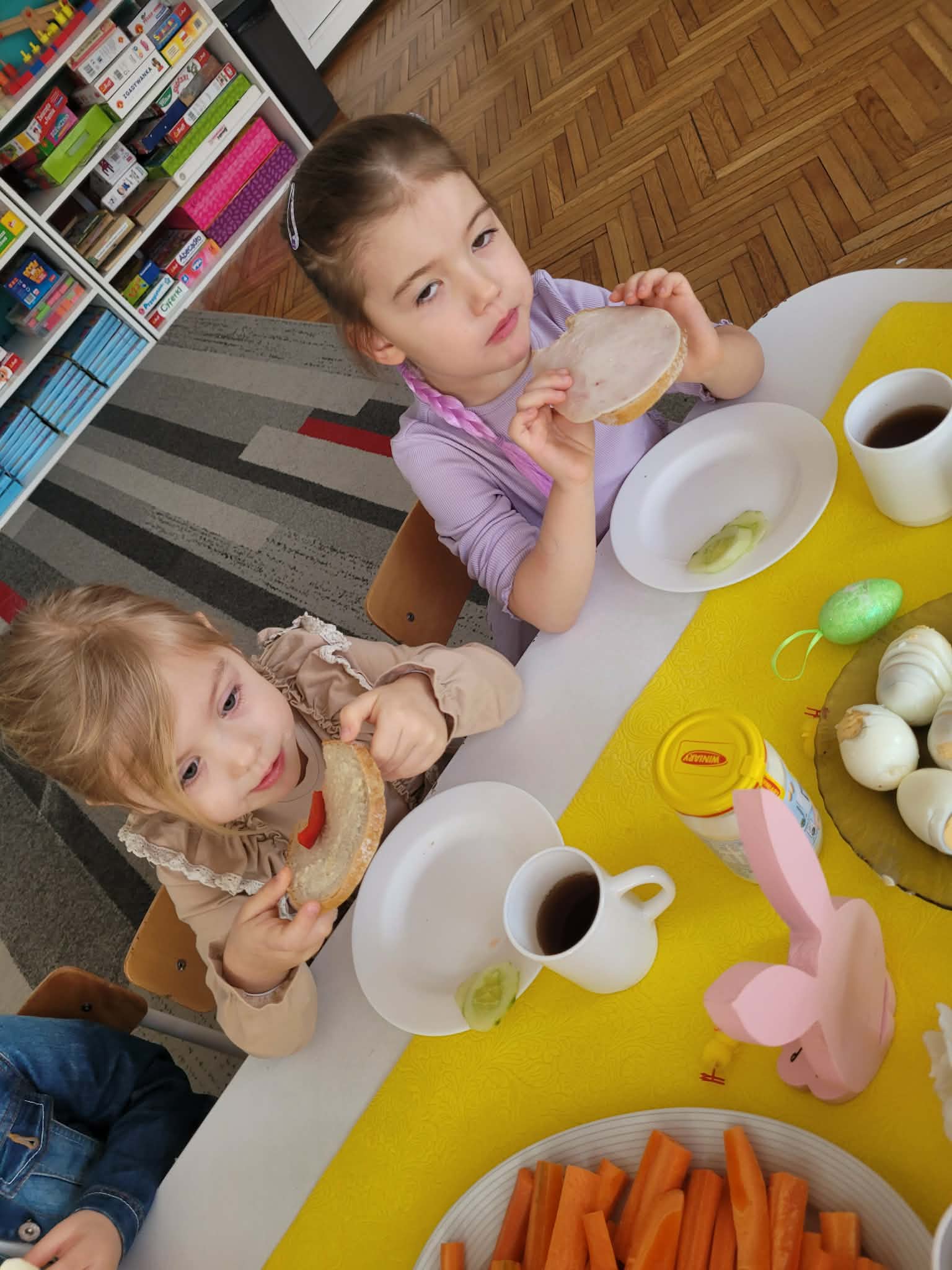 Dzieci dowiedziały się jakie mamy ludowe rodzaje barwienia jaj. Są pisanki, kraszanki, drapanki itp.;, które w wybranych rejonach Polski są do dziś wykonywane. Dzieci rozwiązywały zagadki związane z pisankami, układały puzzle. Na podsumowanie tematu zjadły pyszne śniadanie wielkanocne. Dziękujemy rodzicom za przyniesienie dań wielkanocnych.