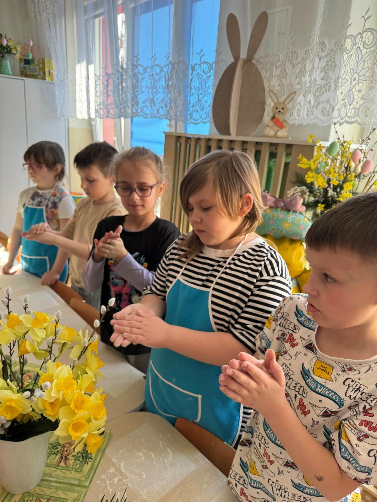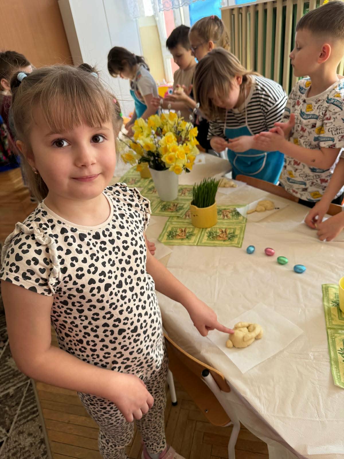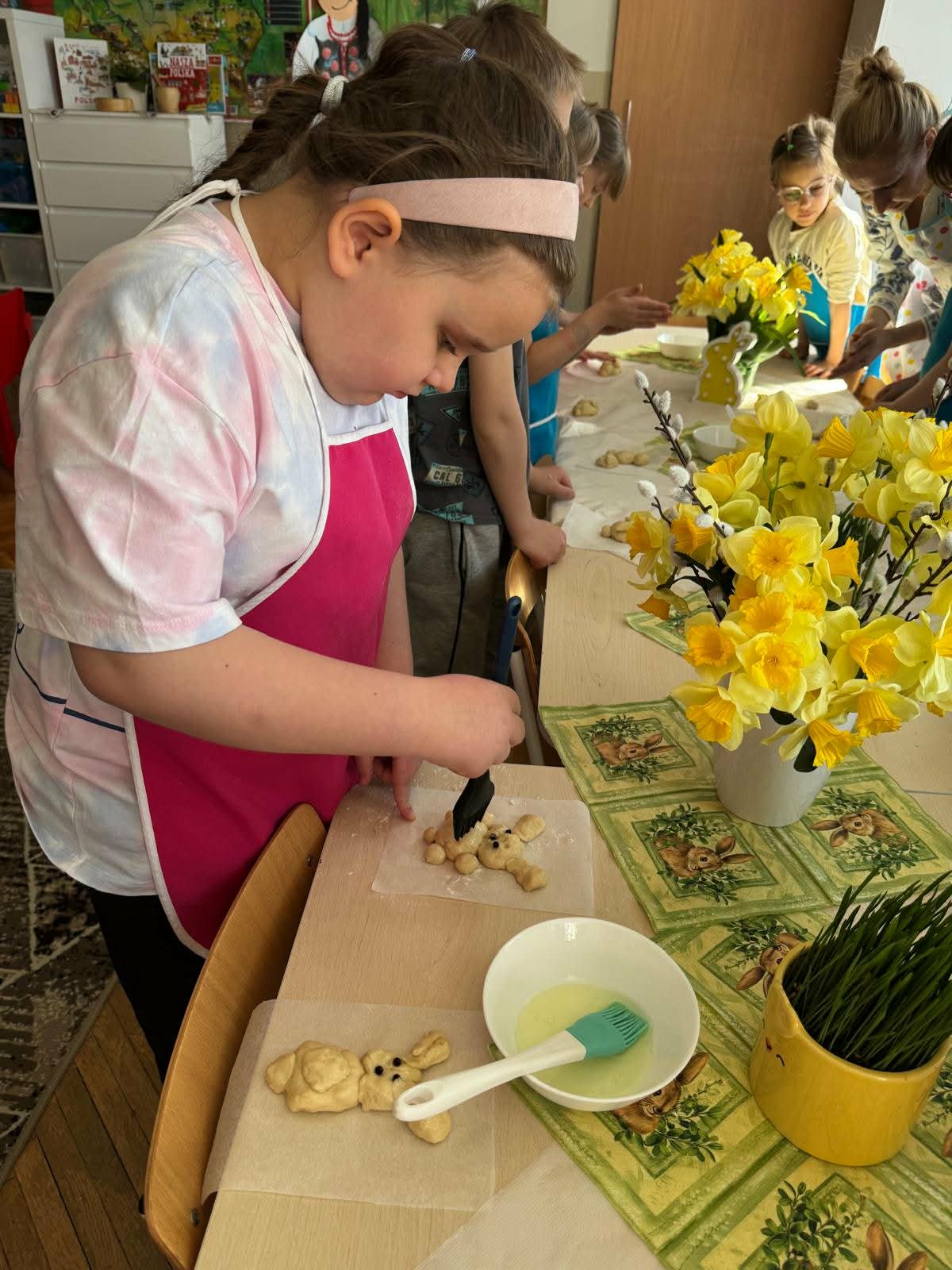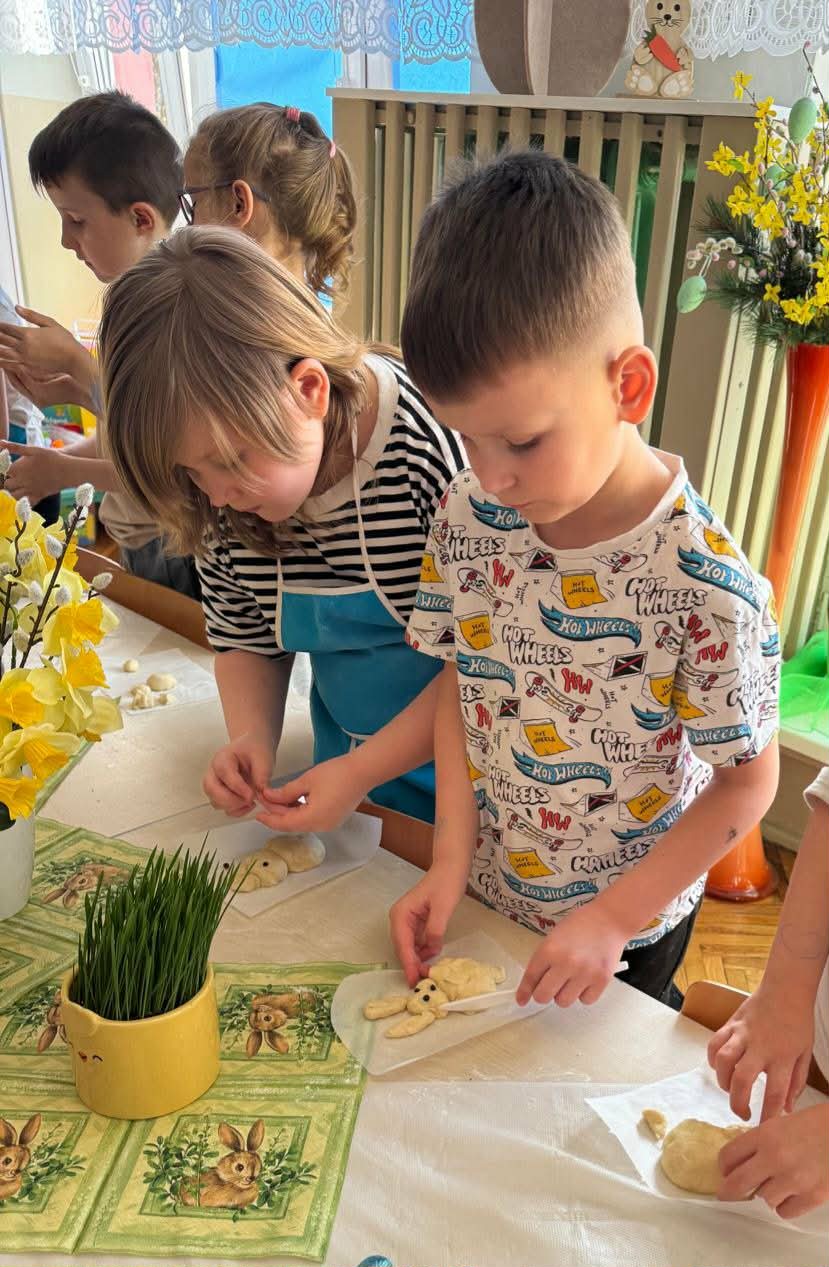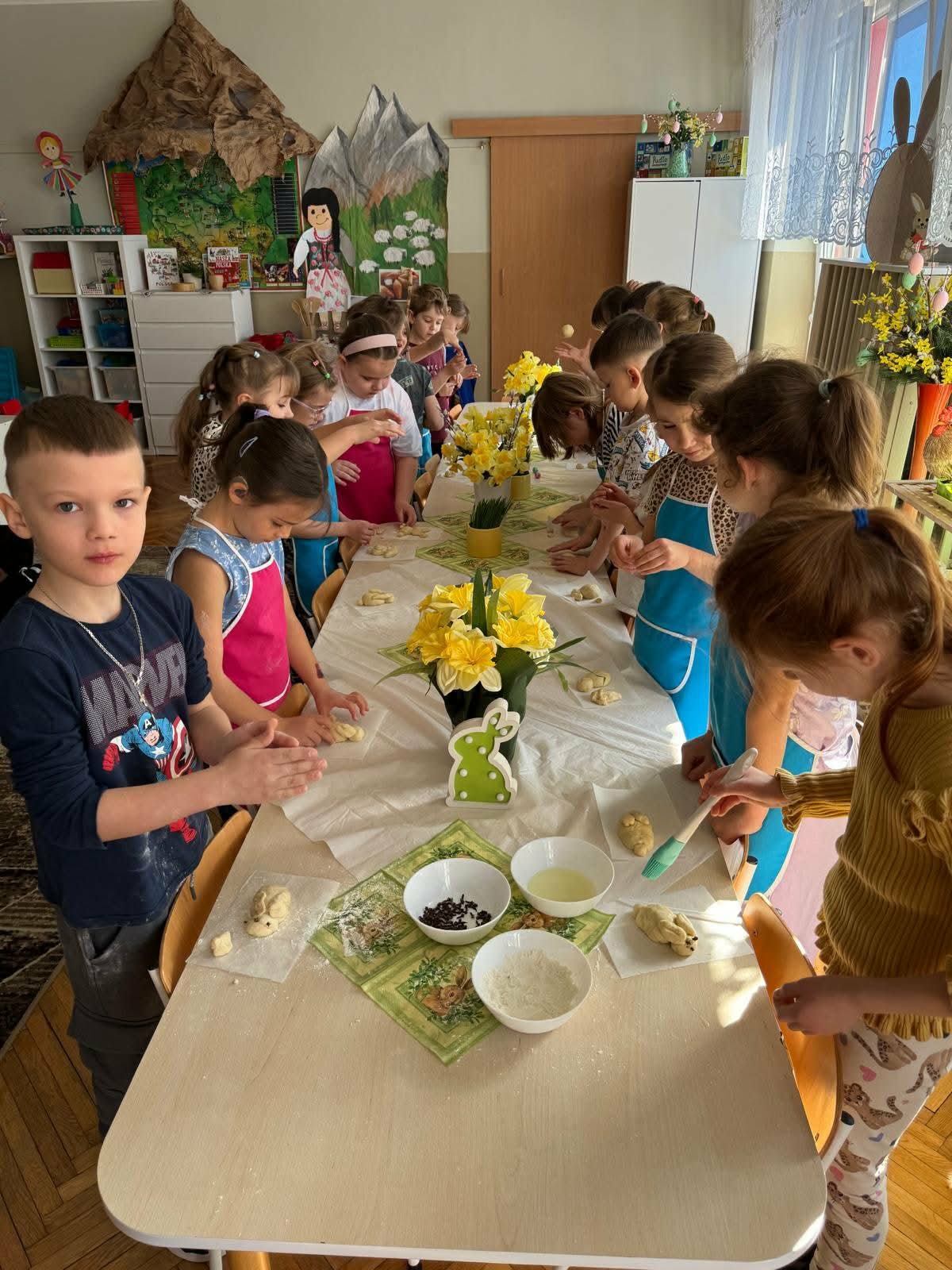 W najstarszej grupie odbyły się warsztaty kulinarne, podczas których dzieci wykonały wielkanocne zajączki z ciasta drożdżowego. Takie działania dają dzieciom wiele radości i satysfakcji. Wypieki zostały przeznaczone na kiermasz wielkanocny. Po pracy był też czas na odpoczynek i zabawę na świeżym powietrzu.