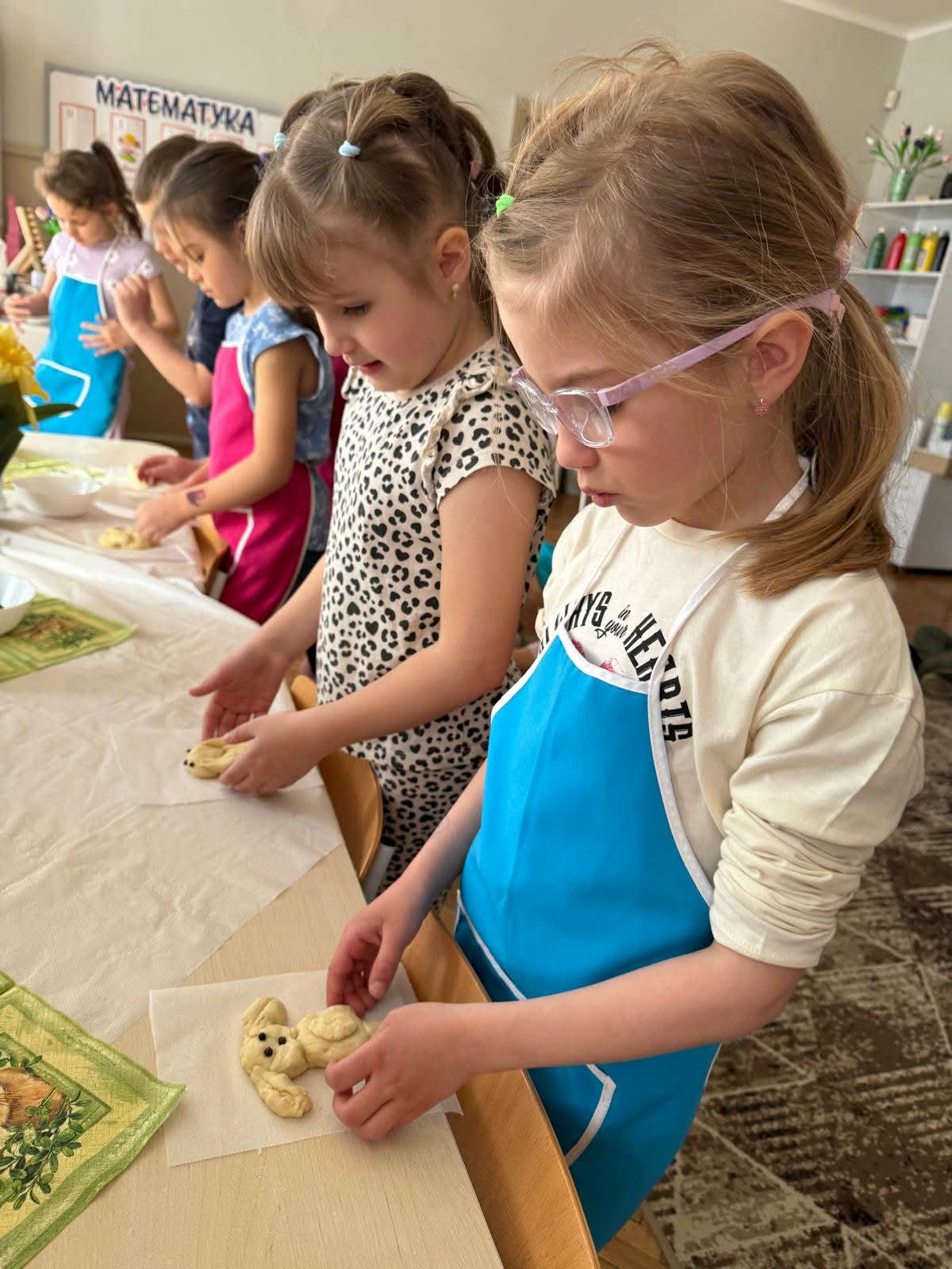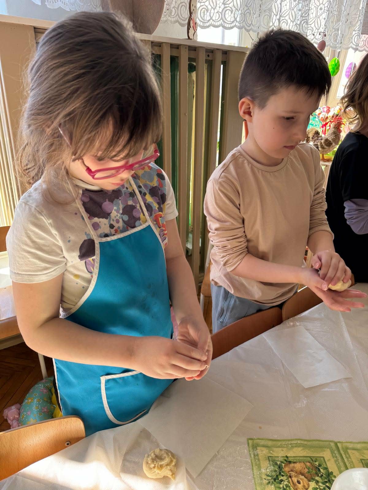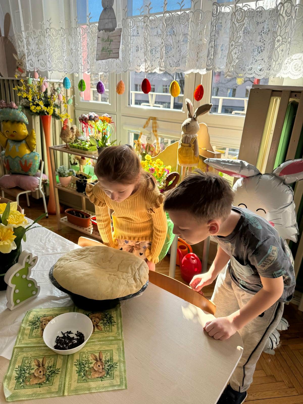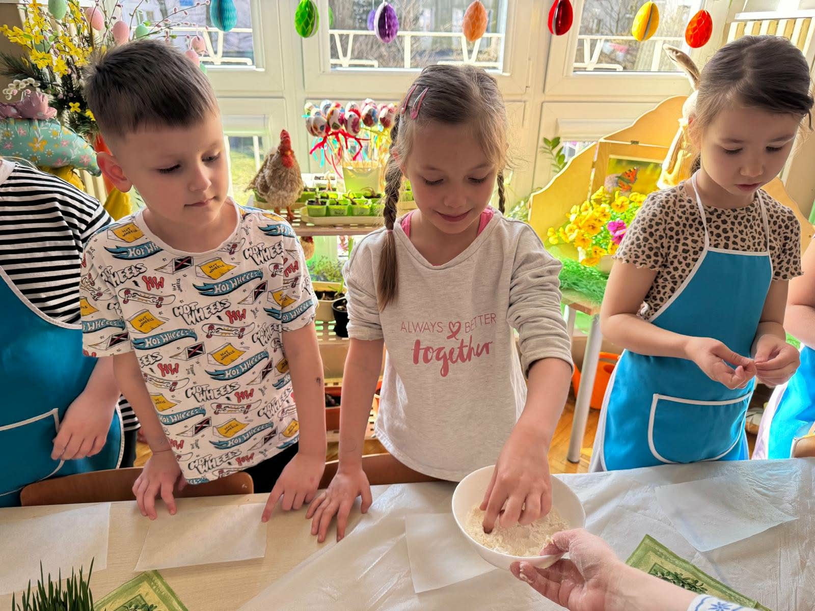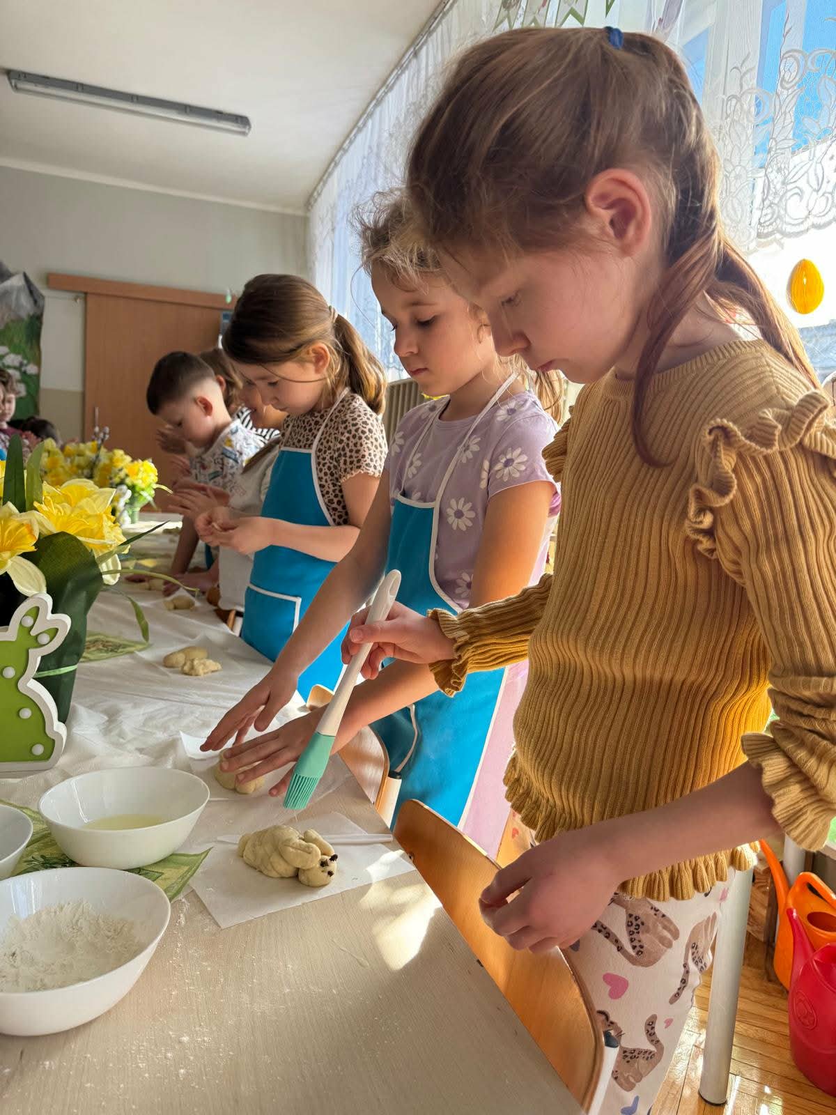 W najstarszej grupie odbyły się warsztaty kulinarne, podczas których dzieci wykonały wielkanocne zajączki z ciasta drożdżowego. Takie działania dają dzieciom wiele radości i satysfakcji. Wypieki zostały przeznaczone na kiermasz wielkanocny. Po pracy był też czas na odpoczynek i zabawę na świeżym powietrzu.