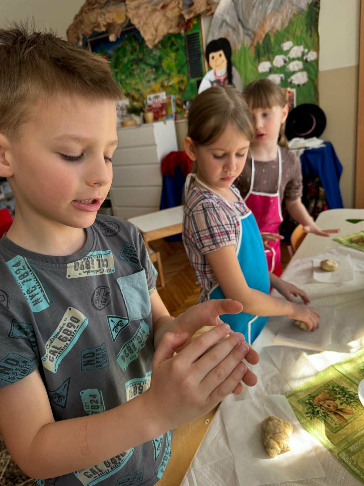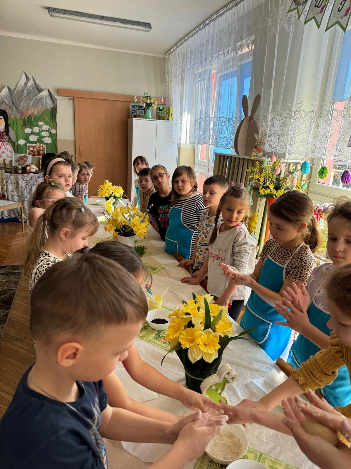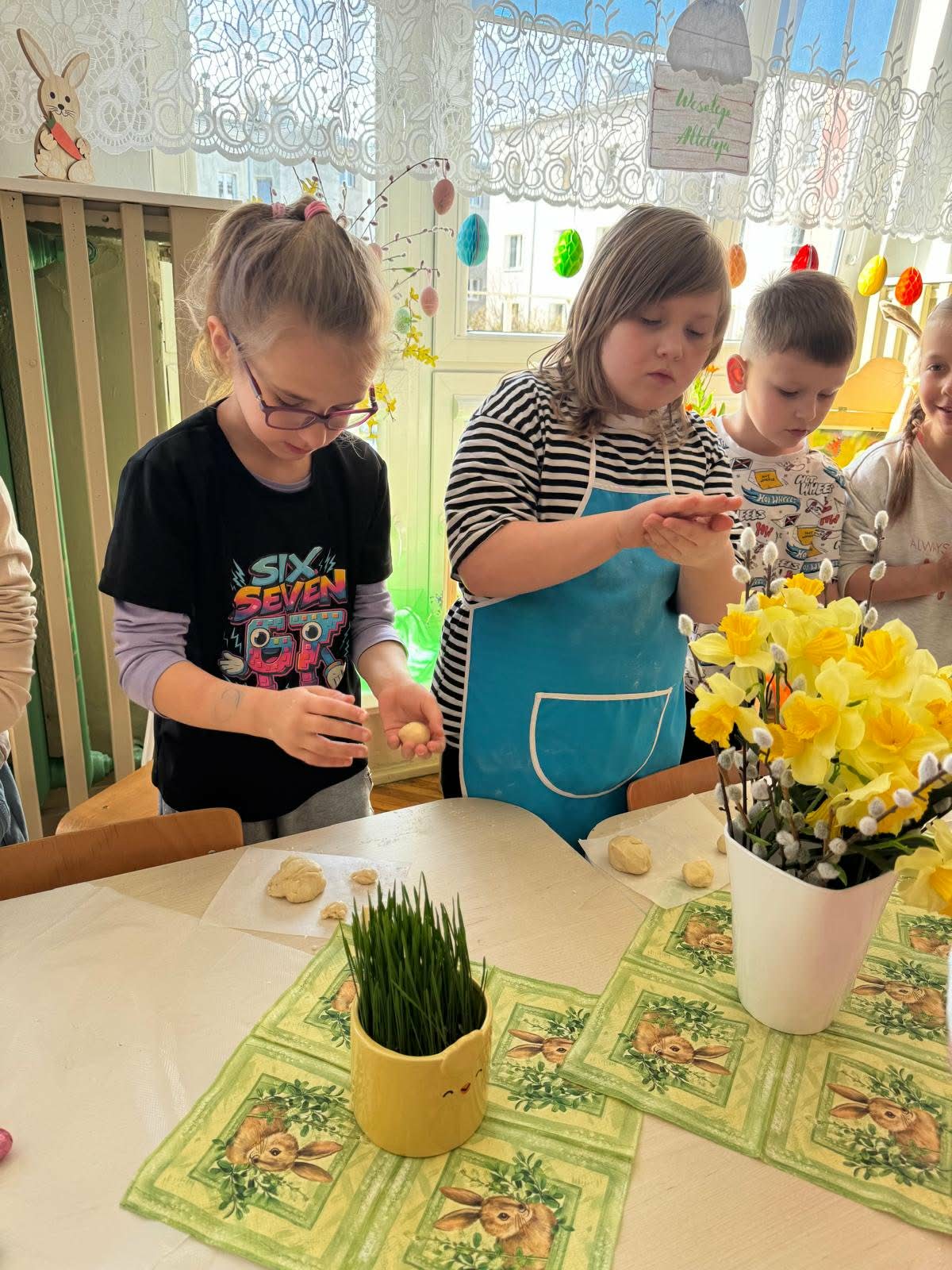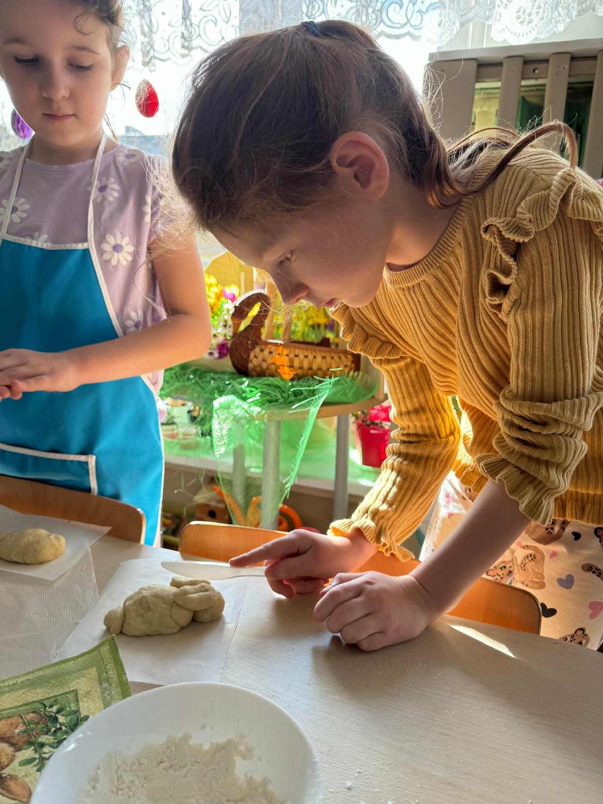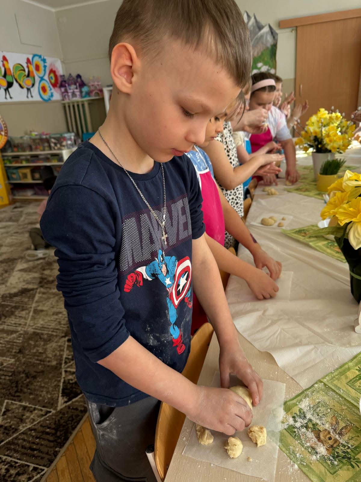 W najstarszej grupie odbyły się warsztaty kulinarne, podczas których dzieci wykonały wielkanocne zajączki z ciasta drożdżowego. Takie działania dają dzieciom wiele radości i satysfakcji. Wypieki zostały przeznaczone na kiermasz wielkanocny. Po pracy był też czas na odpoczynek i zabawę na świeżym powietrzu.