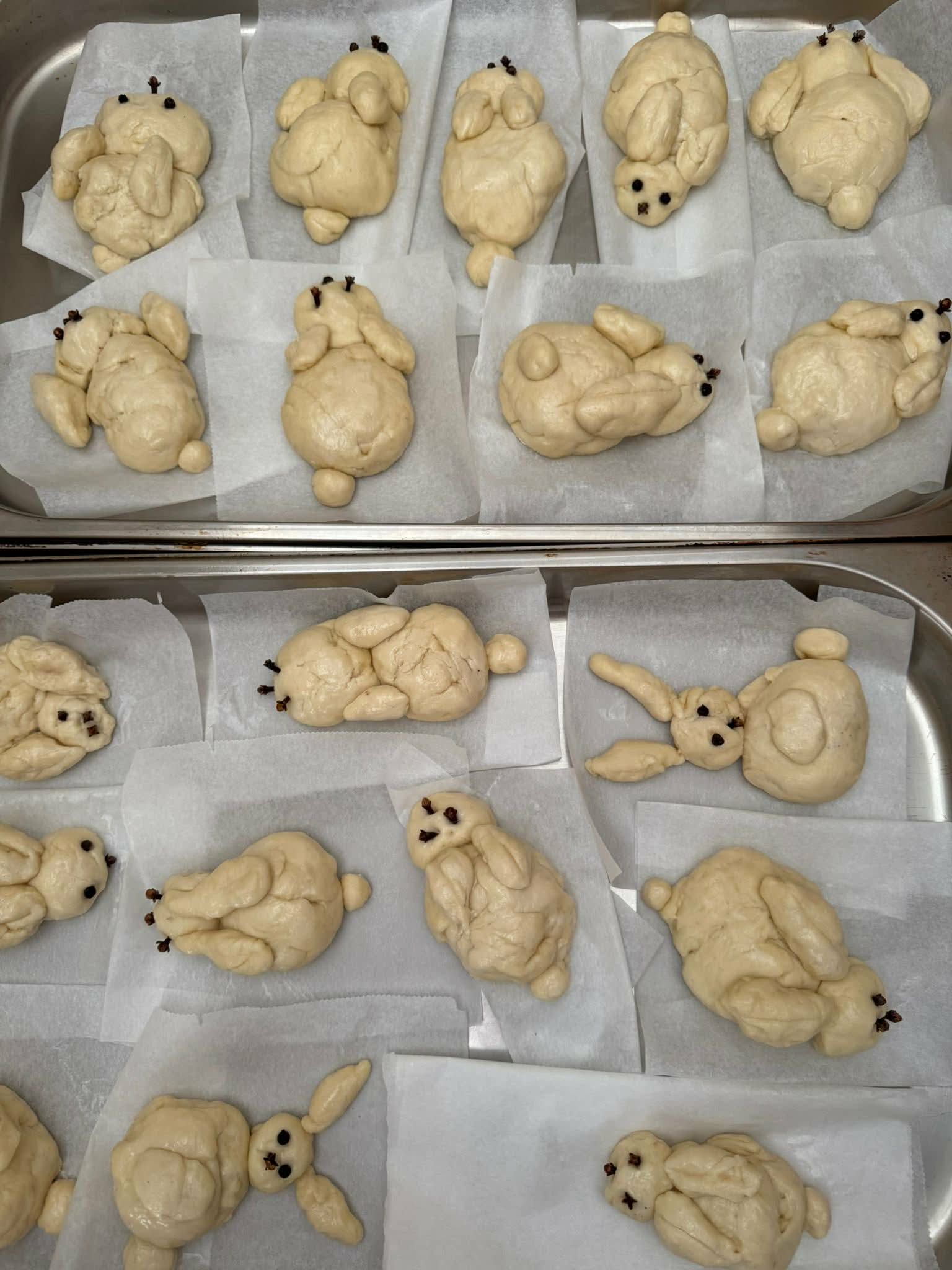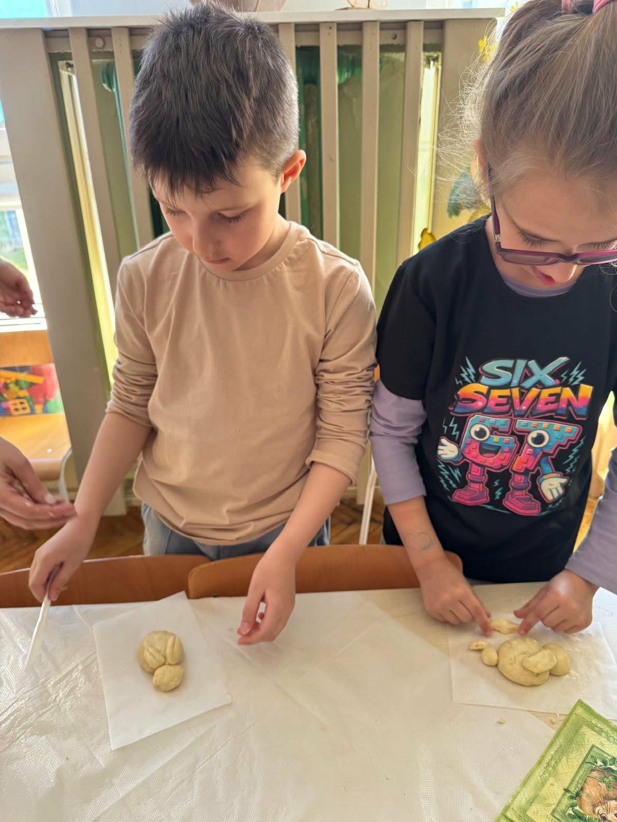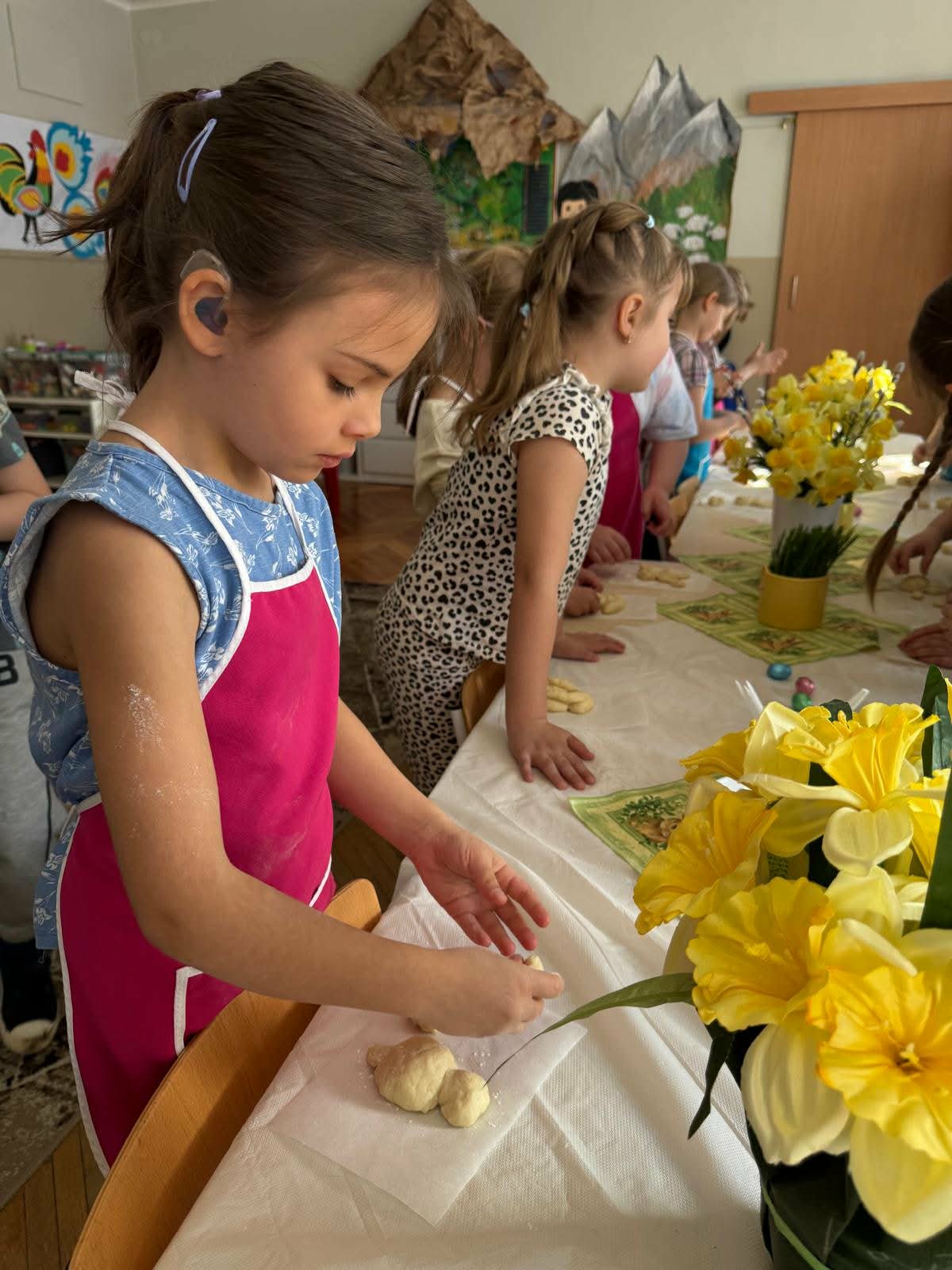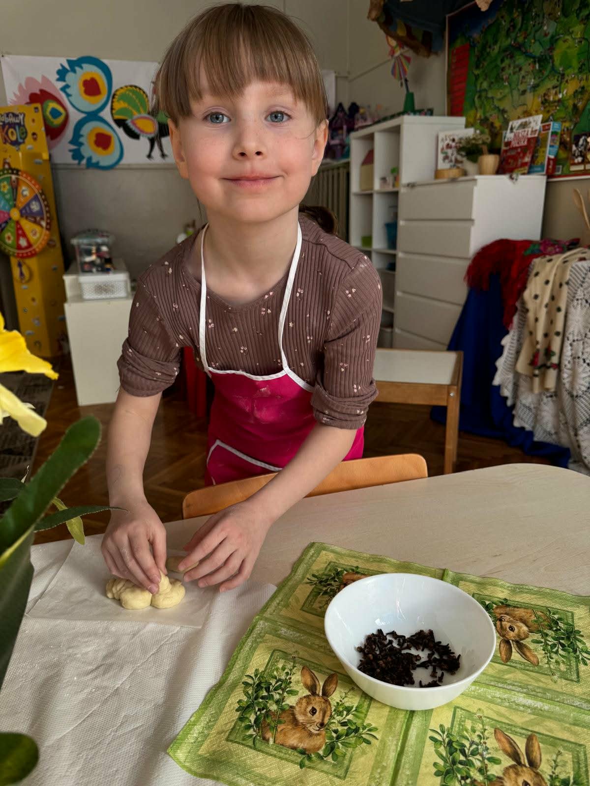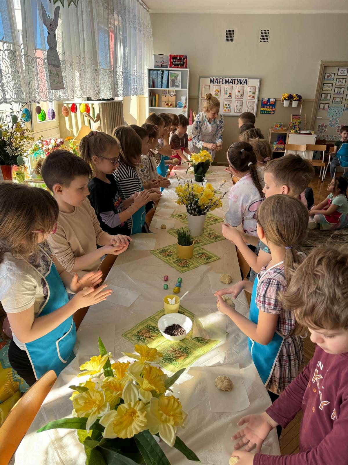 W najstarszej grupie odbyły się warsztaty kulinarne, podczas których dzieci wykonały wielkanocne zajączki z ciasta drożdżowego. Takie działania dają dzieciom wiele radości i satysfakcji. Wypieki zostały przeznaczone na kiermasz wielkanocny. Po pracy był też czas na odpoczynek i zabawę na świeżym powietrzu.