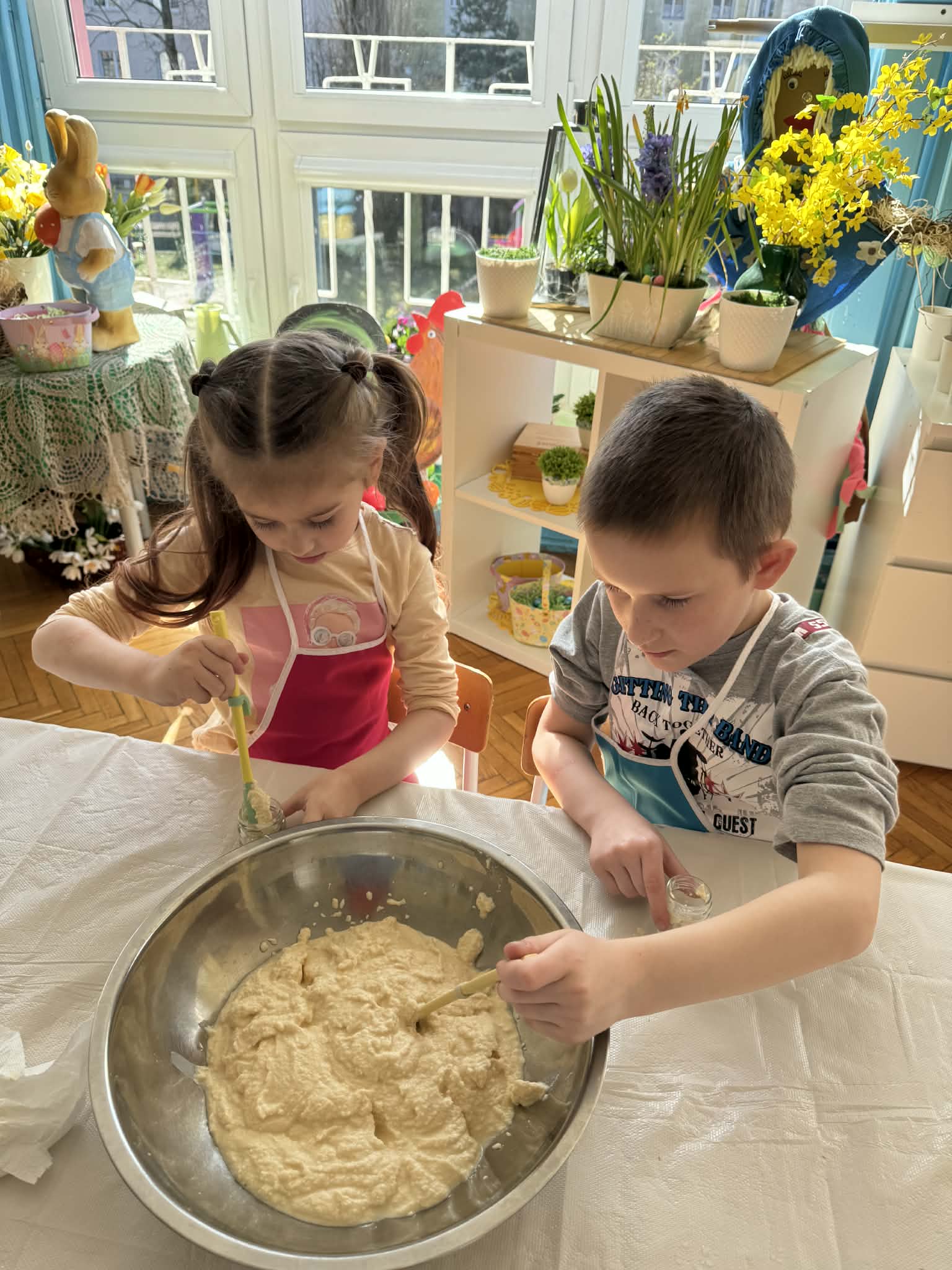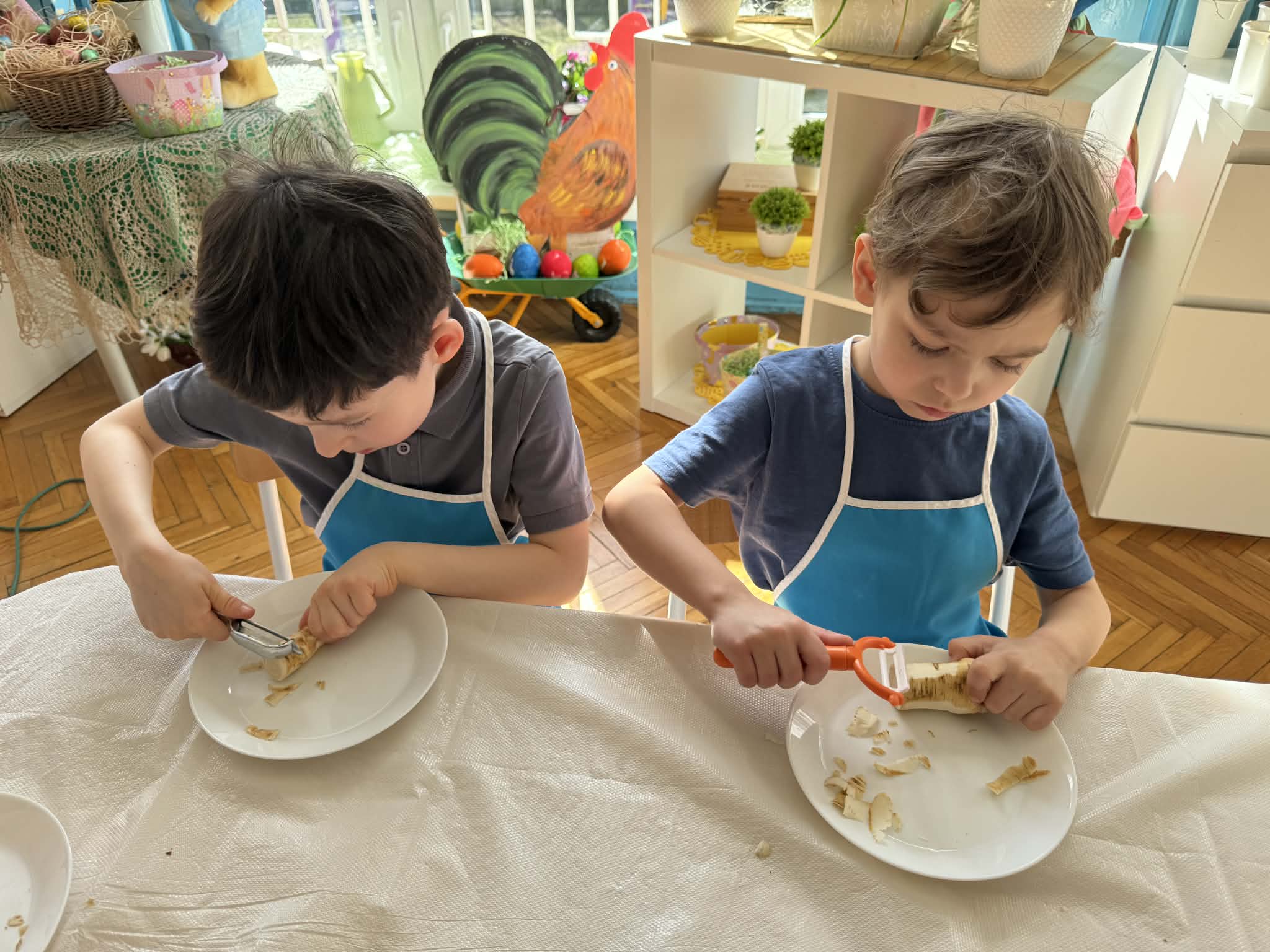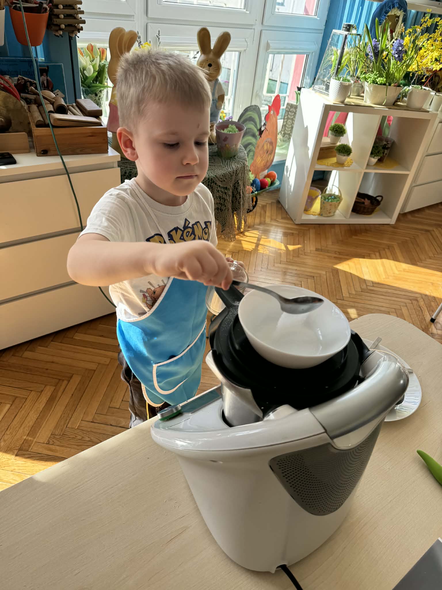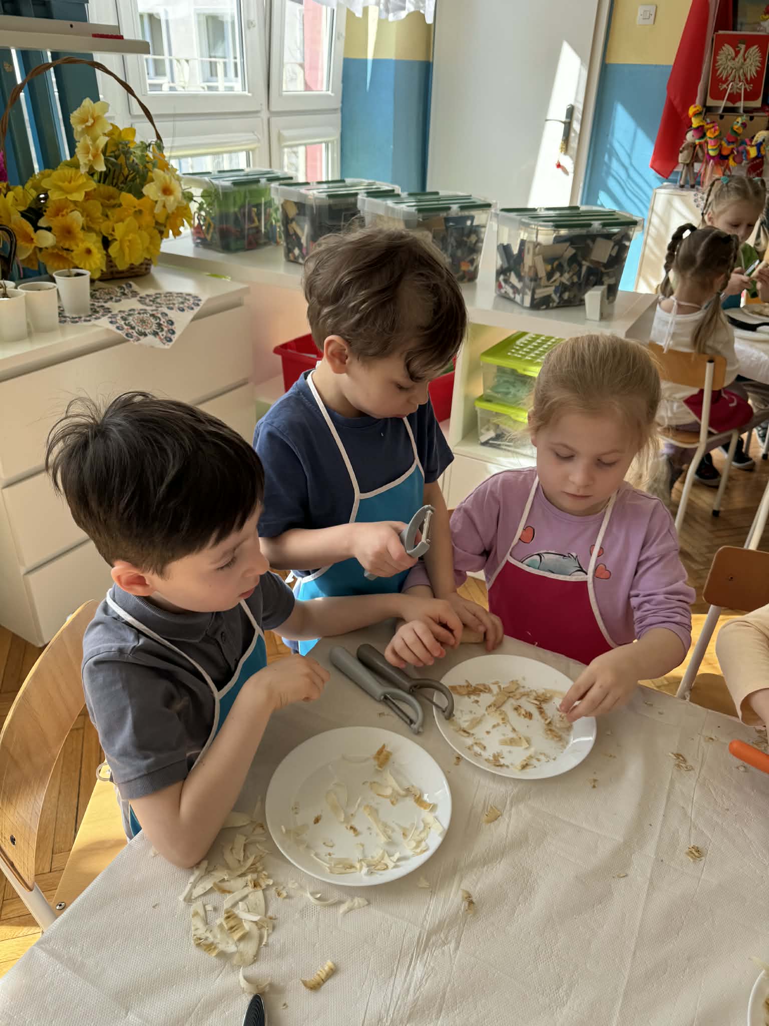 Dziś nasze przedszkolaki zamieniły się w małych kucharzy i z ogromnym zaangażowaniem przygotowywały tradycyjny chrzan na kiermasz wielkanocny. Dzieci z ciekawością poznawały zapach i smak chrzanu, uczyły się, skąd się bierze i jak ważnym elementem jest w świątecznej kuchni. Nie zabrakło śmiechu, odrobiny łez (bo chrzan potrafi być naprawdę ostry! i przede wszystkim świetnej zabawy. Przygotowane słoiczki będą dostępne na naszym kiermaszu – to nie tylko pyszny dodatek do wielkanocnych potraw, ale też efekt pracy i serca włożonego przez dzieci