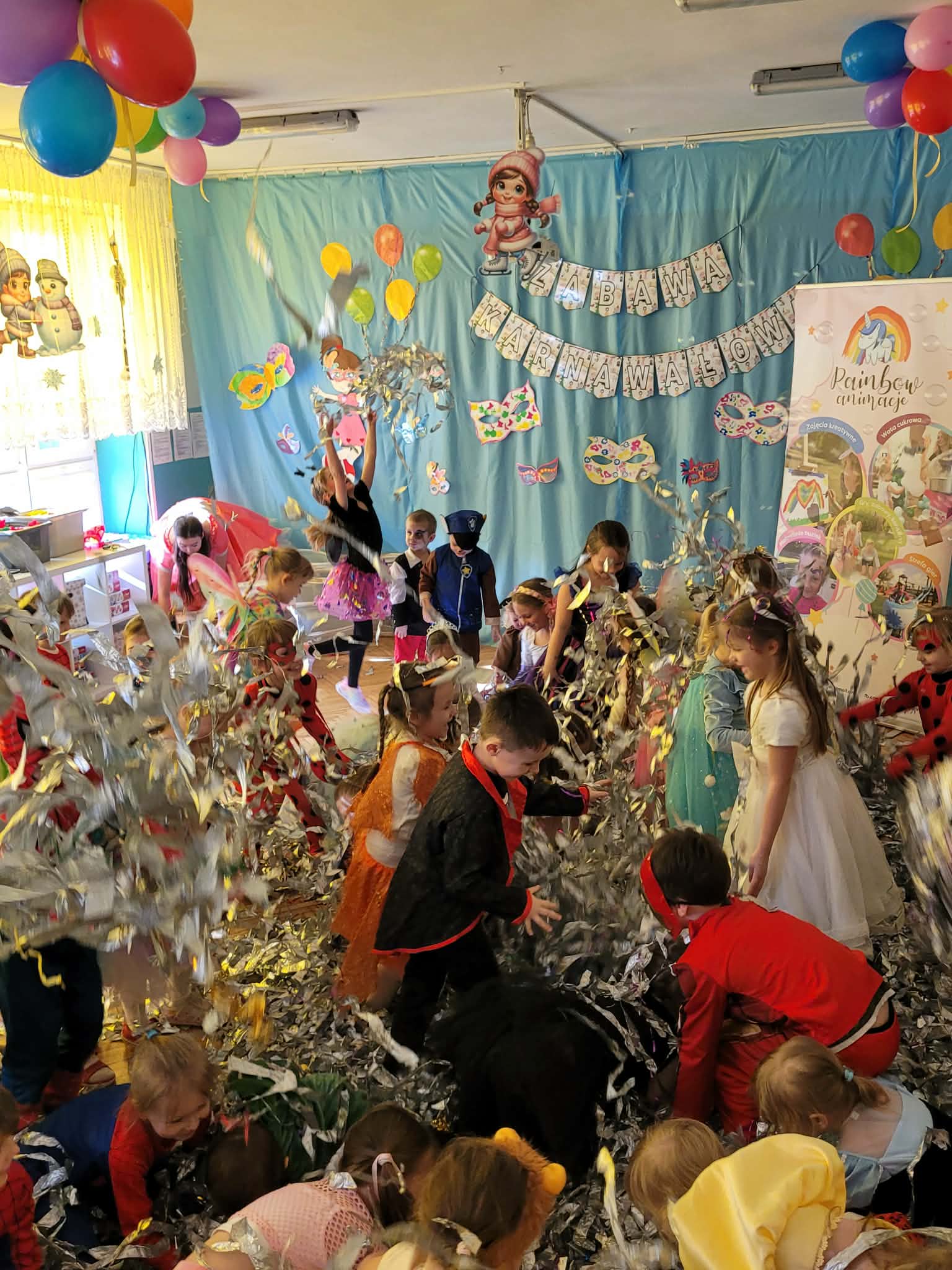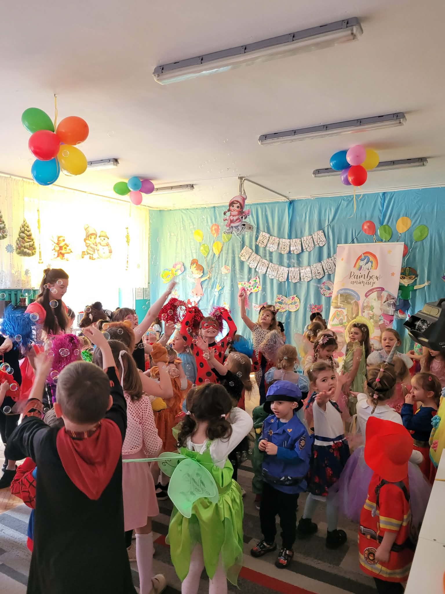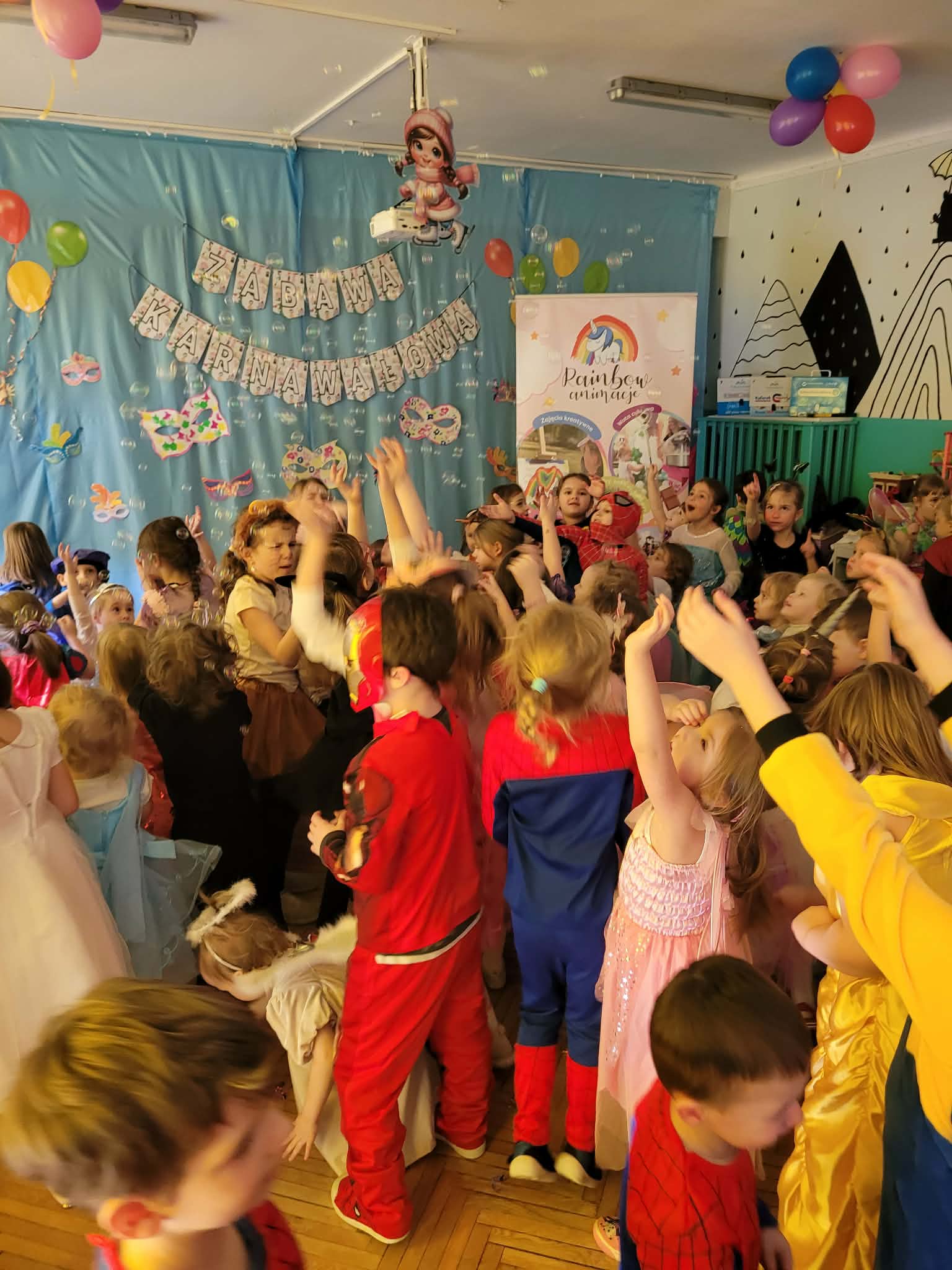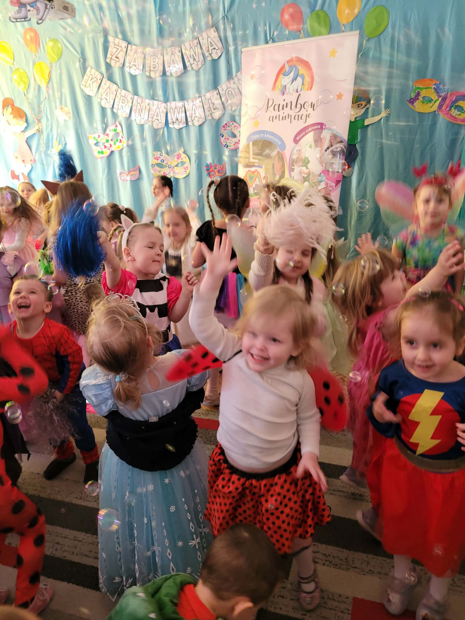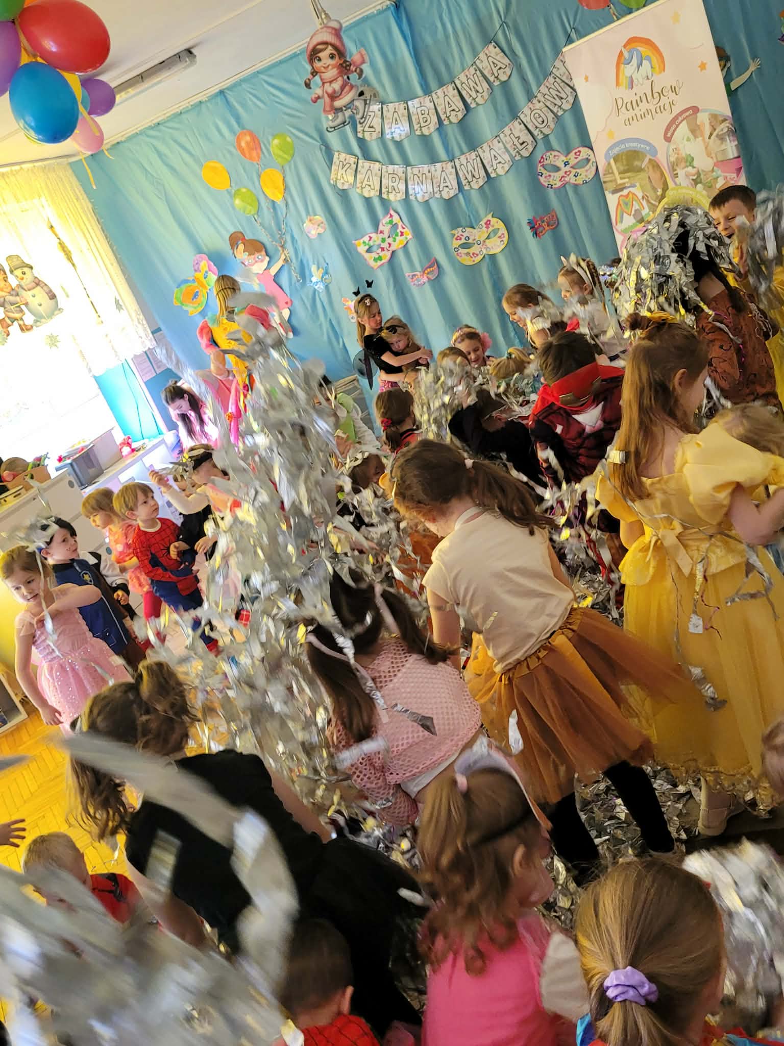 Tak też było u nas. W dniu 16.02.2026r. w naszym przedszkolu odbył się bal karnawałowy. Tego dnia już od rana w przedszkolu pojawiały się kolorowe postacie. Dzieci przebrane były za bohaterów znanych bajek. Rozpoznać dzieci było bardzo trudno. Dzieci świetnie się bawiły podczas balu prowadzonego przez animatorki z firmy Rainbow (sponsorowany z Rady rodziców). Na sali podczas pląsów robiło się kolorowo, wszyscy bawili się wesoło, uśmiech nie znikał z twarzy mimo chwilowego zmęczenia. Bal umożliwił dzieciom i wychowawcom spędzenie czasu w miłej atmosferze. Wspólna zabawa przyniosła wiele radości naszym wychowankom, a to było głównym celem tego balu.