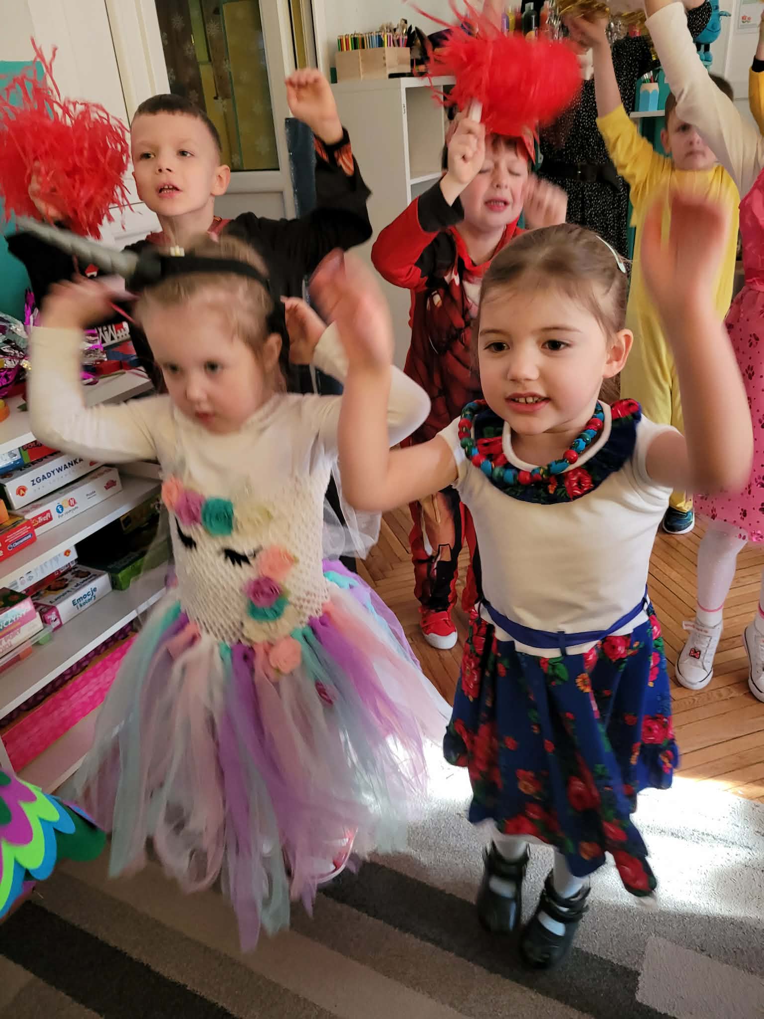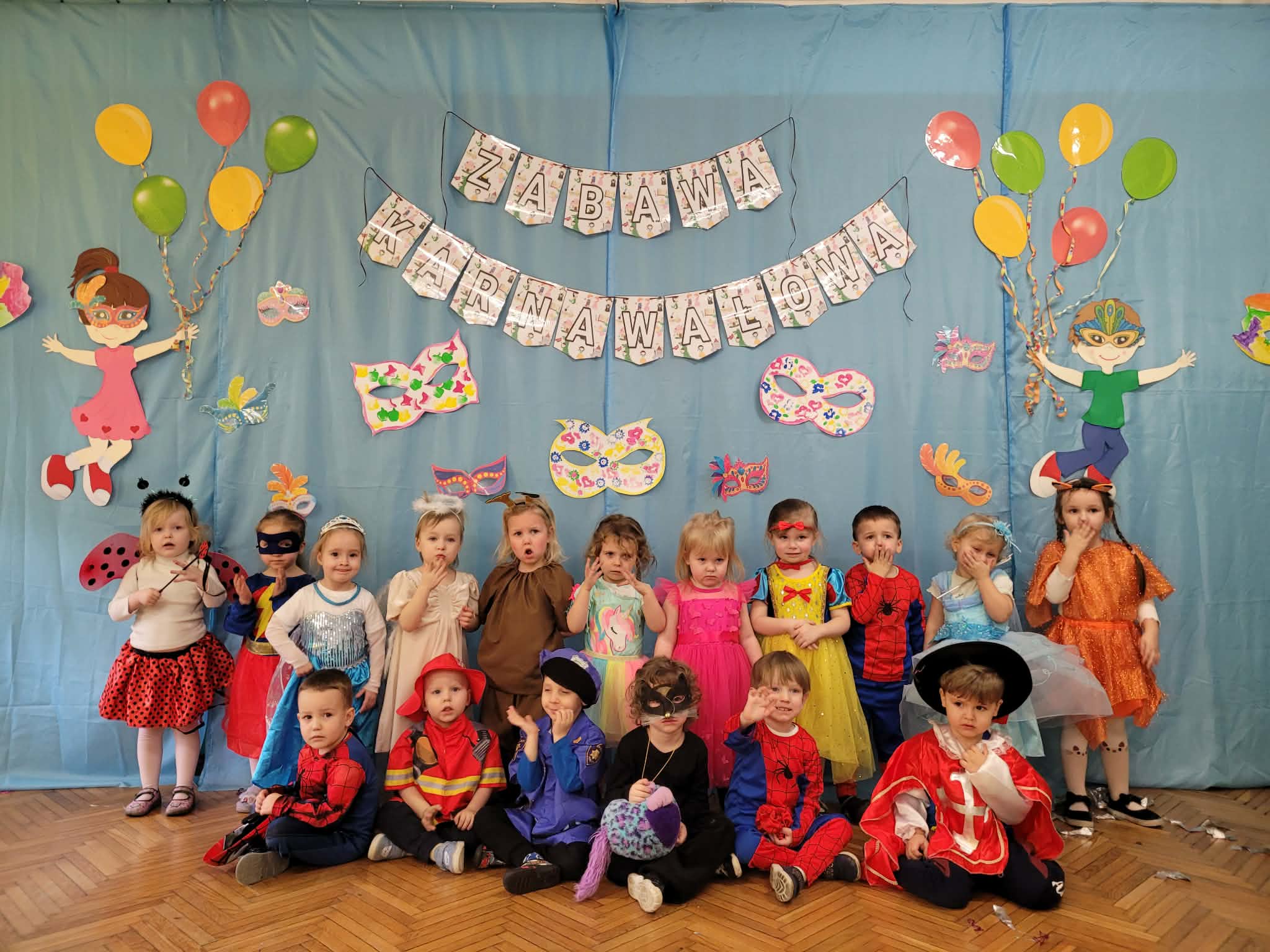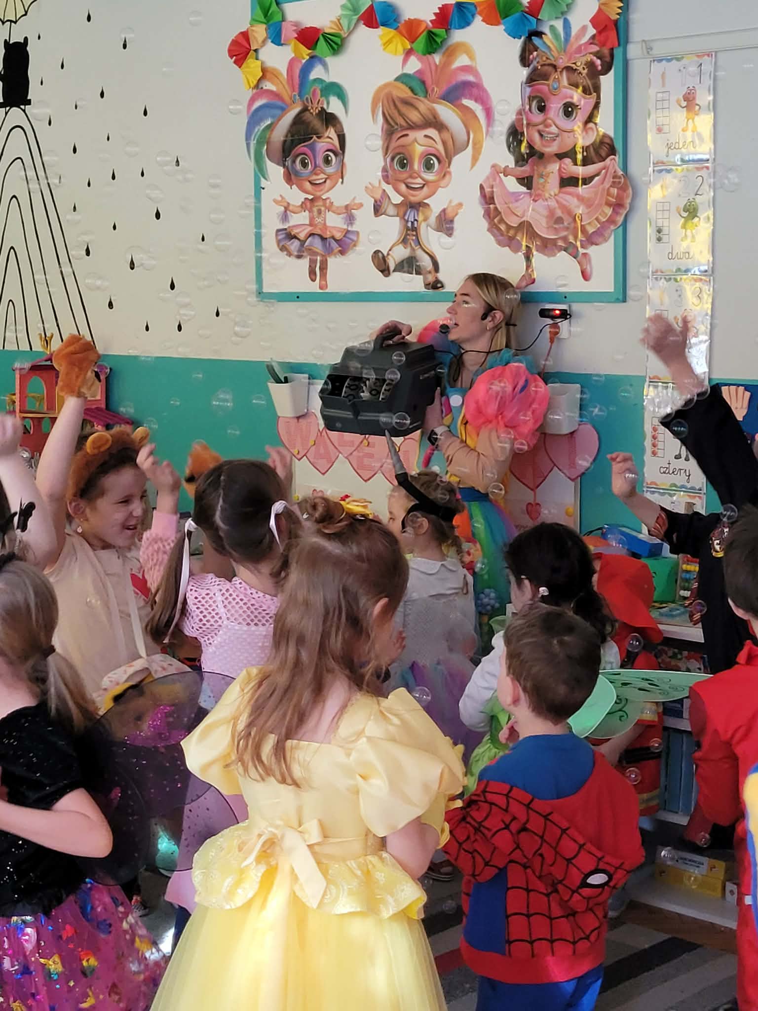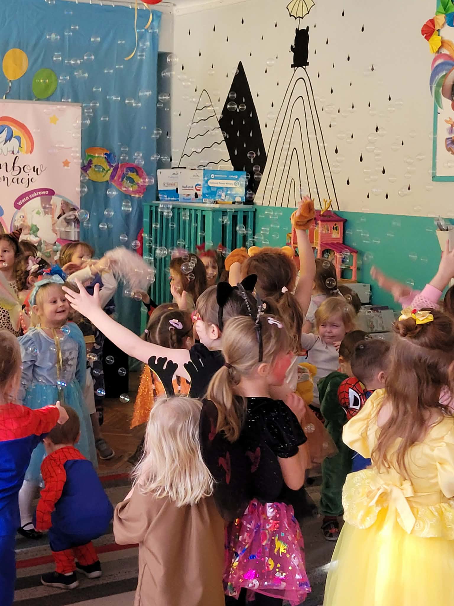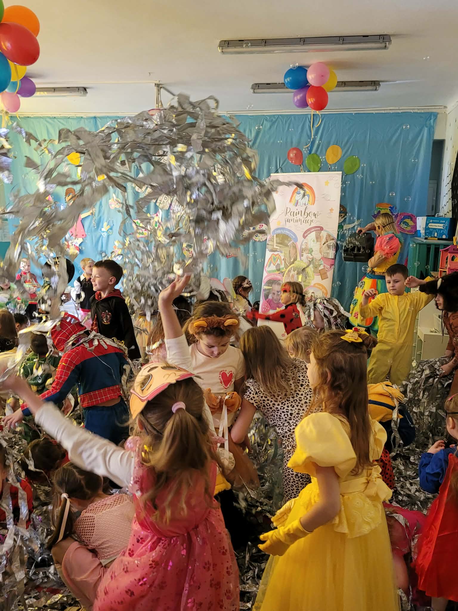 Tak też było u nas. W dniu 16.02.2026r. w naszym przedszkolu odbył się bal karnawałowy. Tego dnia już od rana w przedszkolu pojawiały się kolorowe postacie. Dzieci przebrane były za bohaterów znanych bajek. Rozpoznać dzieci było bardzo trudno. Dzieci świetnie się bawiły podczas balu prowadzonego przez animatorki z firmy Rainbow (sponsorowany z Rady rodziców). Na sali podczas pląsów robiło się kolorowo, wszyscy bawili się wesoło, uśmiech nie znikał z twarzy mimo chwilowego zmęczenia. Bal umożliwił dzieciom i wychowawcom spędzenie czasu w miłej atmosferze. Wspólna zabawa przyniosła wiele radości naszym wychowankom, a to było głównym celem tego balu.