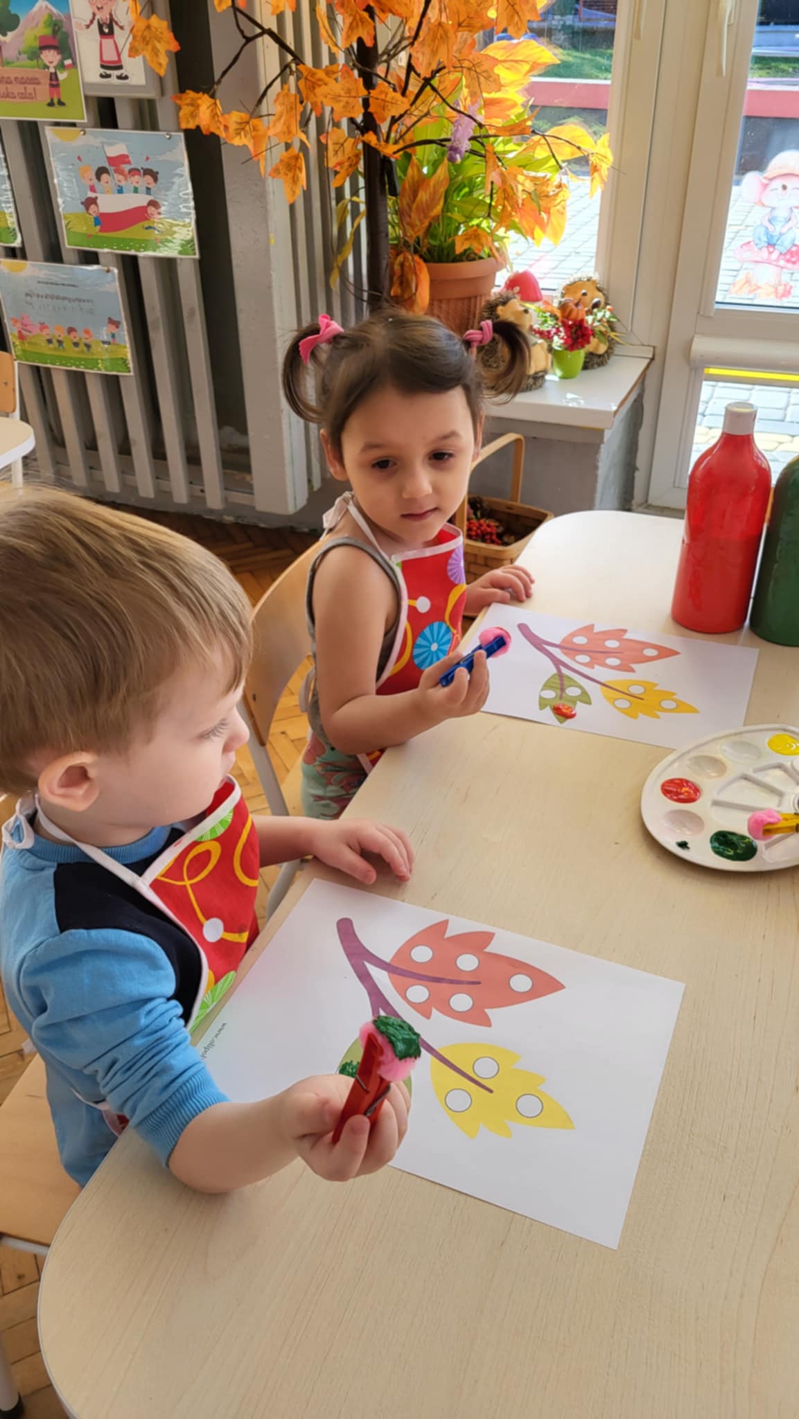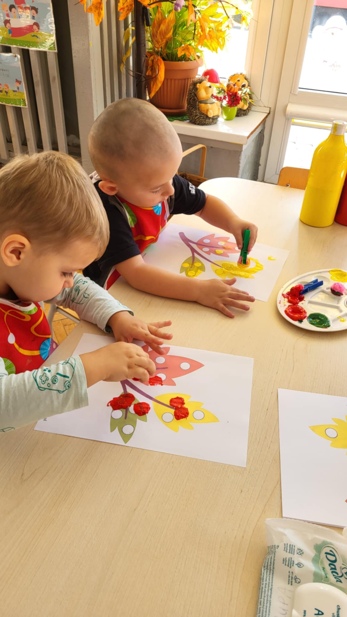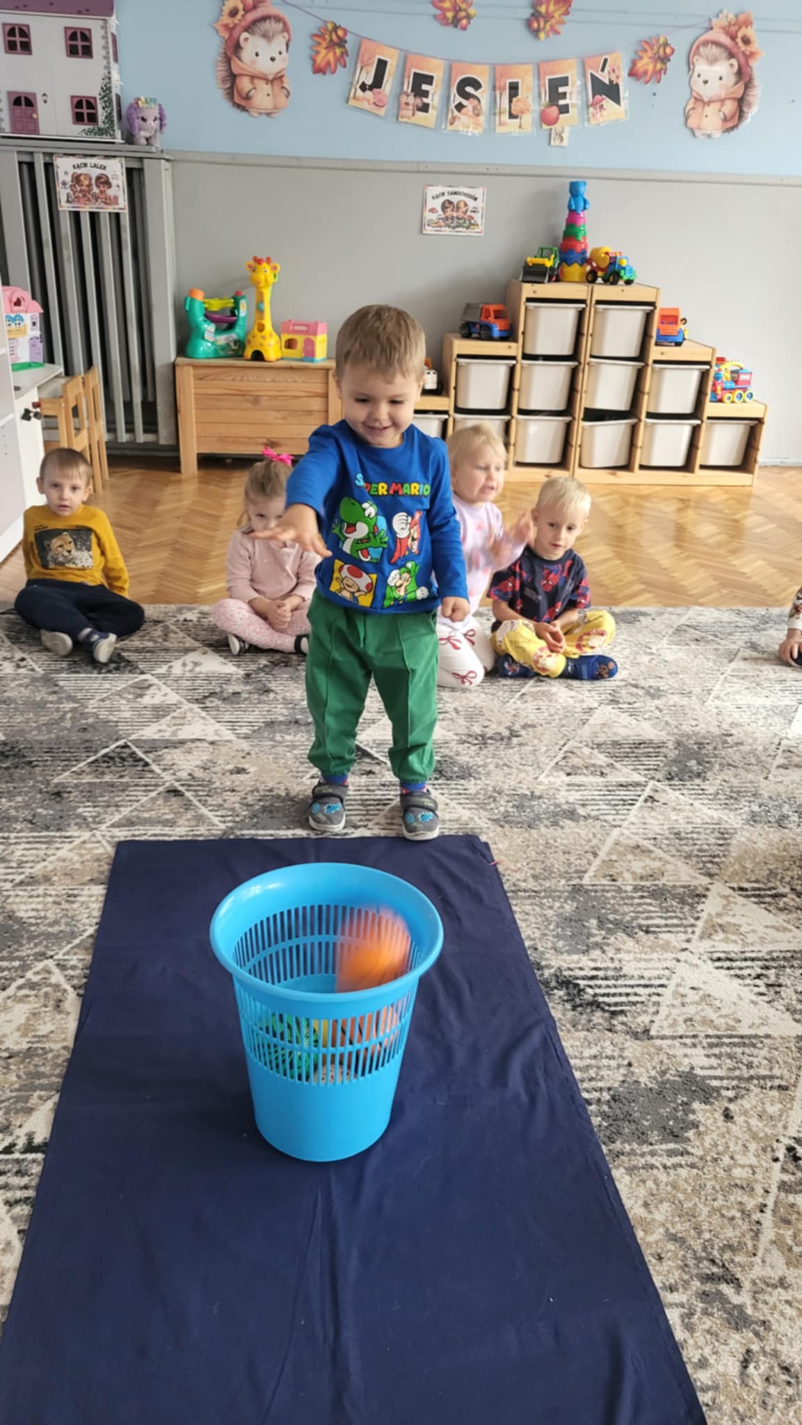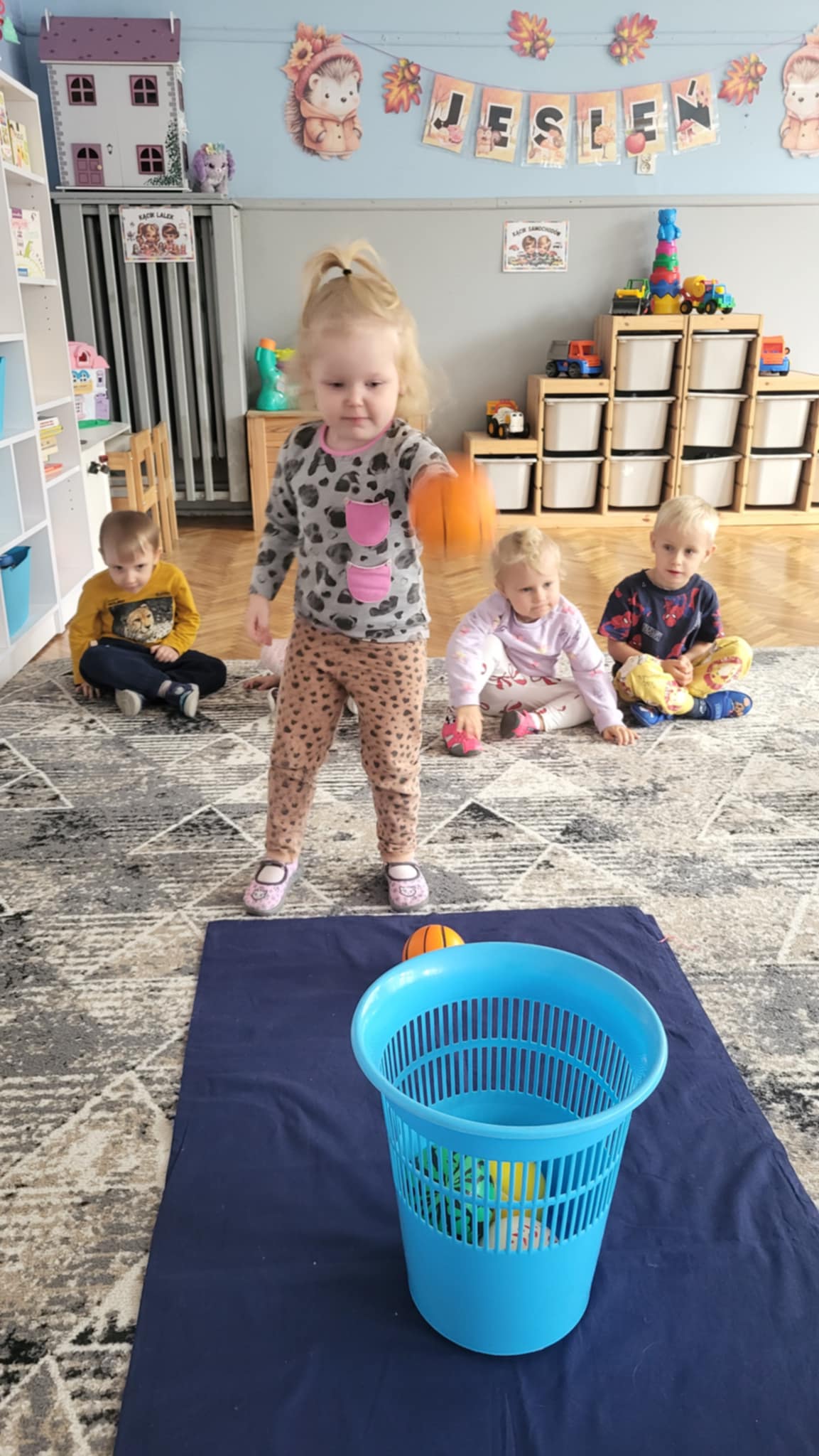 Nasze Maluszki dzielnie ćwiczą różne umiejętności. W tym tygodniu oprócz spacerów i poznawania warzyw, ćwiczyły rzuty do celu, układanie puzzli z 2-óch elementów oraz rozróżnianie i dobieranie kolorów podstawowych używając przy tym niekonwencjonalnych pomocy tj. spinaczy do prania oraz puszków. A najlepiej bawiły się przy dźwiękach jesiennych piosenek oraz ćwiczeń rytmicznych przy tamburynie.