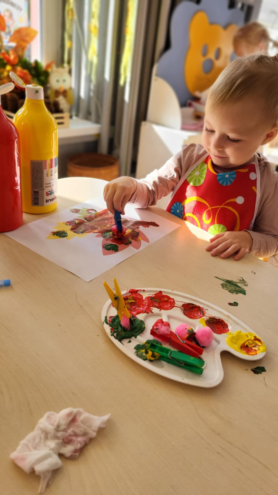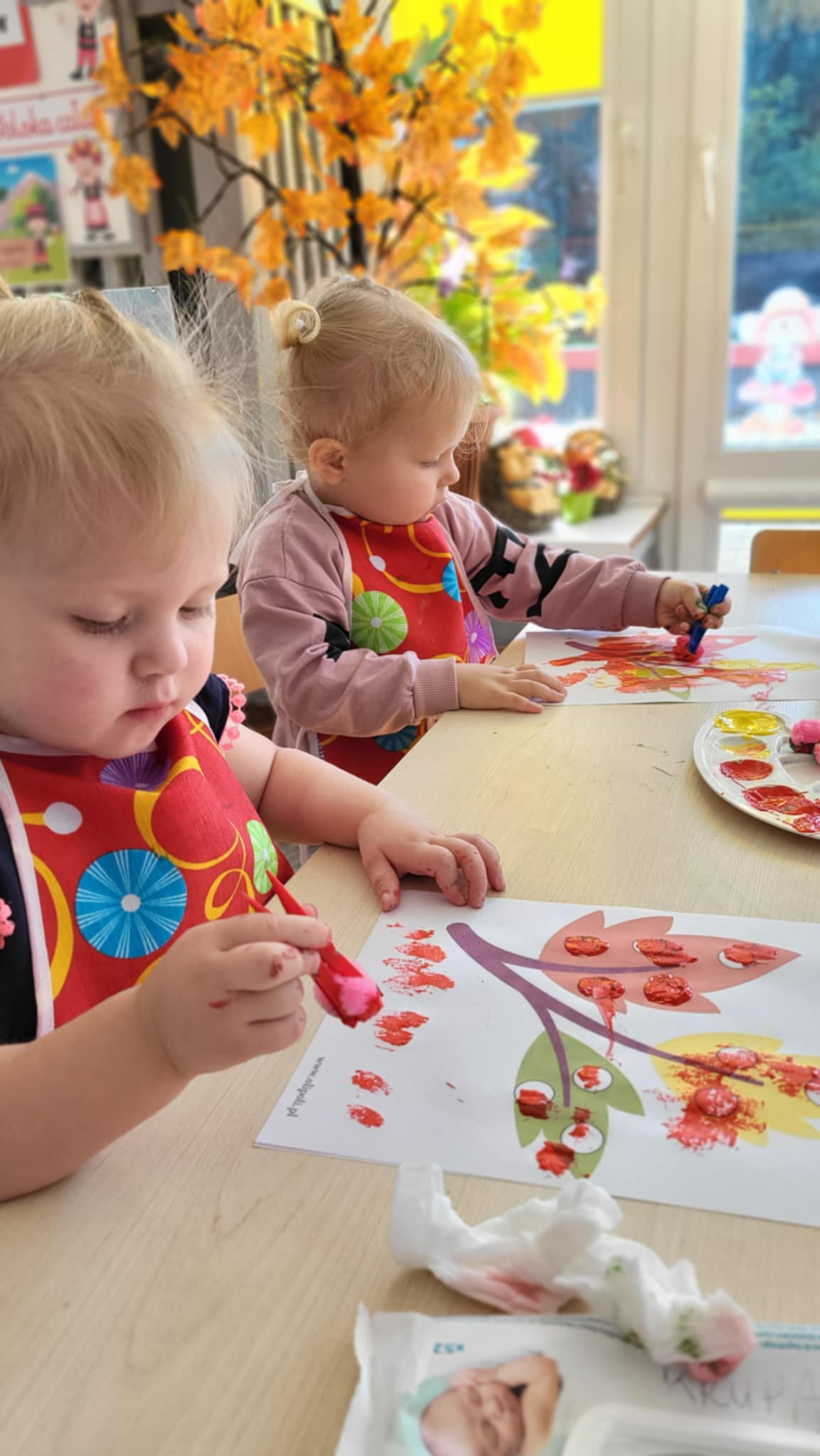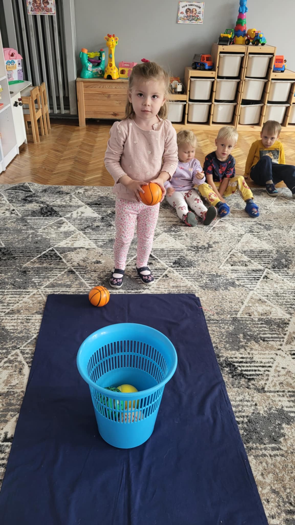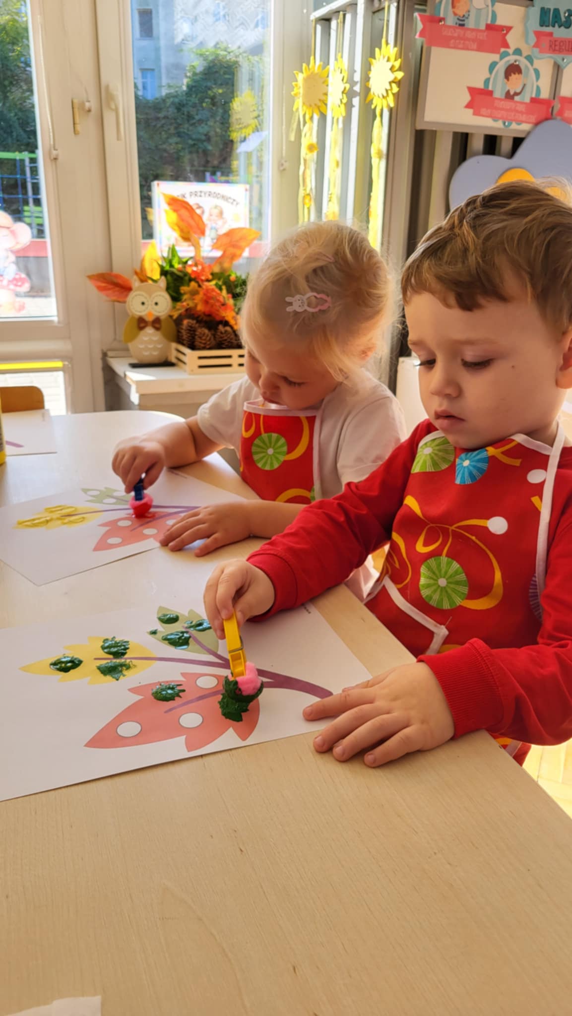 Nasze Maluszki dzielnie ćwiczą różne umiejętności. W tym tygodniu oprócz spacerów i poznawania warzyw, ćwiczyły rzuty do celu, układanie puzzli z 2-óch elementów oraz rozróżnianie i dobieranie kolorów podstawowych używając przy tym niekonwencjonalnych pomocy tj. spinaczy do prania oraz puszków. A najlepiej bawiły się przy dźwiękach jesiennych piosenek oraz ćwiczeń rytmicznych przy tamburynie.
