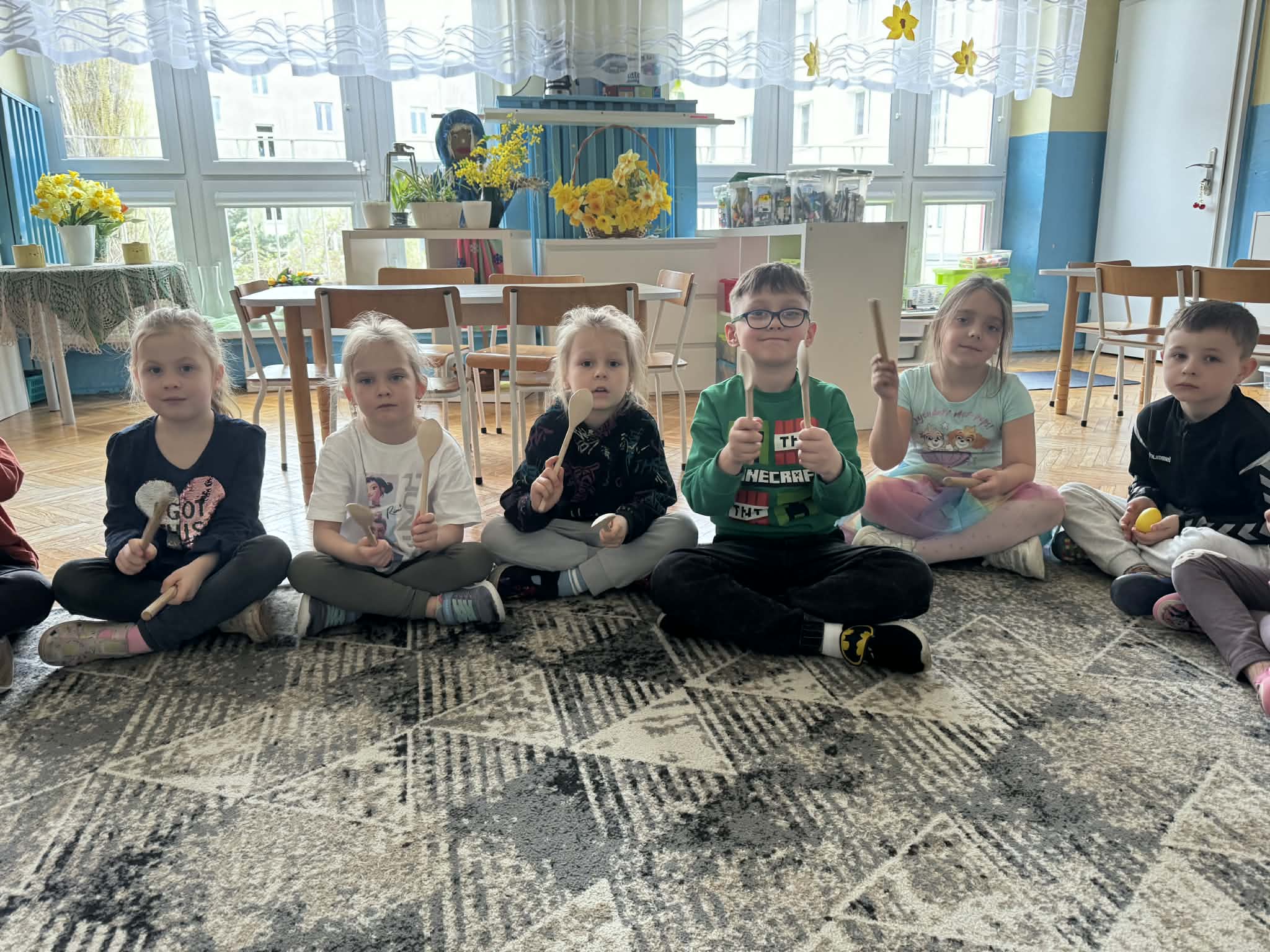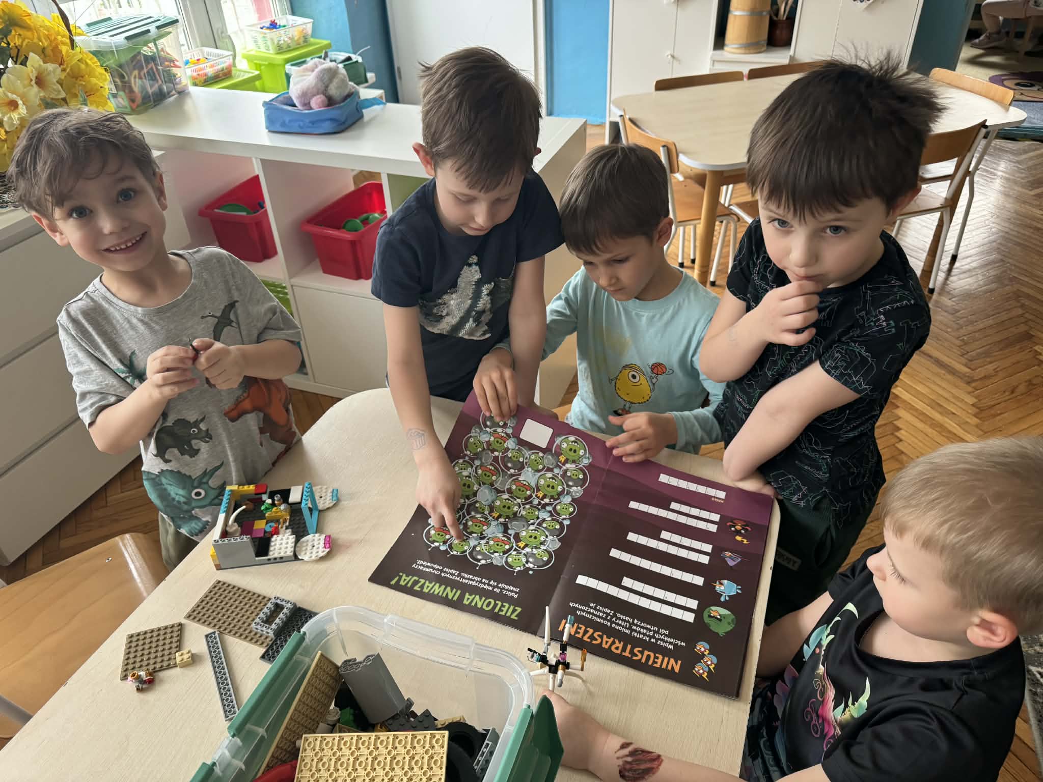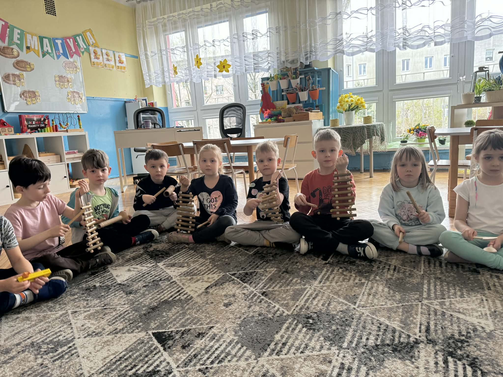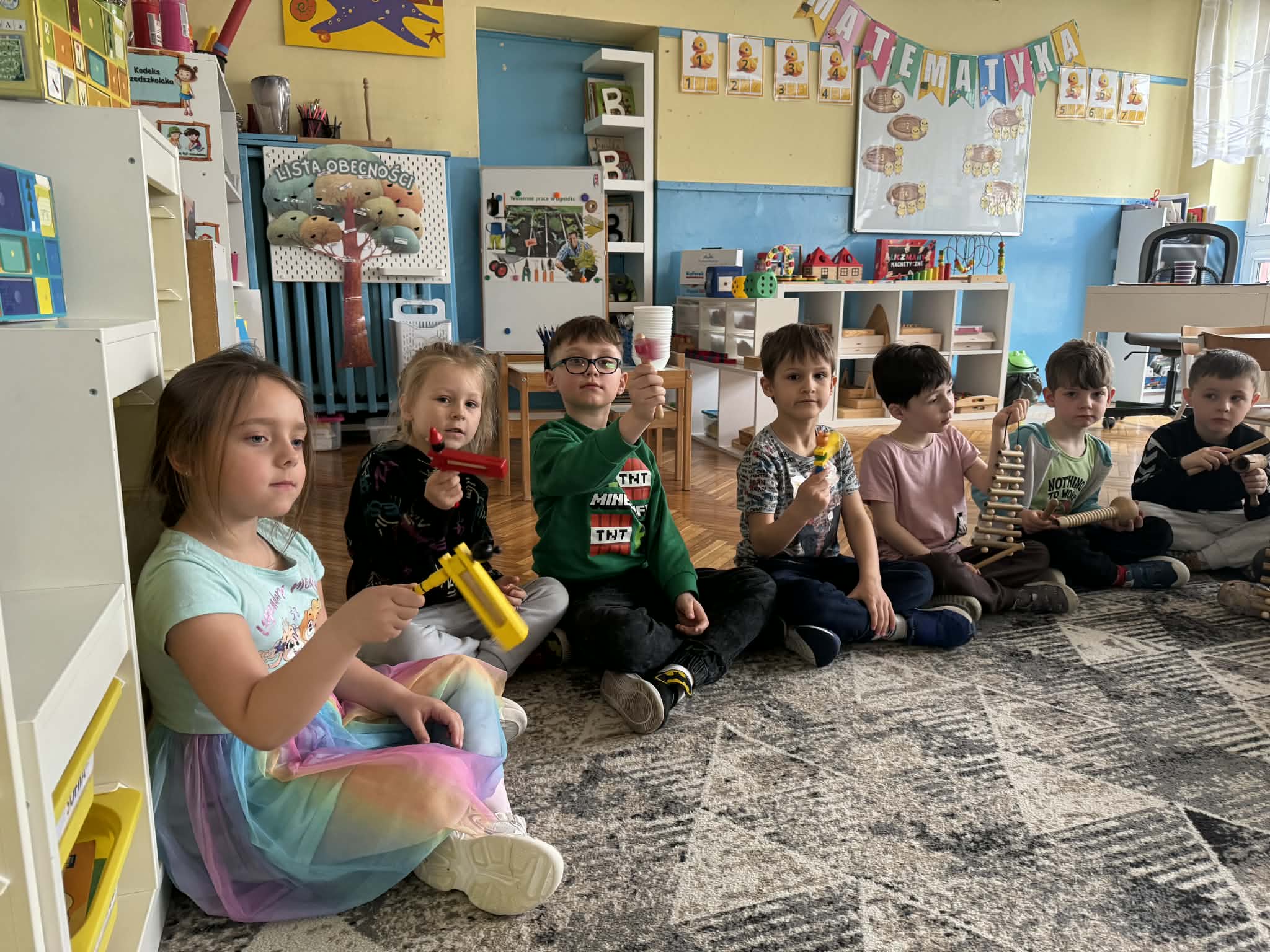 Podczas zajęć matematycznych dzieci dopasowywały figury do kwadratu, składając go w całość, co wspierało ich logiczne myślenie i spostrzegawczość. Nie zabrakło także muzycznych aktywności – przedszkolaki z radością grały na instrumentach, rozwijając poczucie rytmu i słuch. Oczywiście był też czas na zabawy swobodne, które zawsze przynoszą najwięcej radości.