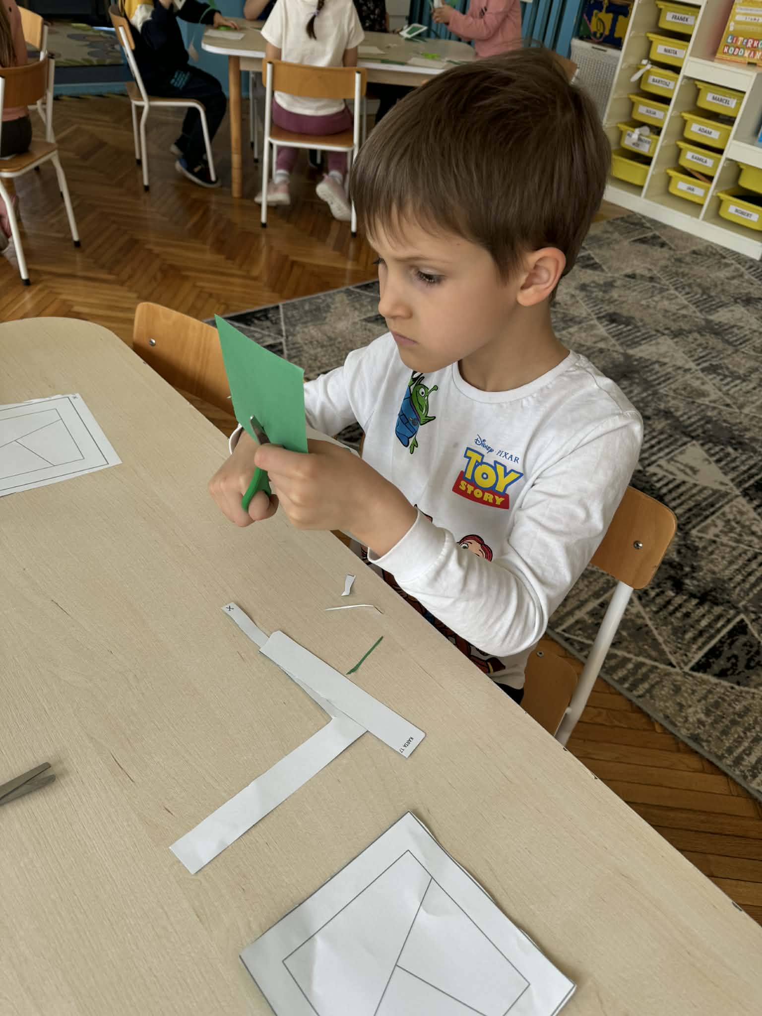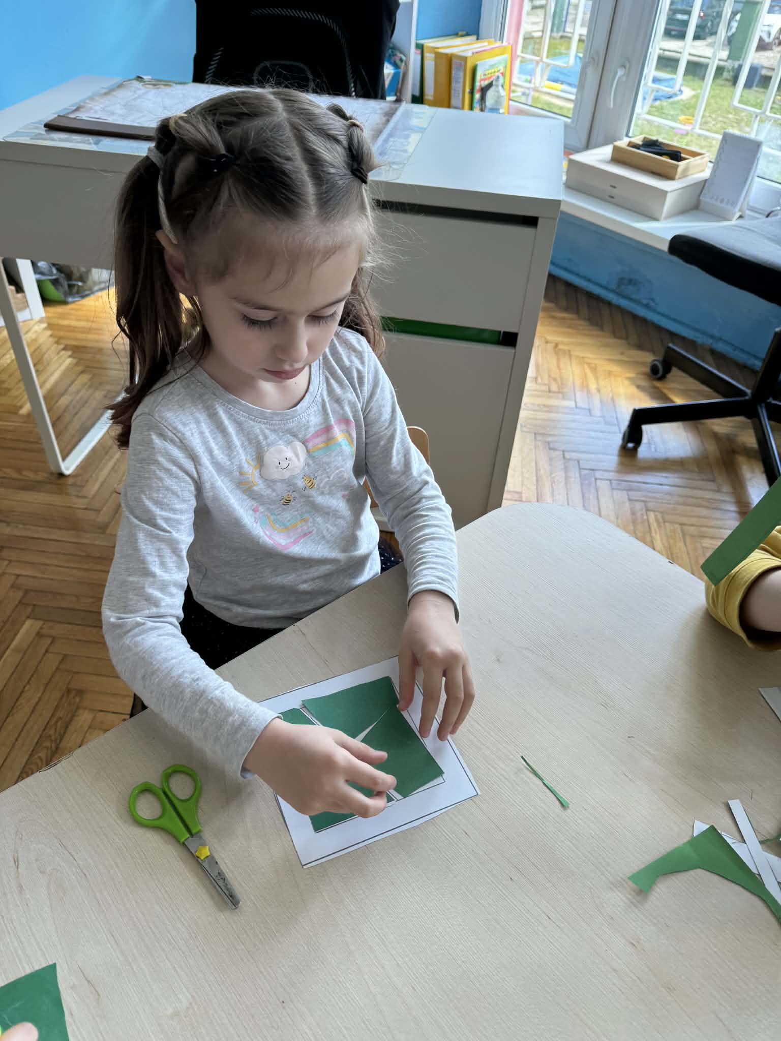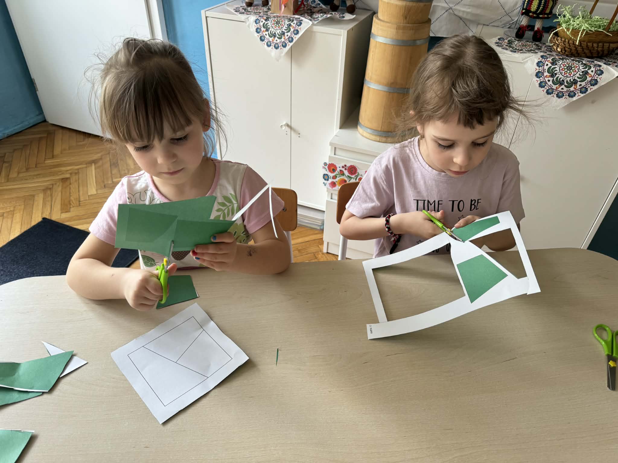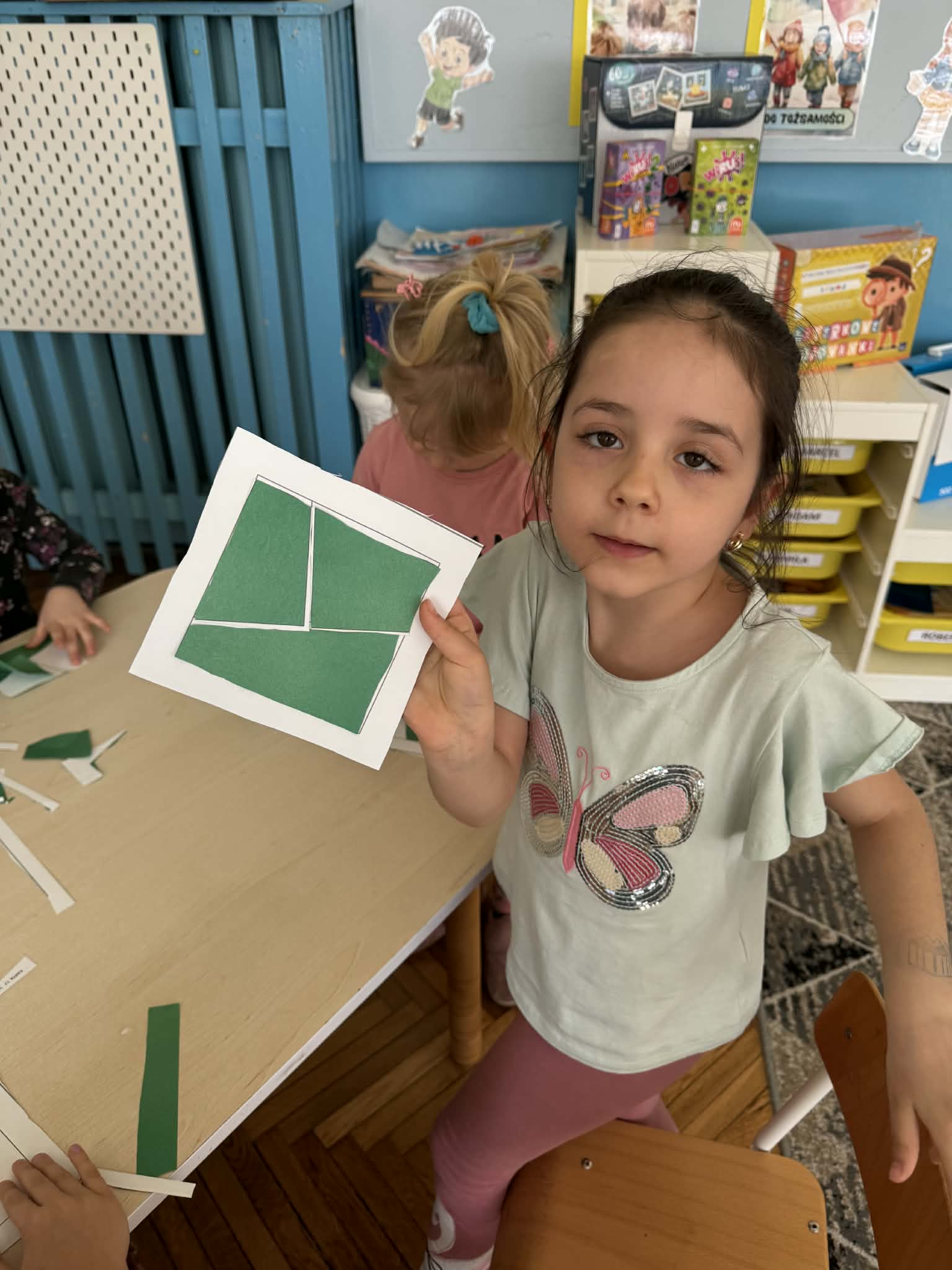 Podczas zajęć matematycznych dzieci dopasowywały figury do kwadratu, składając go w całość, co wspierało ich logiczne myślenie i spostrzegawczość. Nie zabrakło także muzycznych aktywności – przedszkolaki z radością grały na instrumentach, rozwijając poczucie rytmu i słuch. Oczywiście był też czas na zabawy swobodne, które zawsze przynoszą najwięcej radości.