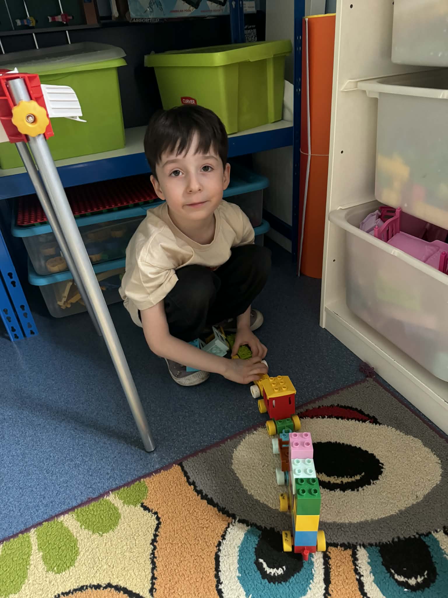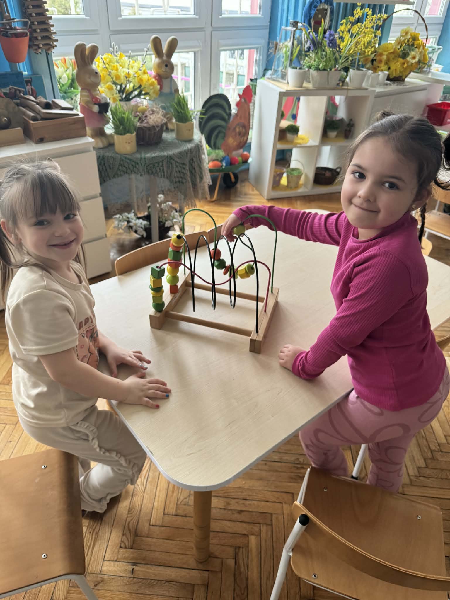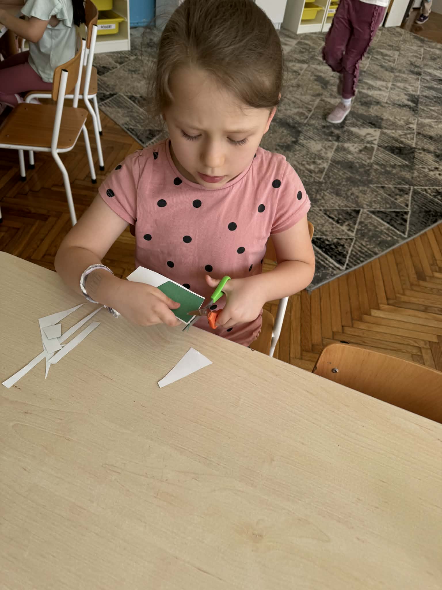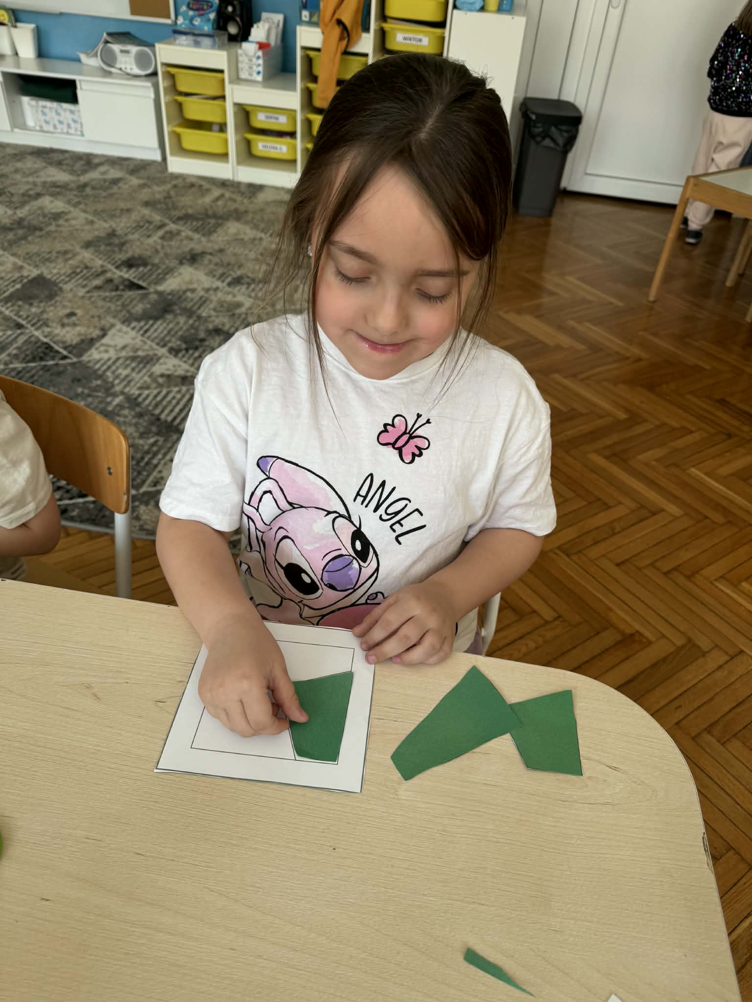 Podczas zajęć matematycznych dzieci dopasowywały figury do kwadratu, składając go w całość, co wspierało ich logiczne myślenie i spostrzegawczość. Nie zabrakło także muzycznych aktywności – przedszkolaki z radością grały na instrumentach, rozwijając poczucie rytmu i słuch. Oczywiście był też czas na zabawy swobodne, które zawsze przynoszą najwięcej radości.