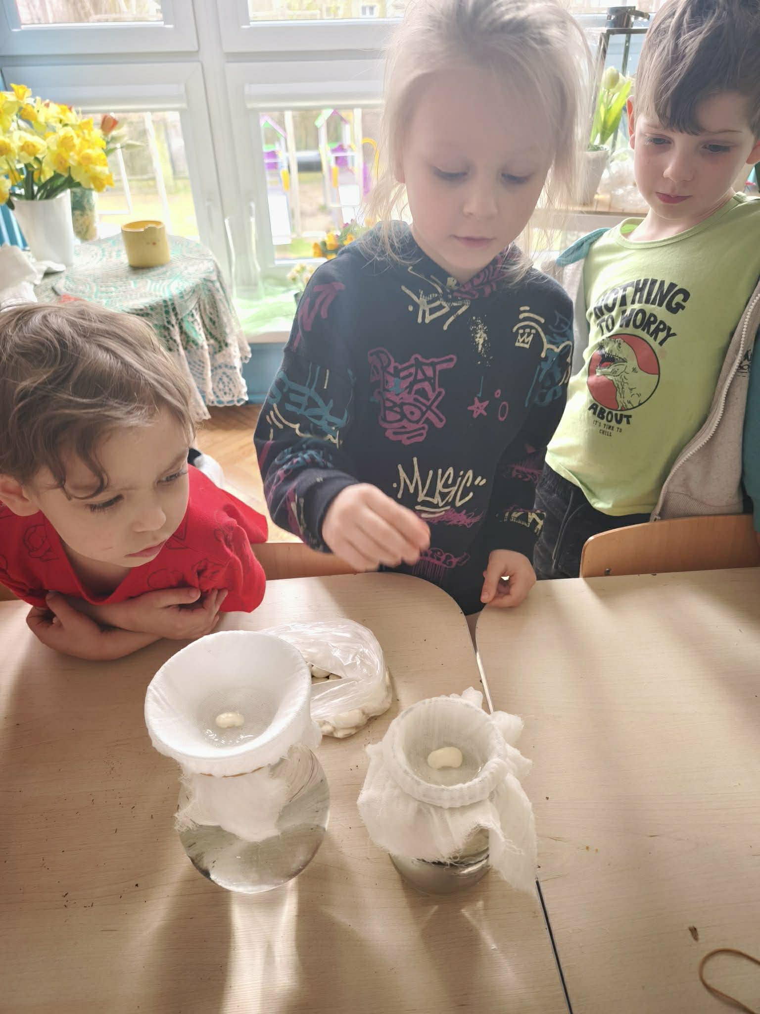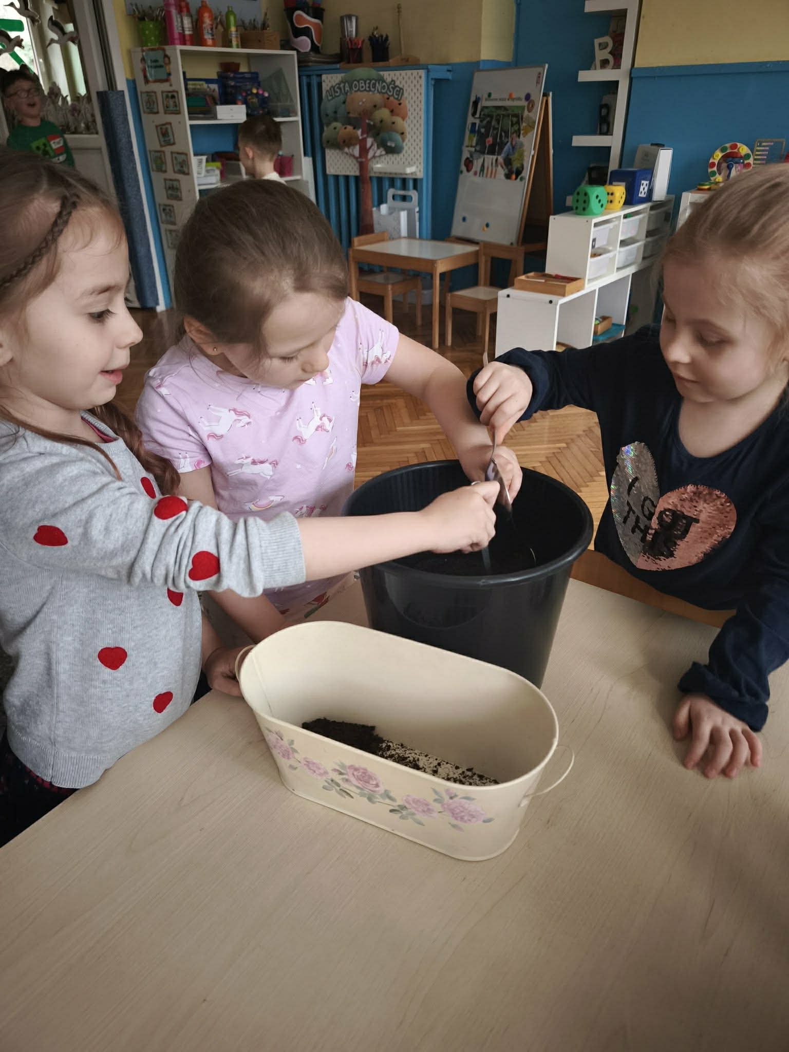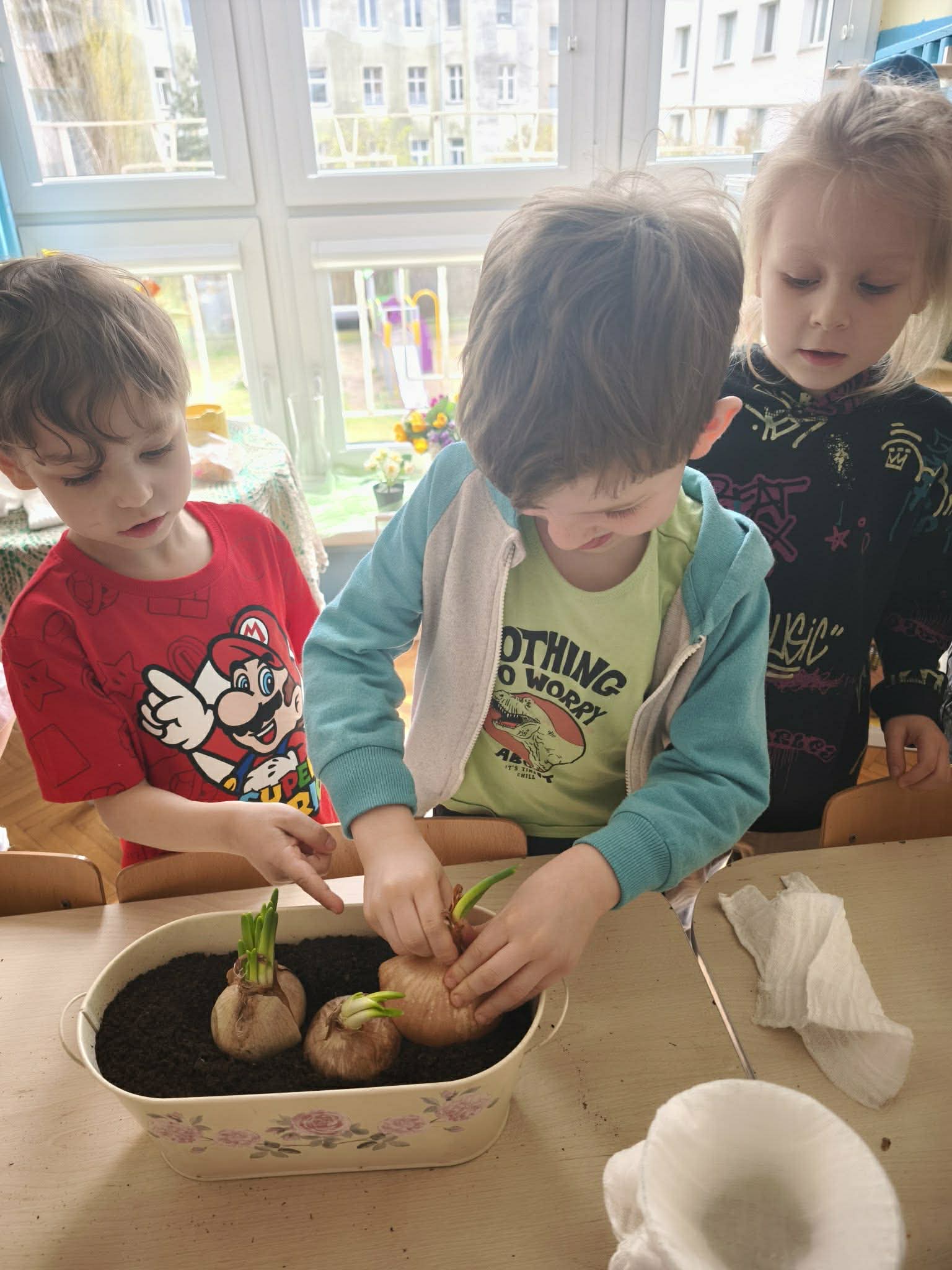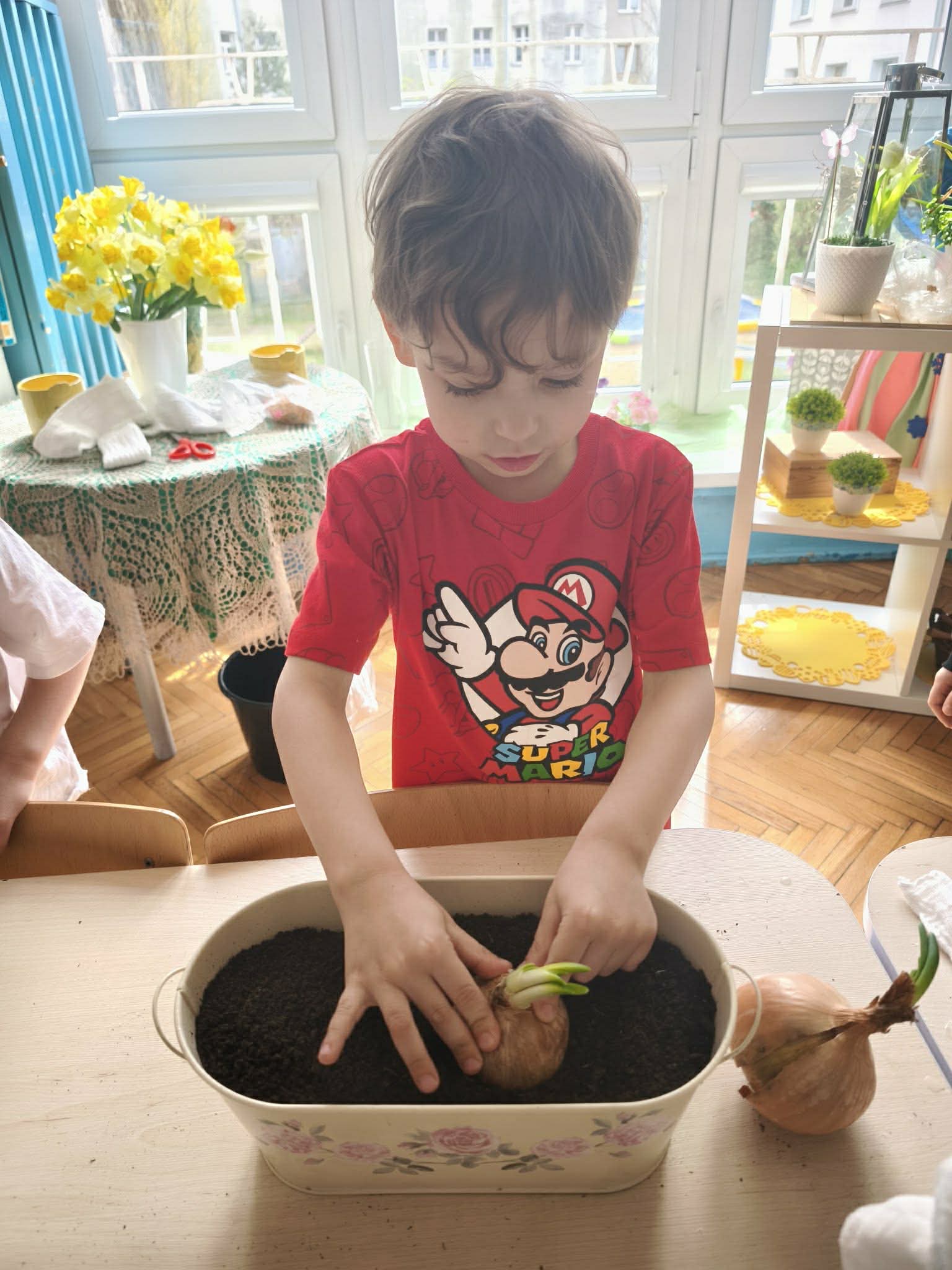 Dzieci z wielkim zaangażowaniem sadziły cebulkę na szczypiorek oraz zakładały własne hodowle fasoli na gazie. Podczas zajęć przedszkolaki dowiedziały się, czego rośliny potrzebują do wzrostu i jak należy o nie dbać. To była wspaniała lekcja przyrody połączona z dobrą zabawą!