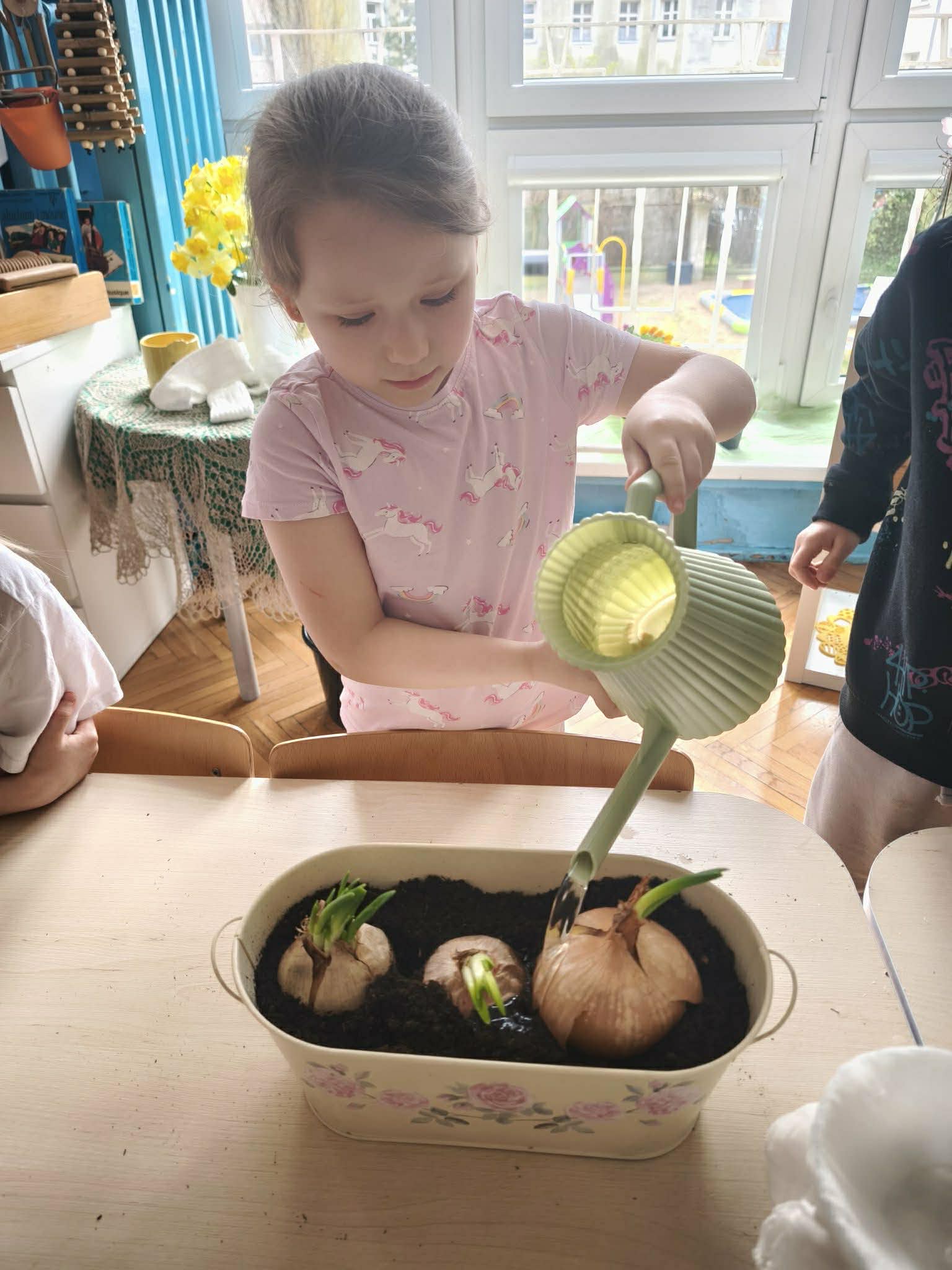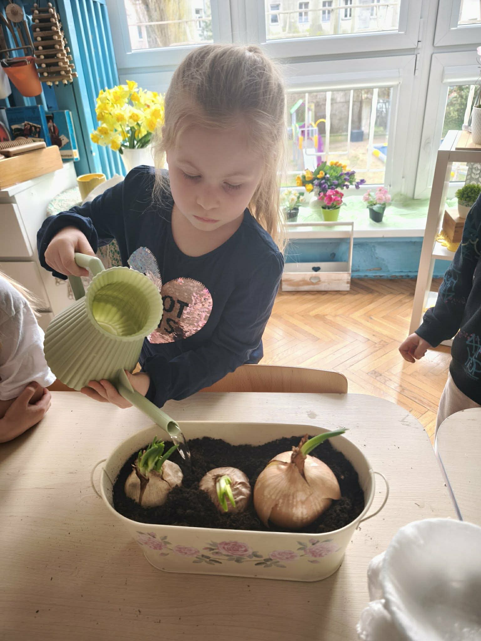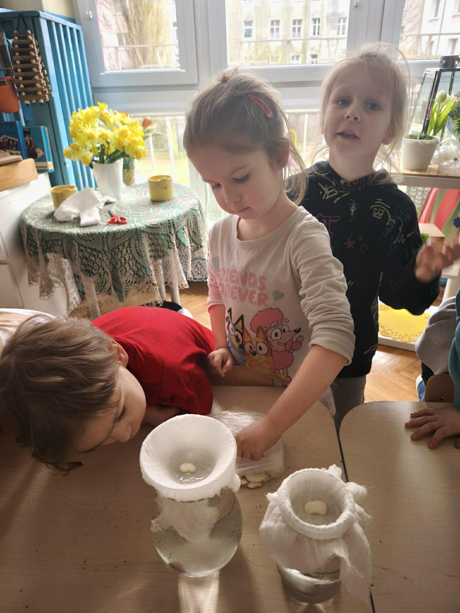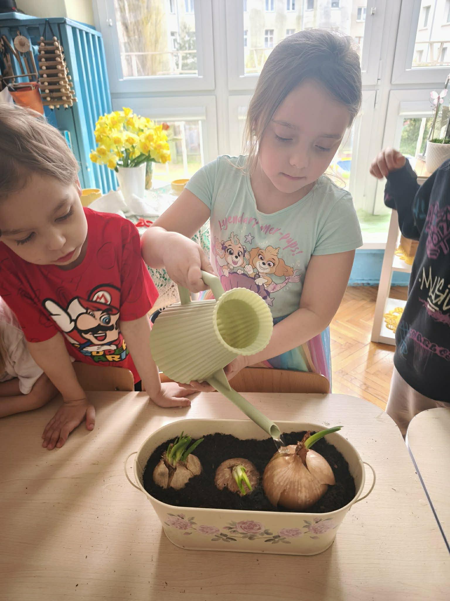 Dzieci z wielkim zaangażowaniem sadziły cebulkę na szczypiorek oraz zakładały własne hodowle fasoli na gazie. Podczas zajęć przedszkolaki dowiedziały się, czego rośliny potrzebują do wzrostu i jak należy o nie dbać. To była wspaniała lekcja przyrody połączona z dobrą zabawą!