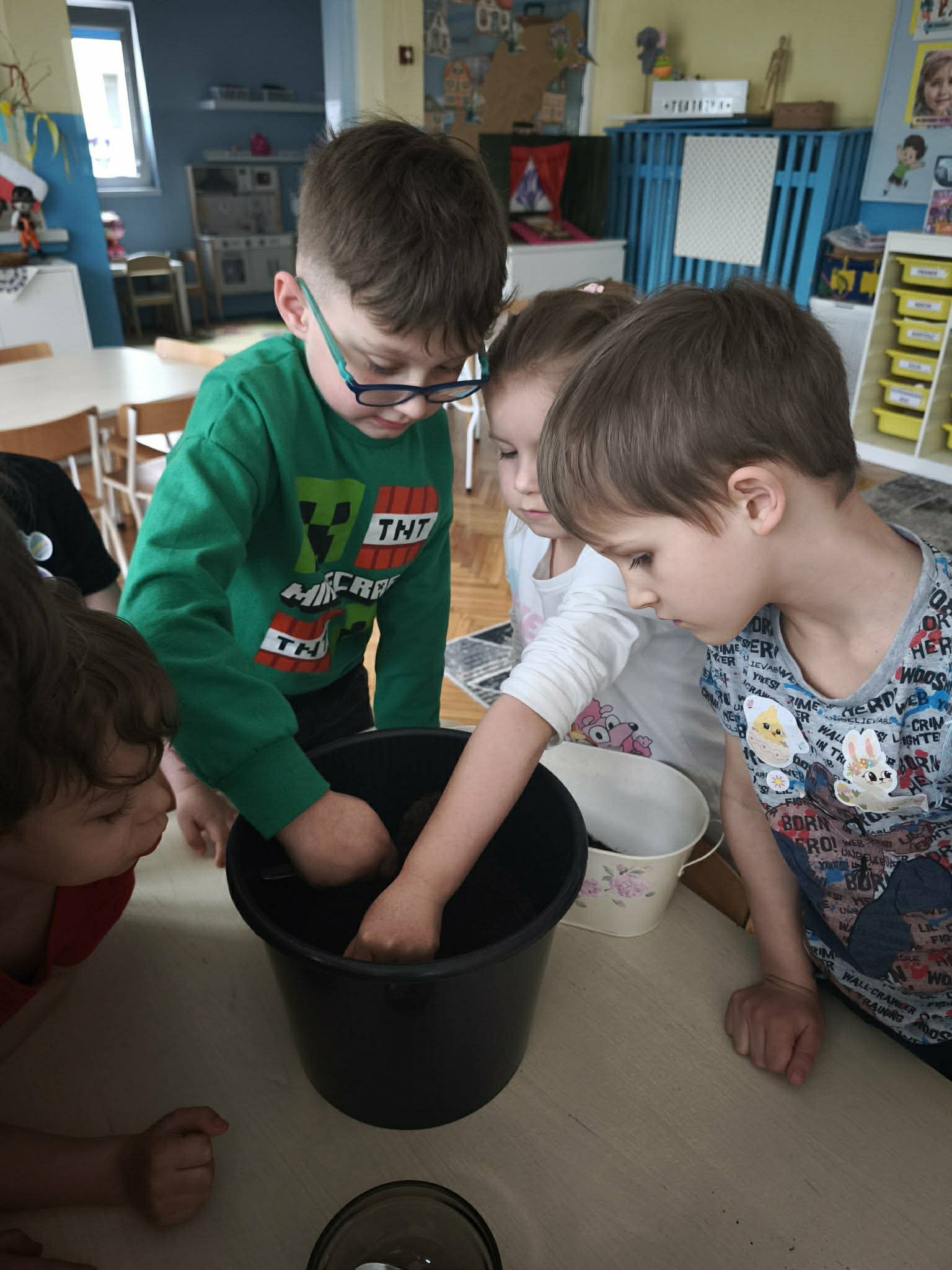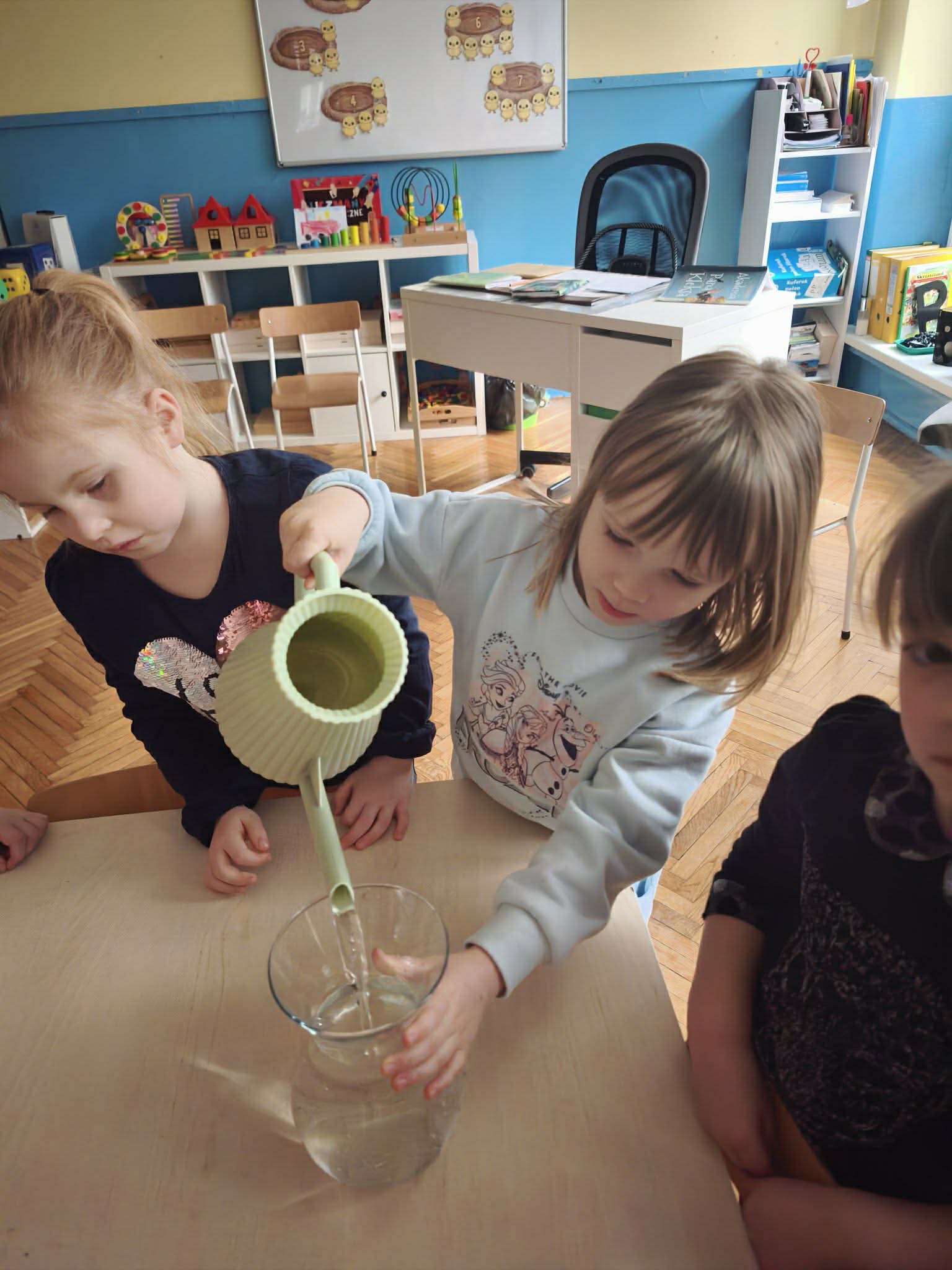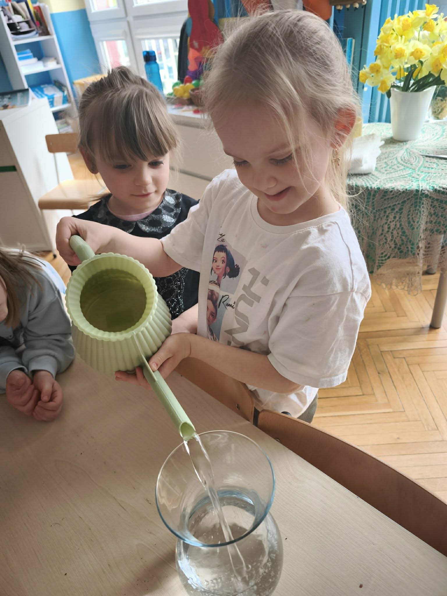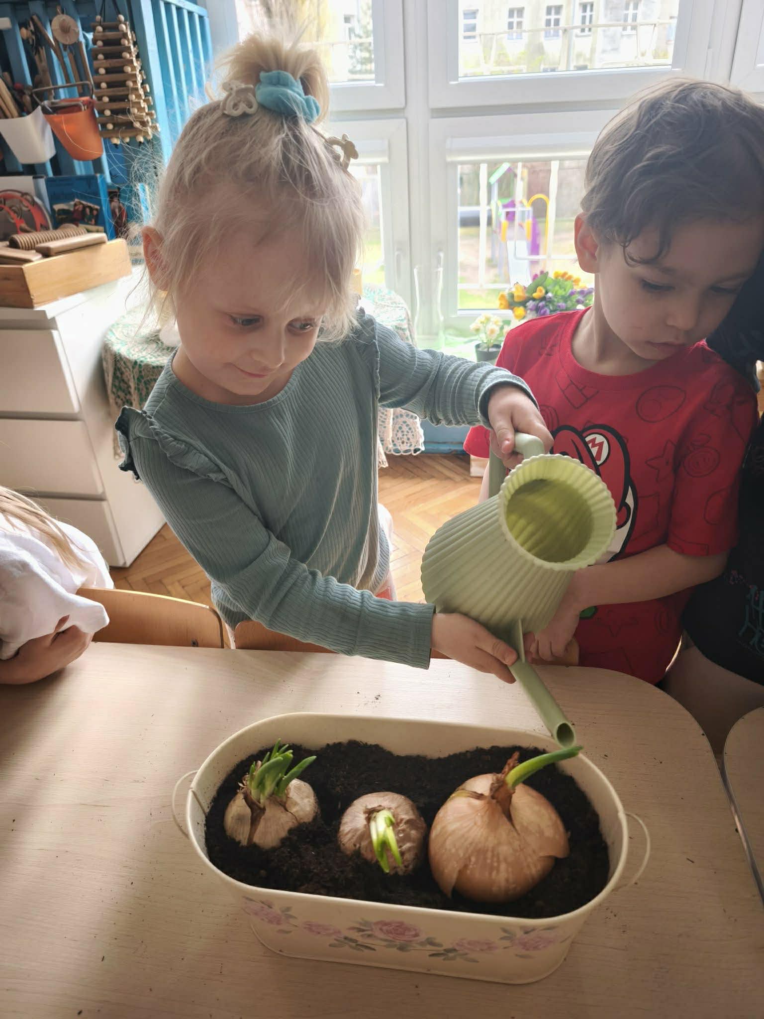 Dzieci z wielkim zaangażowaniem sadziły cebulkę na szczypiorek oraz zakładały własne hodowle fasoli na gazie. Podczas zajęć przedszkolaki dowiedziały się, czego rośliny potrzebują do wzrostu i jak należy o nie dbać. To była wspaniała lekcja przyrody połączona z dobrą zabawą!