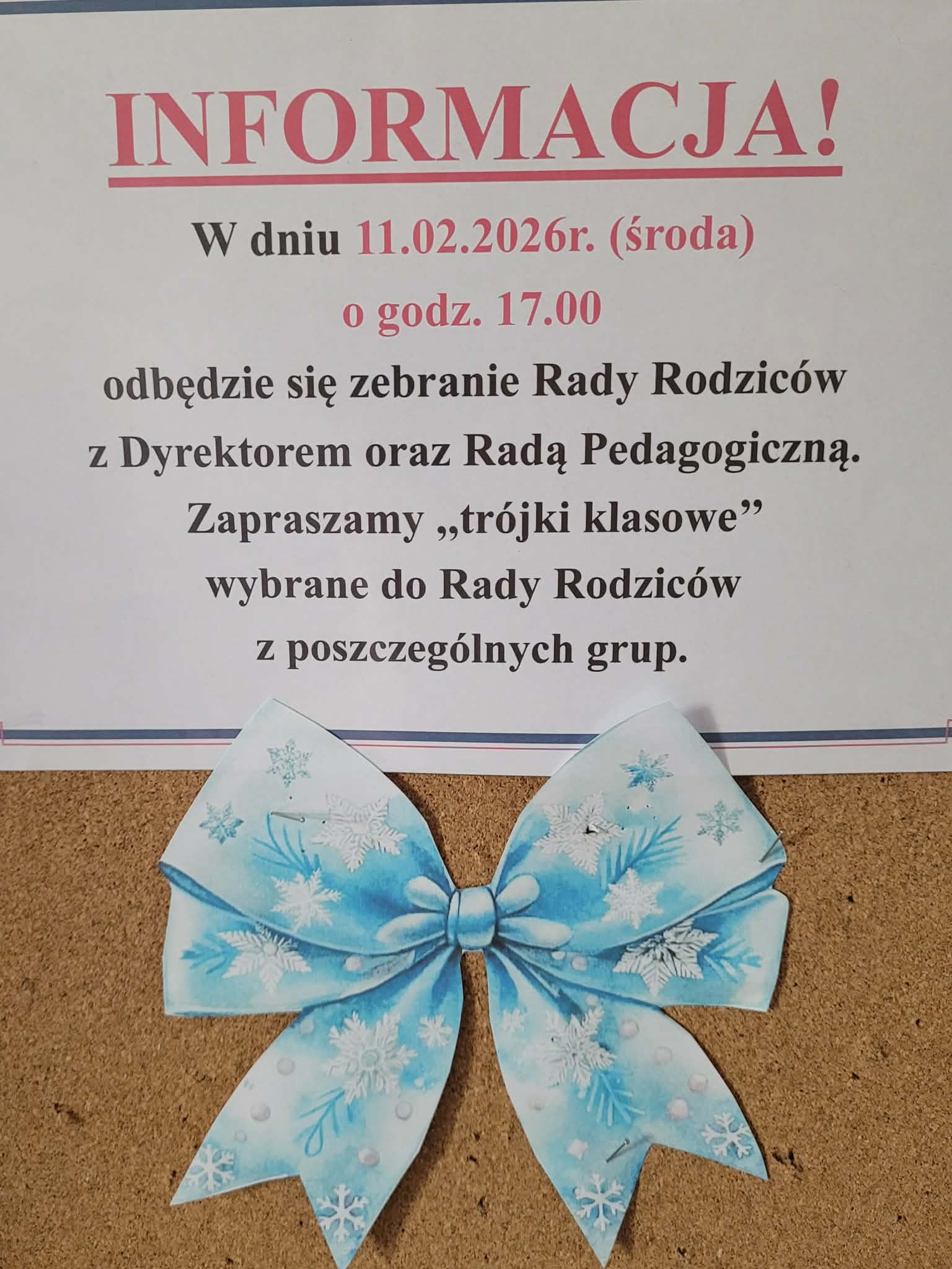 W dniu 11 lutego 2026r (środa) o godz. 17.00 odbędzie się zebranie Rady Rodziców z Dyrektorem oraz Radą Pedagogiczną. Zapraszamy "trójki klasowe" wybrane do Rady Rodziców z poszczególnych grup