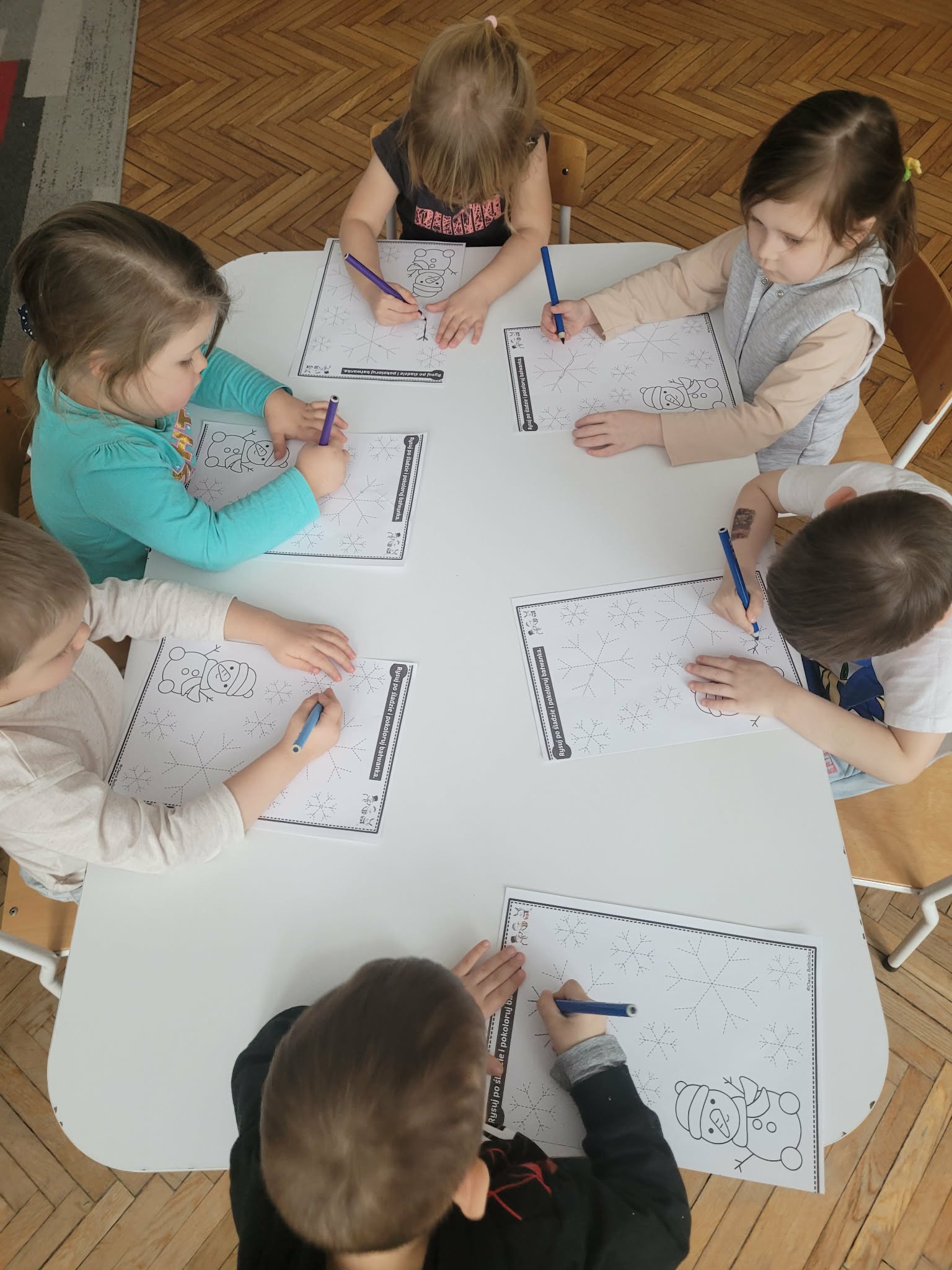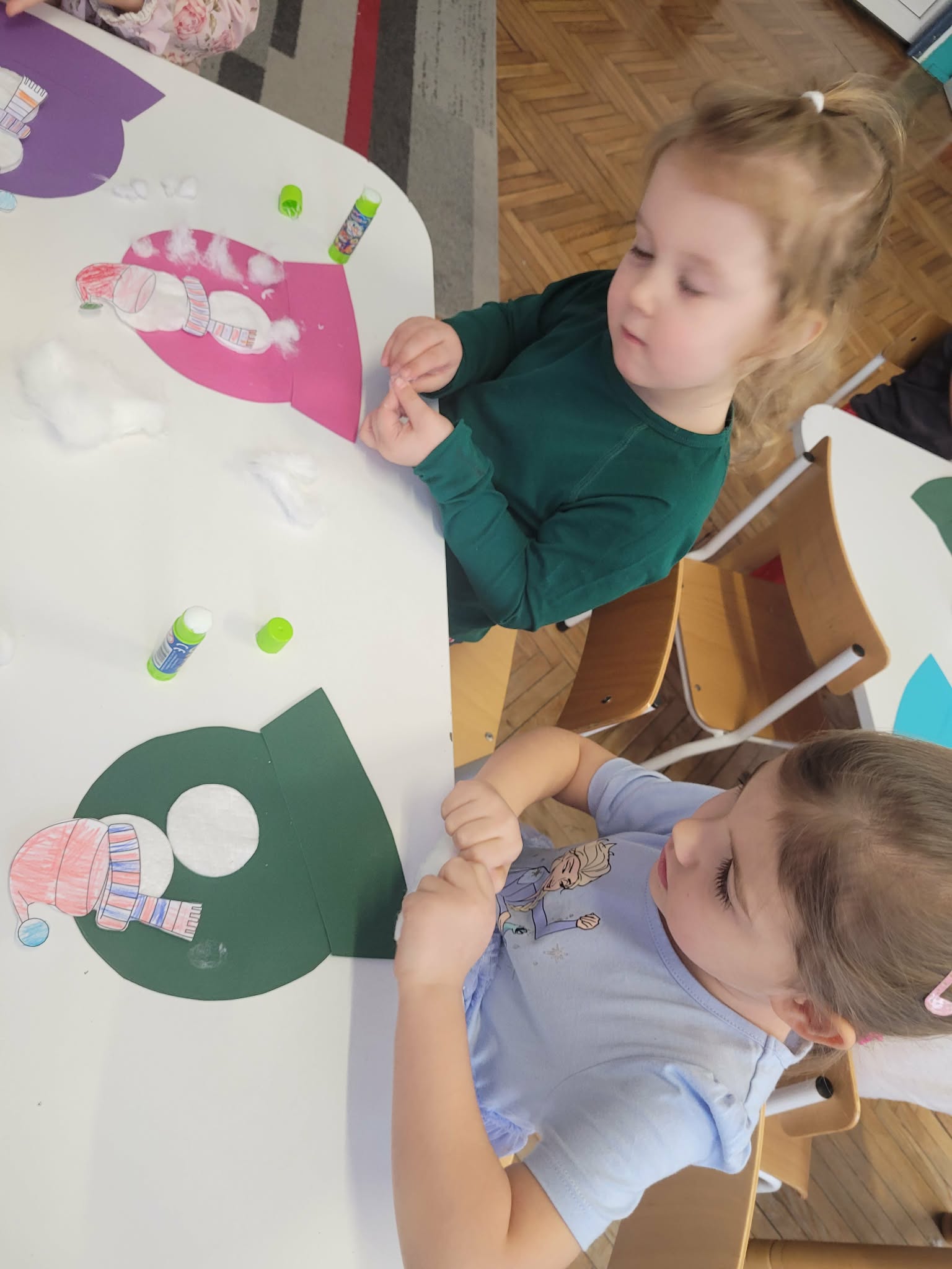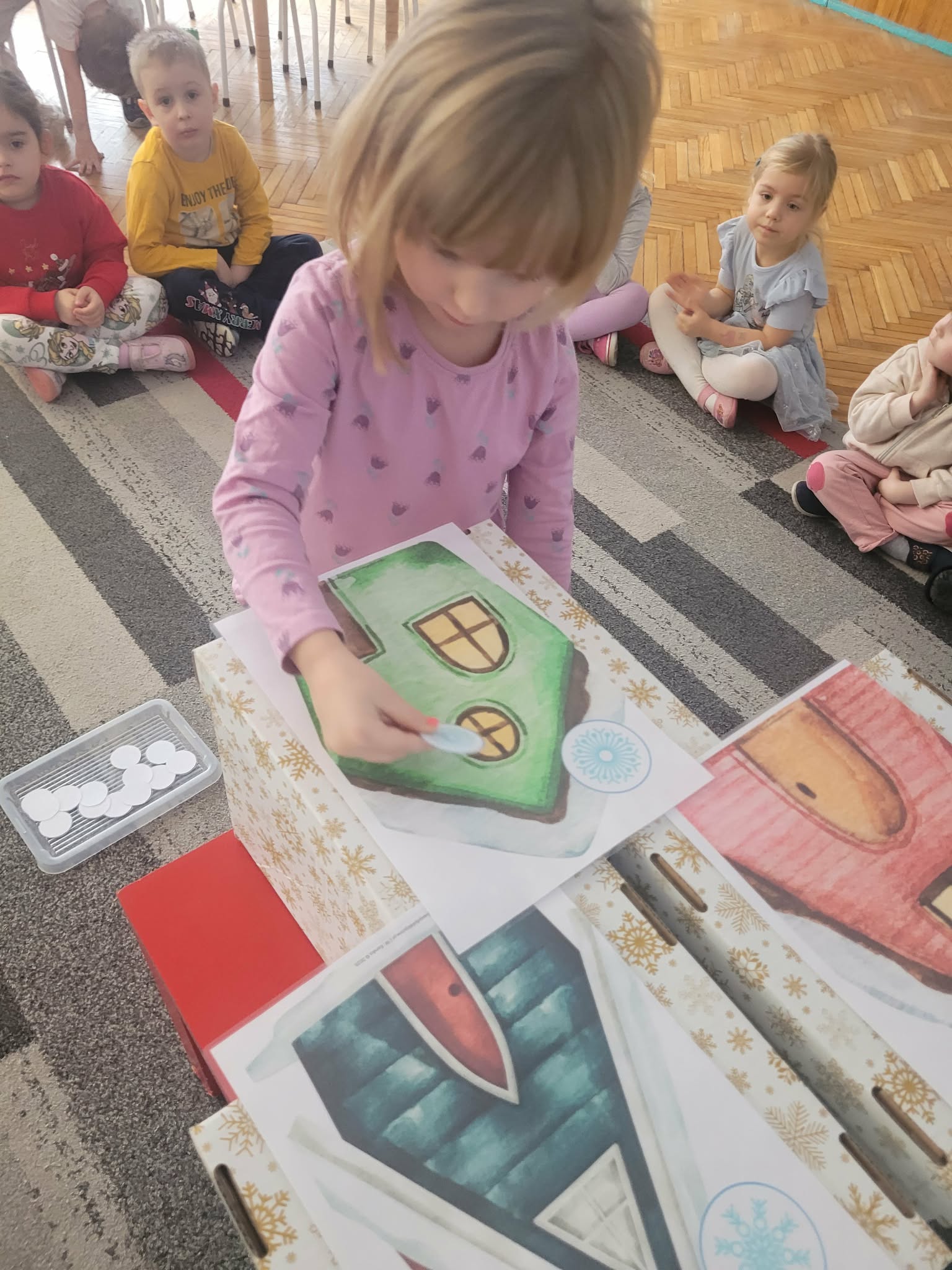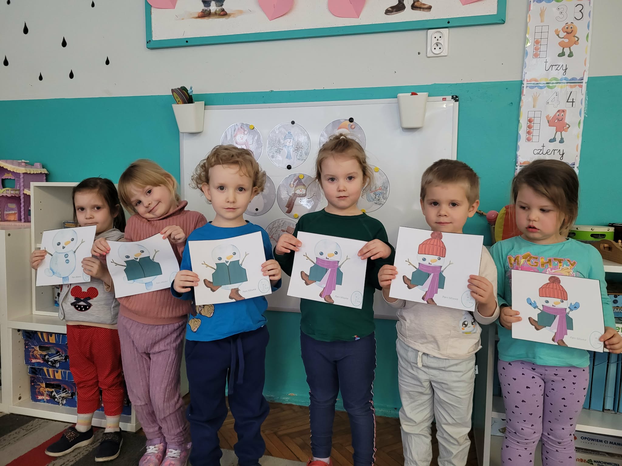Dzieci w tym tygodniu rozmawiały o zimie. Wysłuchały opowiadania na bazie historyjki obrazkowej "Zimowe ubrania" i już wiedzą, że nie nadają się ono dla bałwanka tylko dla ludzi w okresie mrozów. Odszukiwały i dobierały śnieżynki. W zespołach układały dziwne bałwany o różnych kształtach. Wykonały również pracę plastyczną "Bałwankowa śnieżna kula"