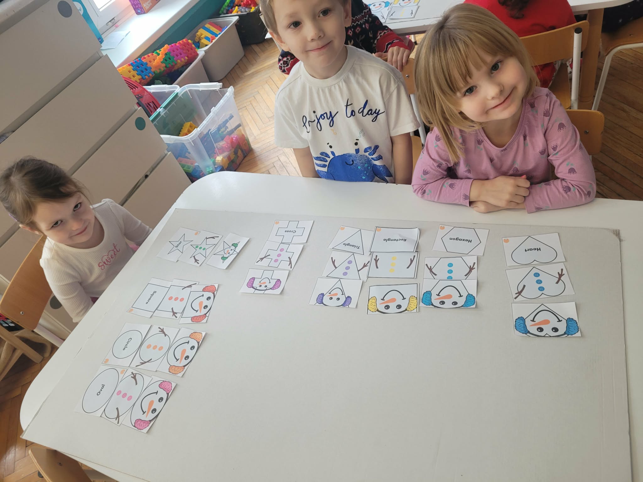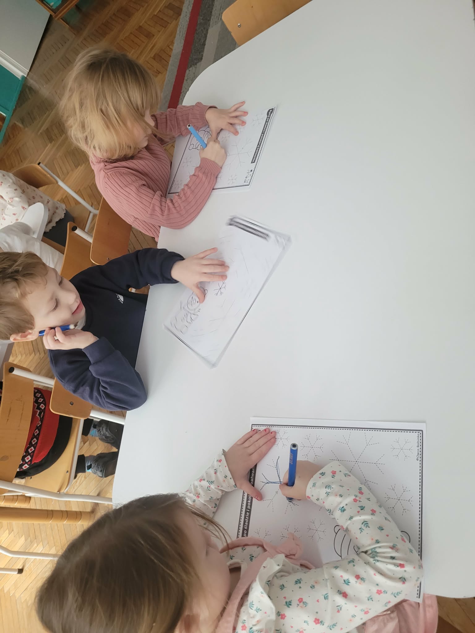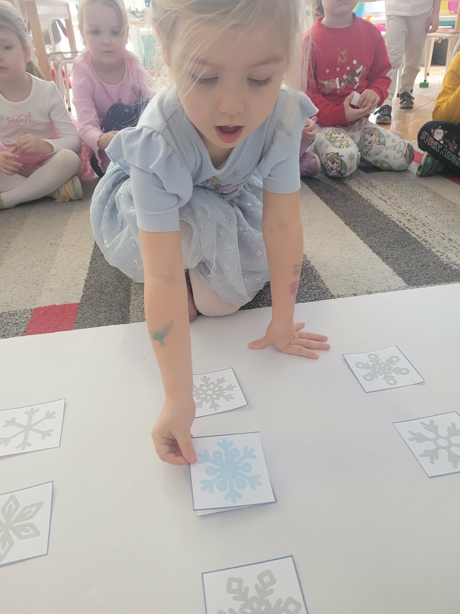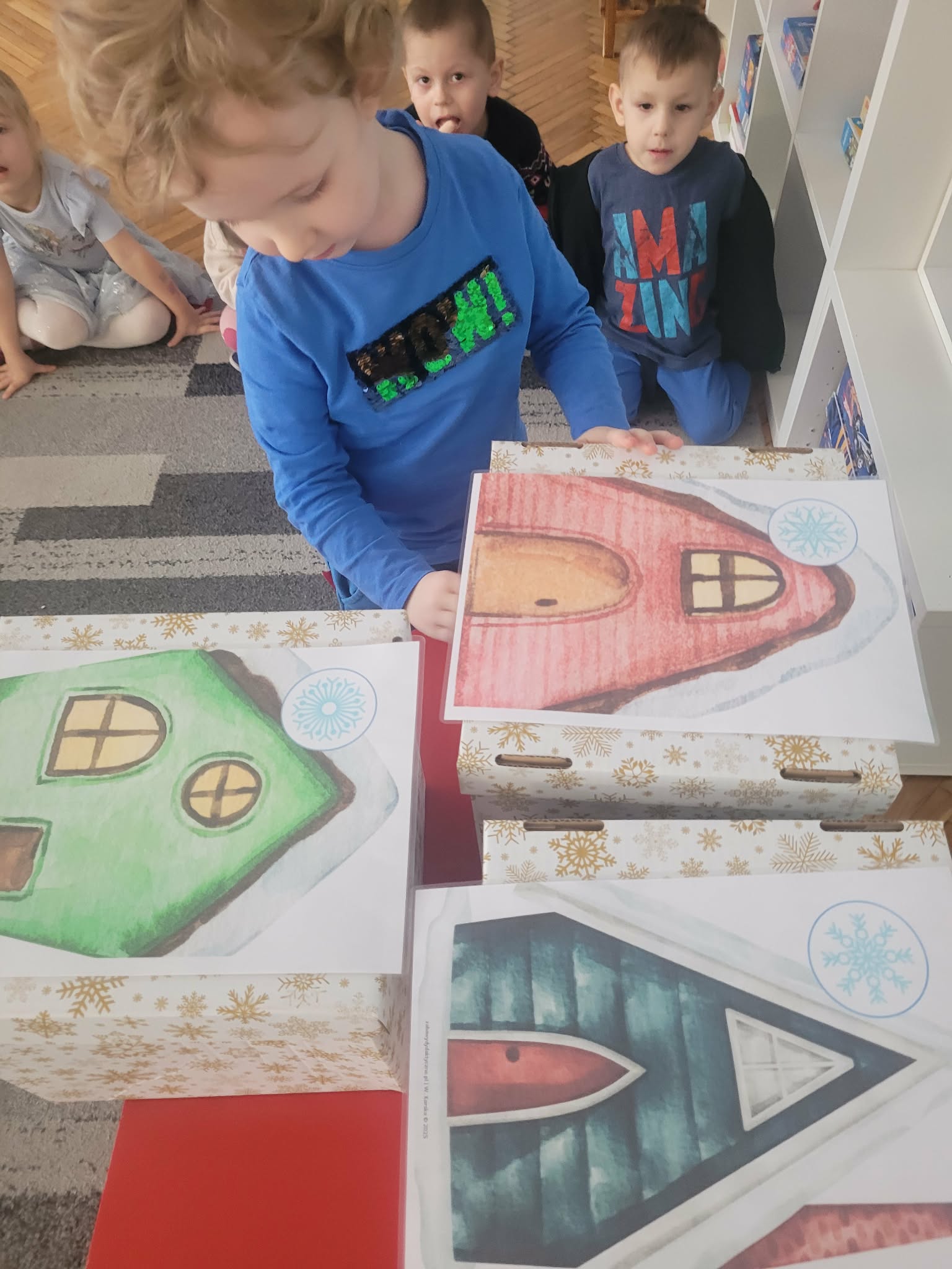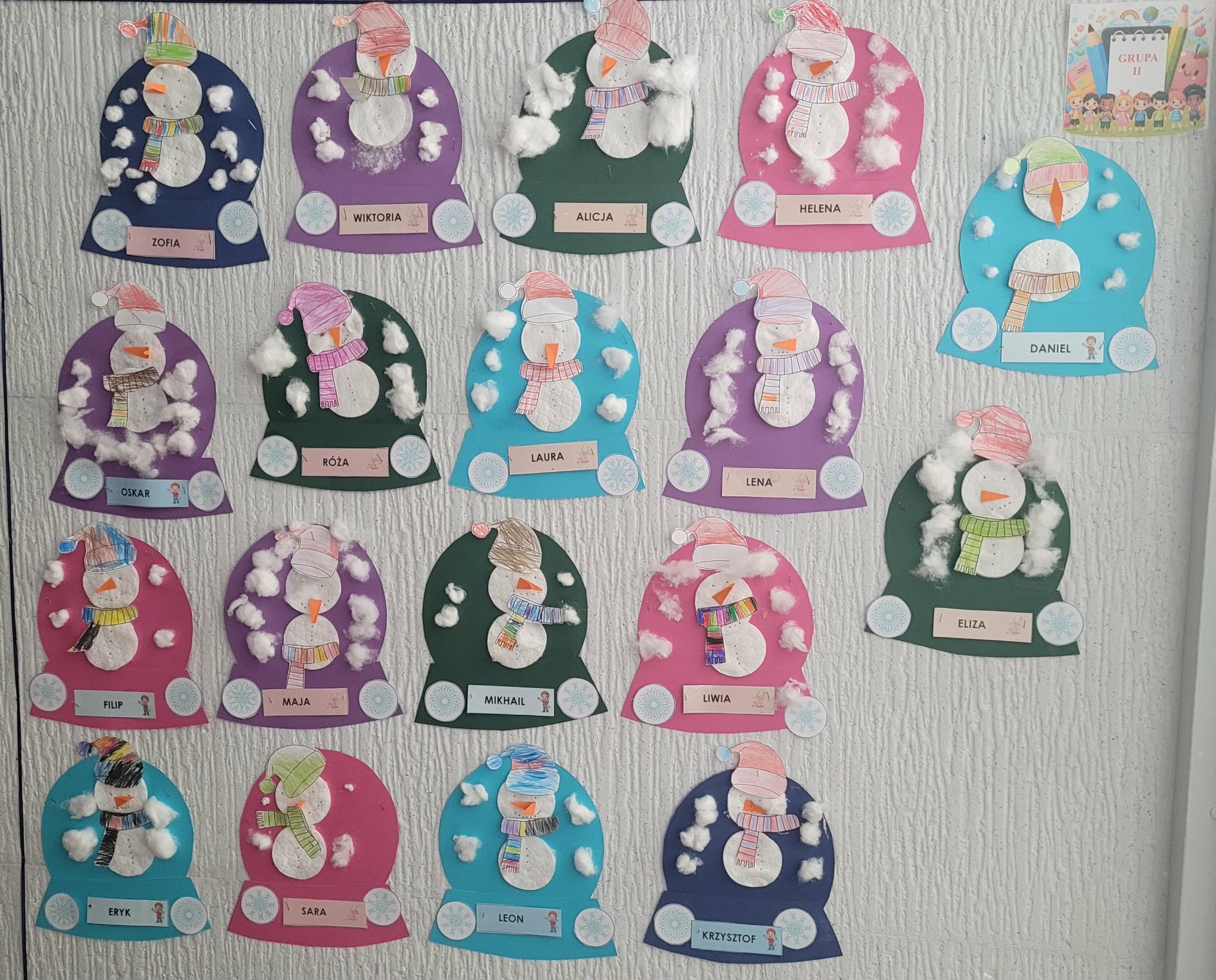 Dzieci w tym tygodniu rozmawiały o zimie. Wysłuchały opowiadania na bazie historyjki obrazkowej "Zimowe ubrania" i już wiedzą, że nie nadają się ono dla bałwanka tylko dla ludzi w okresie mrozów. Odszukiwały i dobierały śnieżynki. W zespołach układały dziwne bałwany o różnych kształtach. Wykonały również pracę plastyczną "Bałwankowa śnieżna kula"