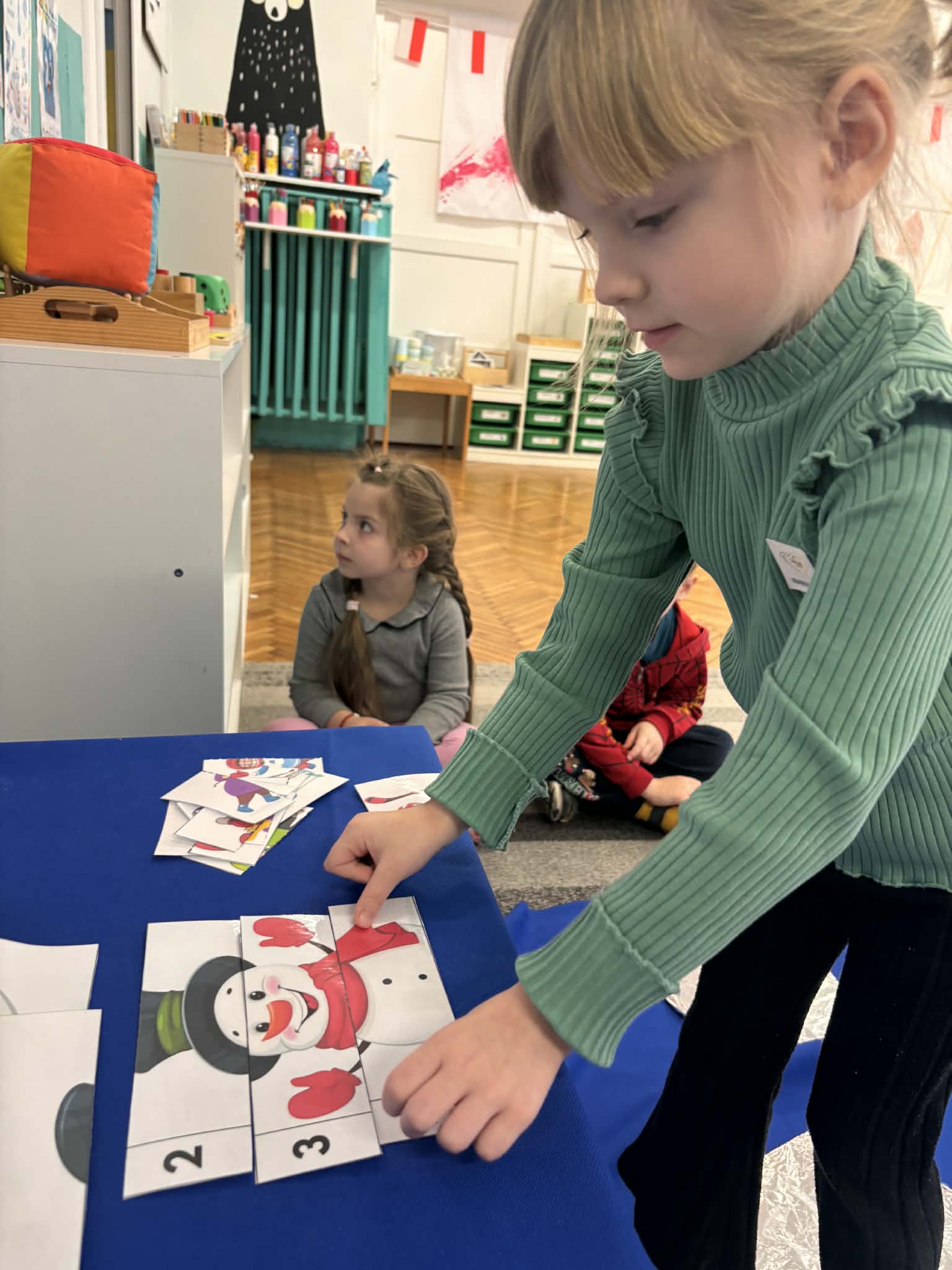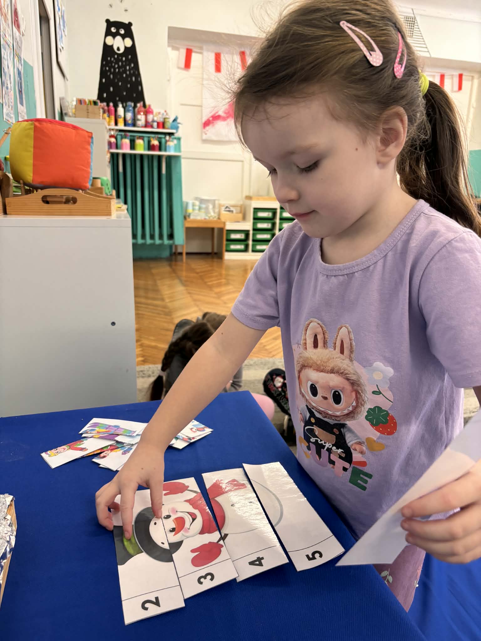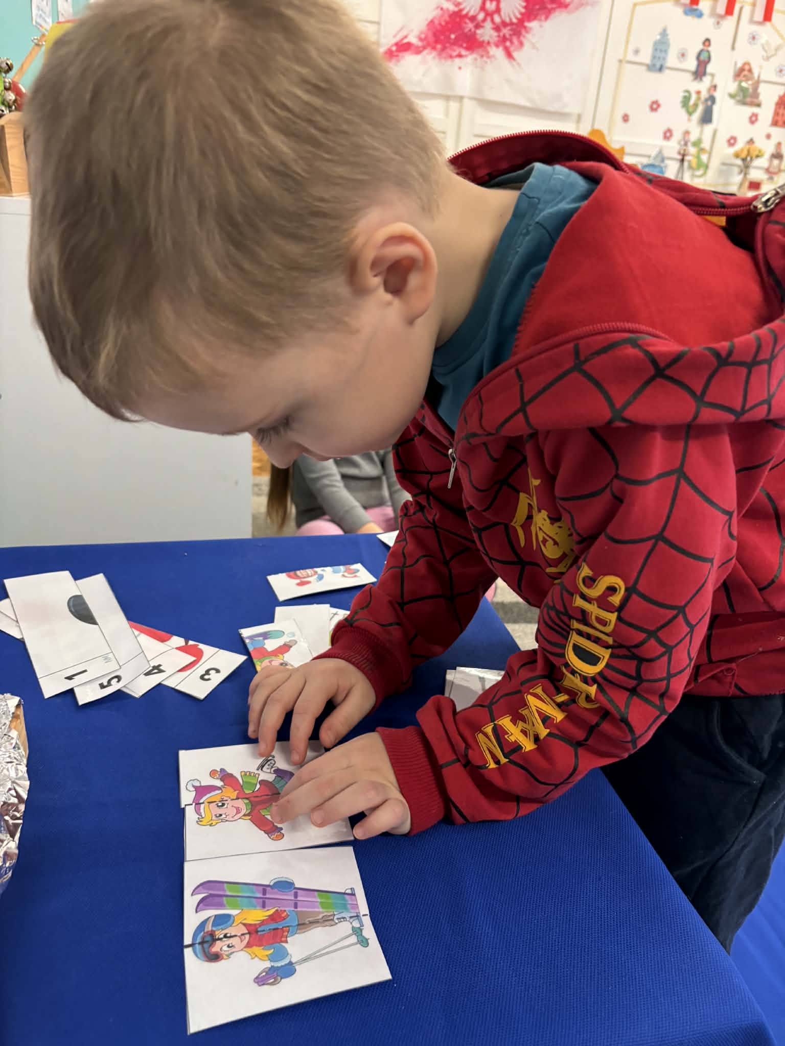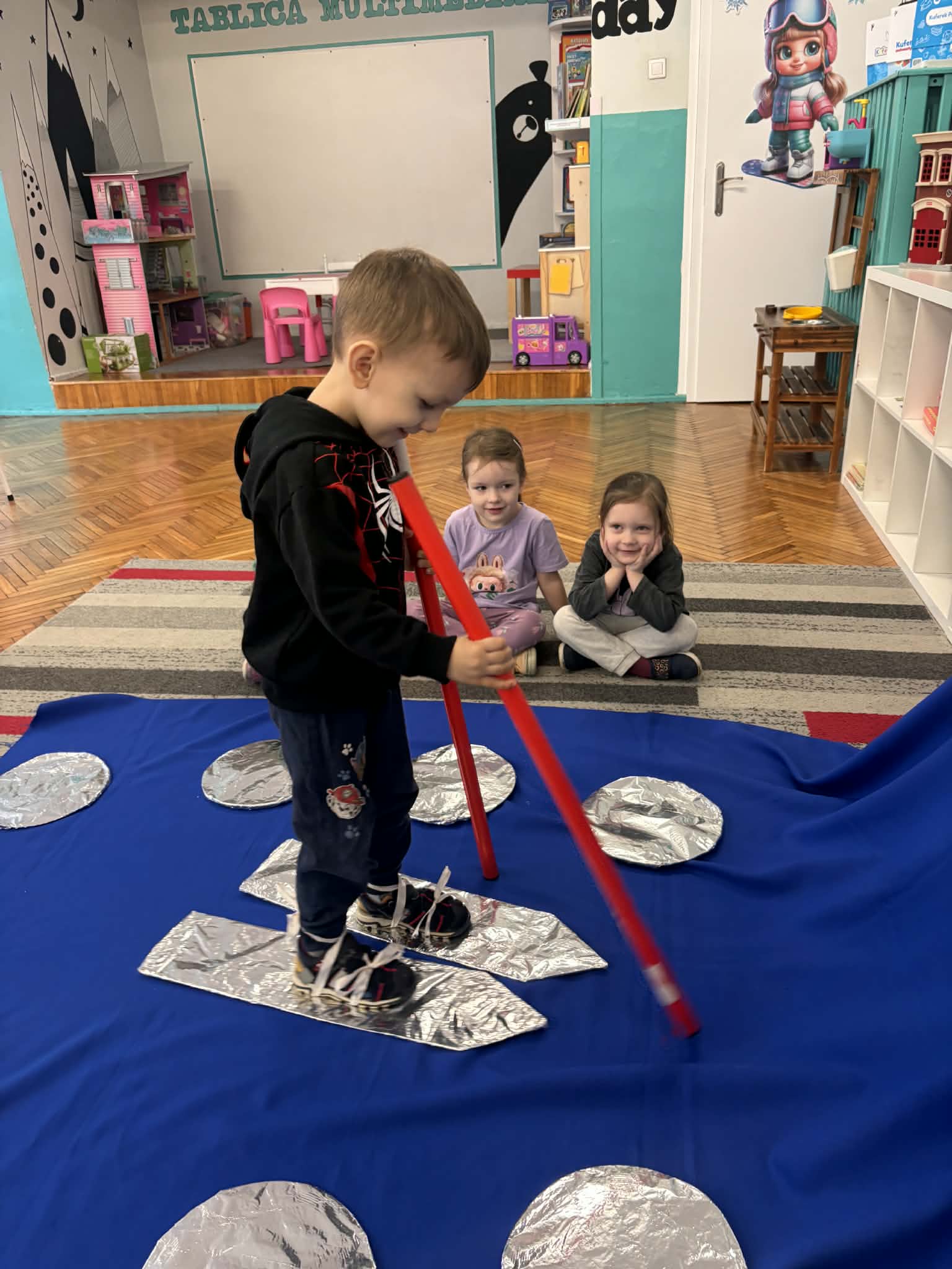 Zima to idealny czas, by porozmawiać o sportach zimowych i… spróbować ich w przedszkolnym wydaniu. nasze przedszkolaki wcieliły się w małych narciarzy. Dzieci „jeździły na nartach”, ćwicząc koordynację, równowagę i sprawność ruchową, a przy tym było mnóstwo śmiechu i dobrej zabawy. Na końcu toru czekało układanie puzzli o tematyce zimowej. Po aktywności ruchowej przyszedł czas na zadania rozwijające koncentrację i myślenie: -karty pracy – szukanie właściwej drogi oraz dopasowywanie obrazków do ich cieni.