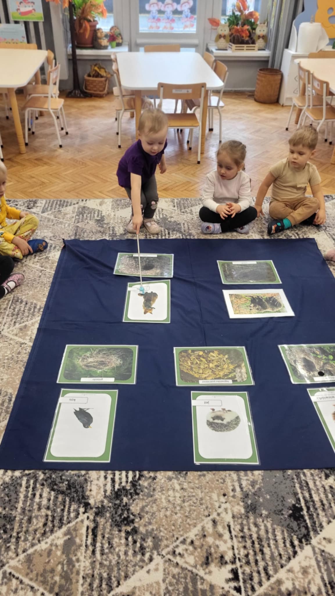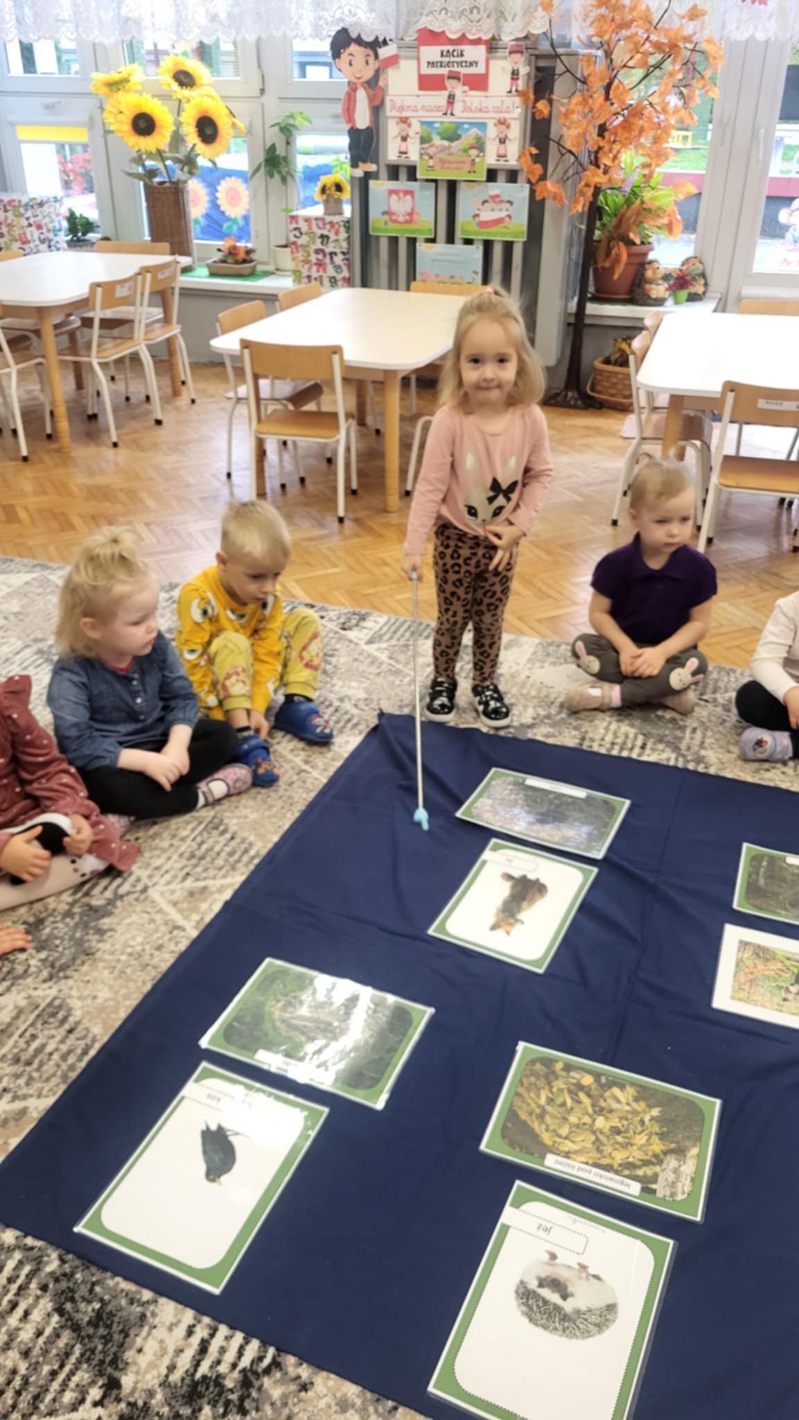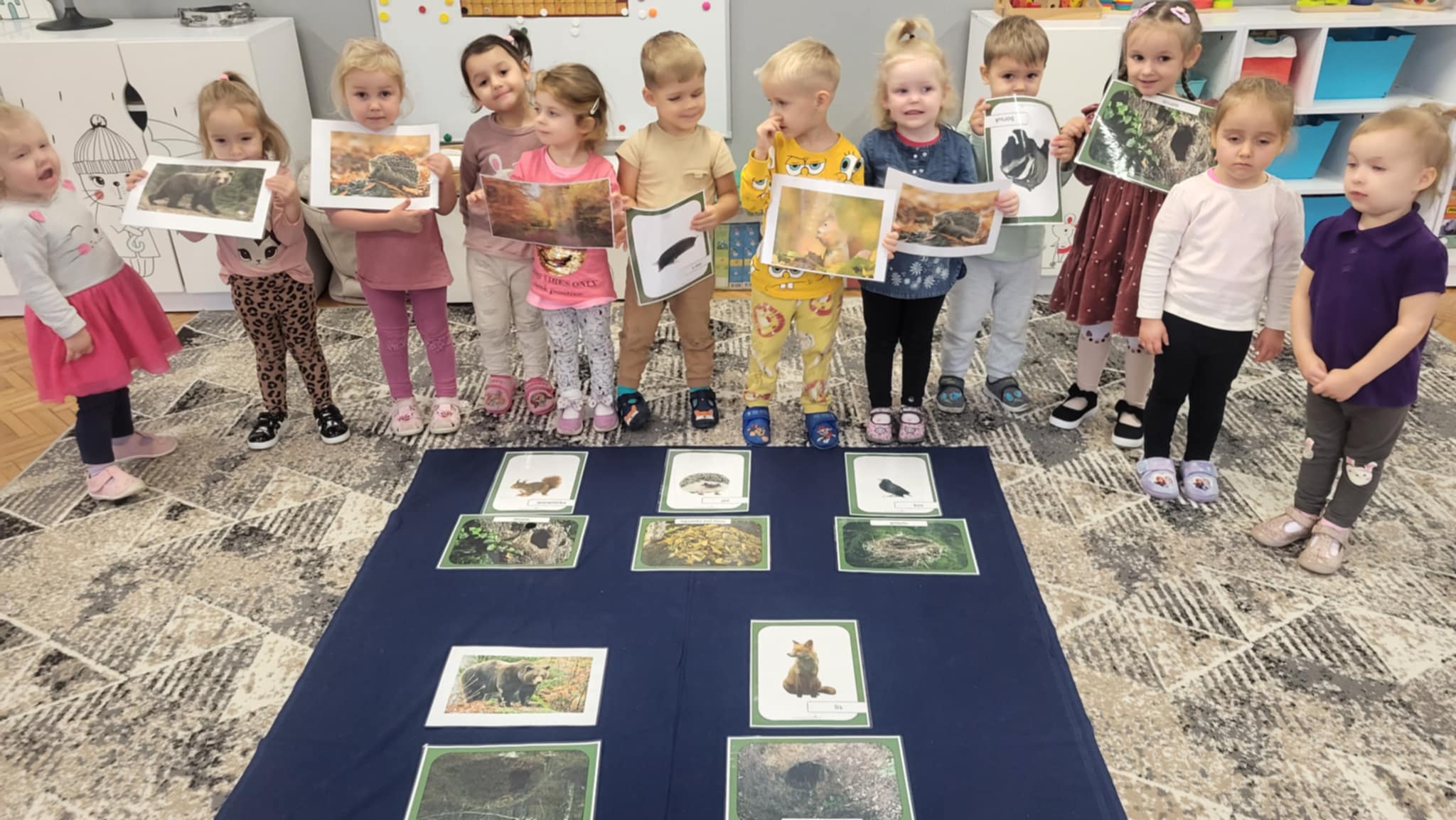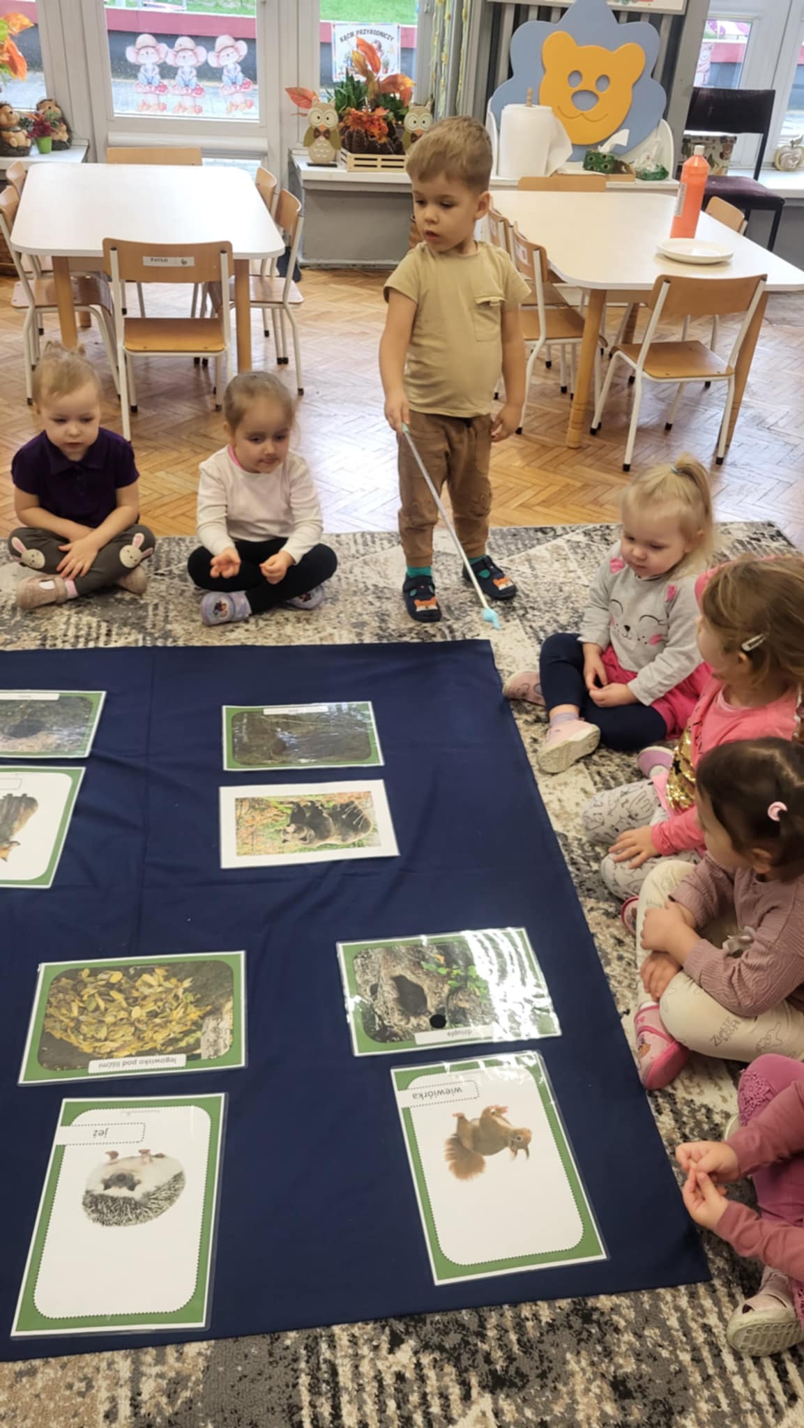 Jesień w lesie to czas przygotowań na nadchodzącą zimę, czas intensywnych zmian w życiu zwierząt. Zwierzęta leśne dostosowują się do chłodniejszych dni, gromadząc zapasy, zmieniając wygląd, a niektóre przygotowują się do migracji lub do hibernacji, tzw. "zimowego snu". Grupa pierwsza zna nazwy i wygląd wybranych zwierząt oraz miejsca, gdzie mieszkają w lesie. wykonały również pracę plastyczną "Rudy lis"