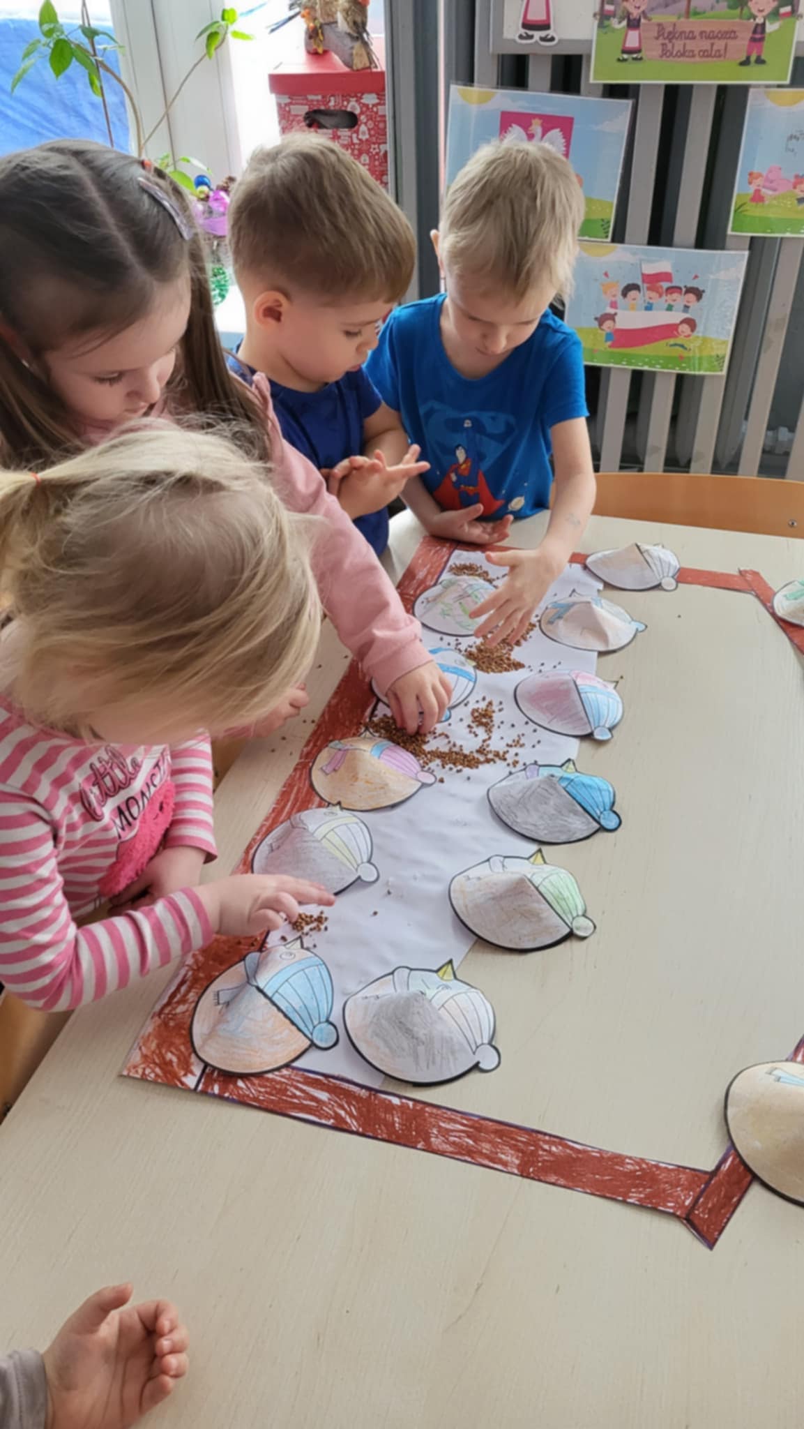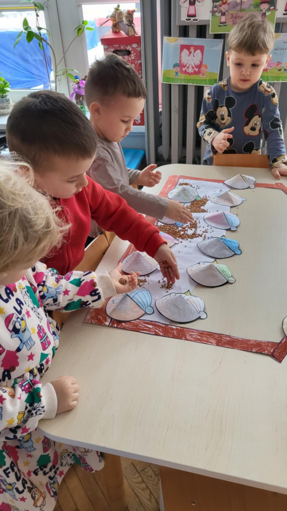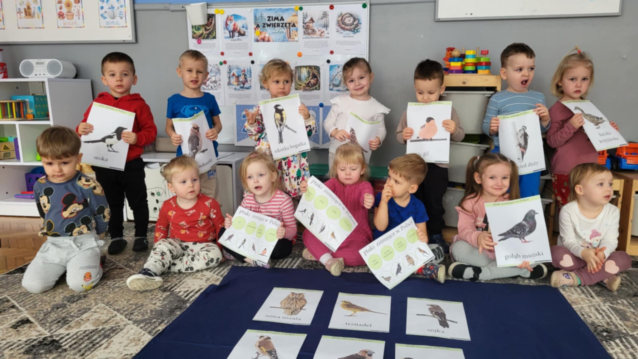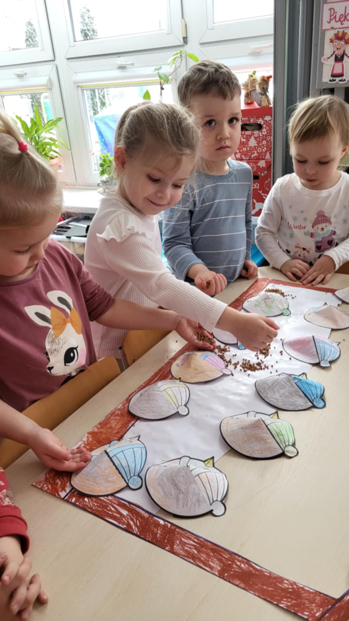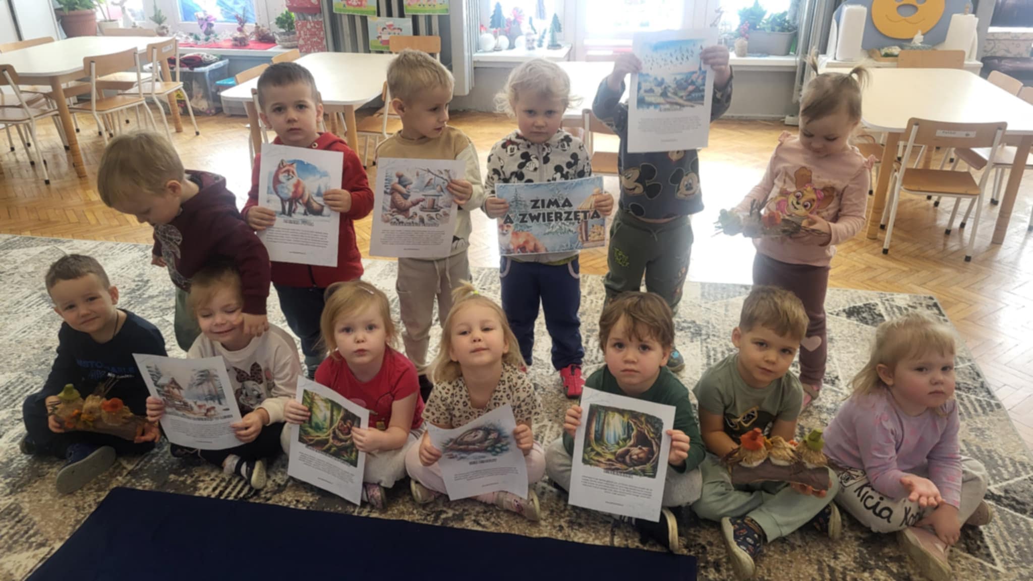 Zwierzęta zimą przygotowująsię do chłodu i mrozu, zmieniając futra na gęstsze i cieplejsze, gromadząc zapasy lub zapadając w sen zimowy, a ptaki migrują lub zostają i potrzebują dokarmiania. To trudny czas, ale zwierzęta mają sprytne sposoby na przetrwanie: niektóre (jak dziki, jelenie, sarny, lisy, zające) są aktywne i szukają pożywienia (nasiona, gryzonie, padlina), podczas gdy inne (jeże, niedźwiedzie, borsuki) śpią głęboko (hibernacja), a jeszcze inne (sikorki, sójki) zostają i liczą na pomoc ludzi w karmnikach. Nasze Maluszki uczyły się o sposobach przetrwania zwierząt zimą, wiedzą jak należy dokarmiać ptaki, wykonały również pracę plastyczną "Karmnik dla ptaków".